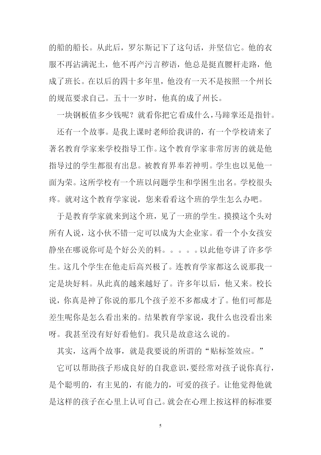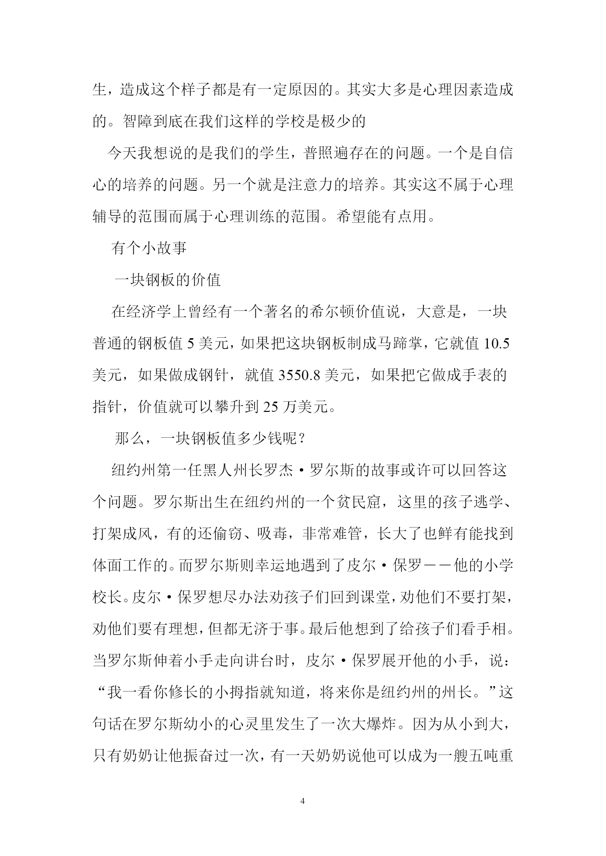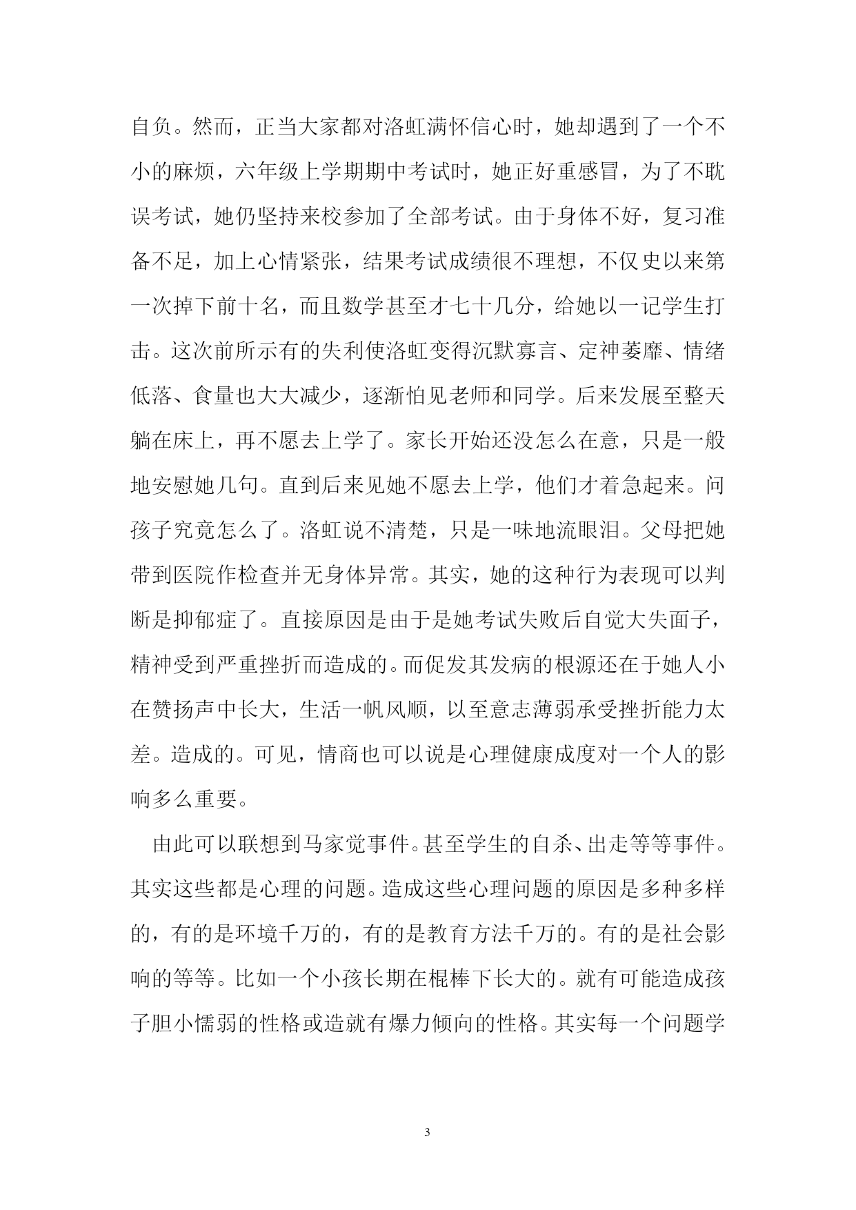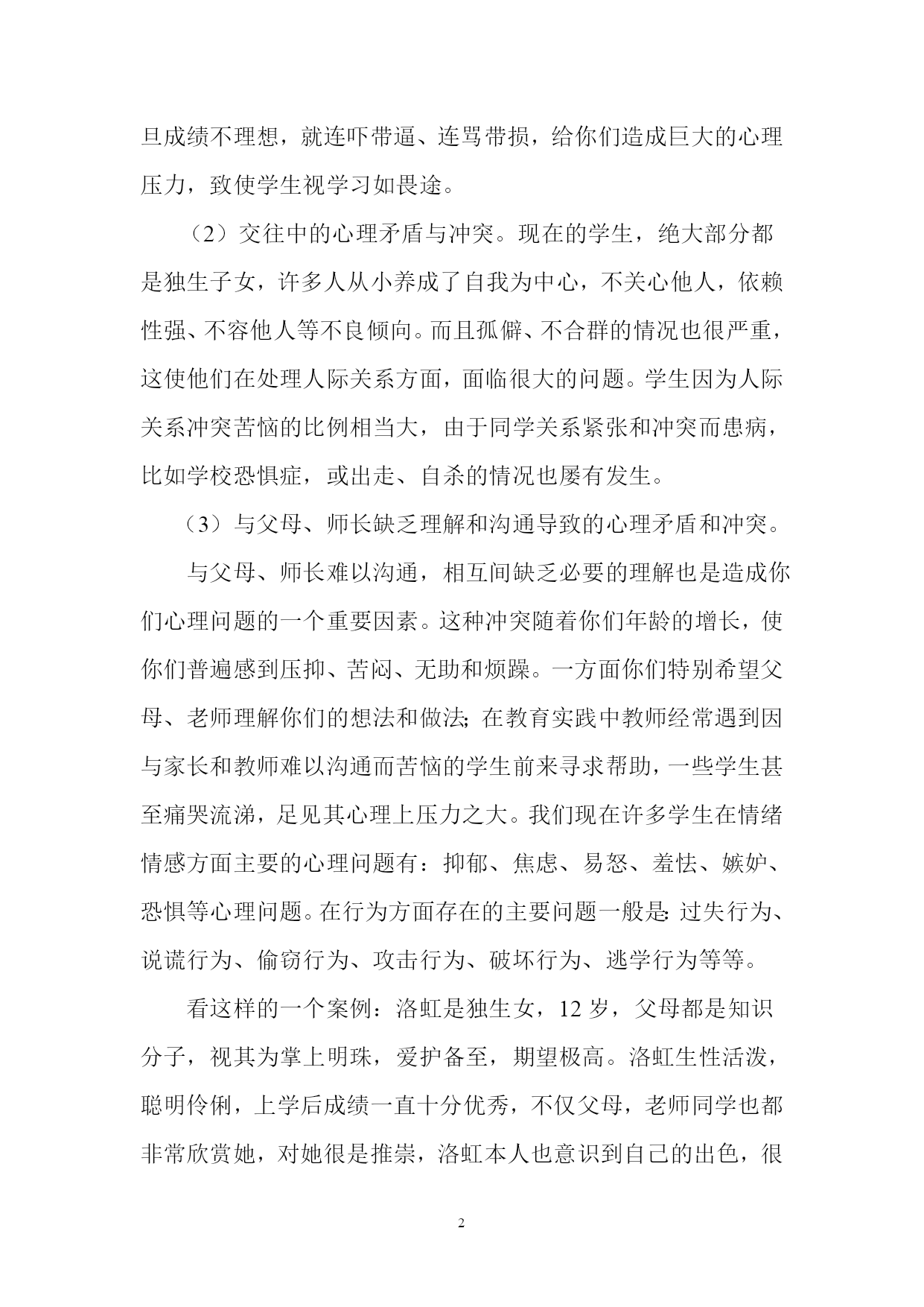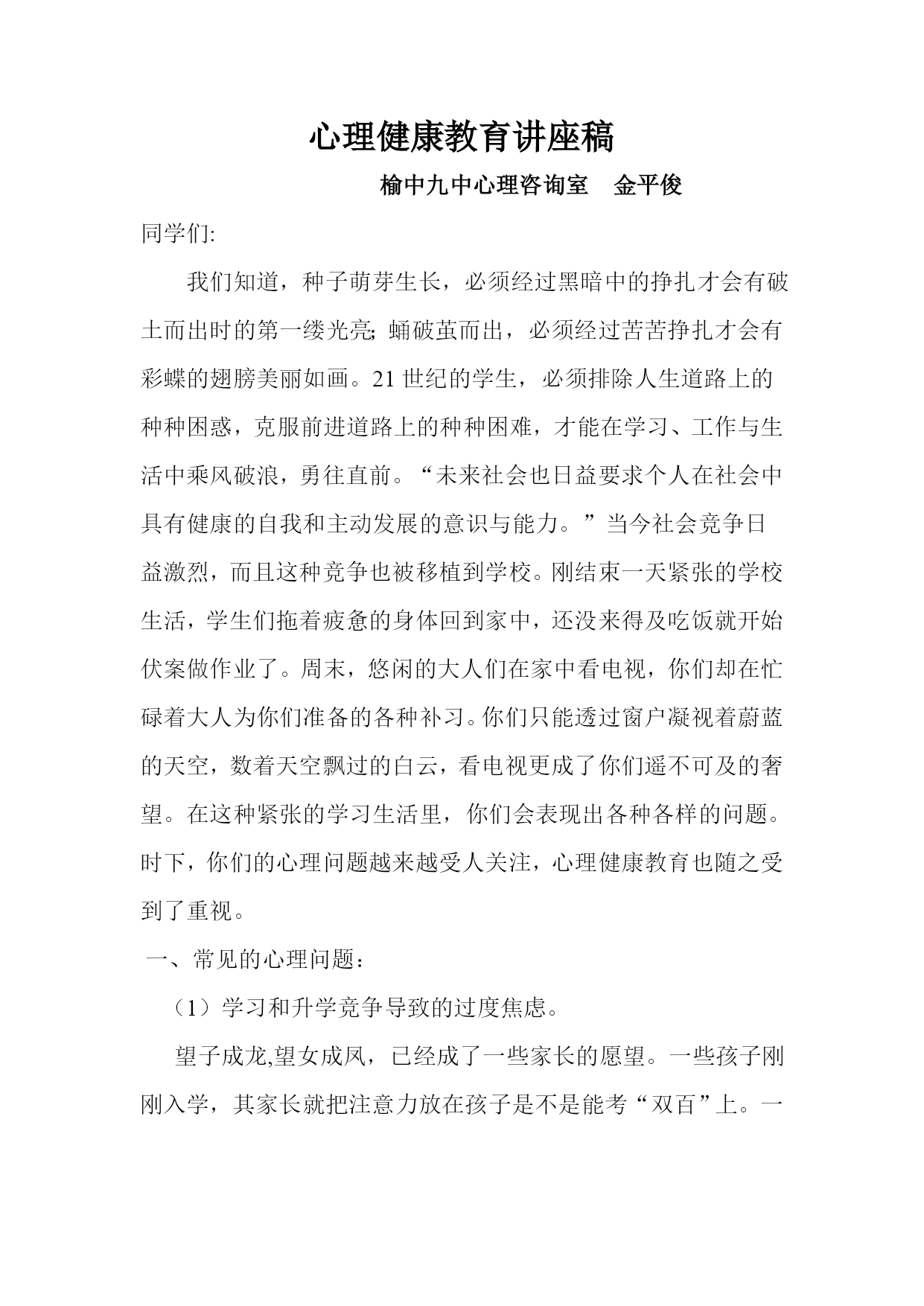 心理健康教育讲座稿榆中九中心理咨询室金平俊同学们:我们知道,种子萌芽生长,必须经过黑暗中的挣扎才会有破土而出时的第一缕光亮;蛹破茧而出,必须经过苦苦挣扎才会有彩蝶的翅膀美丽如画。21世纪的学生,必须排除人生道路上的种种困惑,克服前进道路上的种种困难,才能在学习、工作与生活中乘风破浪,勇往直前。“未来社会也日益要求个人在社会中具有健康的自我和主动发展的意识与能力。”当今社会竞争日益激烈,而且这种竞争也被移植到学校。刚结束一天紧张的学校生活,学生们拖着疲惫的身体回到家中,还没来得及吃饭就开始伏案做作业了。周末,悠闲的大人们在家中看电视,你们却在忙碌着大人为你们准备的各种补习。你们只能透过窗户凝视着蔚蓝的天空,数着天空飘过的白云,看电视更成了你们遥不可及的奢望。在这种紧张的学习生活里,你们会表现出各种各样的问题。时下,你们的心理问题越来越受人关注,心理健康教育也随之受到了重视。一、常见的心理问题:(1)学习和升学竞争导致的过度焦虑。望子成龙,望女成凤,已经成了一些家长的愿望。一些孩子刚刚入学,其家长就把注意力放在孩子是不是能考“双百”上。一旦成绩不理想,就连吓带逼、连骂带损,给你们造成巨大的心理压力,致使学生视学习如畏途。(2)交往中的心理矛盾与冲突。现在的学生,绝大部分都是独生子女,许多人从小养成了自我为中心,不关心他人,依赖性强、不容他人等不良倾向。而且孤僻、不合群的情况也很严重,这使他们在处理人际关系方面,面临很大的问题。学生因为人际关系冲突苦恼的比例相当大,由于同学关系紧张和冲突而患病,比如学校恐惧症,或出走、自杀的情况也屡有发生。(3)与父母、师长缺乏理解和沟通导致的心理矛盾和冲突。与父母、师长难以沟通,相互间缺乏必要的理解也是造成你们心理问题的一个重要因素。这种冲突随着你们年龄的增长,使你们普遍感到压抑、苦闷、无助和烦躁。一方面你们特别希望父母、老师理解你们的想法和做法;在教育实践中教师经常遇到因与家长和教师难以沟通而苦恼的学生前来寻求帮助,一些学生甚至痛哭流涕,足见其心理上压力之大。我们现在许多学生在情绪情感方面主要的心理问题有:抑郁、焦虑、易怒、羞怯、嫉妒、恐惧等心理问题。在行为方面存在的主要问题一般是:过失行为、说谎行为、偷窃行为、攻击行为、破坏行为、逃学行为等等。看这样的一个案例:洛虹是独生女,12岁,父母都是知识分子,视其为掌上明珠,爱护备至,期望极高。洛虹生性活泼,聪明伶俐,上学后成绩一直十分优秀,不仅父母,老师同学也都非常欣赏她,对她很是推崇,洛虹本人也意识到自己的出色,很自负。然而,正当大家都对洛虹满怀信心时,她却遇到了一个不小的麻烦,六年级上学期期中考试时,她正好重感冒,为了不耽误考试,她仍坚持来校参加了全部考试。由于身体不好,复习准备不足,加上心情紧张,结果考试成绩很不理想,不仅史以来第一次掉下前十名,而且数学甚至才七十几分,给她以一记学生打击。这次前所示有的失利使洛虹变得沉默寡言、定神萎靡、情绪低落、食量也大大减少,逐渐怕见老师和同学。后来发展至整天躺在床上,再不愿去上学了。家长开始还没怎么在意,只是一般地安慰她几句。直到后来见她不愿去上学,他们才着急起来。问孩子究竟怎么了。洛虹说不清楚,只是一味地流眼泪。父母把她带到医院作检查并无身体异常。其实,她的这种行为表现可以判断是抑郁症了。直接原因是由于是她考试失败后自觉大失面子,精神受到严重挫折而造成的。而促发其发病的根源还在于她人小在赞扬声中长大,生活一帆风顺,以至意志薄弱承受挫折能力太差。造成的。可见,情商也可以说是心理健康成度对一个人的影响多么重要。由此可以联想到马家觉事件。甚至学生的自杀、出走等等事件。其实这些都是心理的问题。造成这些心理问题的原因是多种多样的,有的是环境千万的,有的是教育方法千万的。有的是社会影响的等等。比如一个小孩长期在棍棒下长大的。就有可能造成孩子胆小懦弱的性格或造就有爆力倾向的性格。其实每一个问题学生,造成这个样子都是有一定原因的。其实大多是心理因素造成的。智障到底在我们这样的学校是极少的今天我想说的是我们的学生,普照遍存在的问题。一个是自信心的培养的问题。另一个就是注意力的培养。其实这不属于心理辅导的范围而属于心理训练的范围。希望能有点用。有个小故事一块钢板的价值在经济学上曾经有一个著名的希尔顿价值说,大意是,一块普通的钢板值5美元,如果把这块钢板制成马蹄掌,它就值10.5美元,如果做成钢针,就值3550.8美元,如果把它做成手表的指针,价值就可以攀升到25万美元。那么,一块钢板值多少钱呢?纽约州第一任黑人州长罗杰·罗尔斯的故事或许可以回答这个问题。罗尔斯出生在纽约州的一个贫民窟,这里的孩子逃学、打架成风,有的还偷窃、吸毒,非常难管,长大了也鲜有能找到体面工作的。而罗尔斯则幸运地遇到了皮尔