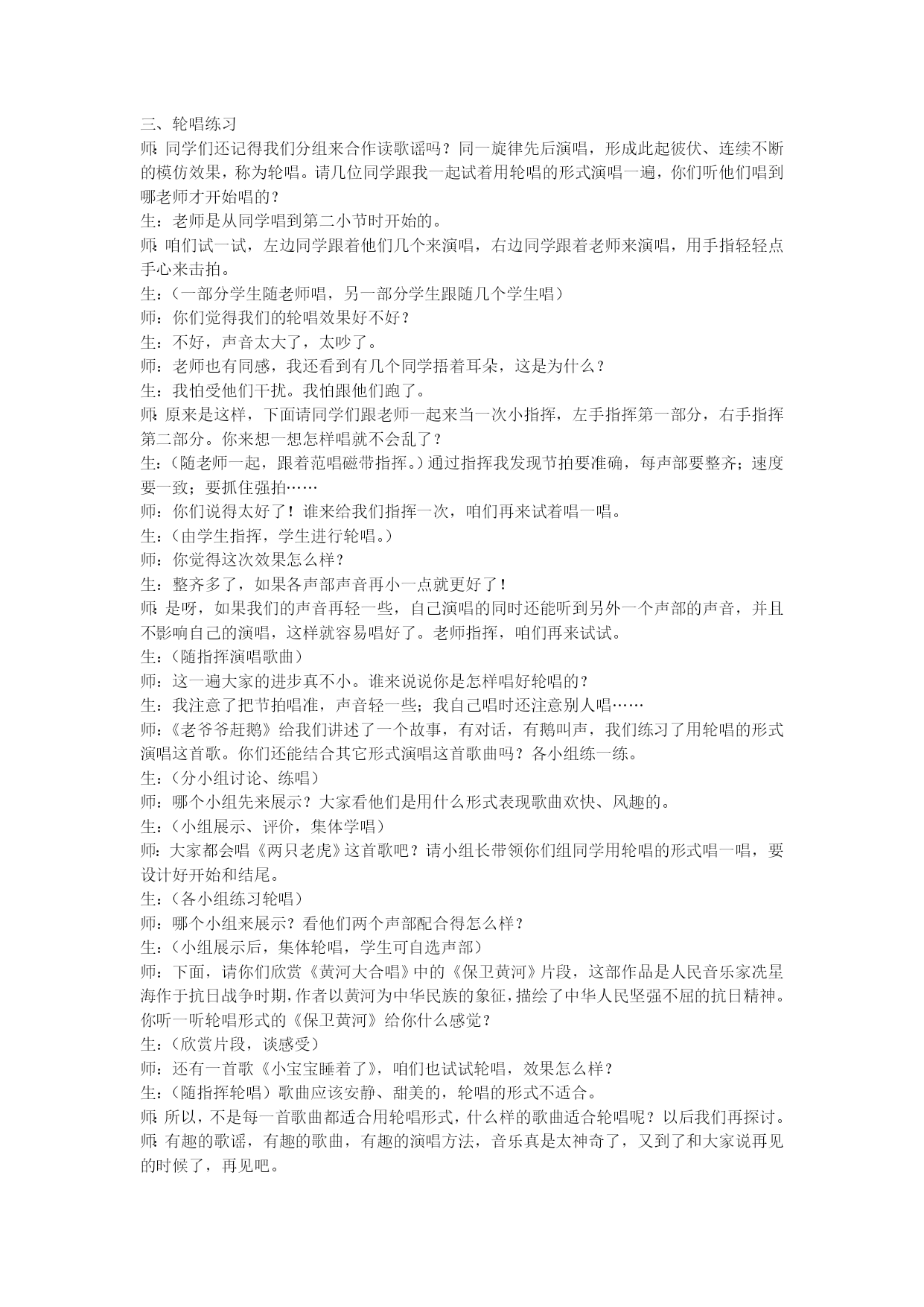 《老爷爷赶鹅》教案北渡小学杨心梦教学目标:1.能用自然的声音,较准确地节奏和合作意识,不断提高自己的协调能力。2.能用自然的声音、较准确的节奏和音调有表情地参与二声部轮唱。3.能与他人合作探索轮唱的方法,不断提高协调能力和多声部听觉能力。教学重、难点:1.重点:鼓励和引导学生参与艺术实践活动,增强自信心和与他人合作的能力。2.难点:二部轮唱时,学生容易产生“喊唱、赶拍、串调”现象。教材分析:《老爷爷赶鹅》是一首活泼、风趣的二部轮唱歌曲。各区短小集中,以买鹅的老爷爷与路人的对白,引出风趣、形象的鹅叫声,生动地刻画了老爷爷赶鹅的场面,具有较强的生活气息。歌曲为C大调,单乐段重复带扩充的结构,第二声部在第一声部演唱两小节后进入,形成二部轮唱。教学过程:一、导入师:我们一起来说一个有趣的歌谣,听清楚老师读歌谣的节奏,看谁模仿的最准确。有个老爷|爷—|进城赶群|鹅—|听到有人|喊—|要买一对|鹅—|爷爷回答|说—|我的老大|哥—|给我跳个|舞—|送你一对|鹅—|嘎嘎老爷爷|0嘎嘎嘎0|嘎嘎赶群鹅|0嘎嘎嘎0|学生听老师读一遍,然后试着读一遍。师:同学们真聪明,学得真快。不过大家一定要注意,休止符的地方一定要停住,咱们一起来练练。嘎嘎老爷爷|0嘎嘎嘎0|嘎嘎赶群鹅|0嘎嘎嘎0|学生练习,在有休止符的地方可以用一个动作表示。师:歌谣学会了,我们一起来做一个有趣的练习。我们分成A、B两组,A组同学先读,B组同学在第二小节进入,可不能跟着别的组的同学读哦。学生分成两组进行练习。生:老师,我们两组不是同时结束的。师:你们说的很好,A组同学先读了一小节,所以早结束一小节,你们有什么好办法可以让两组同时结束吗?生:老师,这不容易,A组同学多读一小节就可以同时结束了。师:好,我们就来试试你的这个办法,A组同学读完后把最后一小节重复一遍。学生分组练习。合作练习。二、学唱歌曲师:这个有趣的歌谣其实是一首歌曲,我们来听听。(老师播放范唱)师:我们先来唱一唱“鹅叫”的乐句,听老师唱一遍(边弹边唱最后四个乐句)。同学们唱的时候一定要注意“0嘎嘎嘎0”小节,最后的“嘎”音比较高,要注意音准。我们来练习一遍。学生合着伴奏练习“0嘎嘎嘎0”小节。师:大家唱得很好,我们来练习最后四个乐句。(学生练习最后四个乐句)师:我们来完整地学唱这首歌曲吧。前八个乐句老师唱一句,同学们唱一句;后四个乐句我们一起唱。(师生一起练习)师:同学们可以自愿组合小组练一练、唱一唱。师:同学们唱得很认真,演唱方法也很正确,大家合着伴奏一起来完整的演唱一遍吧。三、轮唱练习师:同学们还记得我们分组来合作读歌谣吗?同一旋律先后演唱,形成此起彼伏、连续不断的模仿效果,称为轮唱。请几位同学跟我一起试着用轮唱的形式演唱一遍,你们听他们唱到哪老师才开始唱的?生:老师是从同学唱到第二小节时开始的。师:咱们试一试,左边同学跟着他们几个来演唱,右边同学跟着老师来演唱,用手指轻轻点手心来击拍。生:(一部分学生随老师唱,另一部分学生跟随几个学生唱)师:你们觉得我们的轮唱效果好不好?生:不好,声音太大了,太吵了。师:老师也有同感,我还看到有几个同学捂着耳朵,这是为什么?生:我怕受他们干扰。我怕跟他们跑了。师:原来是这样,下面请同学们跟老师一起来当一次小指挥,左手指挥第一部分,右手指挥第二部分。你来想一想怎样唱就不会乱了?生:(随老师一起,跟着范唱磁带指挥。)通过指挥我发现节拍要准确,每声部要整齐;速度要一致;要抓住强拍……师:你们说得太好了!谁来给我们指挥一次,咱们再来试着唱一唱。生:(由学生指挥,学生进行轮唱。)师:你觉得这次效果怎么样?生:整齐多了,如果各声部声音再小一点就更好了!师:是呀,如果我们的声音再轻一些,自己演唱的同时还能听到另外一个声部的声音,并且不影响自己的演唱,这样就容易唱好了。老师指挥,咱们再来试试。生:(随指挥演唱歌曲)师:这一遍大家的进步真不小。谁来说说你是怎样唱好轮唱的?生:我注意了把节拍唱准,声音轻一些;我自己唱时还注意别人唱……师:《老爷爷赶鹅》给我们讲述了一个故事,有对话,有鹅叫声,我们练习了用轮唱的形式演唱这首歌。你们还能结合其它形式演唱这首歌曲吗?各小组练一练。生:(分小组讨论、练唱)师:哪个小组先来展示?大家看他们是用什么形式表现歌曲欢快、风趣的。生:(小组展示、评价,集体学唱)师:大家都会唱《两只老虎》这首歌吧?请小组长带领你们组同学用轮唱的形式唱一唱,要设计好开始和结尾。生:(各小组练习轮唱)师:哪个小组来展示?看他们两个声部配合得怎么样?生:(小组展示后,集体轮唱,学生可自选声部)师:下面,请你们欣赏《黄河大合唱》中的《保卫黄河》片段,这部作品是人民音乐家冼星海作于抗日战争时期,作者以黄河为中华民族的象征,描绘了中华人民坚强不屈的抗日精神。你听一听轮唱形式的《保卫黄河》给你什