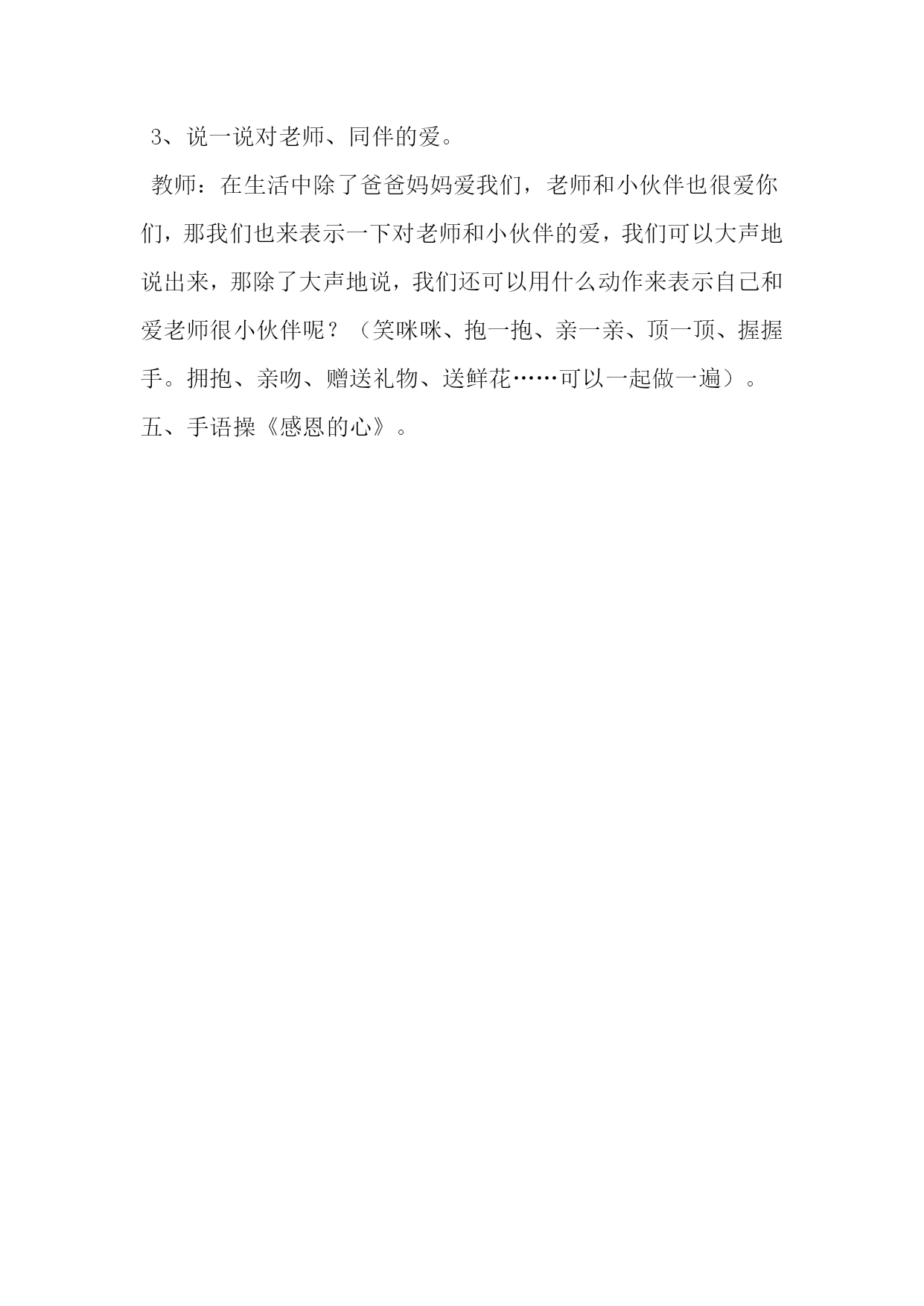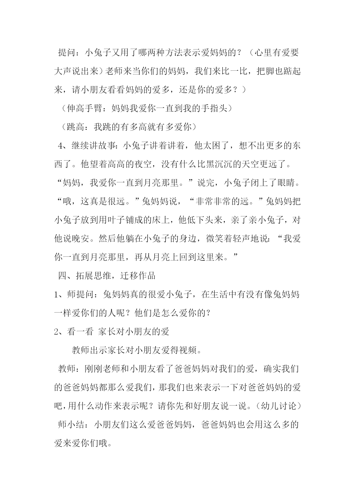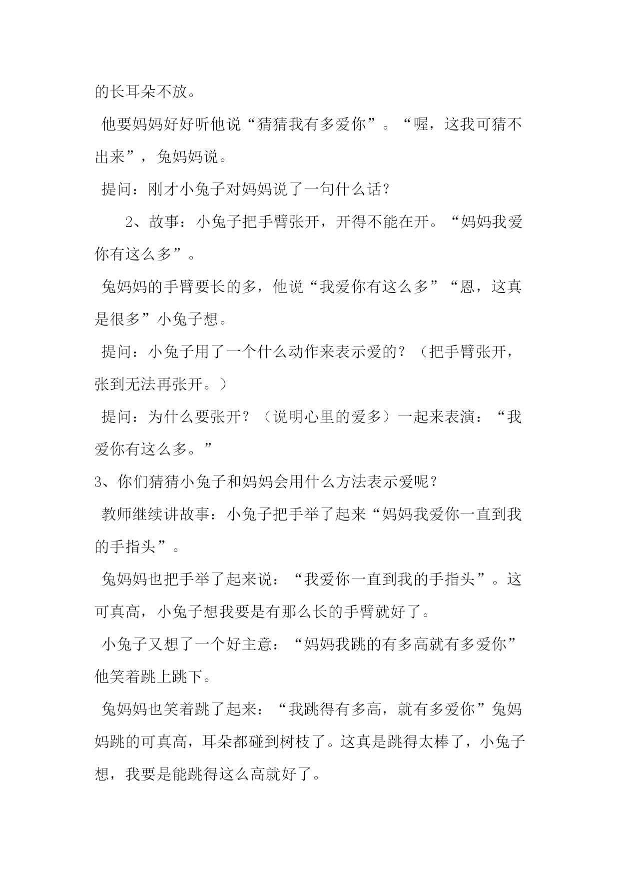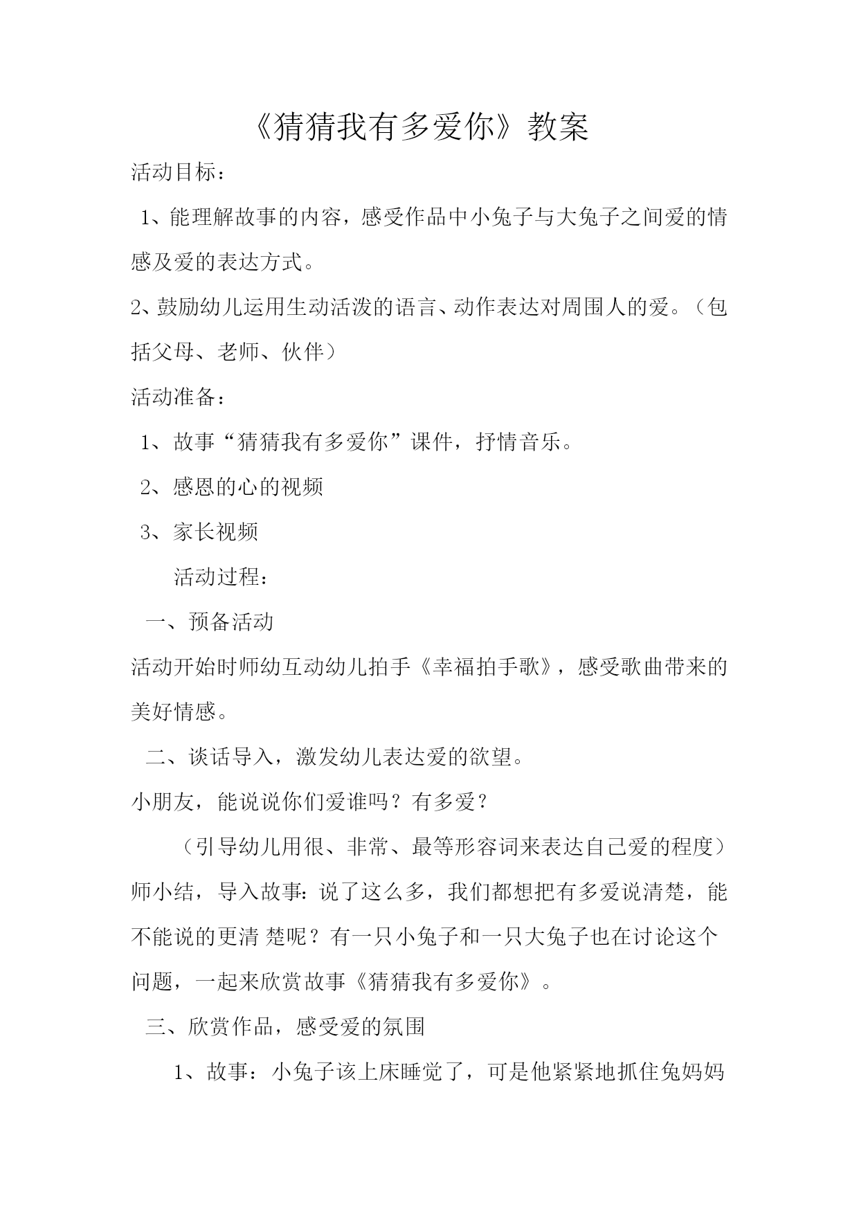 《猜猜我有多爱你》教案活动目标:1、能理解故事的内容,感受作品中小兔子与大兔子之间爱的情感及爱的表达方式。2、鼓励幼儿运用生动活泼的语言、动作表达对周围人的爱。(包括父母、老师、伙伴)活动准备:1、故事“猜猜我有多爱你”课件,抒情音乐。2、感恩的心的视频3、家长视频活动过程:一、预备活动活动开始时师幼互动幼儿拍手《幸福拍手歌》,感受歌曲带来的美好情感。二、谈话导入,激发幼儿表达爱的欲望。小朋友,能说说你们爱谁吗?有多爱?(引导幼儿用很、非常、最等形容词来表达自己爱的程度)师小结,导入故事:说了这么多,我们都想把有多爱说清楚,能不能说的更清楚呢?有一只小兔子和一只大兔子也在讨论这个问题,一起来欣赏故事《猜猜我有多爱你》。三、欣赏作品,感受爱的氛围1、故事:小兔子该上床睡觉了,可是他紧紧地抓住兔妈妈的长耳朵不放。他要妈妈好好听他说“猜猜我有多爱你”。“喔,这我可猜不出来”,兔妈妈说。提问:刚才小兔子对妈妈说了一句什么话?2、故事:小兔子把手臂张开,开得不能在开。“妈妈我爱你有这么多”。兔妈妈的手臂要长的多,他说“我爱你有这么多”“恩,这真是很多”小兔子想。提问:小兔子用了一个什么动作来表示爱的?(把手臂张开,张到无法再张开。)提问:为什么要张开?(说明心里的爱多)一起来表演:“我爱你有这么多。”3、你们猜猜小兔子和妈妈会用什么方法表示爱呢?教师继续讲故事:小兔子把手举了起来“妈妈我爱你一直到我的手指头”。兔妈妈也把手举了起来说:“我爱你一直到我的手指头”。这可真高,小兔子想我要是有那么长的手臂就好了。小兔子又想了一个好主意:“妈妈我跳的有多高就有多爱你”他笑着跳上跳下。兔妈妈也笑着跳了起来:“我跳得有多高,就有多爱你”兔妈妈跳的可真高,耳朵都碰到树枝了。这真是跳得太棒了,小兔子想,我要是能跳得这么高就好了。提问:小兔子又用了哪两种方法表示爱妈妈的?(心里有爱要大声说出来)老师来当你们的妈妈,我们来比一比,把脚也踮起来,请小朋友看看妈妈的爱多,还是你的爱多?)(伸高手臂:妈妈我爱你一直到我的手指头)(跳高:我跳的有多高就有多爱你)4、继续讲故事:小兔子讲着讲着,他太困了,想不出更多的东西了。他望着高高的夜空,没有什么比黑沉沉的天空更远了。“妈妈,我爱你一直到月亮那里。”说完,小兔子闭上了眼睛。“哦,这真是很远。”兔妈妈说,“非常非常的远。”兔妈妈把小兔子放到用叶子铺成的床上,他低下头来,亲了亲小兔子,对他说晚安。然后他躺在小兔子的身边,微笑着轻声地说:“我爱你一直到月亮那里,再从月亮上回到这里来。”四、拓展思维,迁移作品1、师提问:兔妈妈真的很爱小兔子,在生活中有没有像兔妈妈一样爱你们的人呢?他们是怎么爱你的?2、看一看家长对小朋友的爱教师出示家长对小朋友爱得视频。教师:刚刚老师和小朋友看了爸爸妈妈对我们的爱,确实我们的爸爸妈妈都那么爱我们,那我们也来表示一下对爸爸妈妈的爱吧,用什么动作来表示呢?请你先和好朋友说一说。(幼儿讨论)师小结:小朋友们这么爱爸爸妈妈,爸爸妈妈也会用这么多的爱来爱你们哦。3、说一说对老师、同伴的爱。教师:在生活中除了爸爸妈妈爱我们,老师和小伙伴也很爱你们,那我们也来表示一下对老师和小伙伴的爱,我们可以大声地说出来,那除了大声地说,我们还可以用什么动作来表示自己和爱老师很小伙伴呢?(笑咪咪、抱一抱、亲一亲、顶一顶、握握手。拥抱、亲吻、赠送礼物、送鲜花……可以一起做一遍)。五、手语操《感恩的心》。