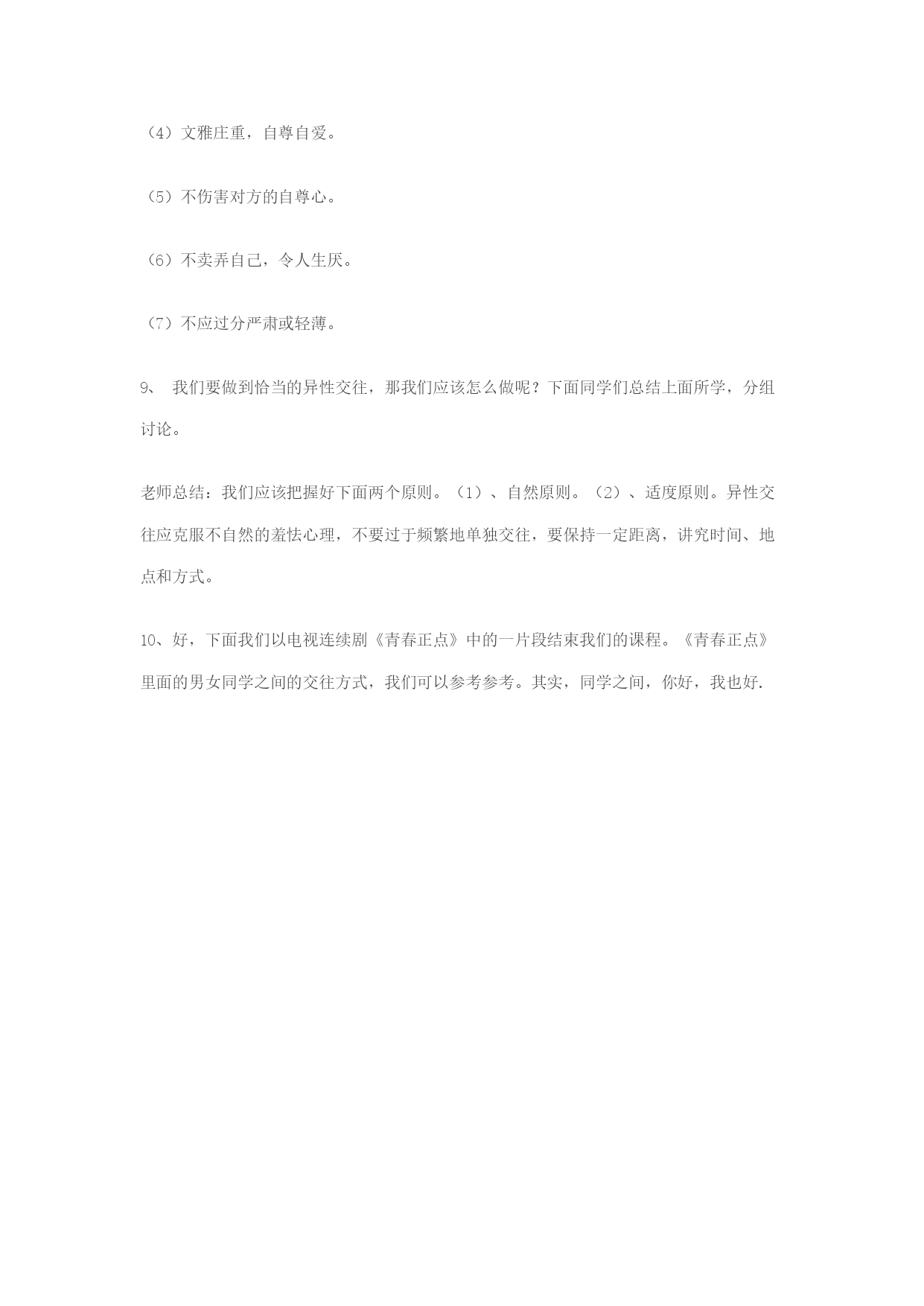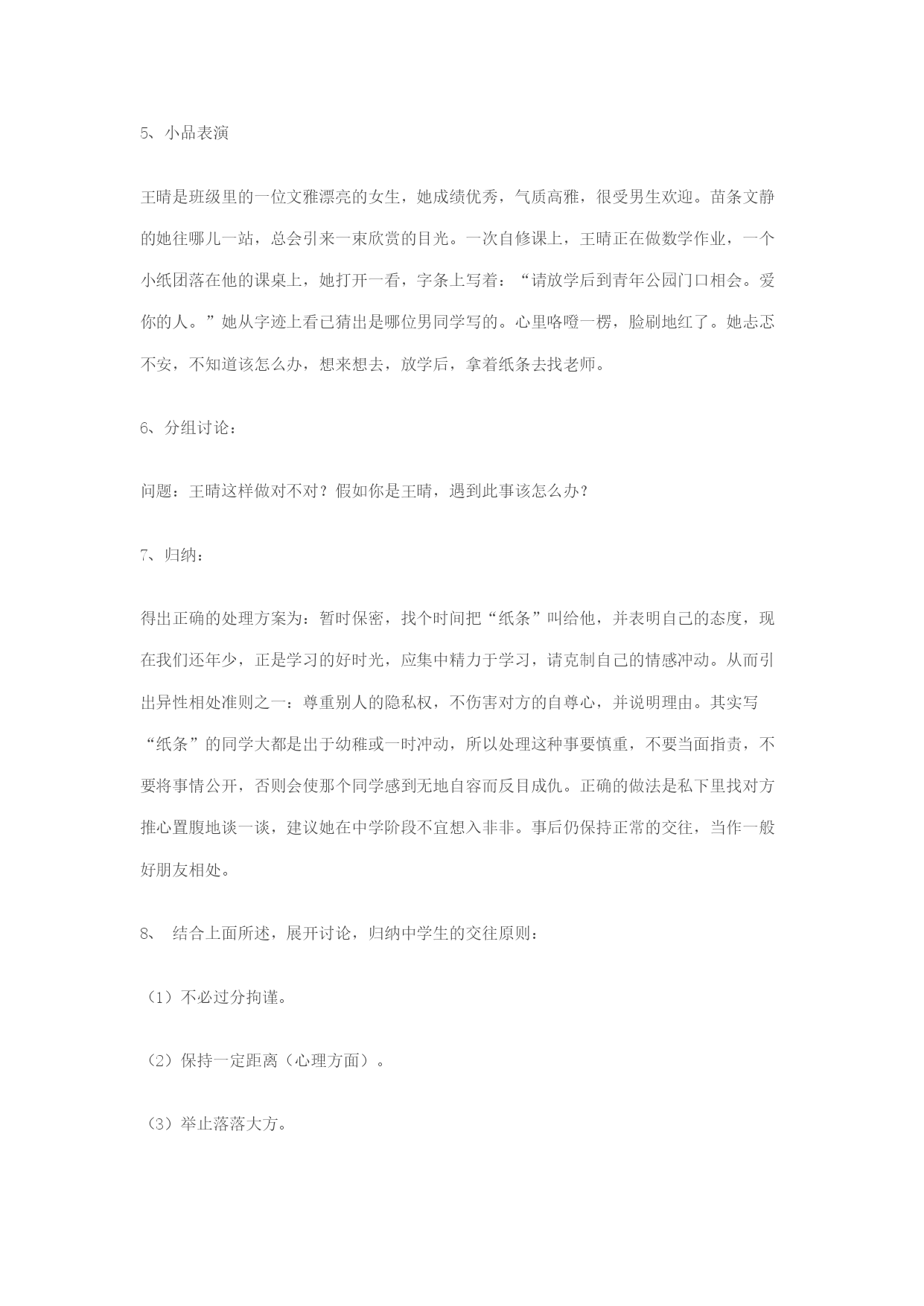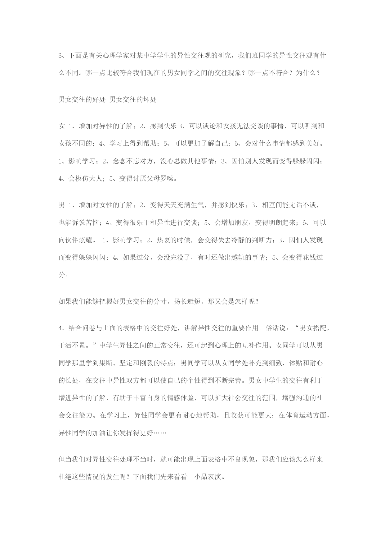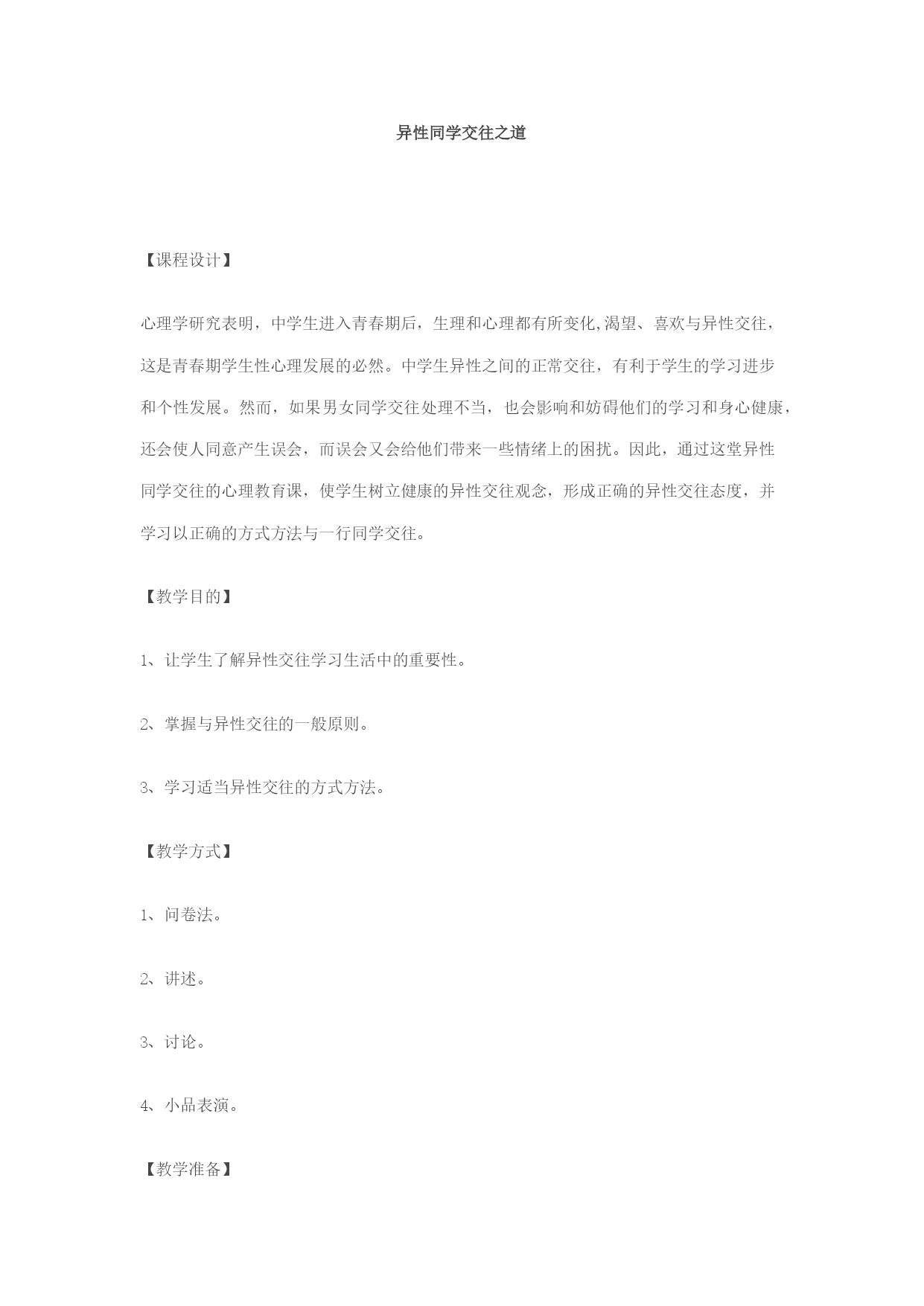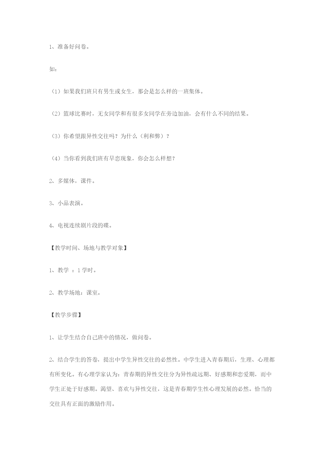 异性同学交往之道【课程设计】心理学研究表明,中学生进入青春期后,生理和心理都有所变化,渴望、喜欢与异性交往,这是青春期学生性心理发展的必然。中学生异性之间的正常交往,有利于学生的学习进步和个性发展。然而,如果男女同学交往处理不当,也会影响和妨碍他们的学习和身心健康,还会使人同意产生误会,而误会又会给他们带来一些情绪上的困扰。因此,通过这堂异性同学交往的心理教育课,使学生树立健康的异性交往观念,形成正确的异性交往态度,并学习以正确的方式方法与一行同学交往。【教学目的】1、让学生了解异性交往学习生活中的重要性。2、掌握与异性交往的一般原则。3、学习适当异性交往的方式方法。【教学方式】1、问卷法。2、讲述。3、讨论。4、小品表演。【教学准备】1、准备好问卷。如:(1)如果我们班只有男生或女生,那会是怎么样的一班集体。(2)篮球比赛时,无女同学和有很多女同学在旁边加油,会有什么不同的结果。(3)你希望跟异性交往吗?为什么(利和弊)?(4)当你看到我们班有早恋现象,你会怎么样想?2、多媒体,课件。3、小品表演。4、电视连续剧片段的碟。【教学时间、场地与教学对象】1、教学:1学时。2、教学场地:课室。【教学步骤】1、让学生结合自己班中的情况,做问卷。2、结合学生的答卷,提出中学生异性交往的必然性。中学生进入青春期后,生理、心理都有所变化。有心理学家认为:青春期的异性交往分为异性疏远期、好感期和恋爱期,而中学生正处于好感期。渴望、喜欢与异性交往,这是青春期学生性心理发展的必然。恰当的交往具有正面的激励作用。3、下面是有关心理学家对某中学学生的异性交往观的研究,我们班同学的异性交往观有什么不同。哪一点比较符合我们现在的男女同学之间的交往现象?哪一点不符合?为什么?男女交往的好处男女交往的坏处女1、增加对异性的了解;2、感到快乐3、可以谈论和女孩无法交谈的事情,可以听到和女孩不同的;4、学习上得到帮助;5、可以更加了解自己;6、会对什么事情都感到美好。1、影响学习;2、念念不忘对方,没心思做其他事情;3、因怕别人发现而变得躲躲闪闪;4、会模仿大人;5、变得讨厌父母罗嗦。男1、增加对女性的了解;2、变得天天充满生气,并感到快乐;3、相互间能无话不谈,也能诉说苦恼;4、变得很乐于和异性进行交谈;5、会增加朋友,变得明朗起来;6、可以向伙伴炫耀。1、影响学习;2、热衷的时候,会变得失去冷静的判断力;3、因怕人发现而变得躲躲闪闪;4、如果过分,会没完没了,有时还做出越轨的事情;5、会变得花钱过分。如果我们能够把握好男女交往的分寸,扬长避短,那又会是怎样呢?4、结合问卷与上面的表格中的交往好处,讲解异性交往的重要作用。俗话说:“男女搭配,干活不累。”中学生异性之间的正常交往,还可起到心理上的互补作用。女同学可以从男同学那里学到果断、坚定和刚毅的特点;男同学可以从女同学处补充到细致、体贴和耐心的长处,在交往中异性双方都可以使自己的个性得到不断完善。男女中学生的交往有利于增进异性的了解,有助于丰富自身的情感体验,可以扩大社会交往的范围,增强沟通的社会交往能力。在学习上,异性同学会更有耐心地帮助,且收获可能更大;在体育运动方面,异性同学的加油让你发挥得更好……但当我们对异性交往处理不当时,就可能出现上面表格中不良现象,那我们应该怎么样来杜绝这些情况的发生呢?下面我们先来看看一小品表演。5、小品表演王晴是班级里的一位文雅漂亮的女生,她成绩优秀,气质高雅,很受男生欢迎。苗条文静的她往哪儿一站,总会引来一束欣赏的目光。一次自修课上,王晴正在做数学作业,一个小纸团落在他的课桌上,她打开一看,字条上写着:“请放学后到青年公园门口相会。爱你的人。”她从字迹上看已猜出是哪位男同学写的。心里咯噔一楞,脸刷地红了。她忐忑不安,不知道该怎么办,想来想去,放学后,拿着纸条去找老师。6、分组讨论:问题:王晴这样做对不对?假如你是王晴,遇到此事该怎么办?7、归纳:得出正确的处理方案为:暂时保密,找个时间把“纸条”叫给他,并表明自己的态度,现在我们还年少,正是学习的好时光,应集中精力于学习,请克制自己的情感冲动。从而引出异性相处准则之一:尊重别人的隐私权,不伤害对方的自尊心,并说明理由。其实写“纸条”的同学大都是出于幼稚或一时冲动,所以处理这种事要慎重,不要当面指责,不要将事情公开,否则会使那个同学感到无地自容而反目成仇。正确的做法是私下里找对方推心置腹地谈一谈,建议她在中学阶段不宜想入非非。事后仍保持正常的交往,当作一般好朋友相处。8、结合上面所述,展开讨论,归纳中学生的交往原则:(1)不必过分拘谨。(2)保持一定距离(心理方面)。(3)举止落落大方。(4)文雅庄重,自尊自爱。(5)不伤害对方的自尊心。(6)不卖弄自己,令人生厌。(7)不应过分严肃或轻薄。9、我们要做到恰当的异性交往,