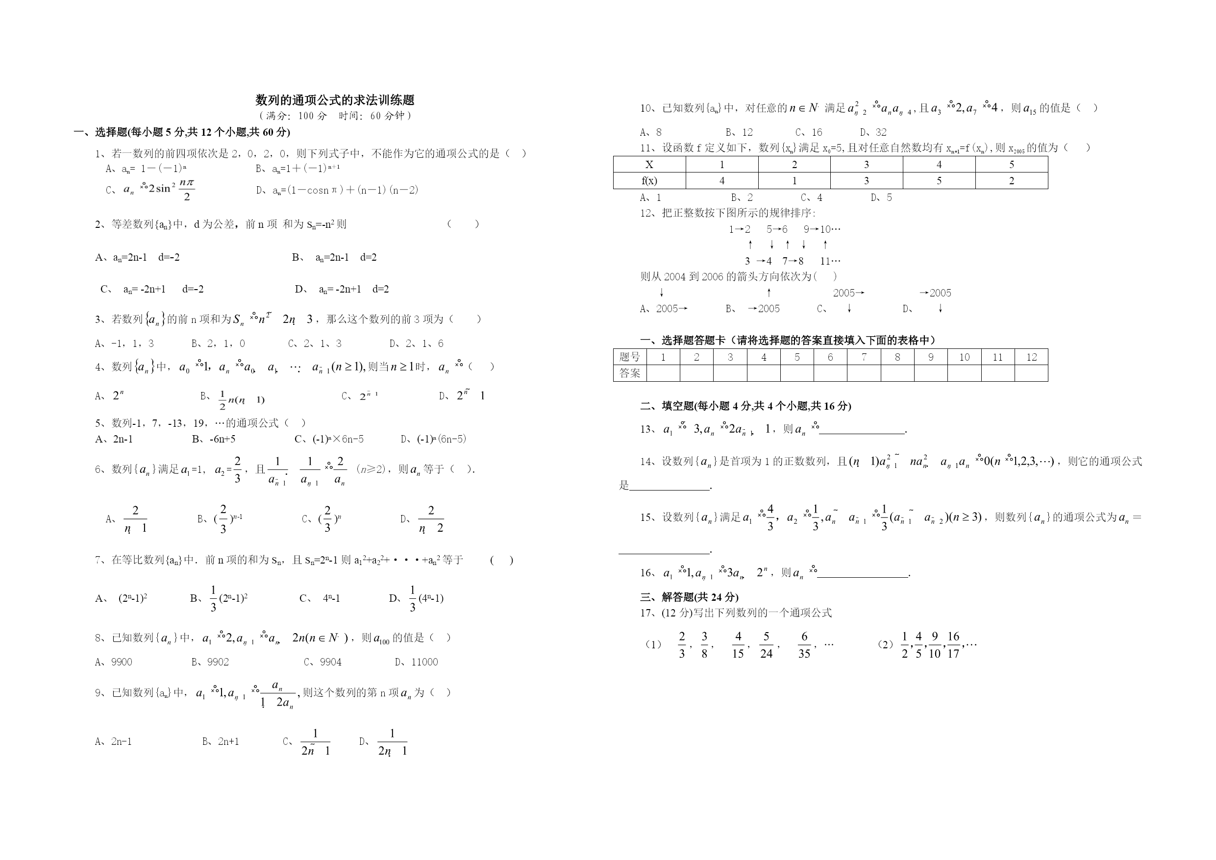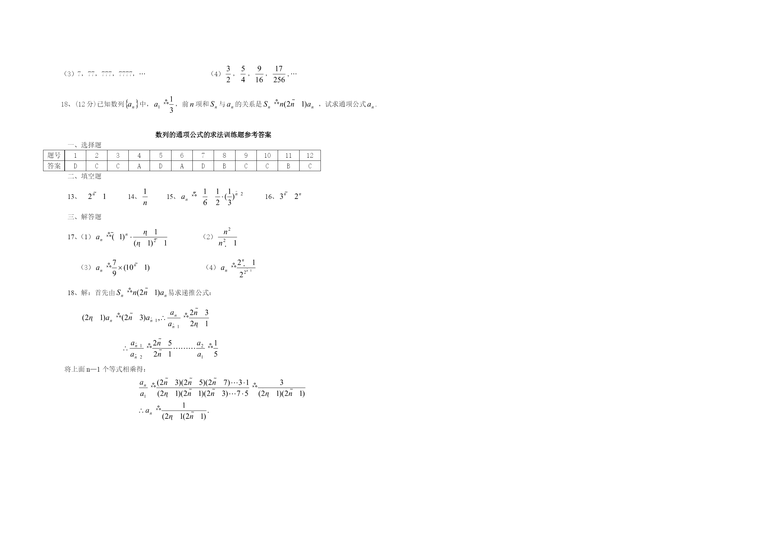 数列的通项公式的求法训练题(满分:100分时间:60分钟)一、选择题(每小题5分,共12个小题,共60分)1、若一数列的前四项依次是2,0,2,0,则下列式子中,不能作为它的通项公式的是()A、an=1-(-1)nB、an=1+(-1)n+1C、D、an=(1-cosnπ)+(n-1)(n-2)2、等差数列{an}中,d为公差,前n项和为sn=-n2则()A、an=2n-1d=-2B、an=2n-1d=2C、an=-2n+1d=-2D、an=-2n+1d=23、若数列的前n项和为,那么这个数列的前3项为()A、-1,1,3B、2,1,0C、2、1、3D、2、1、64、数列中,则当时,()A、B、C、D、5、数列-1,7,-13,19,…的通项公式()A、2n-1B、-6n+5C、(-1)n×6n-5D、(-1)n(6n-5)6、数列{}满足=1,=,且(n≥2),则等于().A、B、()n-1C、()nD、7、在等比数列{an}中.前n项的和为sn,且sn=2n-1则a12+a22+···+an2等于()A、(2n-1)2B、(2n-1)2C、4n-1D、(4n-1)8、已知数列{}中,,则的值是()A、9900B、9902C、9904D、110009、已知数列{an}中,则这个数列的第n项为()A、2n-1B、2n+1C、D、10、已知数列{an}中,对任意的满足,且,则的值是()A、8B、12C、16D、3211、设函数f定义如下,数列{xn}满足x0=5,且对任意自然数均有xn+1=f(xn),则x2005的值为()X12345f(x)41352A、1B、2C、4D、512、把正整数按下图所示的规律排序:1→25→69→10…↑↓↑↓↑3→47→811…则从2004到2006的箭头方向依次为()↓↑2005→→2005A、2005→B、→2005C、↓D、↓一、选择题答题卡(请将选择题的答案直接填入下面的表格中)题号123456789101112答案二、填空题(每小题4分,共4个小题,共16分)13、,则________________.14、设数列{}是首项为1的正数数列,且,则它的通项公式是_______________.15、设数列{}满足,则数列{}的通项公式为=_________________.16、,则_________________.三、解答题(共24分)17、(12分)写出下列数列的一个通项公式(1),,,,,…(2)(3)7,77,777,7777,…(4),,,,…18、(12分)已知数列中,,前项和与的关系是,试求通项公式.数列的通项公式的求法训练题参考答案一、选择题题号123456789101112答案DCCADADBCCBC二、填空题13、14、15、16、三、解答题17、(1)(2)(3)(4)18、解:首先由易求递推公式:将上面n—1个等式相乘得:
