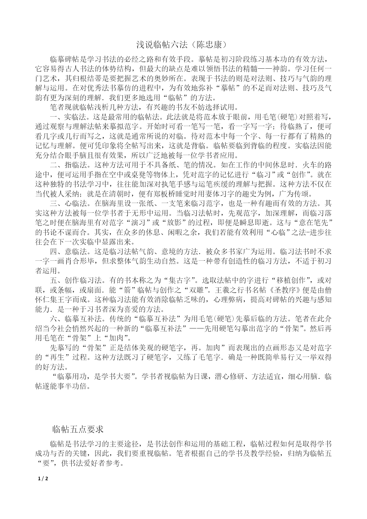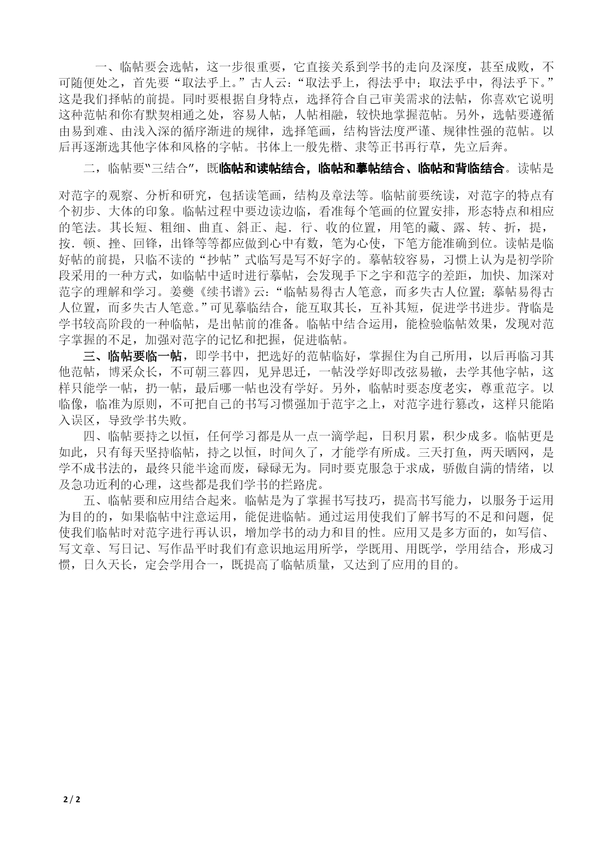 /NUMPAGES2浅说临帖六法(陈忠康)临摹碑帖是学习书法的必经之路和有效手段。摹帖是初习阶段练习基本功的有效方法,它容易得古人书法的体势结构,但最大的缺点是难以领悟书法的精髓——神韵。学习任何一门艺术,其归根结蒂是要把握艺术的奥妙所在。表现于书法的则是对法则、技巧与气韵的理解与运用。在对优秀法书摹仿的进程中,为有效地弥补“摹帖”的不足而对法则、技巧及气韵有更为深刻的理解.我们更多地选用“临帖”的方法。笔者现就临帖浅析几种方法,有兴趣的书友不妨选择试用。一、实临法。这是最常用的临帖法。此法就是将范本放于眼前,用毛笔(硬笔)对照着写,通过观察与理解法帖来摹拟范字。开始时可看一笔写一笔,看一字写一字;待临熟了,便可看几字或几行而写之,这就是通常所说的对临。待对范本中每一个字、每一行都有了精熟的记忆与理解。便可凭印象将全帖写出来,这就是背临。临帖要临到背临的程度。实临法因能充分结合眼手脑且很有效果,所以广泛地被每一位学书者应用。二、指临法。这种方法可用于不具备纸、笔的情况。如在工作的中间休息时.火车的路途中,便可运用手指在空中或桌凳等物体上,凭对范字的记忆进行“临习”或“创作”。就在这种独特的书法学习中,往往能加深对执笔手感与运笔疾缓的理解与把握。这种方法不仅在当代被人采纳;就是在清朝时,便有郑板桥睡觉时用妻体习字的趣史为例,广为传颂。三、心临法。在脑海里设一张纸、一支笔来临习范字,也是一种有趣而有效的方法。其实这种方法被每一位学书者于无形中运用。当临习法帖时,先观范字,加深理解,而临习落笔之时便在脑海里有对范字“演习”或“放影”的过程,即便是瞬息即逝。这与“意在笔先”的书论不谋而合。其实,在众多的休息、闲暇之余,我们若能有效利用“心临”之法-进步往往会在下一次实临中显露出来。四、意临法。这是临习法帖气韵、意境的方法.被众多书家广为运用。临习法书时不求一字一画肖合形毕,但求整体气韵生动自然。这是一种带有创造性的临习方法,不适于初习者运用。五、创作临习法。有的书本称之为“集古字”。选取法帖中的字进行“移植创作”,或对联,或条幅,或扇面.能“箭”临帖与创作之“双雕”。王羲之行书名帖《圣教序》便是由僧怀仁集王字而成。这种临习法能有效消除临帖乏味的,心理弊病,提高对碑帖的兴趣与感知能力.是一种于习书者深为喜爱的方法。六、临摹互补法。传统的“临摹互补法”为用毛笔(硬笔)先摹后临的方法。笔者在此介绍当今社会悄然兴起的一种新的“临摹互补法”——先用硬笔勾摹出范字的“骨架”。然后再用毛笔在“骨架”上“加肉”。先摹写的“骨架”正是结体美观的硬笔字,再。加肉”而表现出的点画形态又是对范字的“再生”过程。这种方法既习了硬笔字,又练了毛笔字.确是一种既简单易行又一举双得的好方法。“临摹用功,是学书大要”。学书者视临帖为日课,潜心修研、方法适宜,细心用脑.临帖遂能事半功倍。临帖五点要求临帖是书法学习的主要途径,是书法创作和运用的基础工程,临帖过程如何是取得学书成功与否的关键,因此,我们要重视临帖。笔者根据自己的学书及教学经验,归纳为临帖五“要”,供书法爱好者参考。一、临帖要会选帖,这一步很重要,它直接关系到学书的走向及深度,甚至成败,不可随便处之,首先要“取法乎上。”古人云:“取法乎上,得法乎中;取法乎中,得法乎下。”这是我们择帖的前提。同时要根据自身特点,选择符合自己审美需求的法帖,你喜欢它说明这种范帖和你有默契相通之处,容易人帖,人帖相融,较快地掌握范帖。另外,选帖要遵循由易到难、由浅入深的循序渐进的规律,选择笔画,结构皆法度严谨、规律性强的范帖。以后再逐渐选其他字体和风格的字帖。书体上一般先楷、隶等正书再行草,先立后奔。二,临帖要“三结合”,既临帖和读帖结合,临帖和摹帖结合、临帖和背临结合。读帖是对范字的观察、分析和研究,包括读笔画,结构及章法等。临帖前要统读,对范字的特点有个初步、大体的印象。临帖过程中要边读边临,看准每个笔画的位置安排,形态特点和相应的笔法。其长短、粗细、曲直、斜正、起.行、收的位置,用笔的藏、露、转、折,提,按.顿、挫、回锋,出锋等等都应做到心中有数,笔为心使,下笔方能准确到位。读帖是临好帖的前提,只临不读的“抄帖”式临写是写不好字的。摹帖较容易,习惯上认为是初学阶段采用的一种方式,如临帖中适时进行摹帖,会发现手下之宇和范字的差距,加快、加深对范字的理解和学习。姜夔《续书谱》云:“临帖易得古人笔意,而多失古人位置;摹帖易得古人位置,而多失古人笔意。”可见摹临结合,能互取其长,互补其短,促进学书进步。背临是学书较高阶段的一种临帖,是出帖前的准备。临帖中结合运用,能检验临帖效果,发现对范字掌握的不足,加强对范字的记忆和把握,促进临帖。三、临帖要临一帖,即学书中,把选好的范帖临好,掌握住为自己所用,以后再临习其他