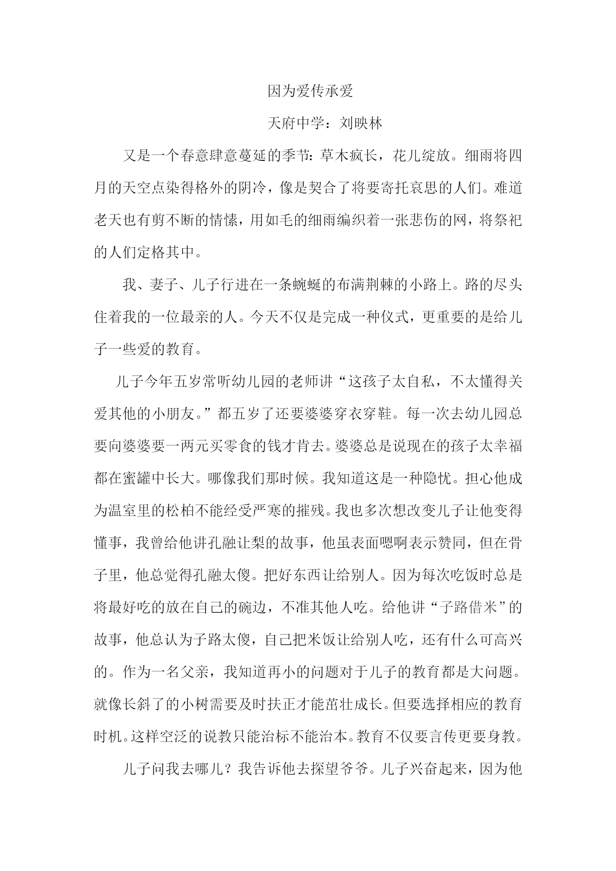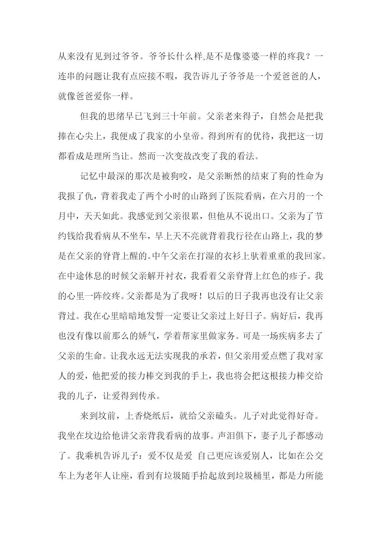 因为爱传承爱天府中学:刘映林又是一个春意肆意蔓延的季节:草木疯长,花儿绽放。细雨将四月的天空点染得格外的阴冷,像是契合了将要寄托哀思的人们。难道老天也有剪不断的情愫,用如毛的细雨编织着一张悲伤的网,将祭祀的人们定格其中。我、妻子、儿子行进在一条蜿蜒的布满荆棘的小路上。路的尽头住着我的一位最亲的人。今天不仅是完成一种仪式,更重要的是给儿子一些爱的教育。儿子今年五岁常听幼儿园的老师讲“这孩子太自私,不太懂得关爱其他的小朋友。”都五岁了还要婆婆穿衣穿鞋。每一次去幼儿园总要向婆婆要一两元买零食的钱才肯去。婆婆总是说现在的孩子太幸福都在蜜罐中长大。哪像我们那时候。我知道这是一种隐忧。担心他成为温室里的松柏不能经受严寒的摧残。我也多次想改变儿子让他变得懂事,我曾给他讲孔融让梨的故事,他虽表面嗯啊表示赞同,但在骨子里,他总觉得孔融太傻。把好东西让给别人。因为每次吃饭时总是将最好吃的放在自己的碗边,不准其他人吃。给他讲“子路借米”的故事,他总认为子路太傻,自己把米饭让给别人吃,还有什么可高兴的。作为一名父亲,我知道再小的问题对于儿子的教育都是大问题。就像长斜了的小树需要及时扶正才能茁壮成长。但要选择相应的教育时机。这样空泛的说教只能治标不能治本。教育不仅要言传更要身教。儿子问我去哪儿?我告诉他去探望爷爷。儿子兴奋起来,因为他从来没有见到过爷爷。爷爷长什么样,是不是像婆婆一样的疼我?一连串的问题让我有点应接不暇,我告诉儿子爷爷是一个爱爸爸的人,就像爸爸爱你一样。但我的思绪早已飞到三十年前。父亲老来得子,自然会是把我捧在心尖上,我便成了我家的小皇帝。得到所有的优待,我把这一切都看成是理所当让。然而一次变故改变了我的看法。记忆中最深的那次是被狗咬,是父亲断然的结束了狗的性命为我报了仇,背着我走了两个小时的山路到了医院看病,在六月的一个月中,天天如此。我感觉到父亲很累,但他从不说出口。父亲为了节约钱给我看病从不坐车,早上天不亮就背着我行径在山路上,我的梦是在父亲的脊背上醒的。中午父亲在打湿的衣衫上驮着重重的我回家。在中途休息的时候父亲解开衬衣,我看着父亲脊背上红色的疹子。我的心里一阵绞疼。父亲都是为了我呀!以后的日子我再也没有让父亲背过。我在心里暗暗地发誓一定要让父亲过上好日子。病好后,我再也没有像以前那么的娇气,学着帮家里做家务。可是一场疾病多去了父亲的生命。让我永远无法实现我的承若,但父亲用爱点燃了我对家人的爱,他把爱的接力棒交到我的手上,我也将会把这根接力棒交给我的儿子,让爱得到传承。来到坟前,上香烧纸后,就给父亲磕头。儿子对此觉得好奇。我坐在坟边给他讲父亲背我看病的故事。声泪俱下,妻子儿子都感动了。我乘机告诉儿子:爱不仅是爱自己更应该爱别人,比如在公交车上为老年人让座,看到有垃圾随手拾起放到垃圾桶里,都是力所能及的,但都显示了你对别人的爱。刚才在路上你用脚踩踏了小草只是不想让它弄脏你的鞋,你知道小草有多疼他为人类吐出了氧气却受到人类的践踏它应该多么的伤心。儿子在返回的路上总是小心翼翼的,当走到被他踩到的小草的地方时,他躬下身扶起倒伏的小草,口中喃喃有词,小草对不起,是我伤害了你。我今后会注意的,爸爸说了要有爱心才是男子汉。我要做有爱心的男子汉。后来儿子生病,晚上打车去儿科医醒来院当你看着爸爸妈妈焦急的表情,你给了我们一个微笑,我知道你明白了什么是爱。
