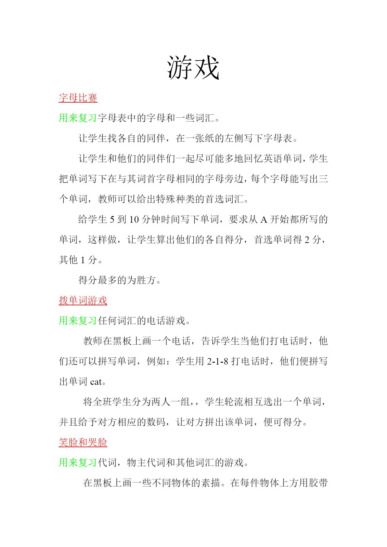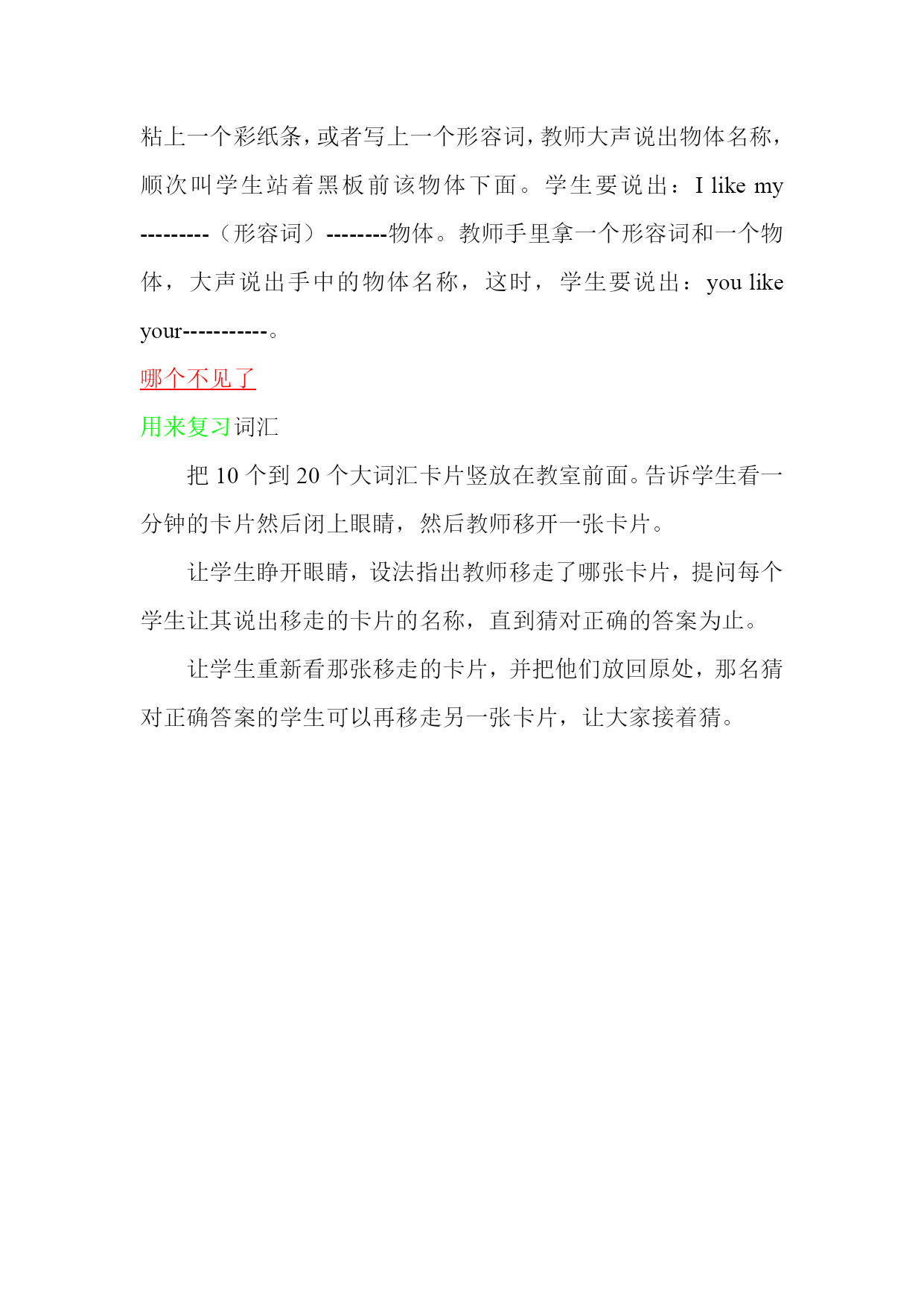 游戏字母比赛用来复习字母表中的字母和一些词汇。让学生找各自的同伴,在一张纸的左侧写下字母表。让学生和他们的同伴们一起尽可能多地回忆英语单词,学生把单词写下在与其词首字母相同的字母旁边,每个字母能写出三个单词,教师可以给出特殊种类的首选词汇。给学生5到10分钟时间写下单词,要求从A开始都所写的单词,这样做,让学生算出他们的各自得分,首选单词得2分,其他1分。得分最多的为胜方。拨单词游戏用来复习任何词汇的电话游戏。教师在黑板上画一个电话,告诉学生当他们打电话时,他们还可以拼写单词,例如:学生用2-1-8打电话时,他们便拼写出单词cat。将全班学生分为两人一组,,学生轮流相互选出一个单词,并且给予对方相应的数码,让对方拼出该单词,便可得分。笑脸和哭脸用来复习代词,物主代词和其他词汇的游戏。在黑板上画一些不同物体的素描。在每件物体上方用胶带粘上一个彩纸条,或者写上一个形容词,教师大声说出物体名称,顺次叫学生站着黑板前该物体下面。学生要说出:Ilikemy---------(形容词)--------物体。教师手里拿一个形容词和一个物体,大声说出手中的物体名称,这时,学生要说出:youlikeyour-----------。哪个不见了用来复习词汇把10个到20个大词汇卡片竖放在教室前面。告诉学生看一分钟的卡片然后闭上眼睛,然后教师移开一张卡片。让学生睁开眼睛,设法指出教师移走了哪张卡片,提问每个学生让其说出移走的卡片的名称,直到猜对正确的答案为止。让学生重新看那张移走的卡片,并把他们放回原处,那名猜对正确答案的学生可以再移走另一张卡片,让大家接着猜。