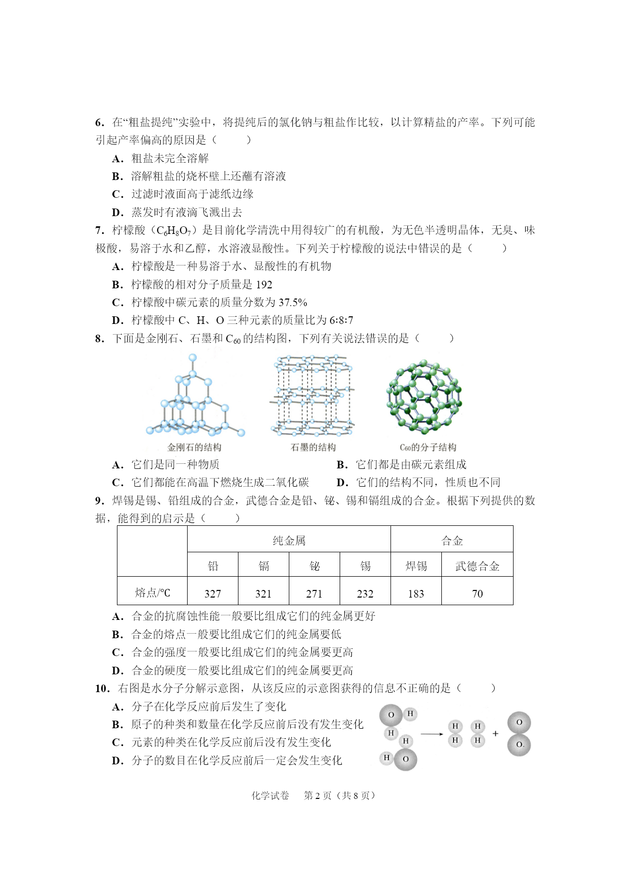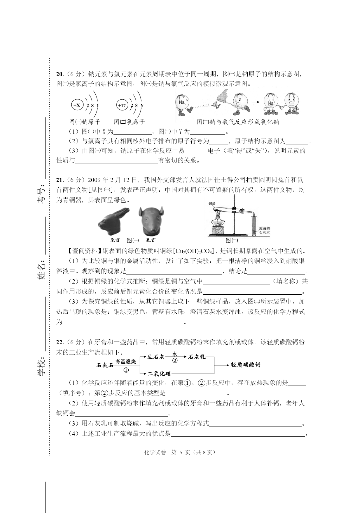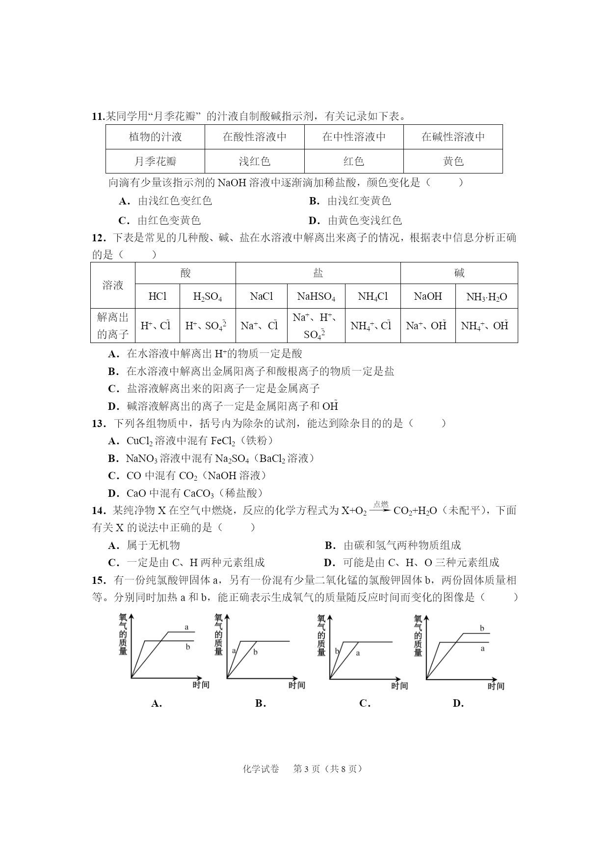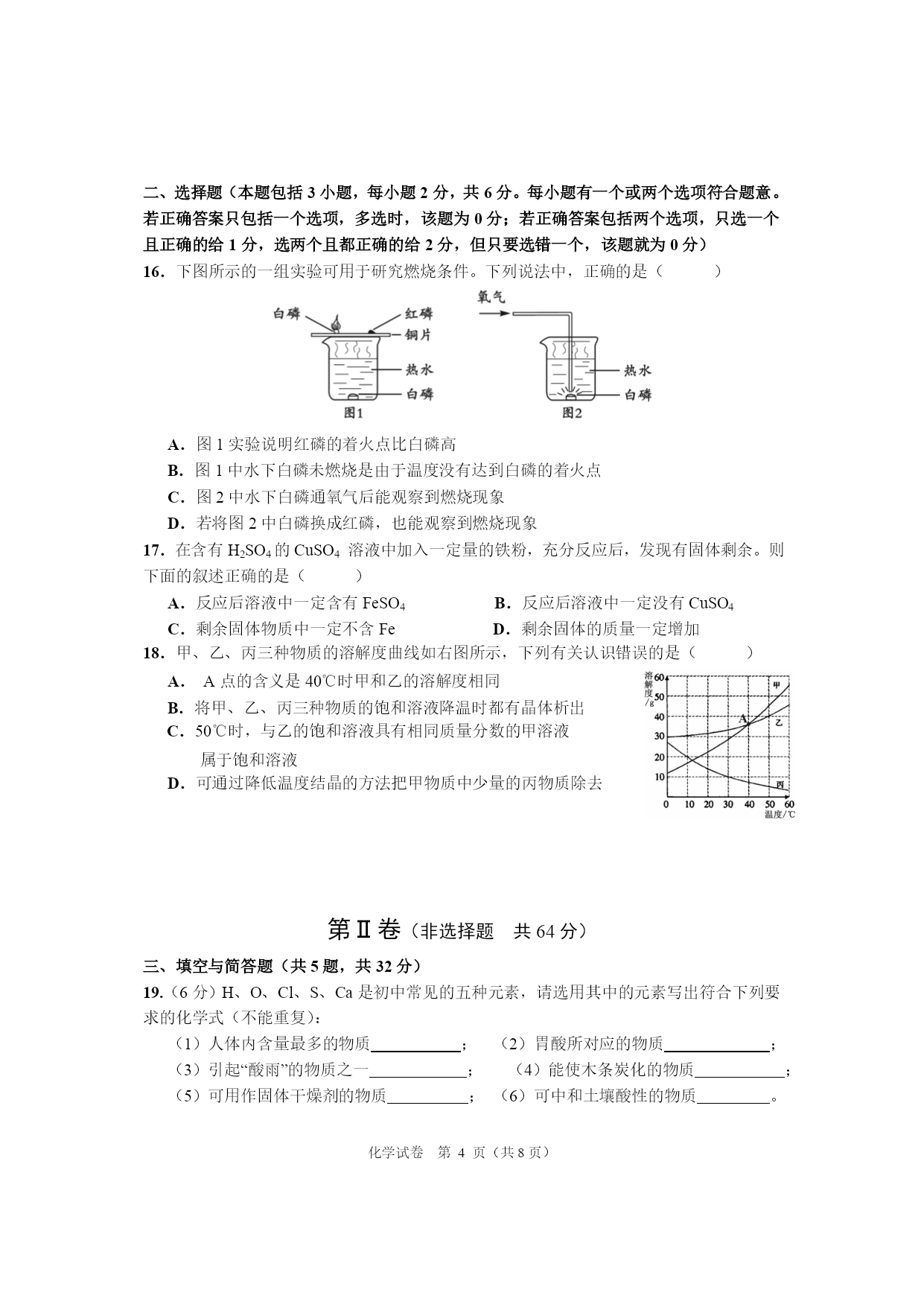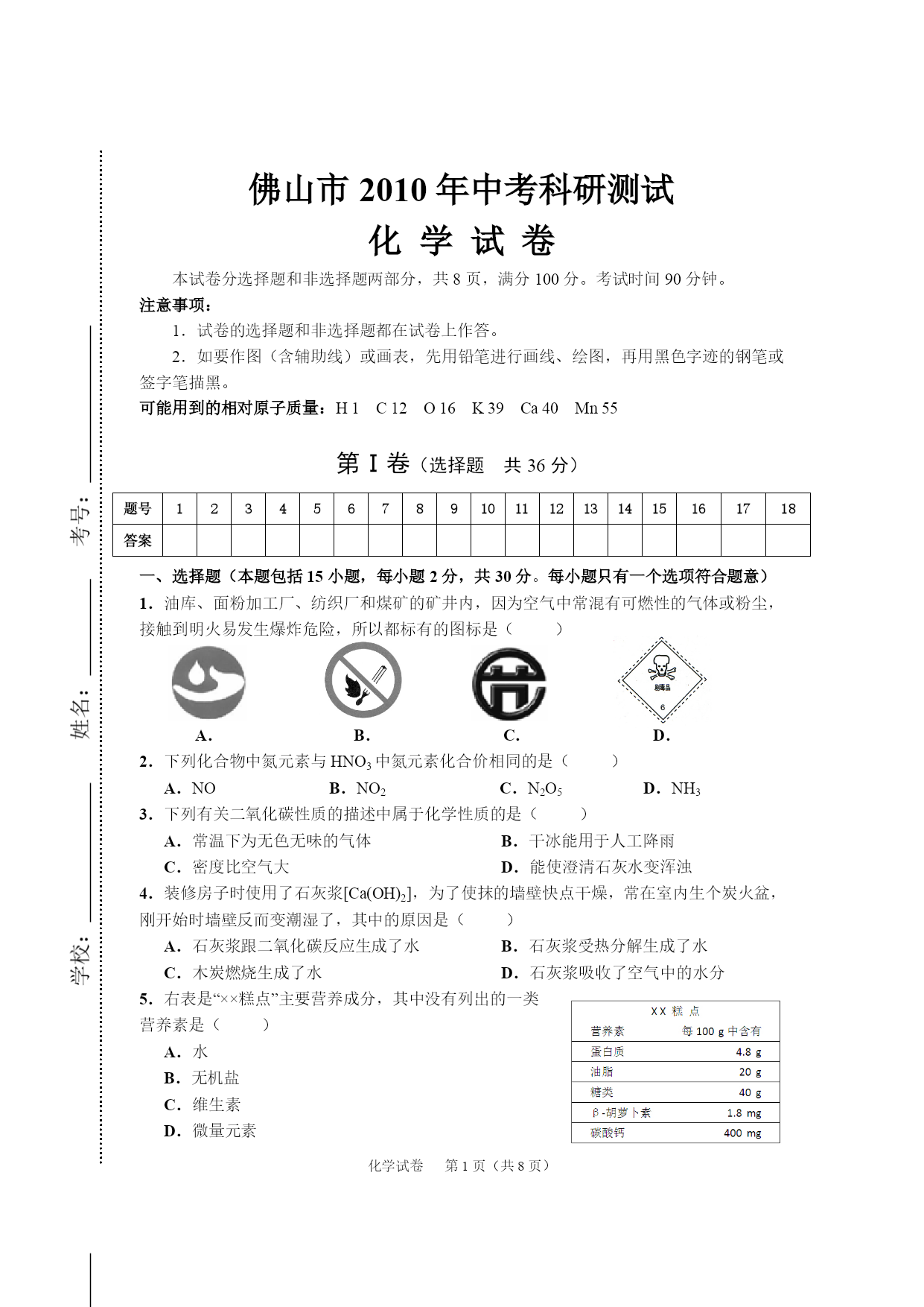 化学试卷第页()佛山市2010年中考科研测试化学试卷本试卷分选择题和非选择题两部分,,满分100分。考试时间90分钟。注意事项:1.试卷的选择题和非选择题都在试卷上作答。2.如要作图(含辅助线)或画表,先用铅笔进行画线、绘图,再用黑色字迹的钢笔或签字笔描黑。可能用到的相对原子质量:H1C12O16K39Ca40Mn55第Ⅰ卷(选择题共36分)题号123456789101112131415161718答案一、选择题(本题包括15小题,每小题2分,共30分。每小题只有一个选项符合题意)1.油库、面粉加工厂、纺织厂和煤矿的矿井内,因为空气中常混有可燃性的气体或粉尘,接触到明火易发生爆炸危险,所以都标有的图标是()A.B.C.D.2.下列化合物中氮元素与HNO3中氮元素化合价相同的是()A.NOB.NO2C.N2O5D.NH33.下列有关二氧化碳性质的描述中属于化学性质的是()A.常温下为无色无味的气体B.干冰能用于人工降雨C.密度比空气大D.能使澄清石灰水变浑浊4.装修房子时使用了石灰浆[Ca(OH)2],为了使抹的墙壁快点干燥,常在室内生个炭火盆,刚开始时墙壁反而变潮湿了,其中的原因是()A.石灰浆跟二氧化碳反应生成了水B.石灰浆受热分解生成了水C.木炭燃烧生成了水D.石灰浆吸收了空气中的水分5.右表是“××糕点”主要营养成分,其中没有列出的一类营养素是()A.水B.无机盐C.维生素D.微量元素6.在“粗盐提纯”实验中,将提纯后的氯化钠与粗盐作比较,以计算精盐的产率。下列可能引起产率偏高的原因是()A.粗盐未完全溶解B.溶解粗盐的烧杯壁上还蘸有溶液C.过滤时液面高于滤纸边缘D.蒸发时有液滴飞溅出去7.柠檬酸(C6H8O7)是目前化学清洗中用得较广的有机酸,为无色半透明晶体,无臭、味极酸,易溶于水和乙醇,水溶液显酸性。下列关于柠檬酸的说法中错误的是()A.柠檬酸是一种易溶于水、显酸性的有机物B.柠檬酸的相对分子质量是192C.柠檬酸中碳元素的质量分数为37.5%D.柠檬酸中C、H、O三种元素的质量比为6∶8∶78.下面是金刚石、石墨和C60的结构图,下列有关说法错误的是()A.它们是同一种物质B.它们都是由碳元素组成C.它们都能在高温下燃烧生成二氧化碳D.它们的结构不同,性质也不同9.焊锡是锡、铅组成的合金,武德合金是铅、铋、锡和镉组成的合金。根据下列提供的数据,能得到的启示是()纯金属合金铅镉铋锡焊锡武德合金熔点/℃32732127123218370A.合金的抗腐蚀性能一般要比组成它们的纯金属更好B.合金的熔点一般要比组成它们的纯金属要低C.合金的强度一般要比组成它们的纯金属要更高D.合金的硬度一般要比组成它们的纯金属要更高10.右图是水分子分解示意图,从该反应的示意图获得的信息不正确的是()A.分子在化学反应前后发生了变化B.原子的种类和数量在化学反应前后没有发生变化C.元素的种类在化学反应前后没有发生变化D.分子的数目在化学反应前后一定会发生变化11.某同学用“月季花瓣”的汁液自制酸碱指示剂,有关记录如下表。植物的汁液在酸性溶液中在中性溶液中在碱性溶液中月季花瓣浅红色红色黄色向滴有少量该指示剂的NaOH溶液中逐渐滴加稀盐酸,颜色变化是()A.由浅红色变红色B.由浅红变黄色C.由红色变黄色D.由黄色变浅红色12.下表是常见的几种酸、碱、盐在水溶液中解离出来离子的情况,根据表中信息分析正确的是()溶液酸盐碱HClH2SO4NaClNaHSO4NH4ClNaOHNH3H2O解离出的离子H+、ClH+、SO42Na+、ClNa+、H+、SO42NH4+、ClNa+、OHNH4+、OHA.在水溶液中解离出H+的物质一定是酸B.在水溶液中解离出金属阳离子和酸根离子的物质一定是盐C.盐溶液解离出来的阳离子一定是金属离子D.碱溶液解离出的离子一定是金属阳离子和OH13.下列各组物质中,括号内为除杂的试剂,能达到除杂目的的是()A.CuCl2溶液中混有FeCl2(铁粉)B.NaNO3溶液中混有Na2SO4(BaCl2溶液)C.CO中混有CO2(NaOH溶液)点燃D.CaO中混有CaCO3(稀盐酸)14.某纯净物X在空气中燃烧,反应的化学方程式为X+O2→CO2+H2O(未配平),下面有关X的说法中正确的是()A.属于无机物B.由碳和氢气两种物质组成C.一定是由C、H两种元素组成D.可能是由C、H、O三种元素组成15.有一份纯氯酸钾固体a,另有一份混有少量二氧化锰的氯酸钾固体b,两份固体质量相等。分别同时加热a和b,能正确表示生成氧气的质量随反应时间而变化的图像是()A.B.C.D.化学试卷第页()二、选择题(本题包括3小题,每小题2分,共6分。每小题有一个或两个选项符合题意。若正确答案只包括一个