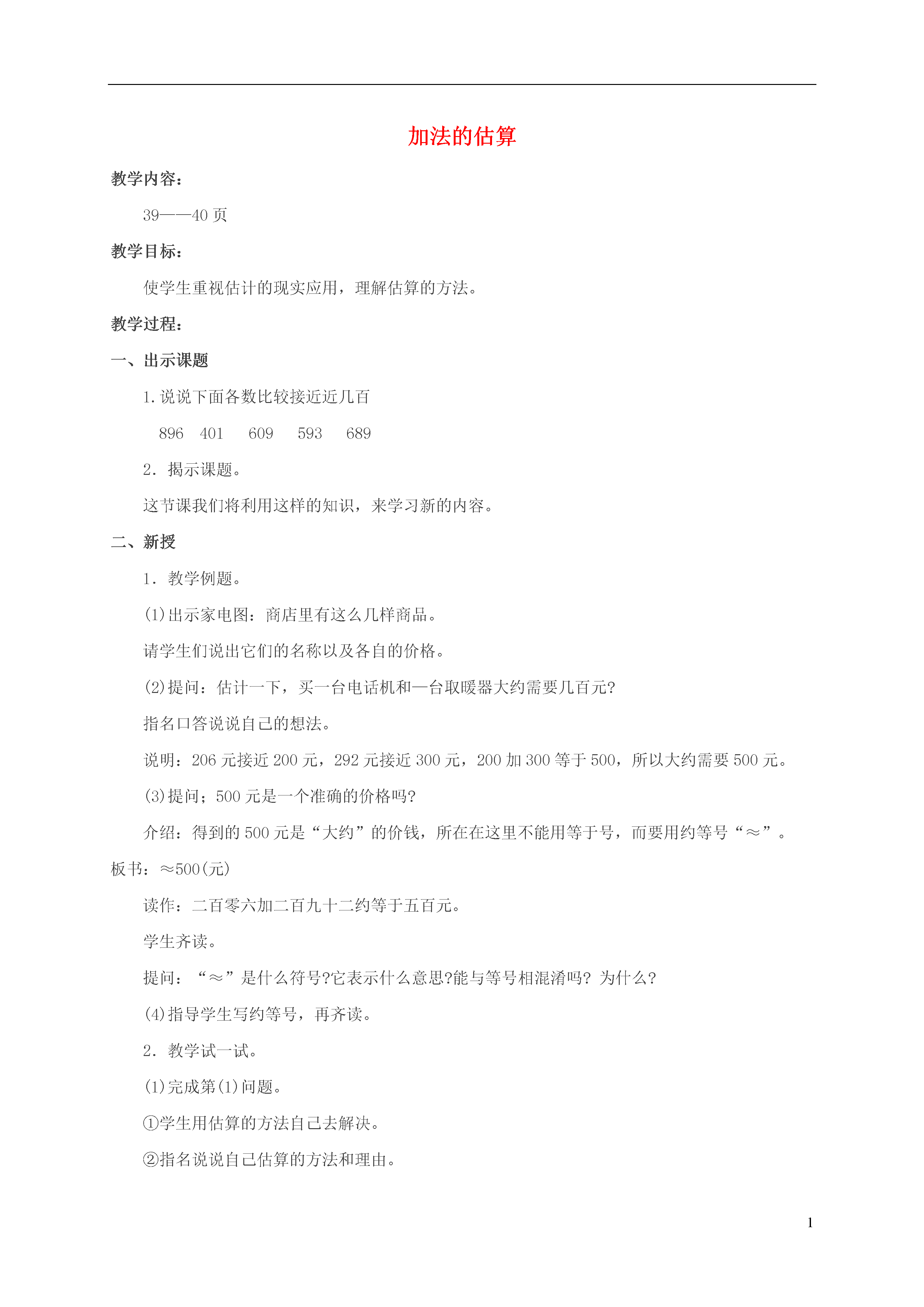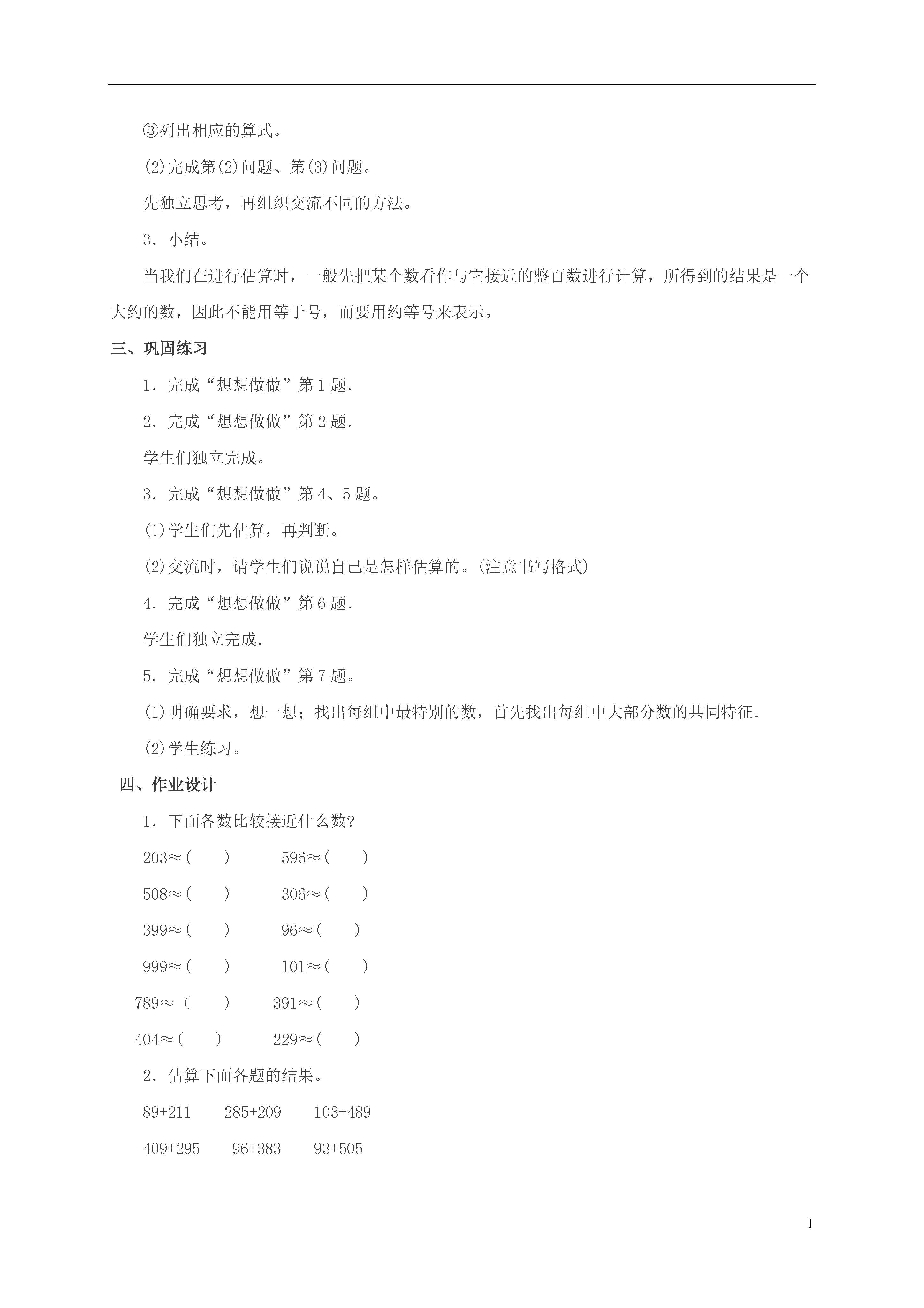 1加法的估算教学内容:39——40页教学目标:使学生重视估计的现实应用,理解估算的方法。教学过程:一、出示课题1.说说下面各数比较接近近几百8964016095936892.揭示课题。这节课我们将利用这样的知识,来学习新的内容。二、新授1.教学例题。(1)出示家电图:商店里有这么几样商品。请学生们说出它们的名称以及各自的价格。(2)提问:估计一下,买一台电话机和—台取暖器大约需要几百元?指名口答说说自己的想法。说明:206元接近200元,292元接近300元,200加300等于500,所以大约需要500元。(3)提问;500元是一个准确的价格吗?介绍:得到的500元是“大约”的价钱,所在在这里不能用等于号,而要用约等号“≈”。板书:≈500(元)读作:二百零六加二百九十二约等于五百元。学生齐读。提问:“≈”是什么符号?它表示什么意思?能与等号相混淆吗?为什么?(4)指导学生写约等号,再齐读。2.教学试一试。(1)完成第(1)问题。①学生用估算的方法自己去解决。②指名说说自己估算的方法和理由。③列出相应的算式。(2)完成第(2)问题、第(3)问题。先独立思考,再组织交流不同的方法。3.小结。当我们在进行估算时,一般先把某个数看作与它接近的整百数进行计算,所得到的结果是一个大约的数,因此不能用等于号,而要用约等号来表示。三、巩固练习1.完成“想想做做”第1题.2.完成“想想做做”第2题.学生们独立完成。3.完成“想想做做”第4、5题。(1)学生们先估算,再判断。(2)交流时,请学生们说说自己是怎样估算的。(注意书写格式)4.完成“想想做做”第6题.学生们独立完成.5.完成“想想做做”第7题。(1)明确要求,想一想;找出每组中最特别的数,首先找出每组中大部分数的共同特征.(2)学生练习。四、作业设计1.下面各数比较接近什么数?203≈()596≈()508≈()306≈()399≈()96≈()999≈()l0l≈()789≈()391≈()404≈()229≈()2.估算下面各题的结果。89+211285+209103+489409+29596+38393+505
