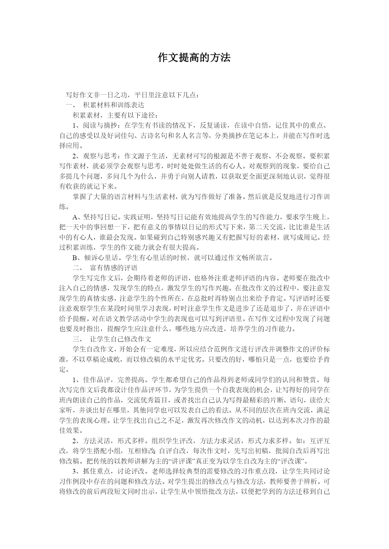 作文提高的方法写好作文非一日之功,平日里注意以下几点:一、积累材料和训练表达积累素材,主要有以下途径:1、阅读与摘抄:在学生有书读的情况下,反复诵读,在读中自悟,记住其中的重点、自己的感受以及好词佳句、古诗名句和名人名言等,分类摘抄在笔记本上,并能在写作时选择应用。2、观察与思考:作文源于生活,无素材可写的根源是不善于观察、不会观察。要积累写作素材,就必须学会观察与思考,时时处处做生活的有心人。对观察到的现象,要给自己多提几个问题,多问几个为什么,并勇于向别人请教,以获取更全面更深刻地认识,觉得很有收获的就记下来。掌握了大量的语言材料与生活素材,就为写作做好了准备。然后就是反复地进行习作训练。A、坚持写日记。实践证明,坚持写日记能有效地提高学生的写作能力,要求学生晚上,把一天中的事回想一下,把有意义的事情以日记的形式写下来,第二天交流,比比谁是生活中的有心人,谁最会发现。如果碰到自己特别感兴趣又有把握写好的素材,就写成周记。经过积累训练,学生的作文能力就会有很大提高。B、倾诉心里话。学生有心里话的时候,就可以通过作文畅所欲言。二、富有情感的评语学生写完作文后,会期待着老师的评语,也格外注重老师评语的内容。老师要在批改中注入自己的情感,发现学生的特点,激发学生的写作兴趣。在批改作文的过程中,要注意发现学生的真情实感,注意学生的个性所在,在总批时再特别点出来给予肯定。写评语时还要注意观察学生在某段时间里学习表现,时时注意学生作文是进步了还是退步了,并在评语中给予提醒。对在语文教学活动中学生的表现也可以写到评语里。在写作文过程中发现了问题也要及时指出,提醒学生应注意什么,哪些地方应改进,培养学生的习作能力。三、让学生自己修改作文学生自改作文,开始会有一定难度,所以应结合范例作文进行评改并调整作文的评价标准,不以草稿论成败,而以修改稿的水平定优劣。只要改的好,哪怕只是一点,也要给予肯定。1、佳作品评,完善提高。学生都希望自己的作品得到老师或同学们的认同和赞赏。每次写完作文后我都设计佳作品评环节,为学生提供一个自我表现的机会,让写得好的同学在班内朗读自己的作品,交流优秀篇目,或者找出自己认为写得最精彩的片断、语句,读给大家听,并谈出好在哪里,其他同学也可以发表自己的看法。从不同的层次在班内交流,满足学生的表现心理。让学生找出自己之不足,激发再次修改作文的动机,以达到本次习作的最佳效果。2、方法灵活,形式多样。组织学生评改,方法力求灵活,形式力求多样。如:互评互改,将学生搭配小组,互相修改;自评自改,每次作文时,先写出初稿,批阅自改后再写出修改稿。把传统的以教师讲解为主的“讲评课”真正变为以学生自改为主的“评改课”。3、抓住重点,讨论评改。老师选择较典型的需要修改的习作重点段,让学生共同讨论习作例段中存在的问题和修改方法。对学生提出的修改点与修改方法,教师要善于辨析。可将修改的前后两段短文同时出示,让学生从中领悟批改方法,以便把学到的方法迁移到自己的习作中进行自改和互改。总之,写好作文非一日之功,只有在学生读和教师评的有效结合中,我们学生的作文才会出逐渐提高。