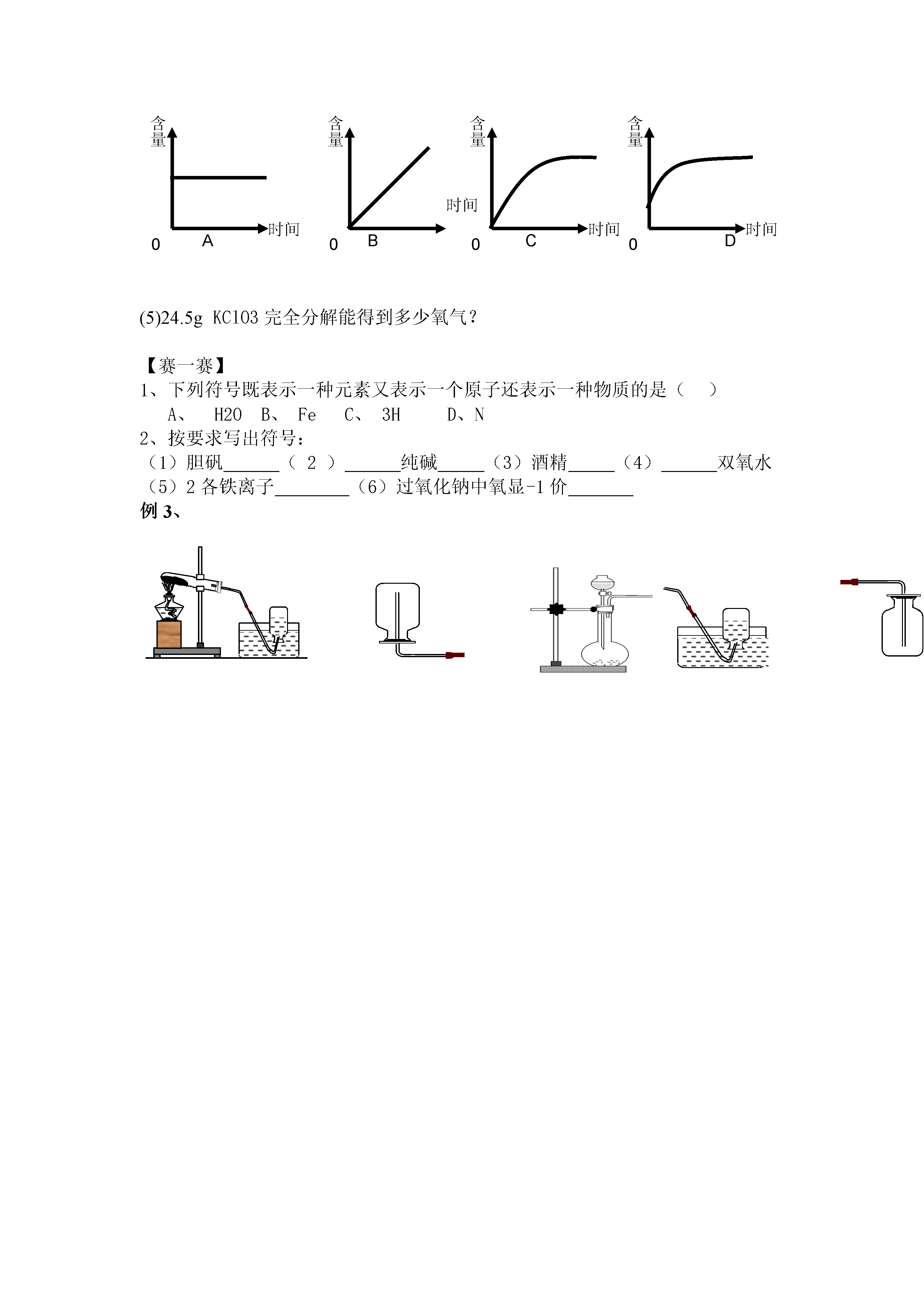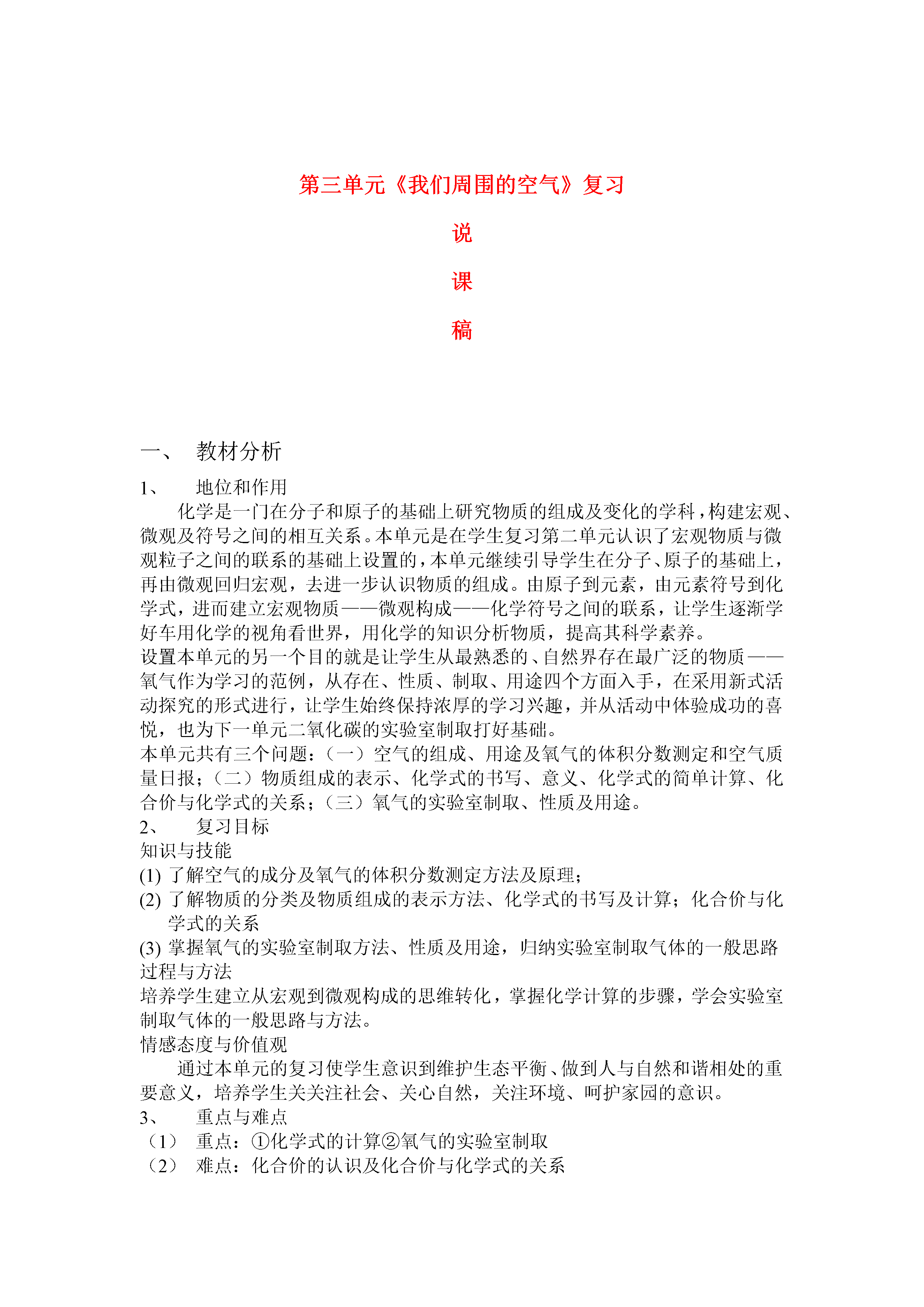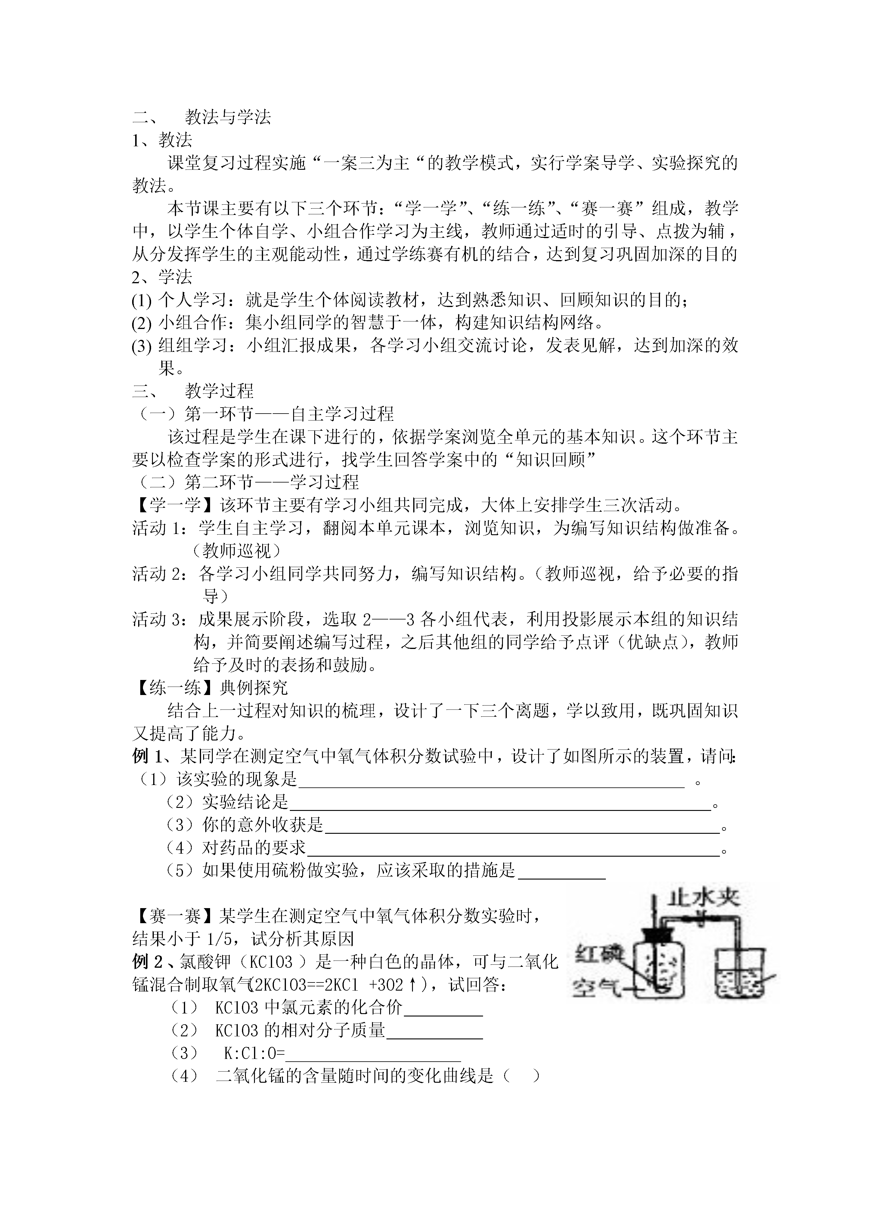 第三单元《我们周围的空气》复习说课稿教材分析地位和作用化学是一门在分子和原子的基础上研究物质的组成及变化的学科,构建宏观、微观及符号之间的相互关系。本单元是在学生复习第二单元认识了宏观物质与微观粒子之间的联系的基础上设置的,本单元继续引导学生在分子、原子的基础上,再由微观回归宏观,去进一步认识物质的组成。由原子到元素,由元素符号到化学式,进而建立宏观物质——微观构成——化学符号之间的联系,让学生逐渐学好车用化学的视角看世界,用化学的知识分析物质,提高其科学素养。设置本单元的另一个目的就是让学生从最熟悉的、自然界存在最广泛的物质——氧气作为学习的范例,从存在、性质、制取、用途四个方面入手,在采用新式活动探究的形式进行,让学生始终保持浓厚的学习兴趣,并从活动中体验成功的喜悦,也为下一单元二氧化碳的实验室制取打好基础。本单元共有三个问题:(一)空气的组成、用途及氧气的体积分数测定和空气质量日报;(二)物质组成的表示、化学式的书写、意义、化学式的简单计算、化合价与化学式的关系;(三)氧气的实验室制取、性质及用途。复习目标知识与技能了解空气的成分及氧气的体积分数测定方法及原理;了解物质的分类及物质组成的表示方法、化学式的书写及计算;化合价与化学式的关系掌握氧气的实验室制取方法、性质及用途,归纳实验室制取气体的一般思路过程与方法培养学生建立从宏观到微观构成的思维转化,掌握化学计算的步骤,学会实验室制取气体的一般思路与方法。情感态度与价值观通过本单元的复习使学生意识到维护生态平衡、做到人与自然和谐相处的重要意义,培养学生关关注社会、关心自然,关注环境、呵护家园的意识。重点与难点重点:①化学式的计算②氧气的实验室制取难点:化合价的认识及化合价与化学式的关系教法与学法教法课堂复习过程实施“一案三为主“的教学模式,实行学案导学、实验探究的教法。本节课主要有以下三个环节:“学一学”、“练一练”、“赛一赛”组成,教学中,以学生个体自学、小组合作学习为主线,教师通过适时的引导、点拨为辅,从分发挥学生的主观能动性,通过学练赛有机的结合,达到复习巩固加深的目的学法个人学习:就是学生个体阅读教材,达到熟悉知识、回顾知识的目的;小组合作:集小组同学的智慧于一体,构建知识结构网络。组组学习:小组汇报成果,各学习小组交流讨论,发表见解,达到加深的效果。教学过程第一环节——自主学习过程该过程是学生在课下进行的,依据学案浏览全单元的基本知识。这个环节主要以检查学案的形式进行,找学生回答学案中的“知识回顾”第二环节——学习过程【学一学】该环节主要有学习小组共同完成,大体上安排学生三次活动。活动1:学生自主学习,翻阅本单元课本,浏览知识,为编写知识结构做准备。(教师巡视)活动2:各学习小组同学共同努力,编写知识结构。(教师巡视,给予必要的指导)活动3:成果展示阶段,选取2——3各小组代表,利用投影展示本组的知识结构,并简要阐述编写过程,之后其他组的同学给予点评(优缺点),教师给予及时的表扬和鼓励。【练一练】典例探究结合上一过程对知识的梳理,设计了一下三个离题,学以致用,既巩固知识又提高了能力。例1、某同学在测定空气中氧气体积分数试验中,设计了如图所示的装置,请问:(1)该实验的现象是。(2)实验结论是。(3)你的意外收获是。(4)对药品的要求。(5)如果使用硫粉做实验,应该采取的措施是【赛一赛】某学生在测定空气中氧气体积分数实验时,结果小于1/5,试分析其原因例2、氯酸钾(KClO3)是一种白色的晶体,可与二氧化锰混合制取氧气(2KClO3==2KCl+3O2↑),试回答:KClO3中氯元素的化合价KClO3的相对分子质量K:Cl:O=二氧化锰的含量随时间的变化曲线是()0时间含量0时间含量0时间含量0含量ABCD时间(5)24.5gKClO3完全分解能得到多少氧气?【赛一赛】下列符号既表示一种元素又表示一个原子还表示一种物质的是()A、H2OB、FeC、3HD、N2、按要求写出符号:(1)胆矾(2)纯碱(3)酒精(4)双氧水(5)2各铁离子(6)过氧化钠中氧显-1价例3、