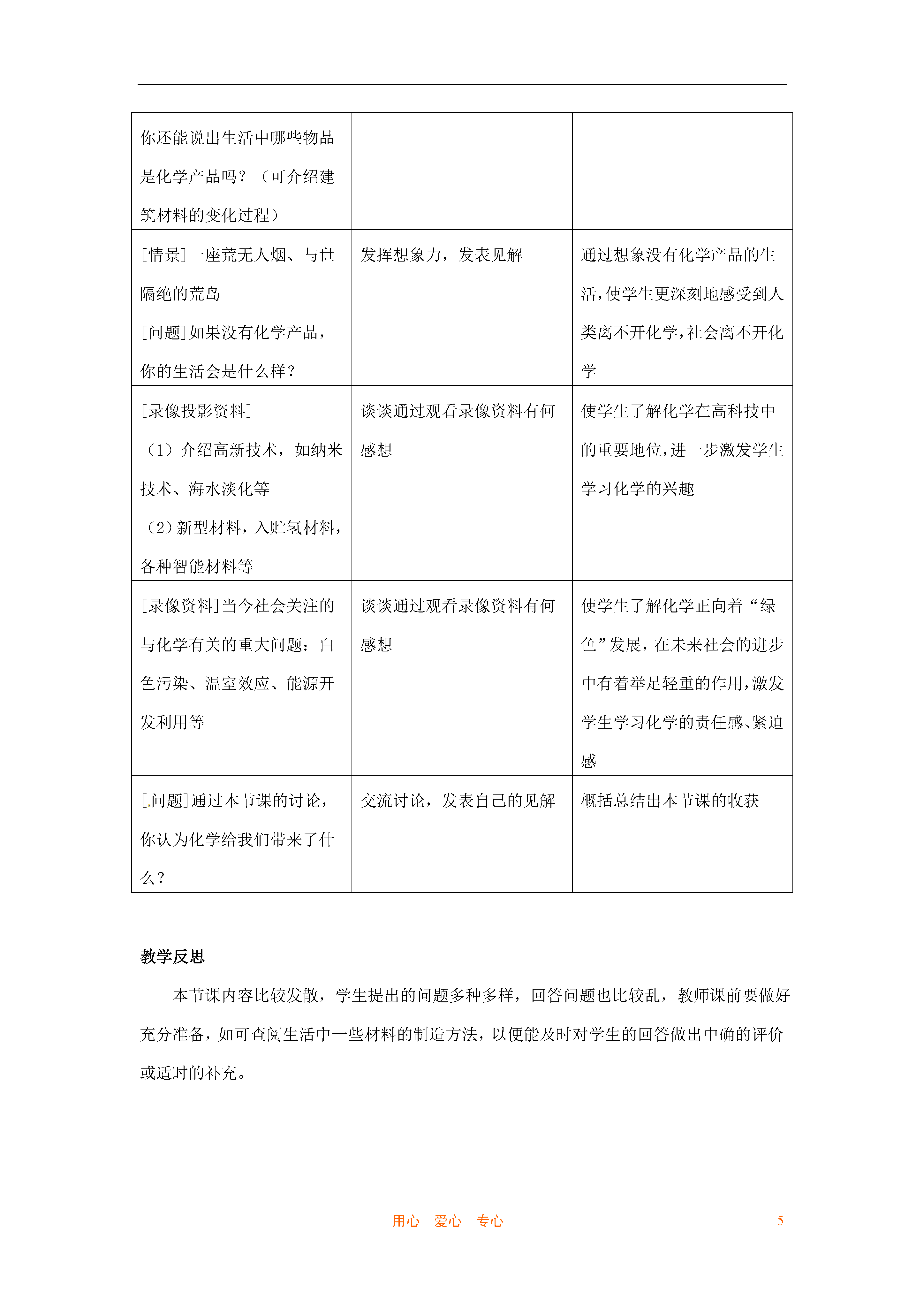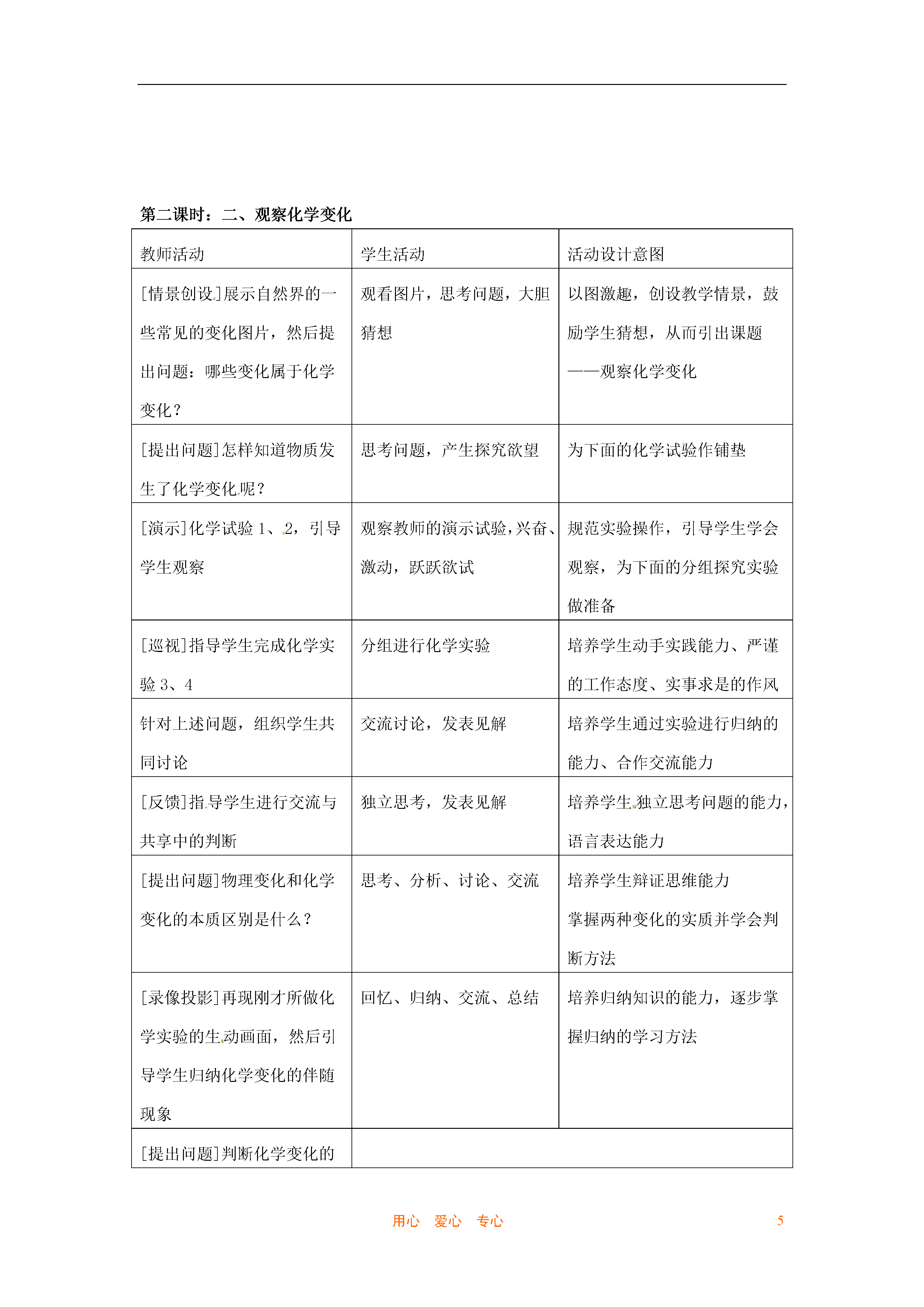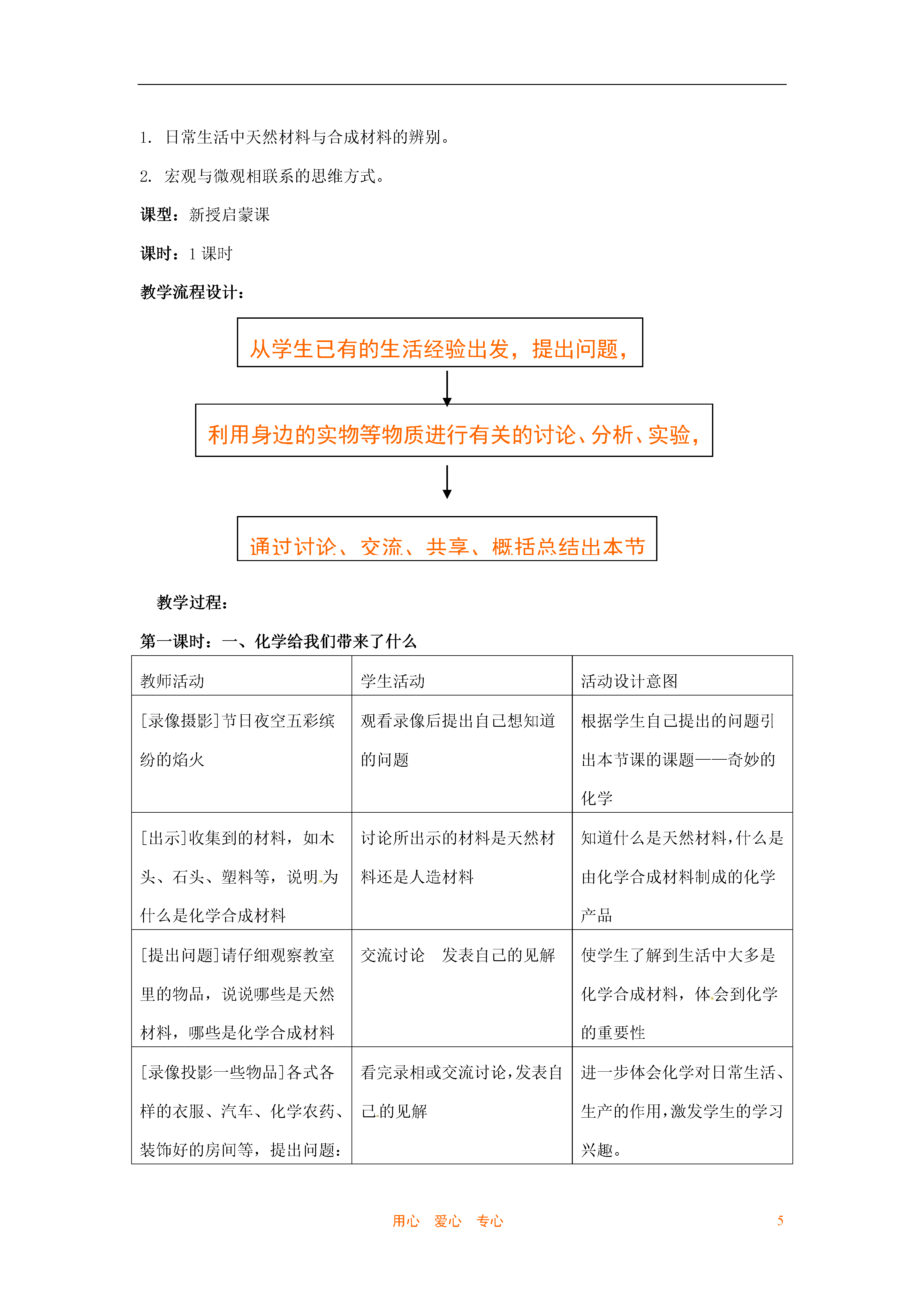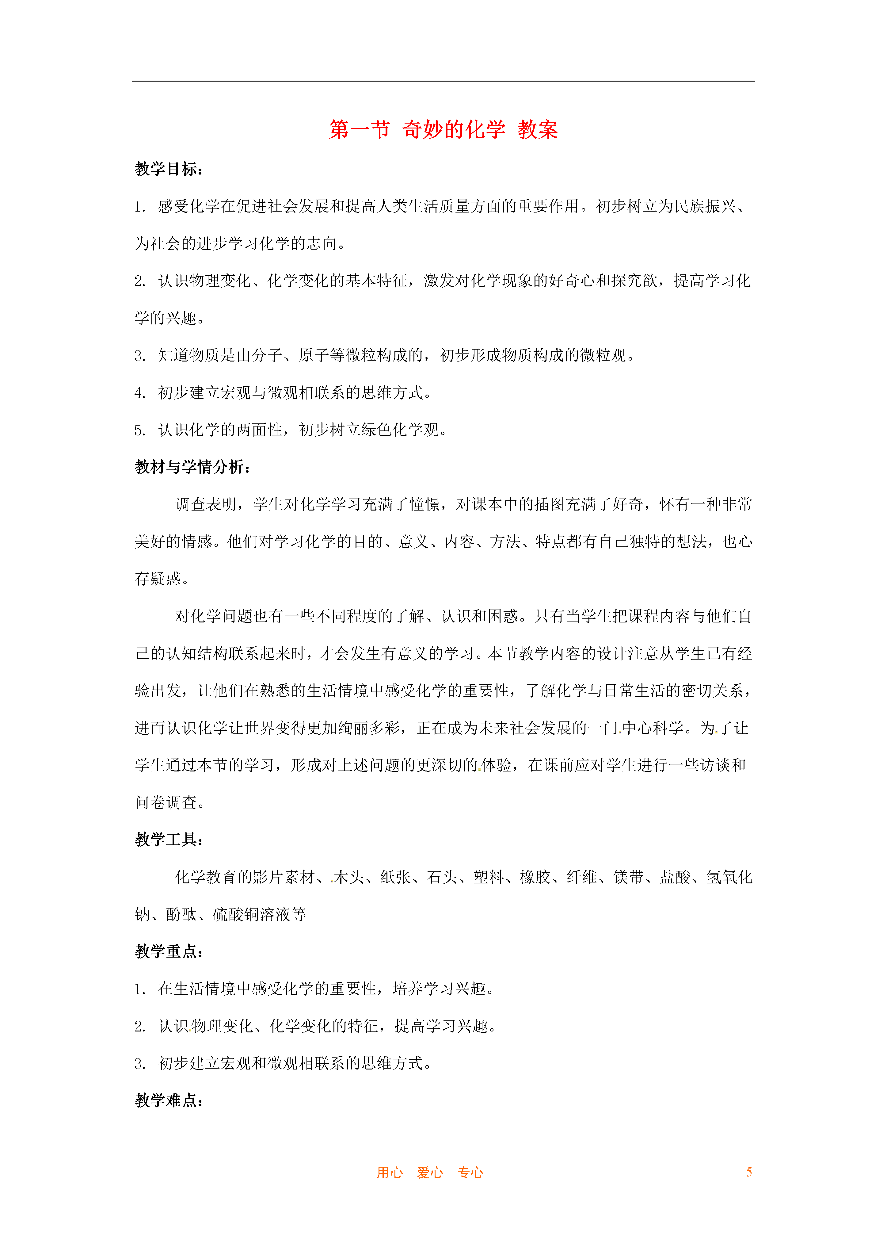 5用心爱心专心第一节奇妙的化学教案教学目标:1.感受化学在促进社会发展和提高人类生活质量方面的重要作用。初步树立为民族振兴、为社会的进步学习化学的志向。2.认识物理变化、化学变化的基本特征,激发对化学现象的好奇心和探究欲,提高学习化学的兴趣。3.知道物质是由分子、原子等微粒构成的,初步形成物质构成的微粒观。4.初步建立宏观与微观相联系的思维方式。5.认识化学的两面性,初步树立绿色化学观。教材与学情分析:调查表明,学生对化学学习充满了憧憬,对课本中的插图充满了好奇,怀有一种非常美好的情感。他们对学习化学的目的、意义、内容、方法、特点都有自己独特的想法,也心存疑惑。对化学问题也有一些不同程度的了解、认识和困惑。只有当学生把课程内容与他们自己的认知结构联系起来时,才会发生有意义的学习。本节教学内容的设计注意从学生已有经验出发,让他们在熟悉的生活情境中感受化学的重要性,了解化学与日常生活的密切关系,进而认识化学让世界变得更加绚丽多彩,正在成为未来社会发展的一门中心科学。为了让学生通过本节的学习,形成对上述问题的更深切的体验,在课前应对学生进行一些访谈和问卷调查。教学工具:化学教育的影片素材、木头、纸张、石头、塑料、橡胶、纤维、镁带、盐酸、氢氧化钠、酚酞、硫酸铜溶液等教学重点:1.在生活情境中感受化学的重要性,培养学习兴趣。2.认识物理变化、化学变化的特征,提高学习兴趣。3.初步建立宏观和微观相联系的思维方式。教学难点:1.日常生活中天然材料与合成材料的辨别。2.宏观与微观相联系的思维方式。课型:新授启蒙课课时:1课时教学流程设计:从学生已有的生活经验出发,提出问题,激发探究欲利用身边的实物等物质进行有关的讨论、分析、实验,激发学习兴趣通过讨论、交流、共享、概括总结出本节课的三个标题教学过程:第一课时:一、化学给我们带来了什么教师活动学生活动活动设计意图[录像摄影]节日夜空五彩缤纷的焰火观看录像后提出自己想知道的问题根据学生自己提出的问题引出本节课的课题——奇妙的化学[出示]收集到的材料,如木头、石头、塑料等,说明为什么是化学合成材料讨论所出示的材料是天然材料还是人造材料知道什么是天然材料,什么是由化学合成材料制成的化学产品[提出问题]请仔细观察教室里的物品,说说哪些是天然材料,哪些是化学合成材料交流讨论发表自己的见解使学生了解到生活中大多是化学合成材料,体会到化学的重要性[录像投影一些物品]各式各样的衣服、汽车、化学农药、装饰好的房间等,提出问题:你还能说出生活中哪些物品是化学产品吗?(可介绍建筑材料的变化过程)看完录相或交流讨论,发表自己的见解进一步体会化学对日常生活、生产的作用,激发学生的学习兴趣。[情景]一座荒无人烟、与世隔绝的荒岛[问题]如果没有化学产品,你的生活会是什么样?发挥想象力,发表见解通过想象没有化学产品的生活,使学生更深刻地感受到人类离不开化学,社会离不开化学[录像投影资料](1)介绍高新技术,如纳米技术、海水淡化等(2)新型材料,入贮氢材料,各种智能材料等谈谈通过观看录像资料有何感想使学生了解化学在高科技中的重要地位,进一步激发学生学习化学的兴趣[录像资料]当今社会关注的与化学有关的重大问题:白色污染、温室效应、能源开发利用等谈谈通过观看录像资料有何感想使学生了解化学正向着“绿色”发展,在未来社会的进步中有着举足轻重的作用,激发学生学习化学的责任感、紧迫感[问题]通过本节课的讨论,你认为化学给我们带来了什么?交流讨论,发表自己的见解概括总结出本节课的收获教学反思本节课内容比较发散,学生提出的问题多种多样,回答问题也比较乱,教师课前要做好充分准备,如可查阅生活中一些材料的制造方法,以便能及时对学生的回答做出中确的评价或适时的补充。第二课时:二、观察化学变化教师活动学生活动活动设计意图[情景创设]展示自然界的一些常见的变化图片,然后提出问题:哪些变化属于化学变化?观看图片,思考问题,大胆猜想以图激趣,创设教学情景,鼓励学生猜想,从而引出课题——观察化学变化[提出问题]怎样知道物质发生了化学变化呢?思考问题,产生探究欲望为下面的化学试验作铺垫[演示]化学试验1、2,引导学生观察观察教师的演示试验,兴奋、激动,跃跃欲试规范实验操作,引导学生学会观察,为下面的分组探究实验做准备[巡视]指导学生完成化学实验3、4分组进行化学实验培养学生动手实践能力、严谨的工作态度、实事求是的作风针对上述问题,组织学生共同讨论交流讨论,发表见解培养学生通过实验进行归纳的能力、合作交流能力[反馈]指导学生进行交流与共享中的判断独立思考,发表见解培养学生独立思考问题的能力,语言表达能力[提出问题]物理变化和化