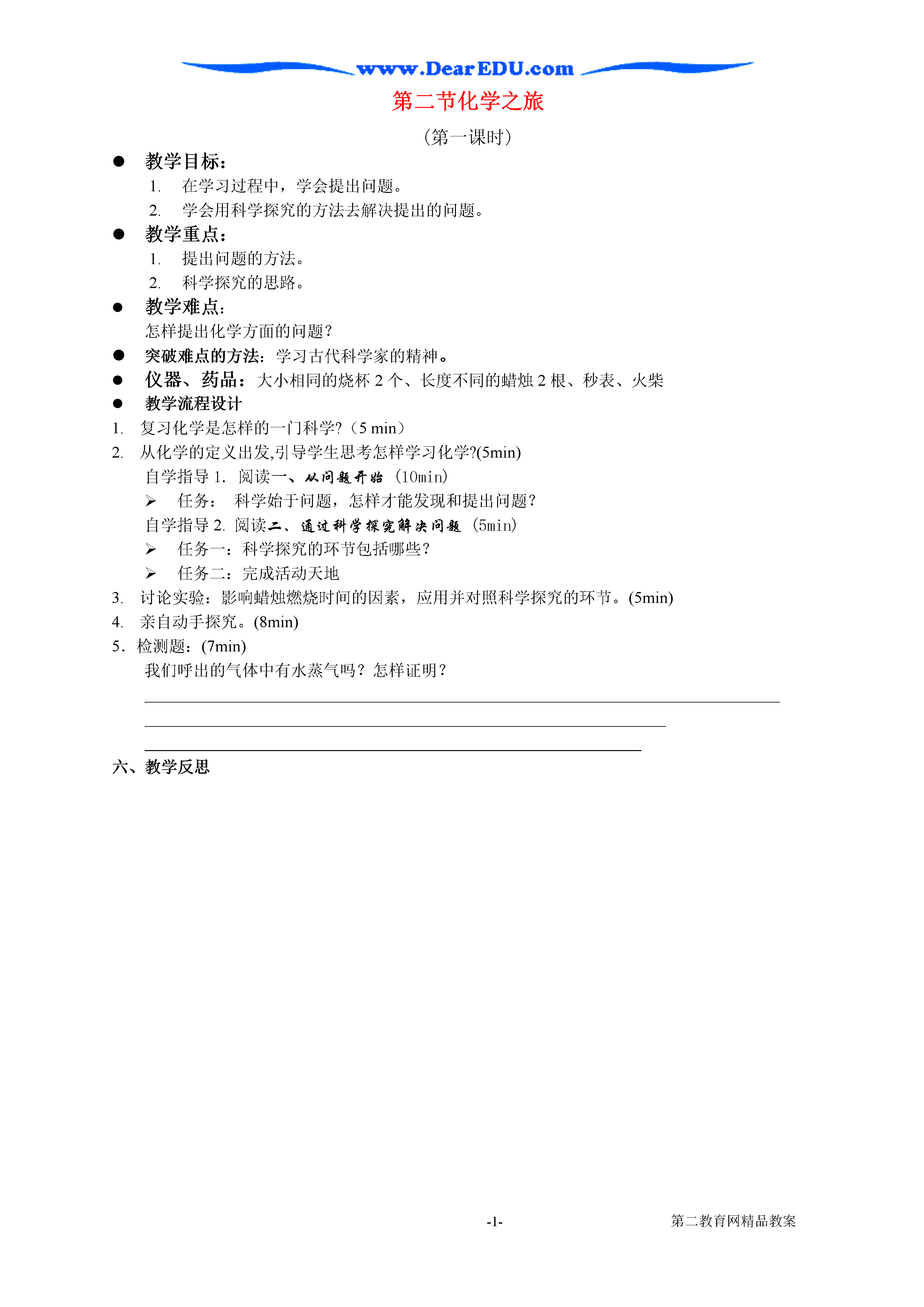 -1-第二教育网精品教案第二节化学之旅(第一课时)教学目标:在学习过程中,学会提出问题。学会用科学探究的方法去解决提出的问题。教学重点:提出问题的方法。科学探究的思路。教学难点:怎样提出化学方面的问题?突破难点的方法:学习古代科学家的精神。仪器、药品:大小相同的烧杯2个、长度不同的蜡烛2根、秒表、火柴教学流程设计复习化学是怎样的一门科学?(5min)从化学的定义出发,引导学生思考怎样学习化学?(5min)自学指导1.阅读一、从问题开始(10min)任务:科学始于问题,怎样才能发现和提出问题?自学指导2.阅读二、通过科学探究解决问题(5min)任务一:科学探究的环节包括哪些?任务二:完成活动天地讨论实验:影响蜡烛燃烧时间的因素,应用并对照科学探究的环节。(5min)亲自动手探究。(8min)5.检测题:(7min)我们呼出的气体中有水蒸气吗?怎样证明?六、教学反思