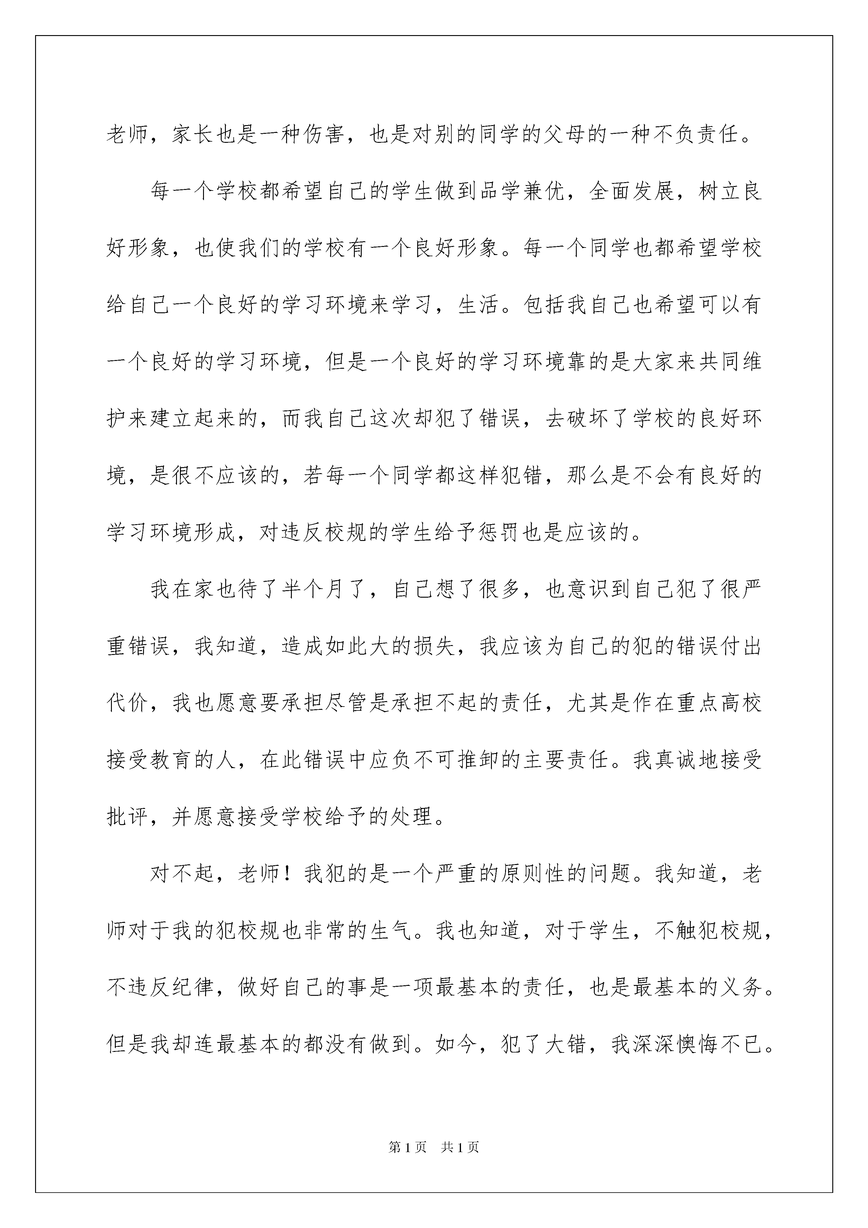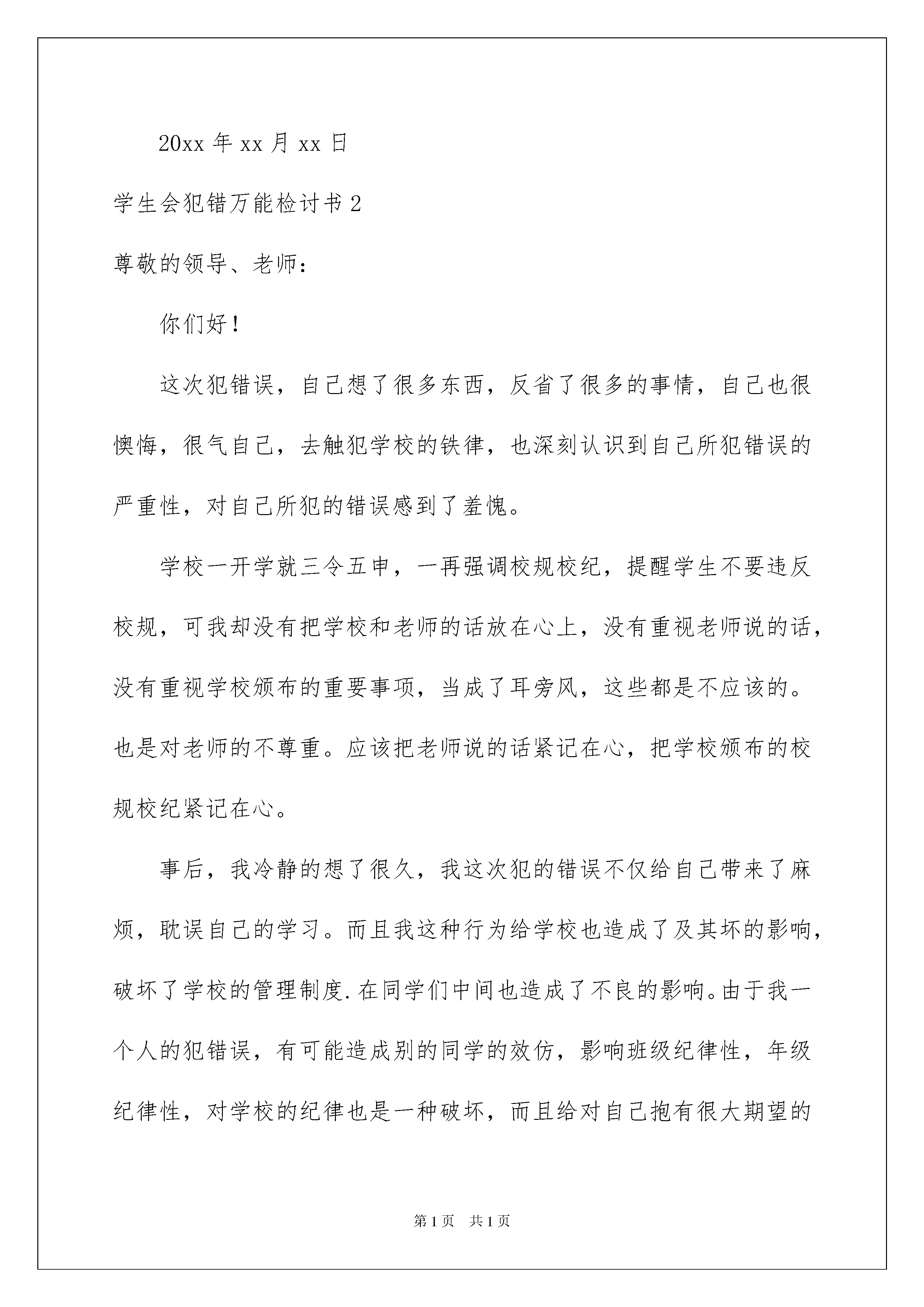 2022学生会犯错万能检讨书学生会犯错万能检讨书在有过错的情况下,为了避免再犯,我们常常被要求写检讨书,以对出现的过错进行反省,做事不能马虎,写检讨书也应如此。那么正式、规范的检讨书是什么样的呢?以下是我帮大家整理的学生会犯错万能检讨书,仅供参考,希望能够帮助到大家。学生会犯错万能检讨书1尊敬的主席及各位同学:首先让我对大家说声抱歉,上周四的会议我迟到了xx分钟,造成了很坏的影响,于我个人于整个集体都犯下了很严重的错误,我知道事后诸葛亮此时说再多都是于事无补的,所以我只想总结了自己的错误,希望以后借以为鉴。客观原因也是存在的,上周由于各科老师的课调动的比较大,自己的日期观念有些偏差,记错了日期,直到快睡着时才记起日期,导致了开会迟到。但是这些仅仅是客观原因,完全可以用主观因素避免的。而我的错就在这些主观因素上。学生会是一个集体,强调的是集体主义。然而我却因为自己的失误耽误了大家宝贵的时间。开会迟到本身就是不重视集体纪律的表现,我这种行为在集体就已经造成了坏的影响,在外人眼里它也破坏了我们集体的形象。我们大一的委员之间本应该互相学习,互相促进,而我的这种表现,却是给其他同学带了一个坏头。如果在做xx辩论赛一类的活动时也这样,普通学生们会认为院学生会这是一个松散的集体,给集体抹黑。在以后的生活工作学习中,我一定要改掉这种散漫的作风,严格要求自己,遵守集体规则,相信我可以做好,请各位监督,也让我们一起进步,希望我们都不要再犯此类错误写此类检讨书。在此我表示深深的歉意,我也进行了自我检讨,希望以后不会有同样的事情发生,也要努力改善自己,要学会更好的支配时间,不耽误工作。所以,我会努力提高对自身的要求,加强自我约束,强化个人责任感,首先要考虑集体荣誉。此致敬礼!检讨人:xxx20xx年xx月xx日学生会犯错万能检讨书2尊敬的领导、老师:你们好!这次犯错误,自己想了很多东西,反省了很多的事情,自己也很懊悔,很气自己,去触犯学校的铁律,也深刻认识到自己所犯错误的严重性,对自己所犯的错误感到了羞愧。学校一开学就三令五申,一再强调校规校纪,提醒学生不要违反校规,可我却没有把学校和老师的话放在心上,没有重视老师说的话,没有重视学校颁布的重要事项,当成了耳旁风,这些都是不应该的。也是对老师的不尊重。应该把老师说的话紧记在心,把学校颁布的校规校纪紧记在心。事后,我冷静的想了很久,我这次犯的错误不仅给自己带来了麻烦,耽误自己的学习。而且我这种行为给学校也造成了及其坏的影响,破坏了学校的管理制度.在同学们中间也造成了不良的影响。由于我一个人的犯错误,有可能造成别的同学的效仿,影响班级纪律性,年级纪律性,对学校的纪律也是一种破坏,而且给对自己抱有很大期望的老师,家长也是一种伤害,也是对别的同学的父母的一种不负责任。每一个学校都希望自己的学生做到品学兼优,全面发展,树立良好形象,也使我们的学校有一个良好形象。每一个同学也都希望学校给自己一个良好的学习环境来学习,生活。包括我自己也希望可以有一个良好的学习环境,但是一个良好的学习环境靠的是大家来共同维护来建立起来的,而我自己这次却犯了错误,去破坏了学校的良好环境,是很不应该的,若每一个同学都这样犯错,那么是不会有良好的学习环境形成,对违反校规的学生给予惩罚也是应该的。我在家也待了半个月了,自己想了很多,也意识到自己犯了很严重错误,我知道,造成如此大的损失,我应该为自己的犯的错误付出代价,我也愿意要承担尽管是承担不起的责任,尤其是作在重点高校接受教育的人,在此错误中应负不可推卸的主要责任。我真诚地接受批评,并愿意接受学校给予的处理。对不起,老师!我犯的是一个严重的原则性的问题。我知道,老师对于我的犯校规也非常的生气。我也知道,对于学生,不触犯校规,不违反纪律,做好自己的事是一项最基本的责任,也是最基本的义务。但是我却连最基本的都没有做到。如今,犯了大错,我深深懊悔不已。我会以这次违纪事件作为一面镜子时时检点自己,批评和教育自己,自觉接受监督。我要知羞而警醒,知羞而奋进,亡羊补牢、化羞耻为动力,努力学习。我也要通过这次事件,提高我的思想认识,强化责任措施。自己还是很想好好学习的,学习对我来是最重要的,对今后的生存,就业都是很重要的。我现在才很小,我还有去拼搏的能力。我还想在拼一次,在去努力一次,希望老师给予我一个做好学生的一个机会,我会好好改过的,认认真真的去学习,那样的'生活充实,这样在家也很耽误课程,学校的课程本来就很紧,学起来就很费劲,在今后的学习生活中,我一定会好好学习,各课都努力往上赶。记得刚进入学校时,班主任老师和副班主任对我抱有很大的期望,学习还