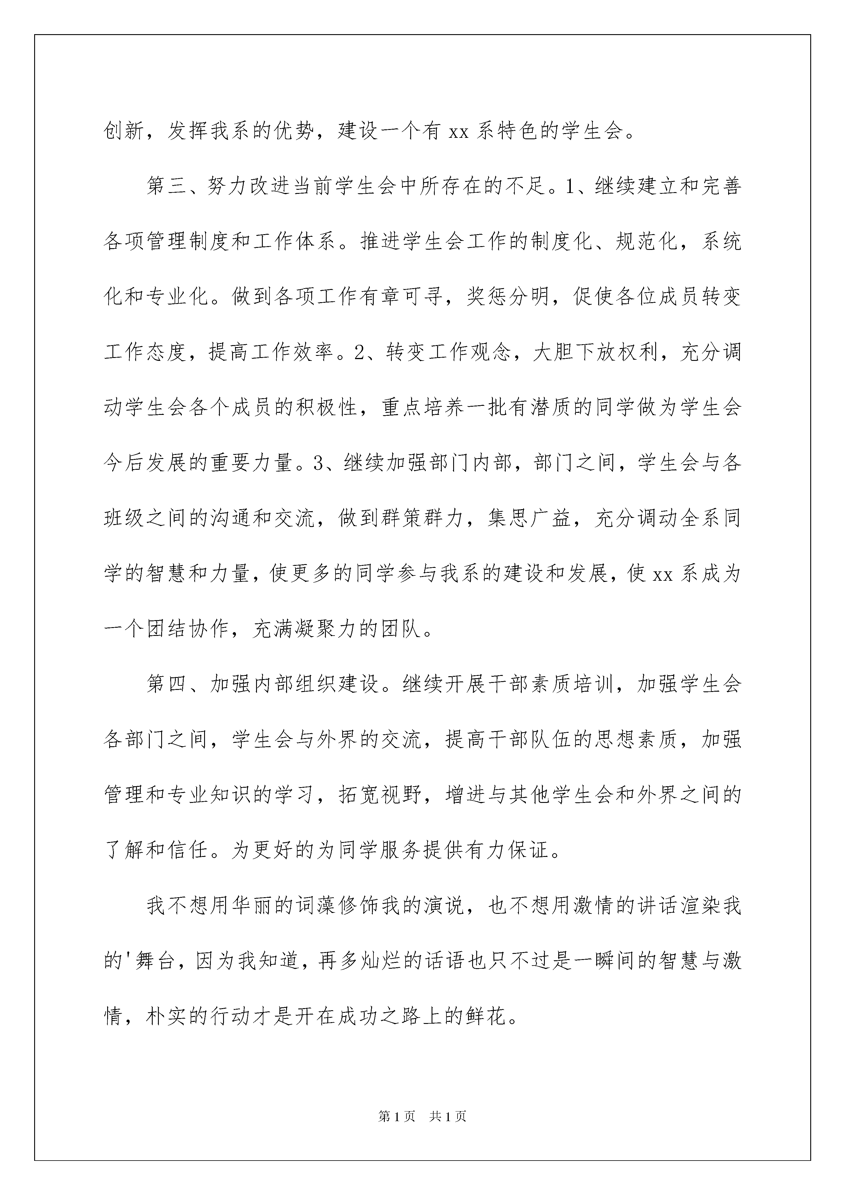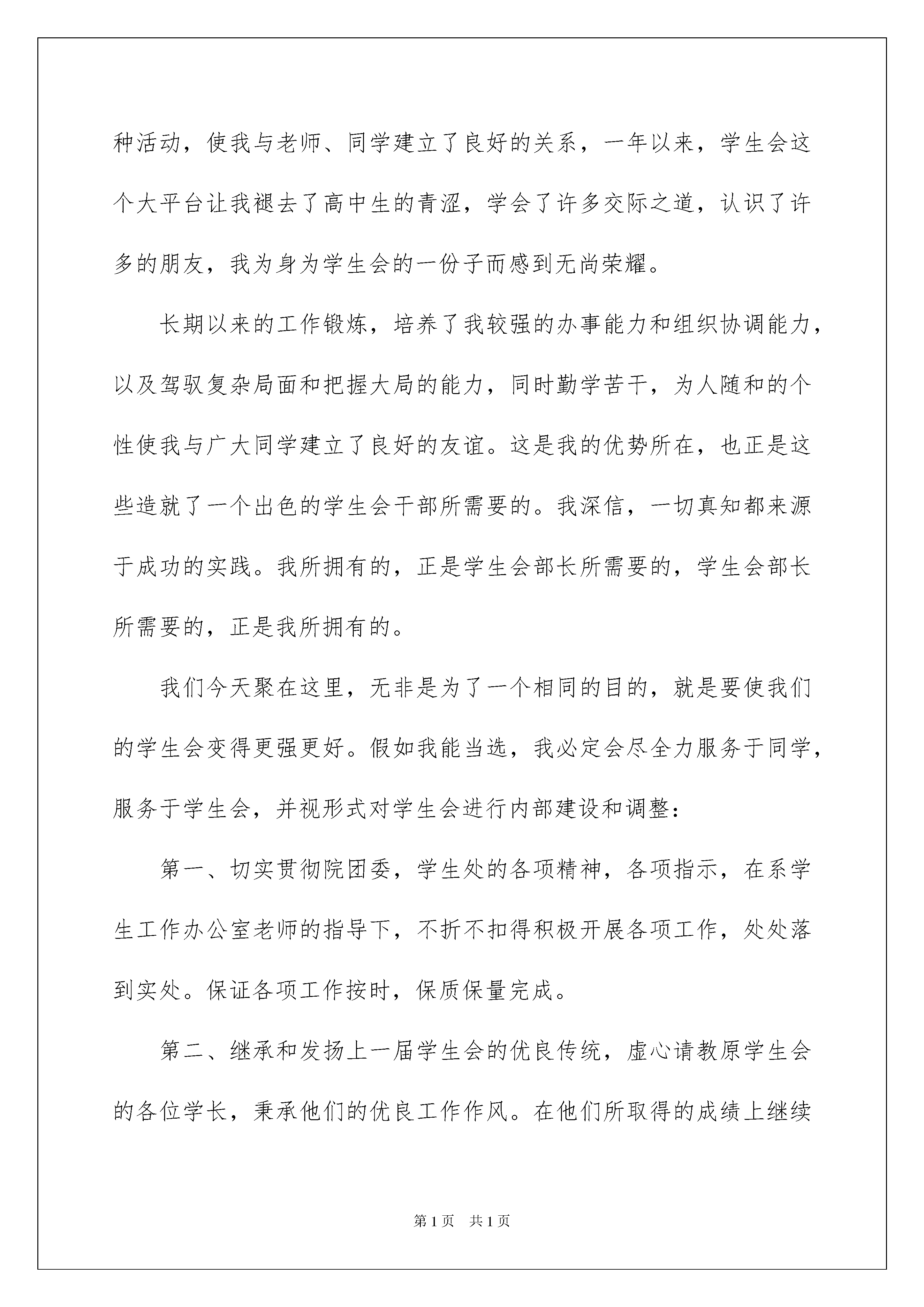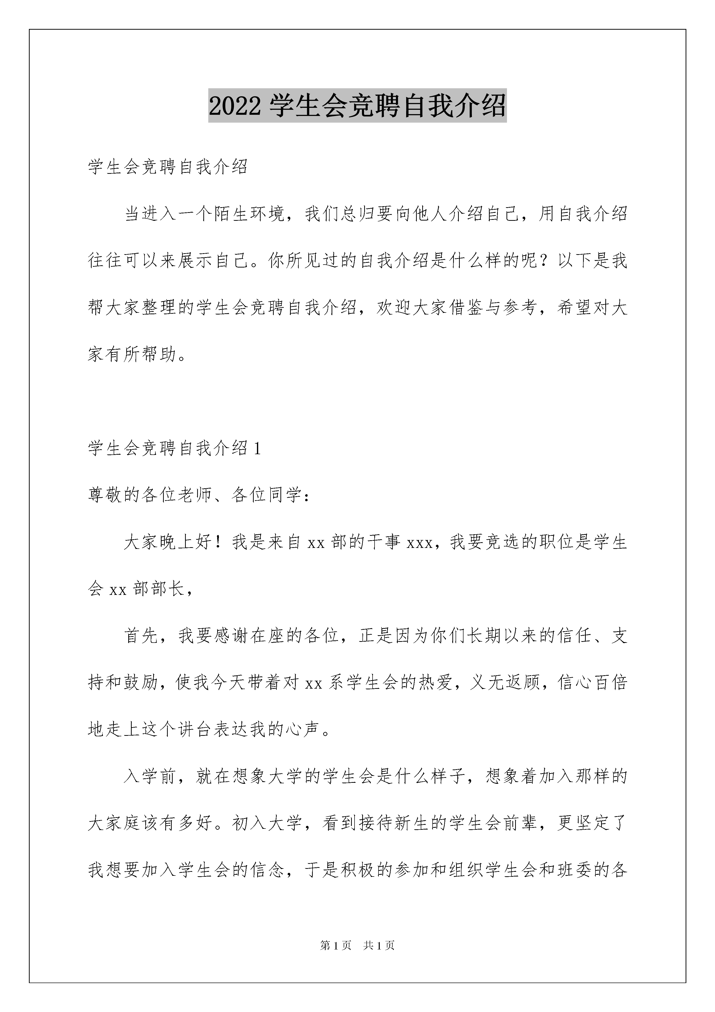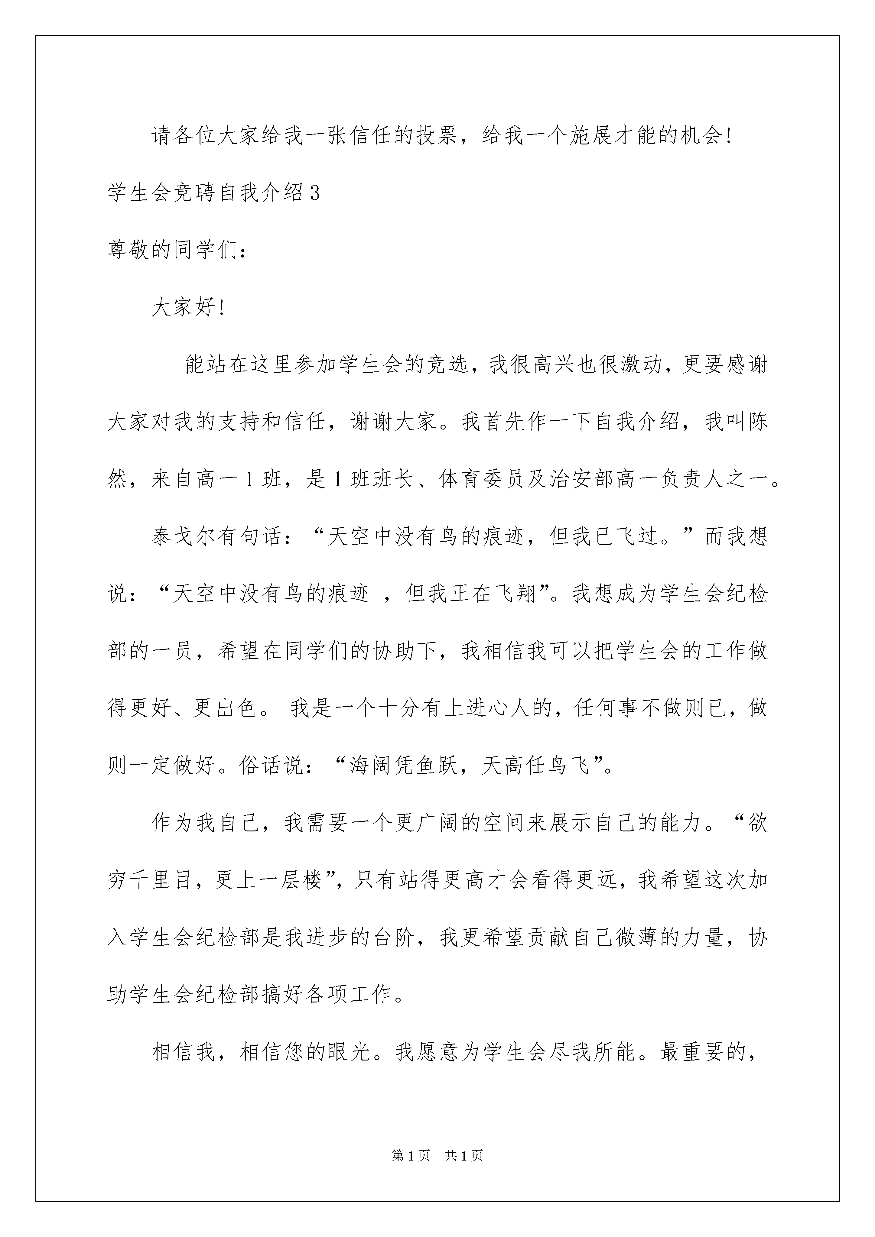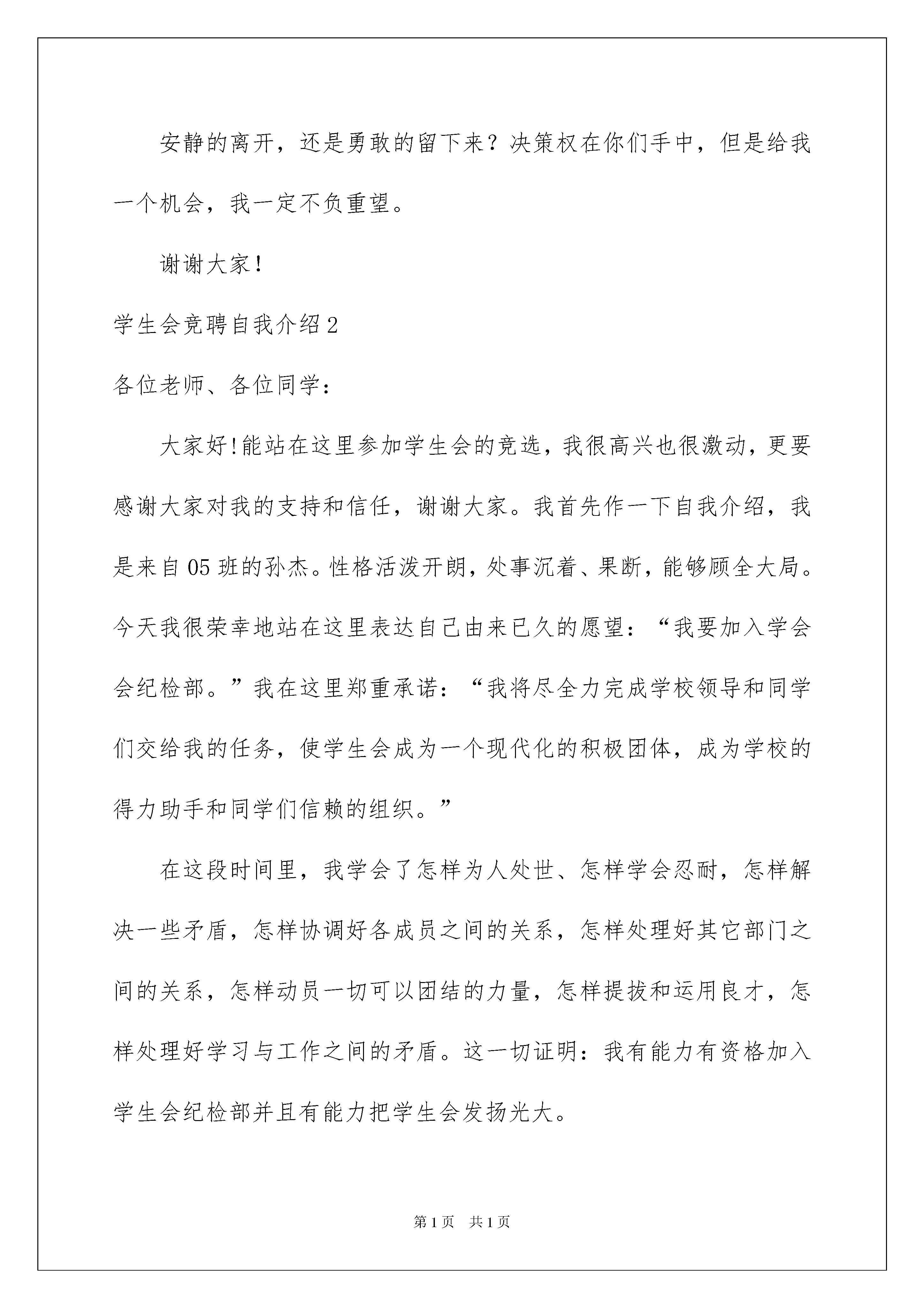 2022学生会竞聘自我介绍学生会竞聘自我介绍当进入一个陌生环境,我们总归要向他人介绍自己,用自我介绍往往可以来展示自己。你所见过的自我介绍是什么样的呢?以下是我帮大家整理的学生会竞聘自我介绍,欢迎大家借鉴与参考,希望对大家有所帮助。学生会竞聘自我介绍1尊敬的各位老师、各位同学:大家晚上好!我是来自xx部的干事xxx,我要竞选的职位是学生会xx部部长,首先,我要感谢在座的各位,正是因为你们长期以来的信任、支持和鼓励,使我今天带着对xx系学生会的热爱,义无返顾,信心百倍地走上这个讲台表达我的心声。入学前,就在想象大学的学生会是什么样子,想象着加入那样的大家庭该有多好。初入大学,看到接待新生的学生会前辈,更坚定了我想要加入学生会的信念,于是积极的参加和组织学生会和班委的各种活动,使我与老师、同学建立了良好的关系,一年以来,学生会这个大平台让我褪去了高中生的青涩,学会了许多交际之道,认识了许多的朋友,我为身为学生会的一份子而感到无尚荣耀。长期以来的工作锻炼,培养了我较强的办事能力和组织协调能力,以及驾驭复杂局面和把握大局的能力,同时勤学苦干,为人随和的个性使我与广大同学建立了良好的友谊。这是我的优势所在,也正是这些造就了一个出色的学生会干部所需要的。我深信,一切真知都来源于成功的实践。我所拥有的,正是学生会部长所需要的,学生会部长所需要的,正是我所拥有的。我们今天聚在这里,无非是为了一个相同的目的,就是要使我们的学生会变得更强更好。假如我能当选,我必定会尽全力服务于同学,服务于学生会,并视形式对学生会进行内部建设和调整:第一、切实贯彻院团委,学生处的各项精神,各项指示,在系学生工作办公室老师的指导下,不折不扣得积极开展各项工作,处处落到实处。保证各项工作按时,保质保量完成。第二、继承和发扬上一届学生会的优良传统,虚心请教原学生会的各位学长,秉承他们的优良工作作风。在他们所取得的成绩上继续创新,发挥我系的优势,建设一个有xx系特色的学生会。第三、努力改进当前学生会中所存在的不足。1、继续建立和完善各项管理制度和工作体系。推进学生会工作的制度化、规范化,系统化和专业化。做到各项工作有章可寻,奖惩分明,促使各位成员转变工作态度,提高工作效率。2、转变工作观念,大胆下放权利,充分调动学生会各个成员的积极性,重点培养一批有潜质的同学做为学生会今后发展的重要力量。3、继续加强部门内部,部门之间,学生会与各班级之间的沟通和交流,做到群策群力,集思广益,充分调动全系同学的智慧和力量,使更多的同学参与我系的建设和发展,使xx系成为一个团结协作,充满凝聚力的团队。第四、加强内部组织建设。继续开展干部素质培训,加强学生会各部门之间,学生会与外界的交流,提高干部队伍的思想素质,加强管理和专业知识的学习,拓宽视野,增进与其他学生会和外界之间的了解和信任。为更好的为同学服务提供有力保证。我不想用华丽的词藻修饰我的演说,也不想用激情的讲话渲染我的'舞台,因为我知道,再多灿烂的话语也只不过是一瞬间的智慧与激情,朴实的行动才是开在成功之路上的鲜花。安静的离开,还是勇敢的留下来?决策权在你们手中,但是给我一个机会,我一定不负重望。谢谢大家!学生会竞聘自我介绍2各位老师、各位同学:大家好!能站在这里参加学生会的竞选,我很高兴也很激动,更要感谢大家对我的支持和信任,谢谢大家。我首先作一下自我介绍,我是来自05班的孙杰。性格活泼开朗,处事沉着、果断,能够顾全大局。今天我很荣幸地站在这里表达自己由来已久的愿望:“我要加入学会会纪检部。”我在这里郑重承诺:“我将尽全力完成学校领导和同学们交给我的任务,使学生会成为一个现代化的积极团体,成为学校的得力助手和同学们信赖的组织。”在这段时间里,我学会了怎样为人处世、怎样学会忍耐,怎样解决一些矛盾,怎样协调好各成员之间的关系,怎样处理好其它部门之间的关系,怎样动员一切可以团结的力量,怎样提拔和运用良才,怎样处理好学习与工作之间的矛盾。这一切证明:我有能力有资格加入学生会纪检部并且有能力把学生会发扬光大。请各位大家给我一张信任的投票,给我一个施展才能的机会!学生会竞聘自我介绍3尊敬的同学们:大家好!能站在这里参加学生会的竞选,我很高兴也很激动,更要感谢大家对我的支持和信任,谢谢大家。我首先作一下自我介绍,我叫陈然,来自高一1班,是1班班长、体育委员及治安部高一负责人之一。泰戈尔有句话:“天空中没有鸟的痕迹,但我已飞过。”而我想说:“天空中没有鸟的痕迹,但我正在飞翔”。我想成为学生会纪检部的一员,希望在同学们的协助下,我相信我可以把学生会的工作做得更好、更出色。我是一个十分有上进心人的,