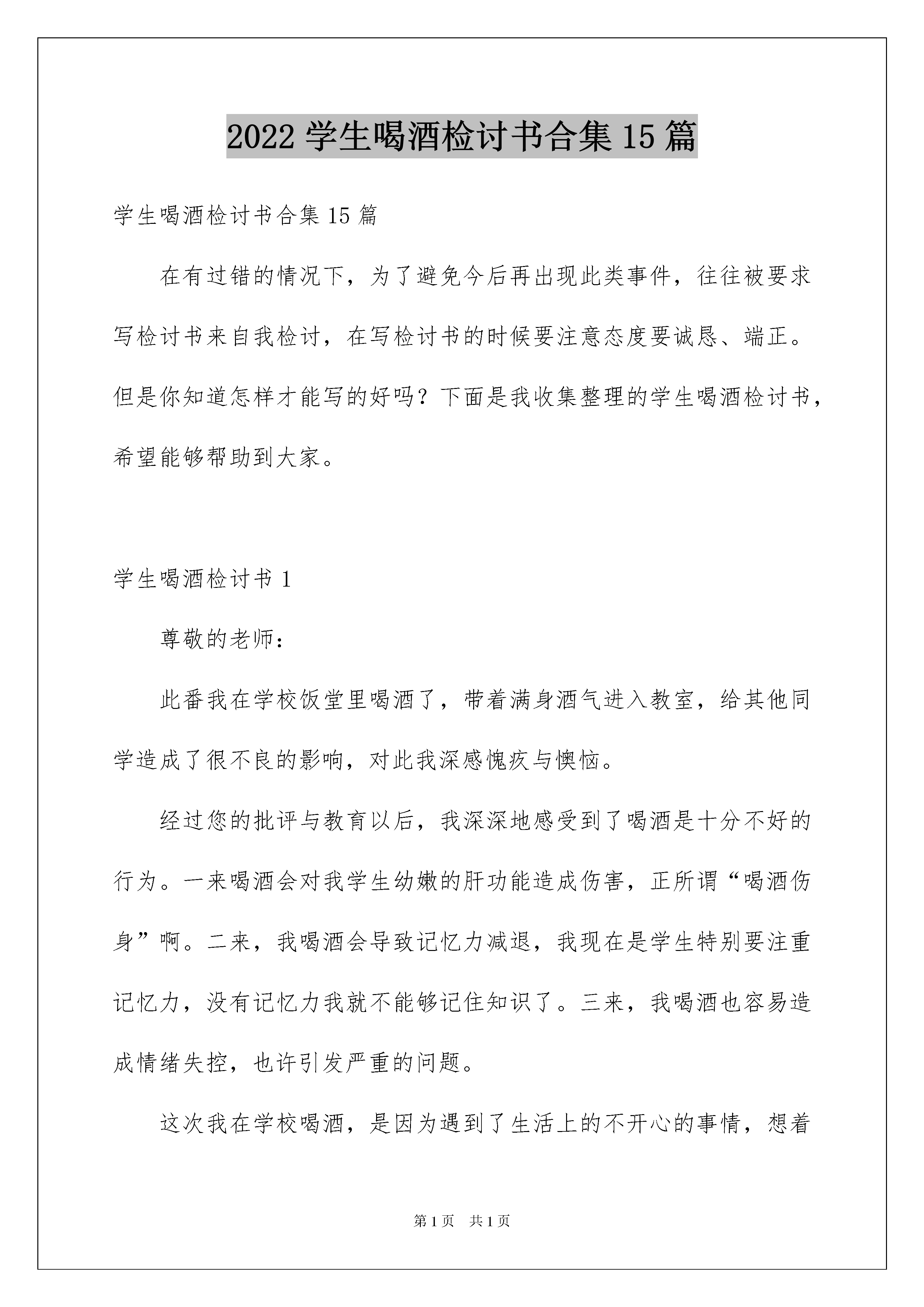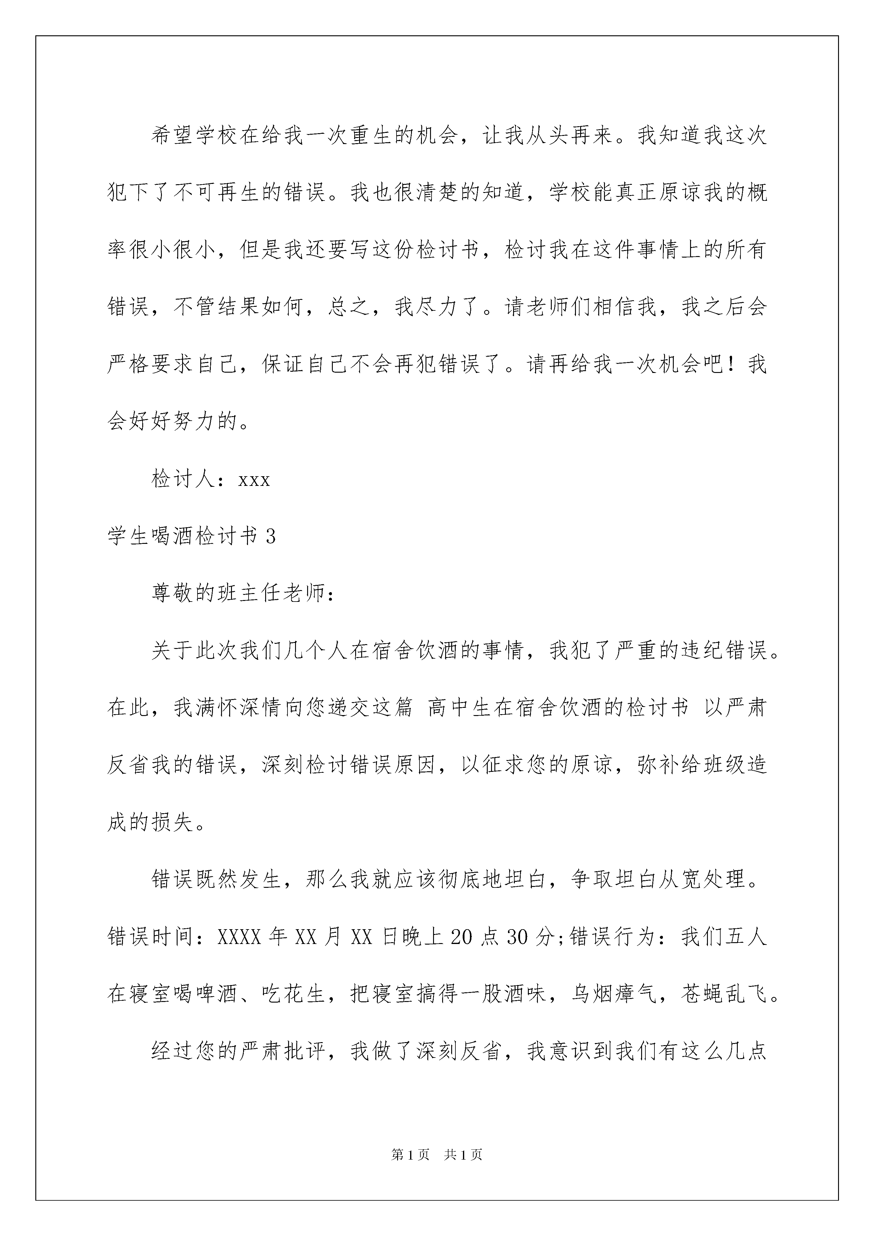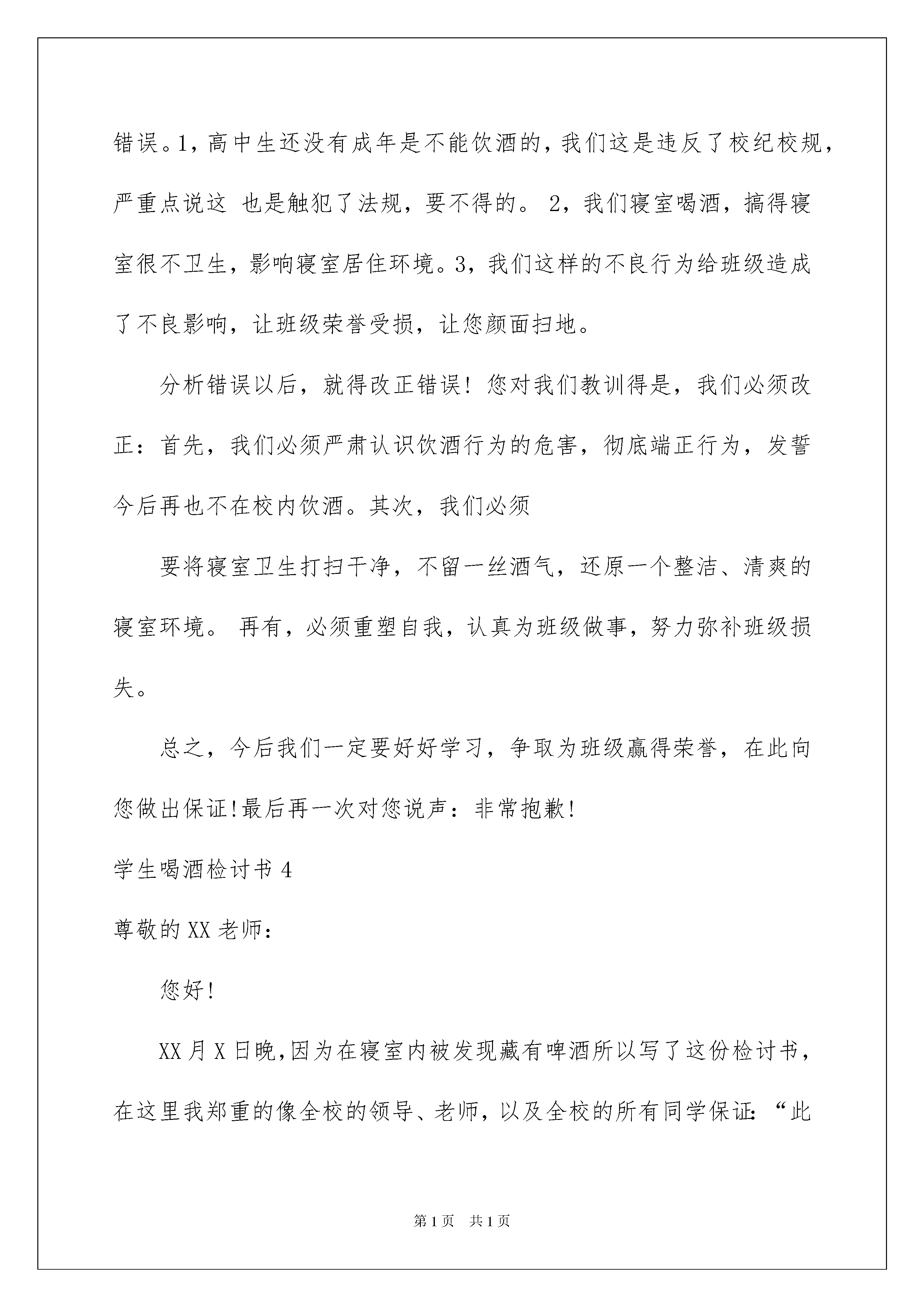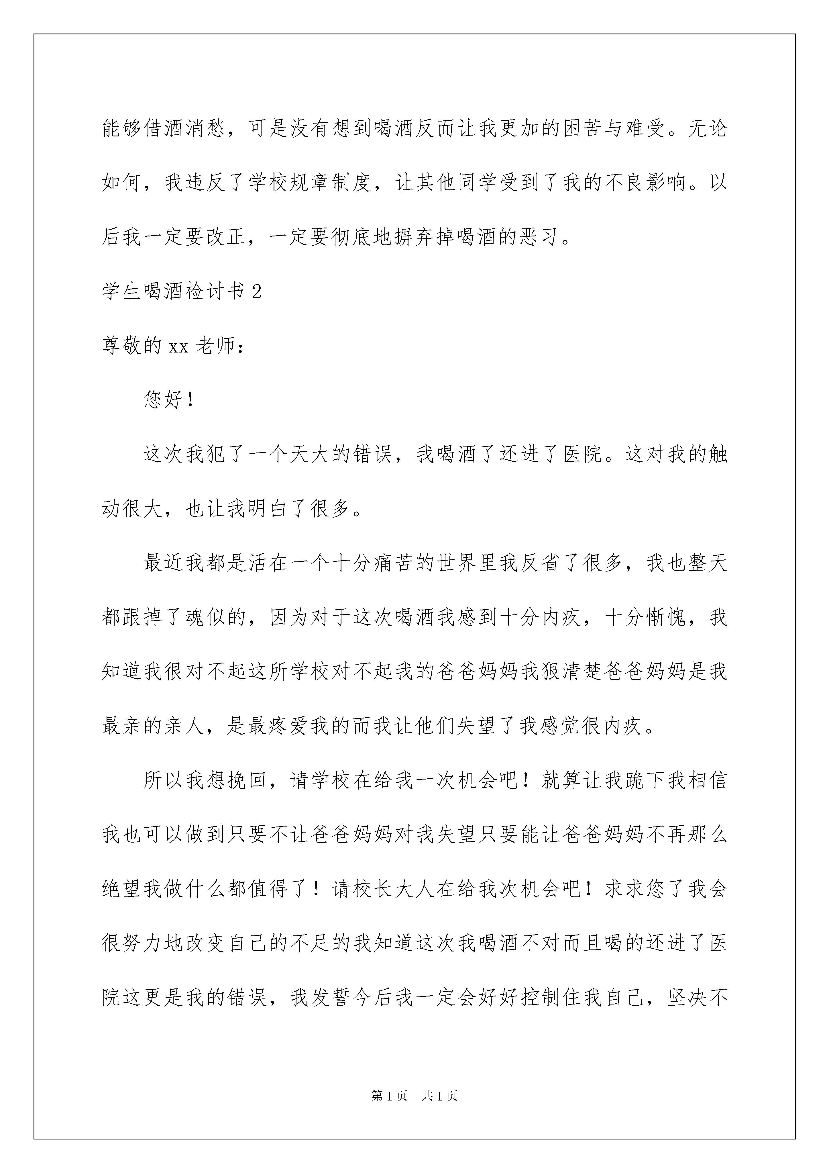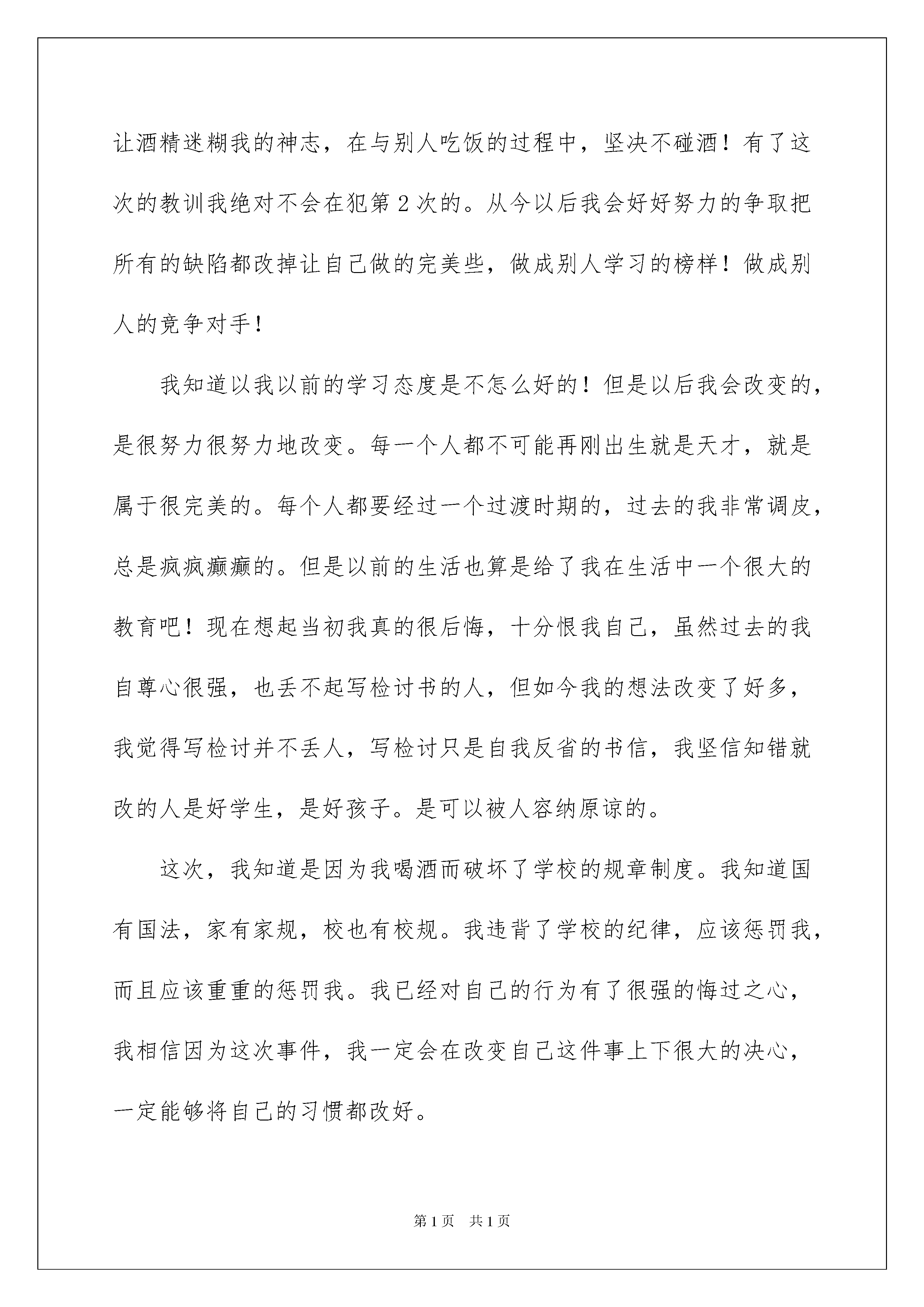 2022学生喝酒检讨书合集15篇学生喝酒检讨书合集15篇在有过错的情况下,为了避免今后再出现此类事件,往往被要求写检讨书来自我检讨,在写检讨书的时候要注意态度要诚恳、端正。但是你知道怎样才能写的好吗?下面是我收集整理的学生喝酒检讨书,希望能够帮助到大家。学生喝酒检讨书1尊敬的老师:此番我在学校饭堂里喝酒了,带着满身酒气进入教室,给其他同学造成了很不良的影响,对此我深感愧疚与懊恼。经过您的批评与教育以后,我深深地感受到了喝酒是十分不好的行为。一来喝酒会对我学生幼嫩的肝功能造成伤害,正所谓“喝酒伤身”啊。二来,我喝酒会导致记忆力减退,我现在是学生特别要注重记忆力,没有记忆力我就不能够记住知识了。三来,我喝酒也容易造成情绪失控,也许引发严重的问题。这次我在学校喝酒,是因为遇到了生活上的不开心的事情,想着能够借酒消愁,可是没有想到喝酒反而让我更加的困苦与难受。无论如何,我违反了学校规章制度,让其他同学受到了我的不良影响。以后我一定要改正,一定要彻底地摒弃掉喝酒的恶习。学生喝酒检讨书2尊敬的xx老师:您好!这次我犯了一个天大的错误,我喝酒了还进了医院。这对我的触动很大,也让我明白了很多。最近我都是活在一个十分痛苦的世界里我反省了很多,我也整天都跟掉了魂似的,因为对于这次喝酒我感到十分内疚,十分惭愧,我知道我很对不起这所学校对不起我的爸爸妈妈我狠清楚爸爸妈妈是我最亲的亲人,是最疼爱我的而我让他们失望了我感觉很内疚。所以我想挽回,请学校在给我一次机会吧!就算让我跪下我相信我也可以做到只要不让爸爸妈妈对我失望只要能让爸爸妈妈不再那么绝望我做什么都值得了!请校长大人在给我次机会吧!求求您了我会很努力地改变自己的不足的我知道这次我喝酒不对而且喝的还进了医院这更是我的错误,我发誓今后我一定会好好控制住我自己,坚决不让酒精迷糊我的神志,在与别人吃饭的过程中,坚决不碰酒!有了这次的教训我绝对不会在犯第2次的。从今以后我会好好努力的争取把所有的缺陷都改掉让自己做的完美些,做成别人学习的榜样!做成别人的竞争对手!我知道以我以前的学习态度是不怎么好的!但是以后我会改变的,是很努力很努力地改变。每一个人都不可能再刚出生就是天才,就是属于很完美的。每个人都要经过一个过渡时期的,过去的我非常调皮,总是疯疯癫癫的。但是以前的生活也算是给了我在生活中一个很大的教育吧!现在想起当初我真的很后悔,十分恨我自己,虽然过去的我自尊心很强,也丢不起写检讨书的人,但如今我的想法改变了好多,我觉得写检讨并不丢人,写检讨只是自我反省的书信,我坚信知错就改的人是好学生,是好孩子。是可以被人容纳原谅的。这次,我知道是因为我喝酒而破坏了学校的规章制度。我知道国有国法,家有家规,校也有校规。我违背了学校的纪律,应该惩罚我,而且应该重重的惩罚我。我已经对自己的行为有了很强的悔过之心,我相信因为这次事件,我一定会在改变自己这件事上下很大的决心,一定能够将自己的习惯都改好。希望学校在给我一次重生的机会,让我从头再来。我知道我这次犯下了不可再生的错误。我也很清楚的知道,学校能真正原谅我的概率很小很小,但是我还要写这份检讨书,检讨我在这件事情上的所有错误,不管结果如何,总之,我尽力了。请老师们相信我,我之后会严格要求自己,保证自己不会再犯错误了。请再给我一次机会吧!我会好好努力的。检讨人:xxx学生喝酒检讨书3尊敬的班主任老师:关于此次我们几个人在宿舍饮酒的事情,我犯了严重的违纪错误。在此,我满怀深情向您递交这篇高中生在宿舍饮酒的检讨书以严肃反省我的错误,深刻检讨错误原因,以征求您的原谅,弥补给班级造成的损失。错误既然发生,那么我就应该彻底地坦白,争取坦白从宽处理。错误时间:XXXX年XX月XX日晚上20点30分;错误行为:我们五人在寝室喝啤酒、吃花生,把寝室搞得一股酒味,乌烟瘴气,苍蝇乱飞。经过您的严肃批评,我做了深刻反省,我意识到我们有这么几点错误。1,高中生还没有成年是不能饮酒的,我们这是违反了校纪校规,严重点说这也是触犯了法规,要不得的。2,我们寝室喝酒,搞得寝室很不卫生,影响寝室居住环境。3,我们这样的不良行为给班级造成了不良影响,让班级荣誉受损,让您颜面扫地。分析错误以后,就得改正错误!您对我们教训得是,我们必须改正:首先,我们必须严肃认识饮酒行为的危害,彻底端正行为,发誓今后再也不在校内饮酒。其次,我们必须要将寝室卫生打扫干净,不留一丝酒气,还原一个整洁、清爽的寝室环境。再有,必须重塑自我,认真为班级做事,努力弥补班级损失。总之,今后我们一定要好好学习,争取为班级赢得荣誉,在此向您做出保证!最后再一次对您说声:非常抱歉!学生喝酒检讨