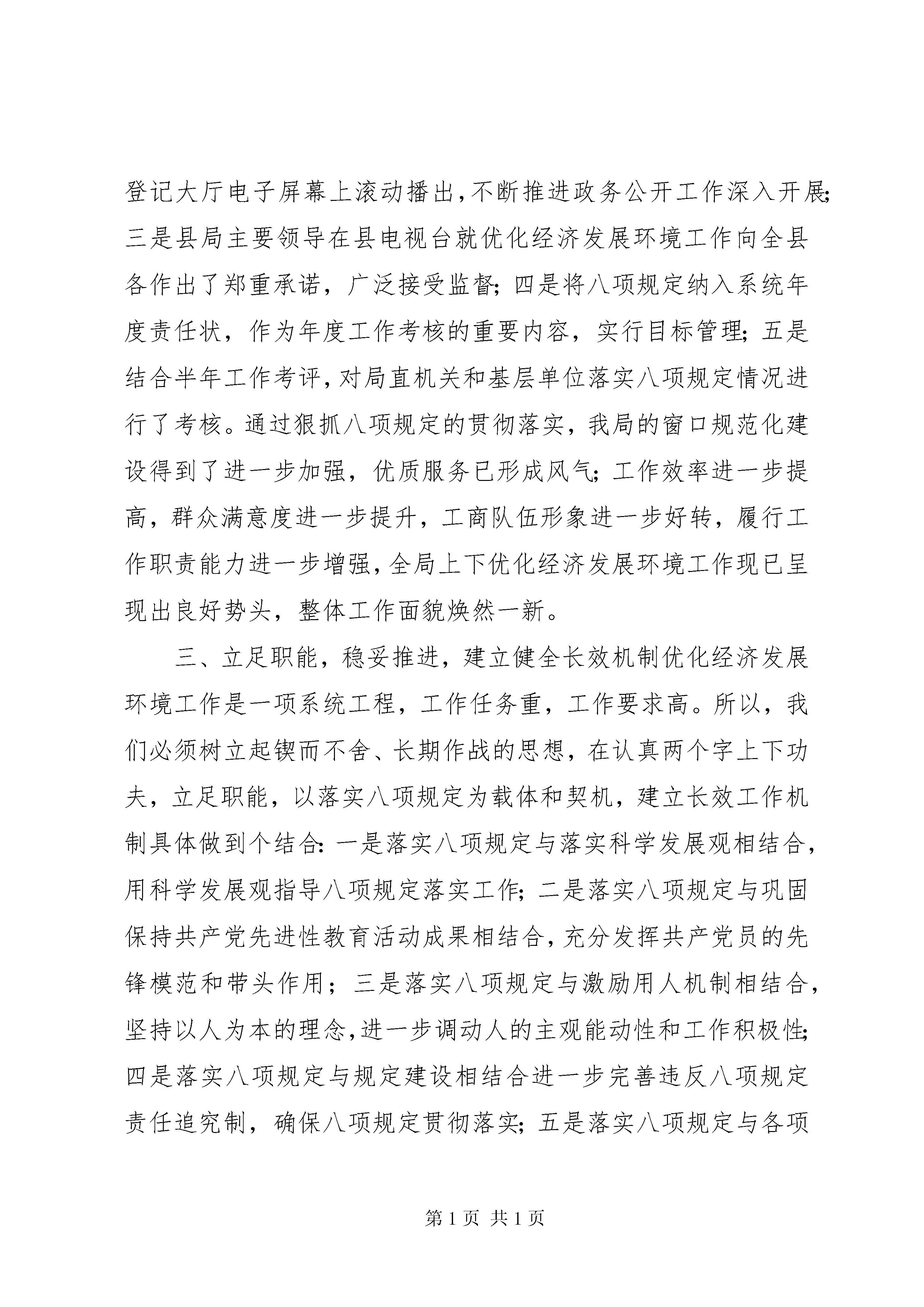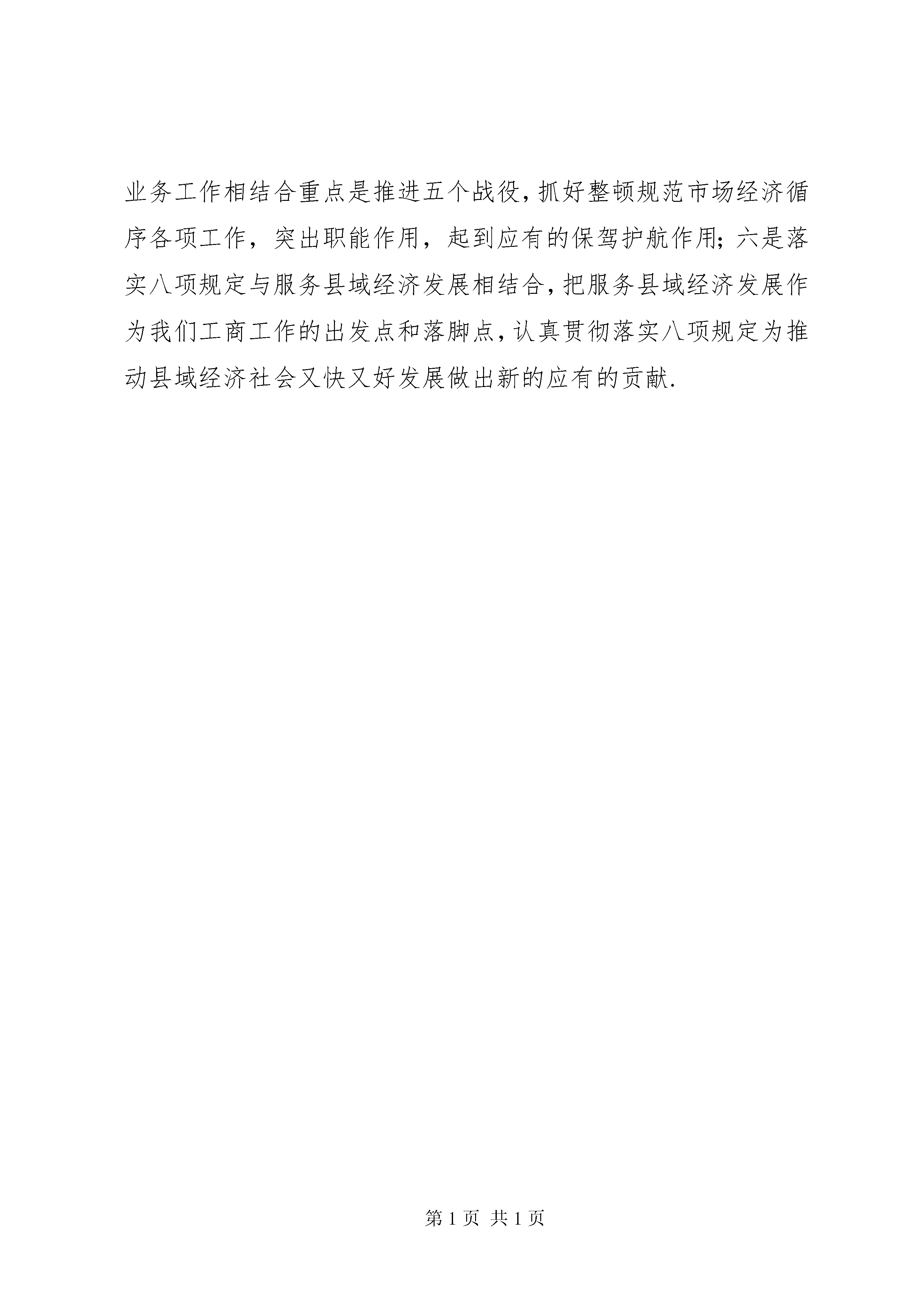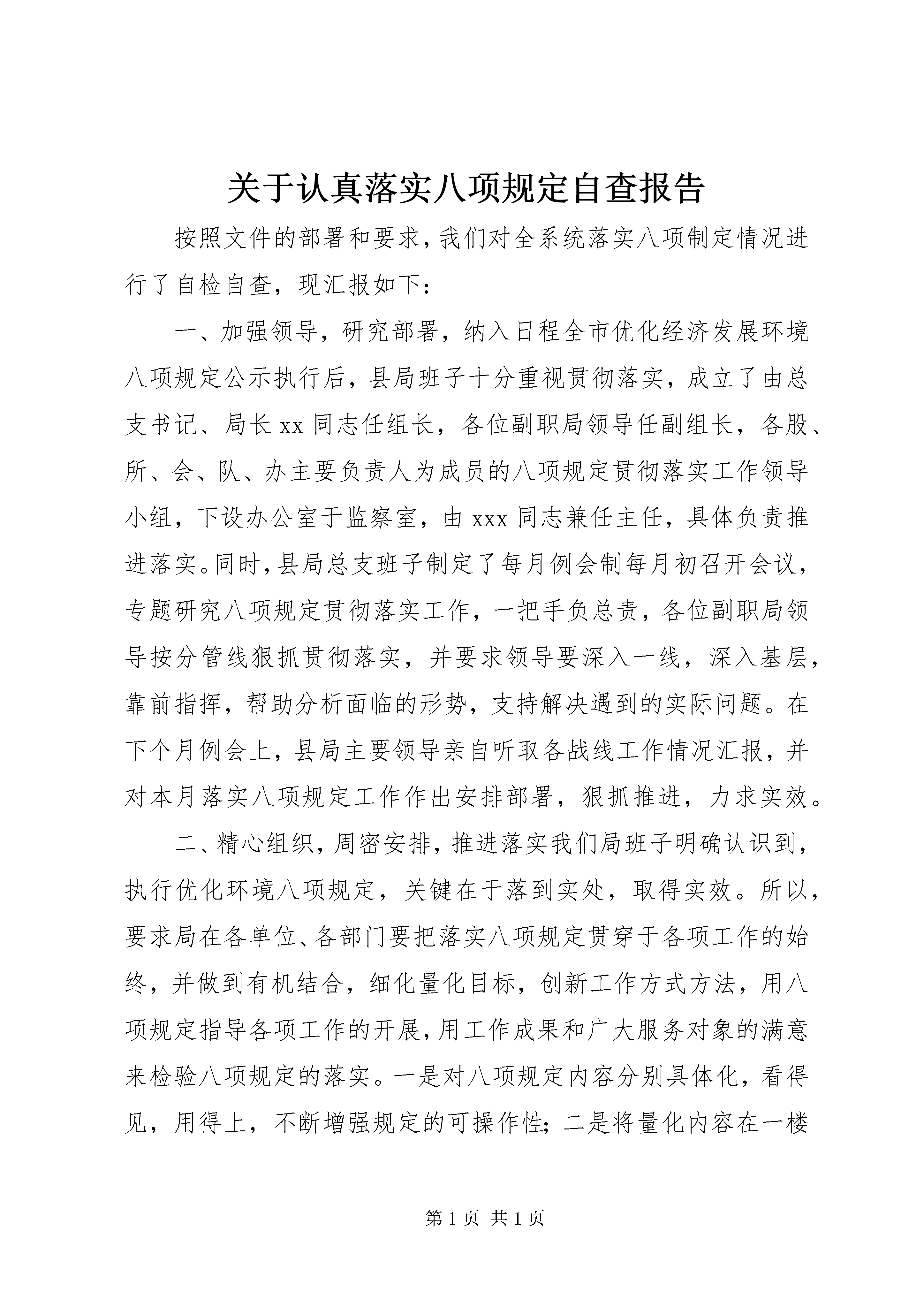 关于认真落实八项规定自查报告按照文件的部署和要求,我们对全系统落实八项制定情况进行了自检自查,现汇报如下:一、加强领导,研究部署,纳入日程全市优化经济发展环境八项规定公示执行后,县局班子十分重视贯彻落实,成立了由总支书记、局长xx同志任组长,各位副职局领导任副组长,各股、所、会、队、办主要负责人为成员的八项规定贯彻落实工作领导小组,下设办公室于监察室,由xxx同志兼任主任,具体负责推进落实。同时,县局总支班子制定了每月例会制每月初召开会议,专题研究八项规定贯彻落实工作,一把手负总责,各位副职局领导按分管线狠抓贯彻落实,并要求领导要深入一线,深入基层,靠前指挥,帮助分析面临的形势,支持解决遇到的实际问题。在下个月例会上,县局主要领导亲自听取各战线工作情况汇报,并对本月落实八项规定工作作出安排部署,狠抓推进,力求实效。二、精心组织,周密安排,推进落实我们局班子明确认识到,执行优化环境八项规定,关键在于落到实处,取得实效。所以,要求局在各单位、各部门要把落实八项规定贯穿于各项工作的始终,并做到有机结合,细化量化目标,创新工作方式方法,用八项规定指导各项工作的开展,用工作成果和广大服务对象的满意来检验八项规定的落实。一是对八项规定内容分别具体化,看得见,用得上,不断增强规定的可操作性;二是将量化内容在一楼登记大厅电子屏幕上滚动播出,不断推进政务公开工作深入开展;三是县局主要领导在县电视台就优化经济发展环境工作向全县各作出了郑重承诺,广泛接受监督;四是将八项规定纳入系统年度责任状,作为年度工作考核的重要内容,实行目标管理;五是结合半年工作考评,对局直机关和基层单位落实八项规定情况进行了考核。通过狠抓八项规定的贯彻落实,我局的窗口规范化建设得到了进一步加强,优质服务已形成风气;工作效率进一步提高,群众满意度进一步提升,工商队伍形象进一步好转,履行工作职责能力进一步增强,全局上下优化经济发展环境工作现已呈现出良好势头,整体工作面貌焕然一新。三、立足职能,稳妥推进,建立健全长效机制优化经济发展环境工作是一项系统工程,工作任务重,工作要求高。所以,我们必须树立起锲而不舍、长期作战的思想,在认真两个字上下功夫,立足职能,以落实八项规定为载体和契机,建立长效工作机制具体做到个结合:一是落实八项规定与落实科学发展观相结合,用科学发展观指导八项规定落实工作;二是落实八项规定与巩固保持共产党先进性教育活动成果相结合,充分发挥共产党员的先锋模范和带头作用;三是落实八项规定与激励用人机制相结合,坚持以人为本的理念,进一步调动人的主观能动性和工作积极性;四是落实八项规定与规定建设相结合进一步完善违反八项规定责任追究制,确保八项规定贯彻落实;五是落实八项规定与各项业务工作相结合重点是推进五个战役,抓好整顿规范市场经济循序各项工作,突出职能作用,起到应有的保驾护航作用;六是落实八项规定与服务县域经济发展相结合,把服务县域经济发展作为我们工商工作的出发点和落脚点,认真贯彻落实八项规定为推动县域经济社会又快又好发展做出新的应有的贡献.