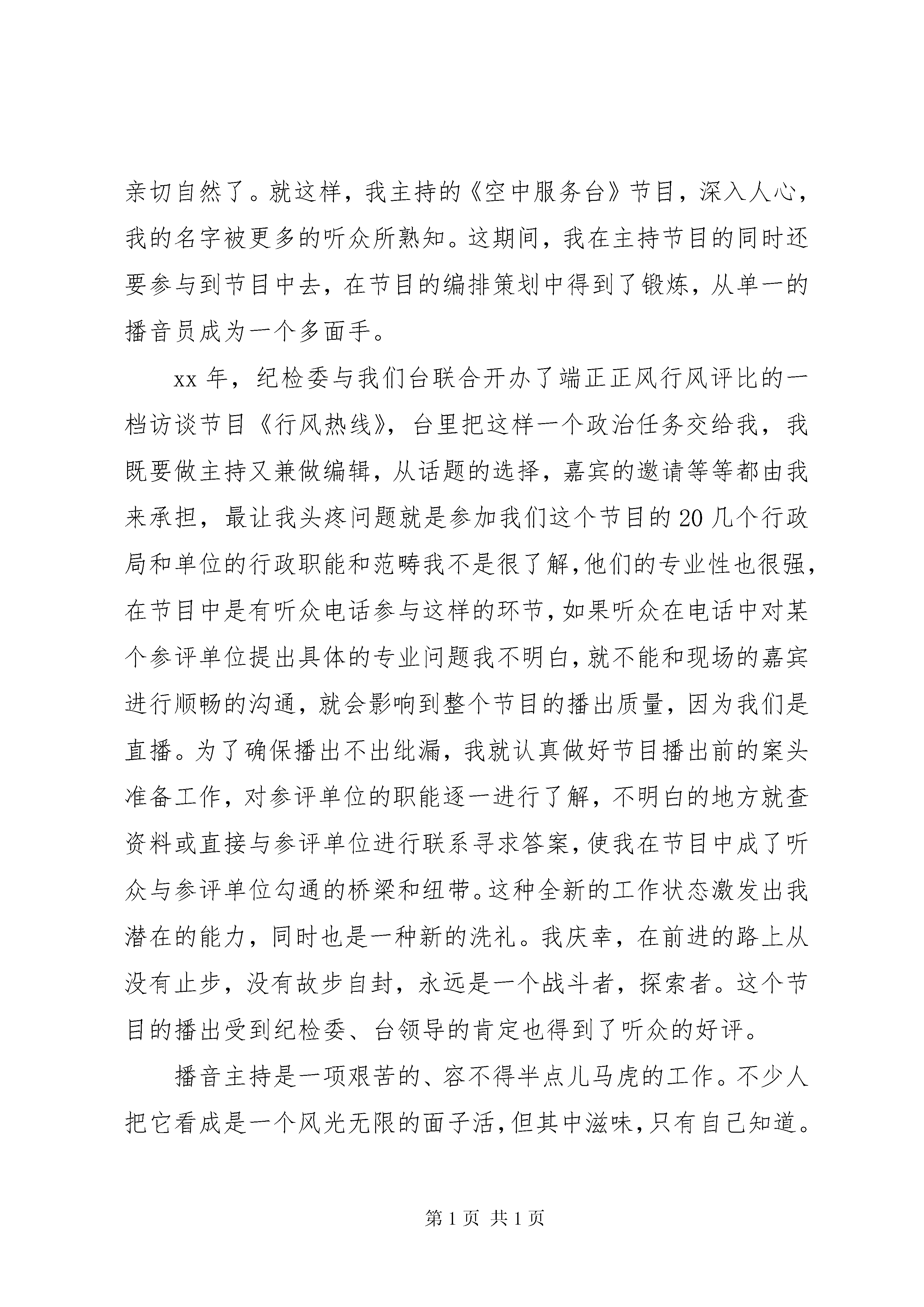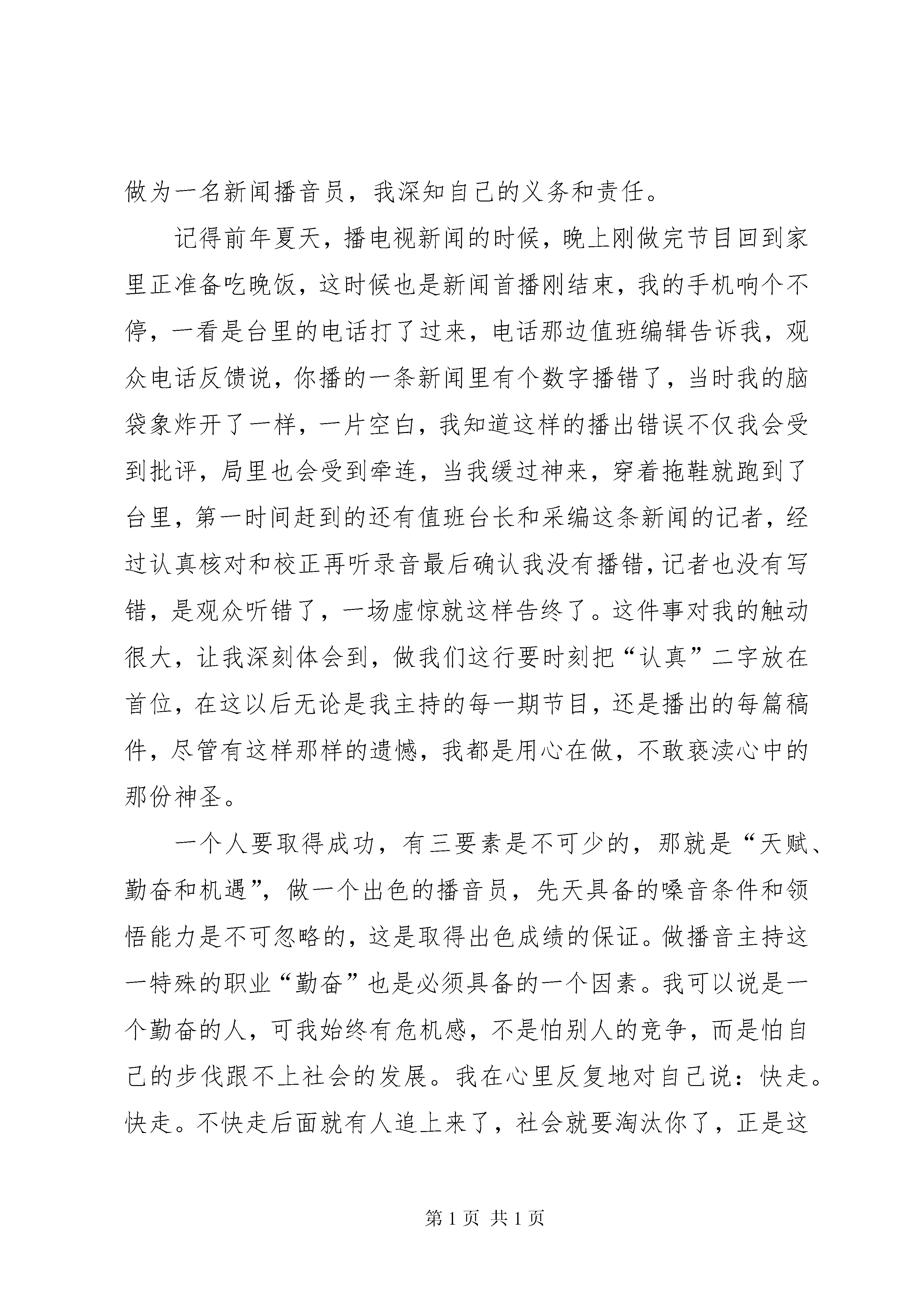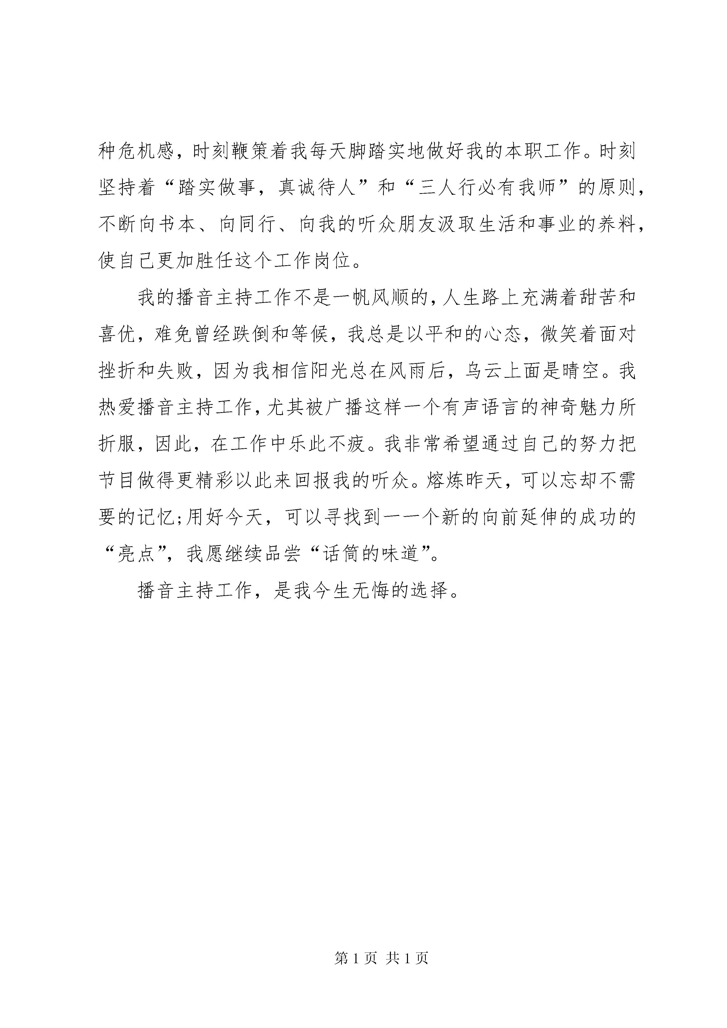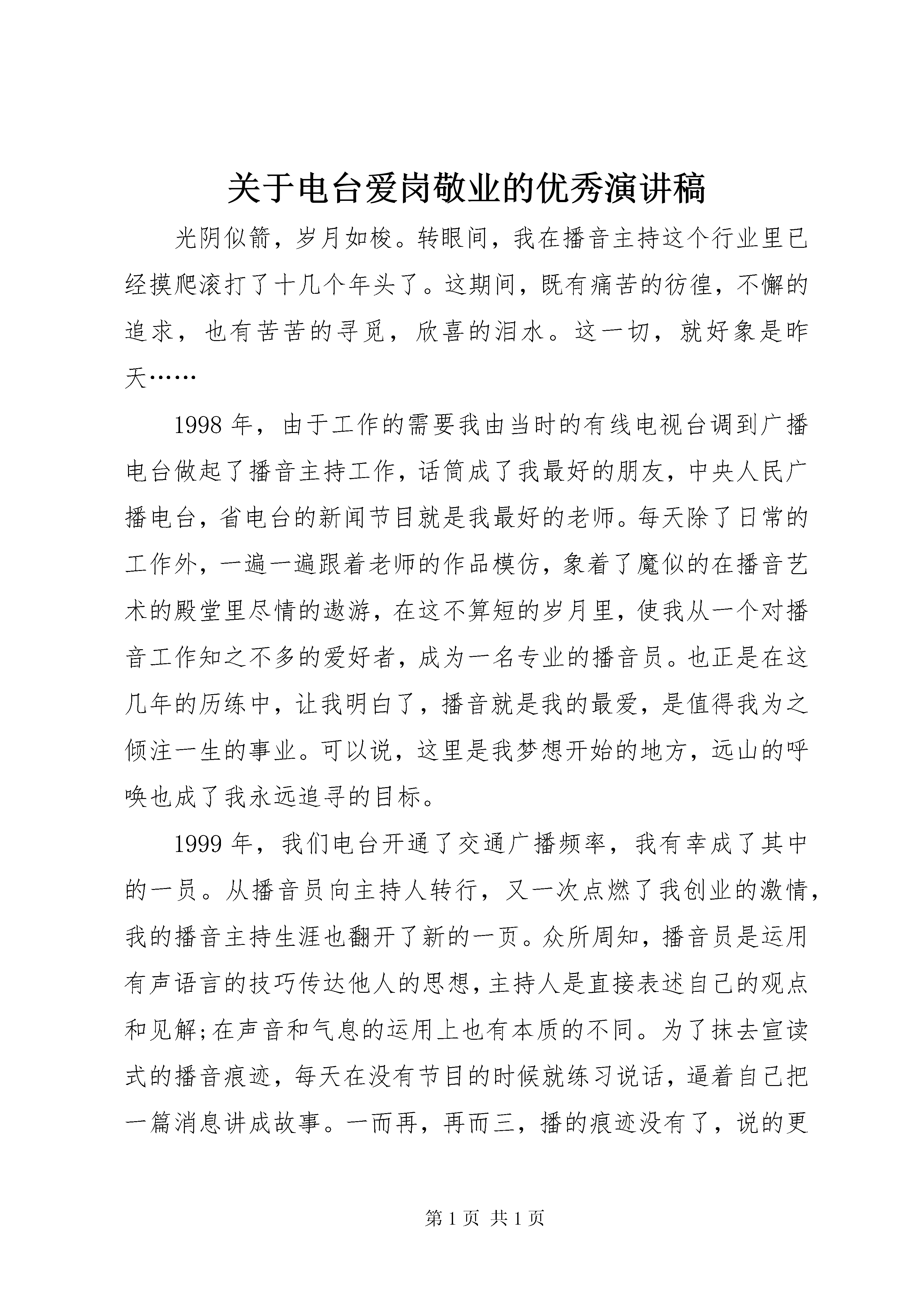 关于电台爱岗敬业的优秀演讲稿光阴似箭,岁月如梭。转眼间,我在播音主持这个行业里已经摸爬滚打了十几个年头了。这期间,既有痛苦的彷徨,不懈的追求,也有苦苦的寻觅,欣喜的泪水。这一切,就好象是昨天……1998年,由于工作的需要我由当时的有线电视台调到广播电台做起了播音主持工作,话筒成了我最好的朋友,中央人民广播电台,省电台的新闻节目就是我最好的老师。每天除了日常的工作外,一遍一遍跟着老师的作品模仿,象着了魔似的在播音艺术的殿堂里尽情的遨游,在这不算短的岁月里,使我从一个对播音工作知之不多的爱好者,成为一名专业的播音员。也正是在这几年的历练中,让我明白了,播音就是我的最爱,是值得我为之倾注一生的事业。可以说,这里是我梦想开始的地方,远山的呼唤也成了我永远追寻的目标。1999年,我们电台开通了交通广播频率,我有幸成了其中的一员。从播音员向主持人转行,又一次点燃了我创业的激情,我的播音主持生涯也翻开了新的一页。众所周知,播音员是运用有声语言的技巧传达他人的思想,主持人是直接表述自己的观点和见解;在声音和气息的运用上也有本质的不同。为了抹去宣读式的播音痕迹,每天在没有节目的时候就练习说话,逼着自己把一篇消息讲成故事。一而再,再而三,播的痕迹没有了,说的更亲切自然了。就这样,我主持的《空中服务台》节目,深入人心,我的名字被更多的听众所熟知。这期间,我在主持节目的同时还要参与到节目中去,在节目的编排策划中得到了锻炼,从单一的播音员成为一个多面手。xx年,纪检委与我们台联合开办了端正正风行风评比的一档访谈节目《行风热线》,台里把这样一个政治任务交给我,我既要做主持又兼做编辑,从话题的选择,嘉宾的邀请等等都由我来承担,最让我头疼问题就是参加我们这个节目的20几个行政局和单位的行政职能和范畴我不是很了解,他们的专业性也很强,在节目中是有听众电话参与这样的环节,如果听众在电话中对某个参评单位提出具体的专业问题我不明白,就不能和现场的嘉宾进行顺畅的沟通,就会影响到整个节目的播出质量,因为我们是直播。为了确保播出不出纰漏,我就认真做好节目播出前的案头准备工作,对参评单位的职能逐一进行了解,不明白的地方就查资料或直接与参评单位进行联系寻求答案,使我在节目中成了听众与参评单位勾通的桥梁和纽带。这种全新的工作状态激发出我潜在的能力,同时也是一种新的洗礼。我庆幸,在前进的路上从没有止步,没有故步自封,永远是一个战斗者,探索者。这个节目的播出受到纪检委、台领导的肯定也得到了听众的好评。播音主持是一项艰苦的、容不得半点儿马虎的工作。不少人把它看成是一个风光无限的面子活,但其中滋味,只有自己知道。做为一名新闻播音员,我深知自己的义务和责任。记得前年夏天,播电视新闻的时候,晚上刚做完节目回到家里正准备吃晚饭,这时候也是新闻首播刚结束,我的手机响个不停,一看是台里的电话打了过来,电话那边值班编辑告诉我,观众电话反馈说,你播的一条新闻里有个数字播错了,当时我的脑袋象炸开了一样,一片空白,我知道这样的播出错误不仅我会受到批评,局里也会受到牵连,当我缓过神来,穿着拖鞋就跑到了台里,第一时间赶到的还有值班台长和采编这条新闻的记者,经过认真核对和校正再听录音最后确认我没有播错,记者也没有写错,是观众听错了,一场虚惊就这样告终了。这件事对我的触动很大,让我深刻体会到,做我们这行要时刻把“认真”二字放在首位,在这以后无论是我主持的每一期节目,还是播出的每篇稿件,尽管有这样那样的遗憾,我都是用心在做,不敢亵渎心中的那份神圣。一个人要取得成功,有三要素是不可少的,那就是“天赋、勤奋和机遇”,做一个出色的播音员,先天具备的嗓音条件和领悟能力是不可忽略的,这是取得出色成绩的保证。做播音主持这一特殊的职业“勤奋”也是必须具备的一个因素。我可以说是一个勤奋的人,可我始终有危机感,不是怕别人的竞争,而是怕自己的步伐跟不上社会的发展。我在心里反复地对自己说:快走。快走。不快走后面就有人追上来了,社会就要淘汰你了,正是这种危机感,时刻鞭策着我每天脚踏实地做好我的本职工作。时刻坚持着“踏实做事,真诚待人”和“三人行必有我师”的原则,不断向书本、向同行、向我的听众朋友汲取生活和事业的养料,使自己更加胜任这个工作岗位。我的播音主持工作不是一帆风顺的,人生路上充满着甜苦和喜优,难免曾经跌倒和等候,我总是以平和的心态,微笑着面对挫折和失败,因为我相信阳光总在风雨后,乌云上面是晴空。我热爱播音主持工作,尤其被广播这样一个有声语言的神奇魅力所折服,因此,在工作中乐此不疲。我非常希望通过自己的努力把节目做得更精彩以此来回报我的听众。熔炼昨天,可以忘却不需要的记忆;用好今天,可以寻找到一一个新的向前延伸的成功的“亮点”,我愿继续品尝“话筒的味道”。播音主持工作,是我今生无悔的选择。