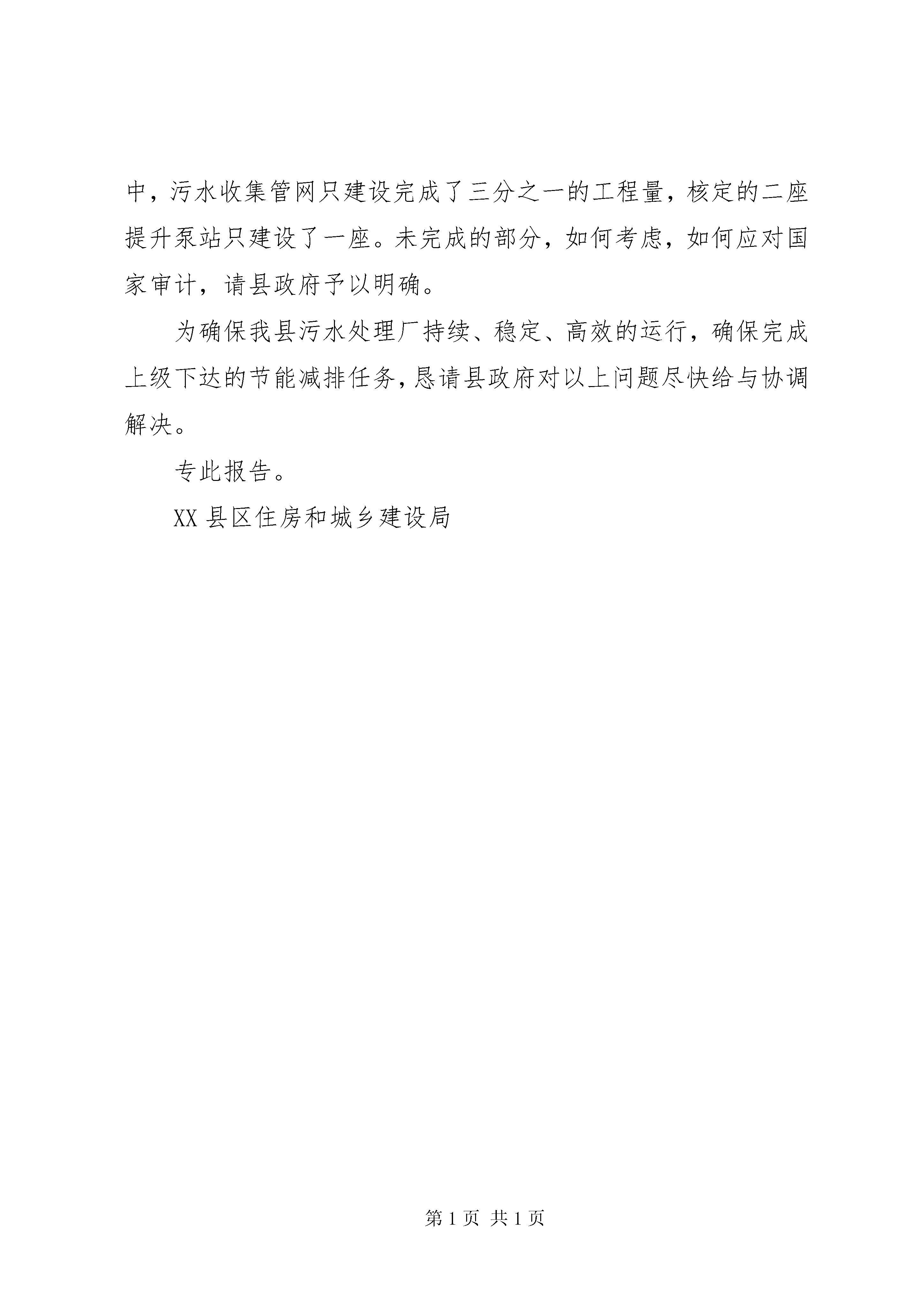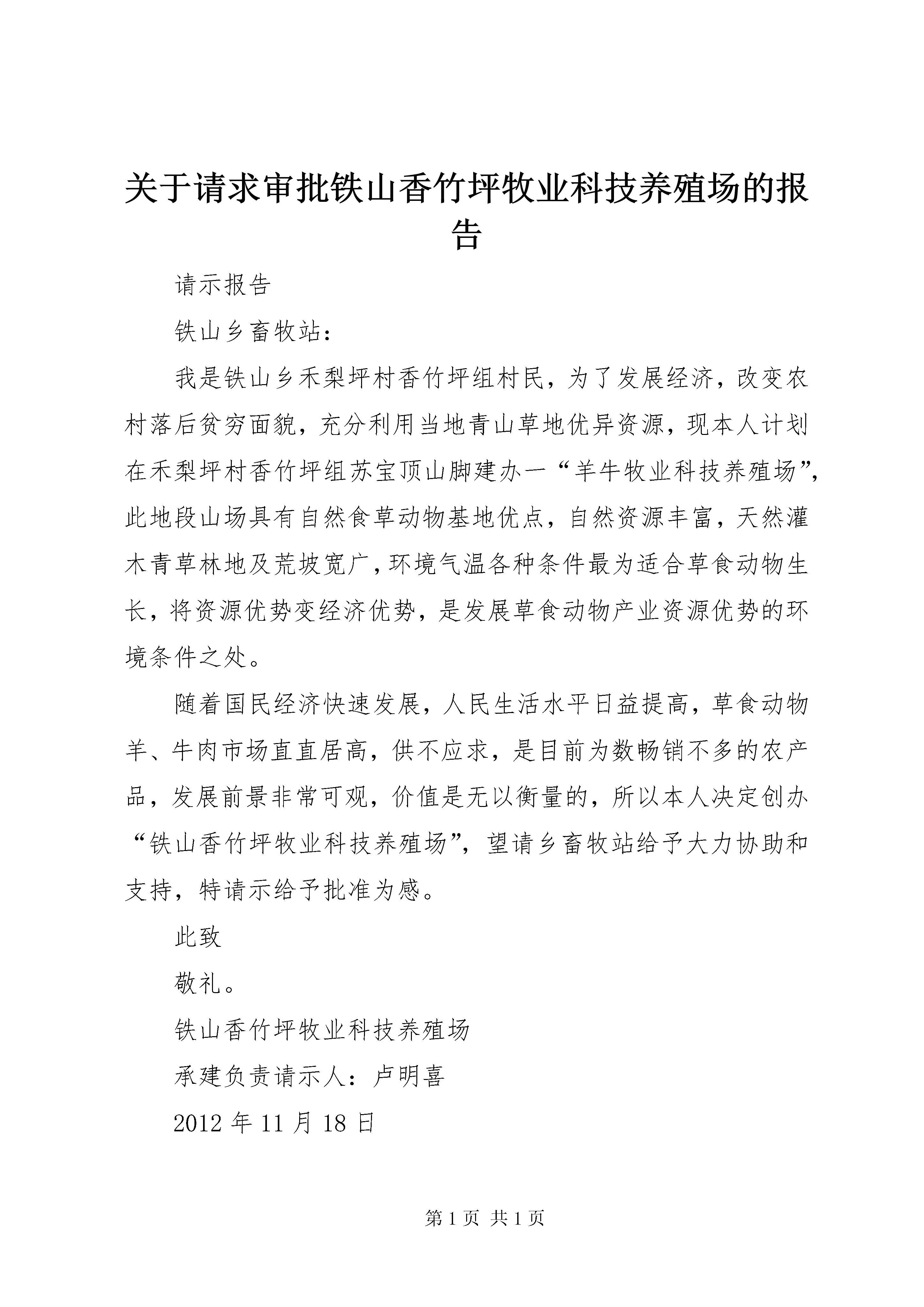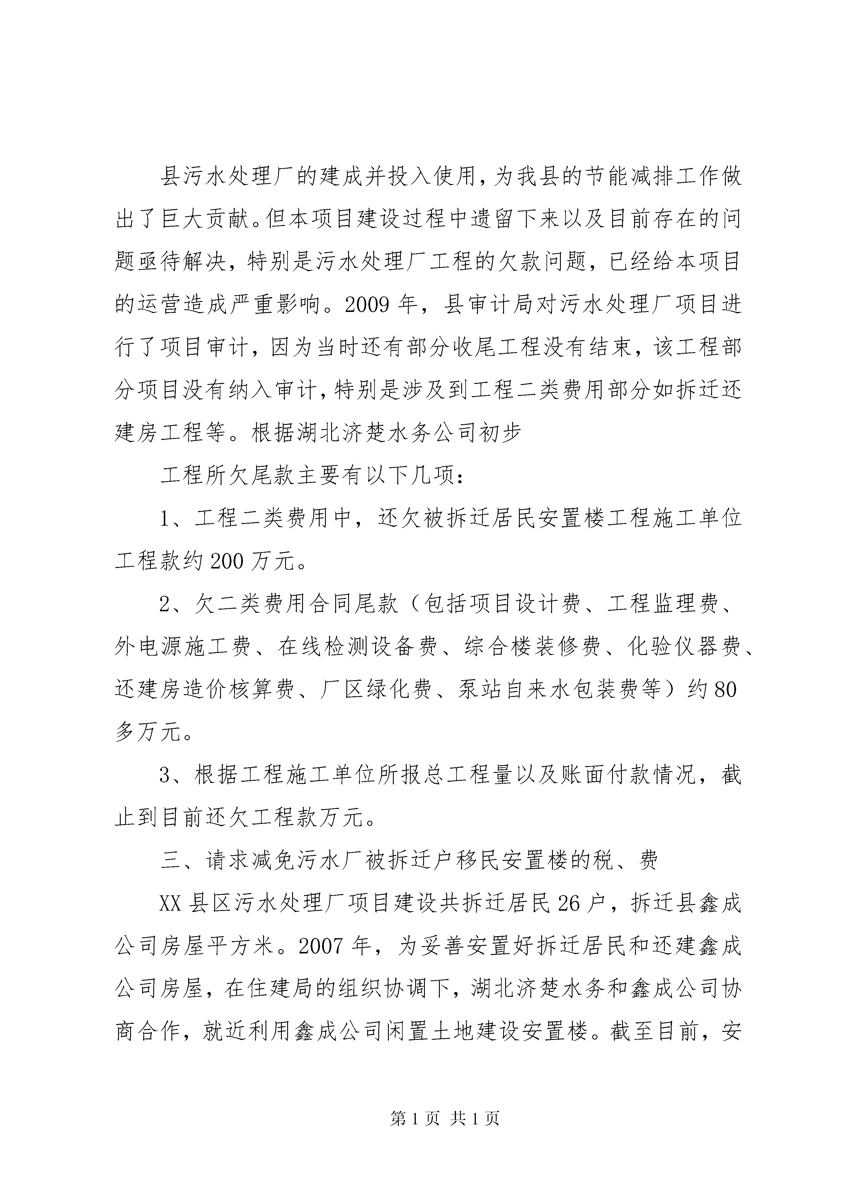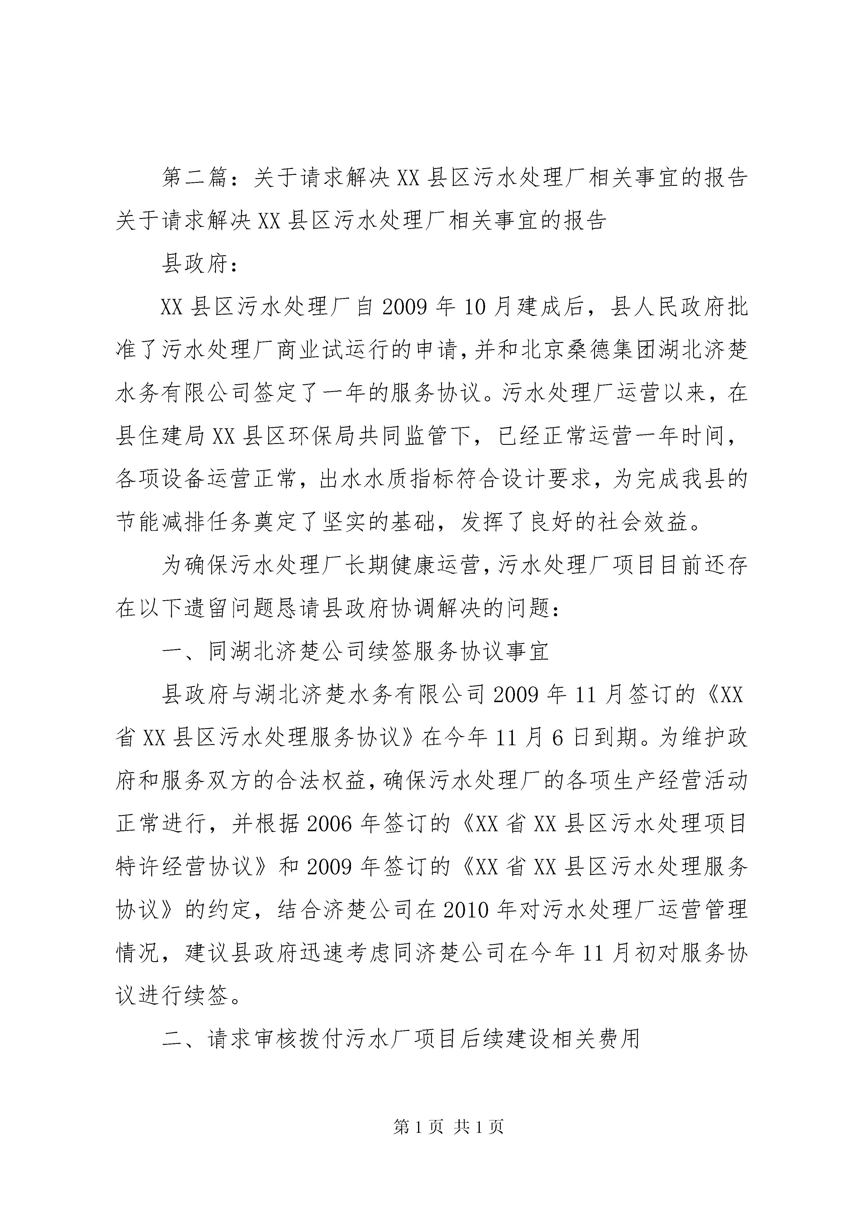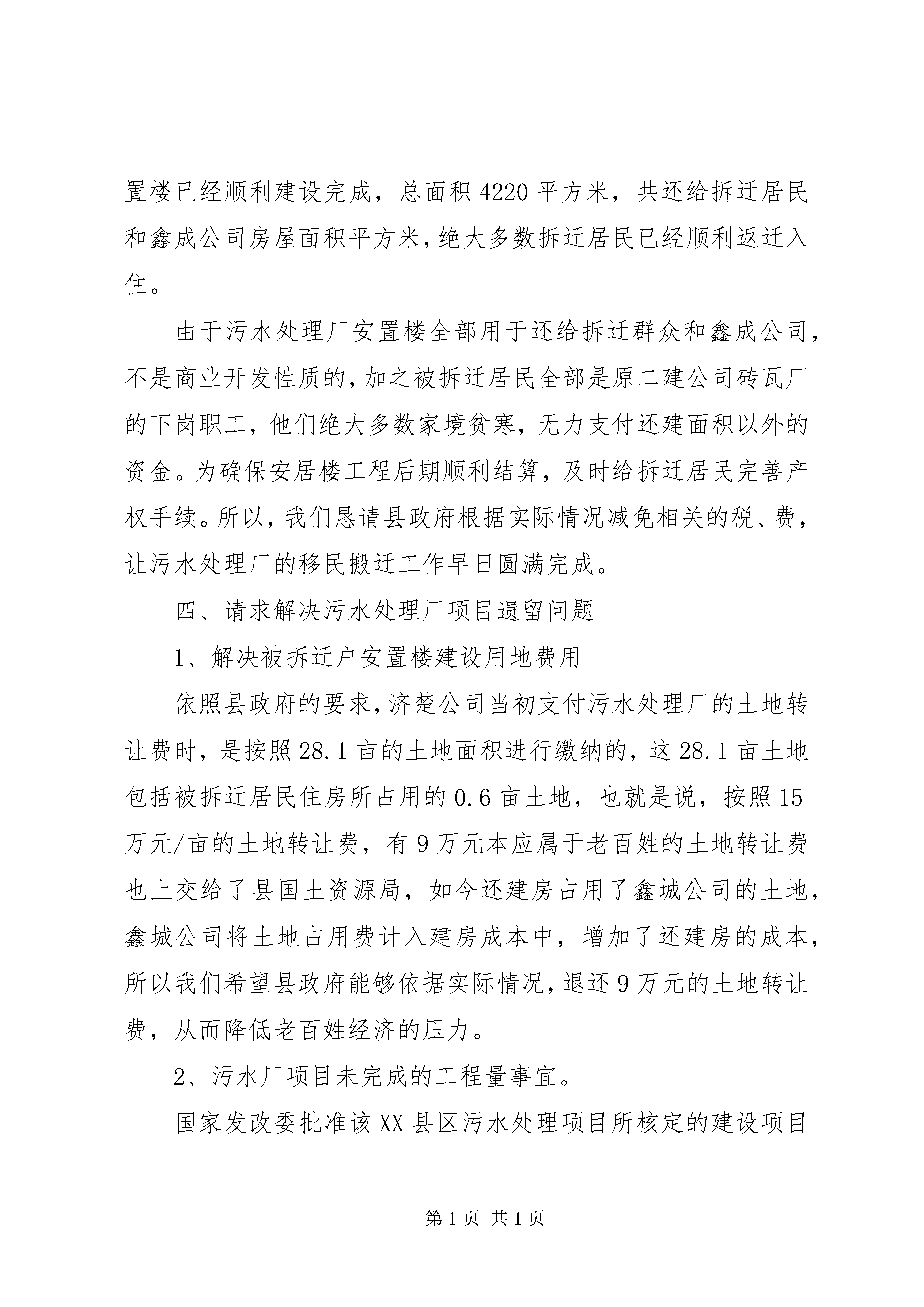 关于请求审批铁山香竹坪牧业科技养殖场的报告请示报告铁山乡畜牧站:我是铁山乡禾梨坪村香竹坪组村民,为了发展经济,改变农村落后贫穷面貌,充分利用当地青山草地优异资源,现本人计划在禾梨坪村香竹坪组苏宝顶山脚建办一“羊牛牧业科技养殖场”,此地段山场具有自然食草动物基地优点,自然资源丰富,天然灌木青草林地及荒坡宽广,环境气温各种条件最为适合草食动物生长,将资源优势变经济优势,是发展草食动物产业资源优势的环境条件之处。随着国民经济快速发展,人民生活水平日益提高,草食动物羊、牛肉市场直直居高,供不应求,是目前为数畅销不多的农产品,发展前景非常可观,价值是无以衡量的,所以本人决定创办“铁山香竹坪牧业科技养殖场”,望请乡畜牧站给予大力协助和支持,特请示给予批准为感。此致敬礼。铁山香竹坪牧业科技养殖场承建负责请示人:卢明喜2012年11月18日第二篇:关于请求解决XX县区污水处理厂相关事宜的报告关于请求解决XX县区污水处理厂相关事宜的报告县政府:XX县区污水处理厂自2009年10月建成后,县人民政府批准了污水处理厂商业试运行的申请,并和北京桑德集团湖北济楚水务有限公司签定了一年的服务协议。污水处理厂运营以来,在县住建局XX县区环保局共同监管下,已经正常运营一年时间,各项设备运营正常,出水水质指标符合设计要求,为完成我县的节能减排任务奠定了坚实的基础,发挥了良好的社会效益。为确保污水处理厂长期健康运营,污水处理厂项目目前还存在以下遗留问题恳请县政府协调解决的问题:一、同湖北济楚公司续签服务协议事宜县政府与湖北济楚水务有限公司2009年11月签订的《XX省XX县区污水处理服务协议》在今年11月6日到期。为维护政府和服务双方的合法权益,确保污水处理厂的各项生产经营活动正常进行,并根据2006年签订的《XX省XX县区污水处理项目特许经营协议》和2009年签订的《XX省XX县区污水处理服务协议》的约定,结合济楚公司在2010年对污水处理厂运营管理情况,建议县政府迅速考虑同济楚公司在今年11月初对服务协议进行续签。二、请求审核拨付污水厂项目后续建设相关费用县污水处理厂的建成并投入使用,为我县的节能减排工作做出了巨大贡献。但本项目建设过程中遗留下来以及目前存在的问题亟待解决,特别是污水处理厂工程的欠款问题,已经给本项目的运营造成严重影响。2009年,县审计局对污水处理厂项目进行了项目审计,因为当时还有部分收尾工程没有结束,该工程部分项目没有纳入审计,特别是涉及到工程二类费用部分如拆迁还建房工程等。根据湖北济楚水务公司初步工程所欠尾款主要有以下几项:1、工程二类费用中,还欠被拆迁居民安置楼工程施工单位工程款约200万元。2、欠二类费用合同尾款(包括项目设计费、工程监理费、外电源施工费、在线检测设备费、综合楼装修费、化验仪器费、还建房造价核算费、厂区绿化费、泵站自来水包装费等)约80多万元。3、根据工程施工单位所报总工程量以及账面付款情况,截止到目前还欠工程款万元。三、请求减免污水厂被拆迁户移民安置楼的税、费XX县区污水处理厂项目建设共拆迁居民26户,拆迁县鑫成公司房屋平方米。2007年,为妥善安置好拆迁居民和还建鑫成公司房屋,在住建局的组织协调下,湖北济楚水务和鑫成公司协商合作,就近利用鑫成公司闲置土地建设安置楼。截至目前,安置楼已经顺利建设完成,总面积4220平方米,共还给拆迁居民和鑫成公司房屋面积平方米,绝大多数拆迁居民已经顺利返迁入住。由于污水处理厂安置楼全部用于还给拆迁群众和鑫成公司,不是商业开发性质的,加之被拆迁居民全部是原二建公司砖瓦厂的下岗职工,他们绝大多数家境贫寒,无力支付还建面积以外的资金。为确保安居楼工程后期顺利结算,及时给拆迁居民完善产权手续。所以,我们恳请县政府根据实际情况减免相关的税、费,让污水处理厂的移民搬迁工作早日圆满完成。四、请求解决污水处理厂项目遗留问题1、解决被拆迁户安置楼建设用地费用依照县政府的要求,济楚公司当初支付污水处理厂的土地转让费时,是按照28.1亩的土地面积进行缴纳的,这28.1亩土地包括被拆迁居民住房所占用的0.6亩土地,也就是说,按照15万元/亩的土地转让费,有9万元本应属于老百姓的土地转让费也上交给了县国土资源局,如今还建房占用了鑫城公司的土地,鑫城公司将土地占用费计入建房成本中,增加了还建房的成本,所以我们希望县政府能够依据实际情况,退还9万元的土地转让费,从而降低老百姓经济的压力。2、污水厂项目未完成的工程量事宜。国家发改委批准该XX县区污水处理项目所核定的建设项目中,污水收集管网只建设完成了三分之一的工程量,核定的二座提升泵站只建设了一座。未完成的部分,如何考虑,如何应对国家审计,请县政府予以明确。为确保我县污水处理厂持续、稳定、高效的运行,确保完成上级下达的节能减排任务,恳请
