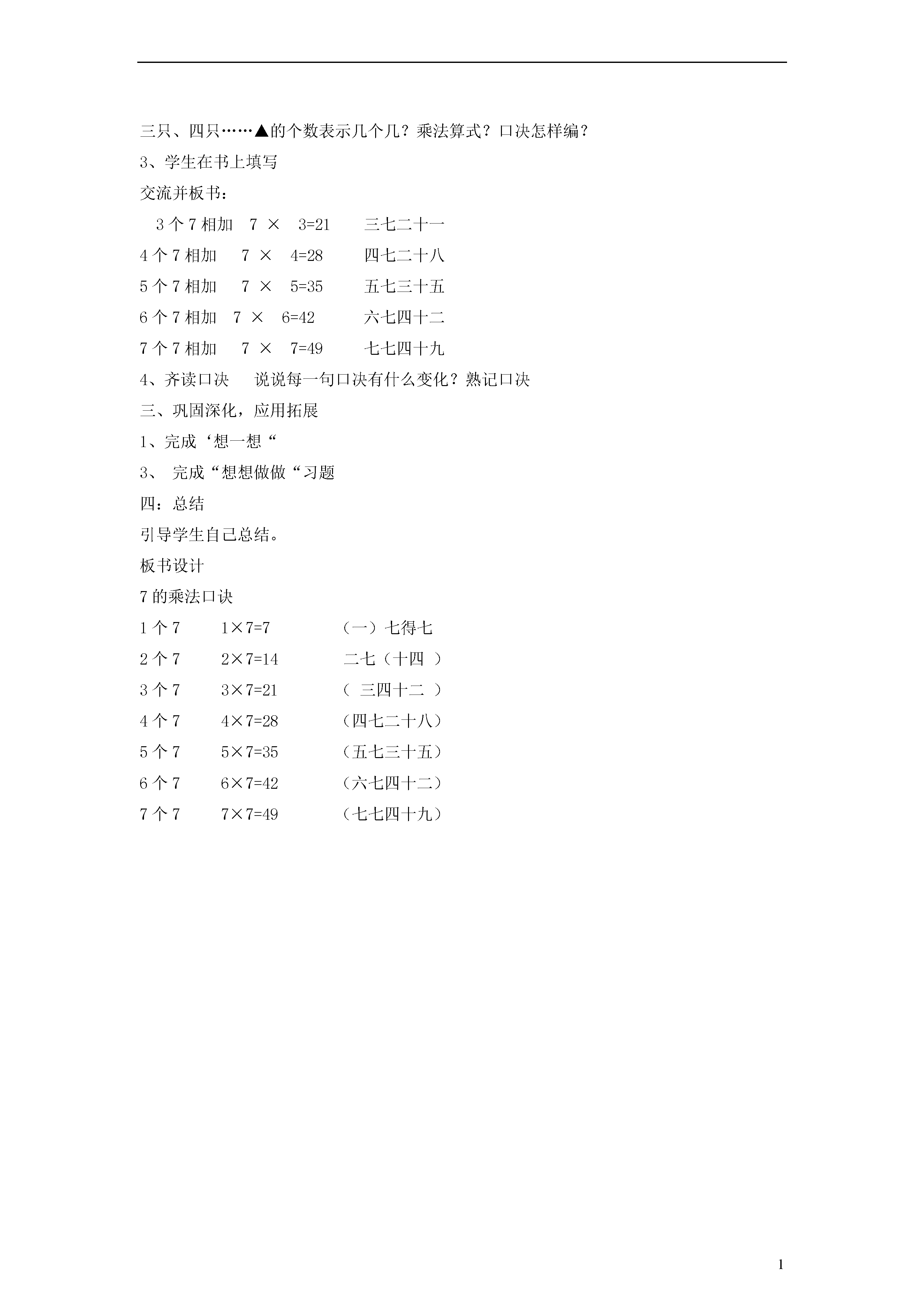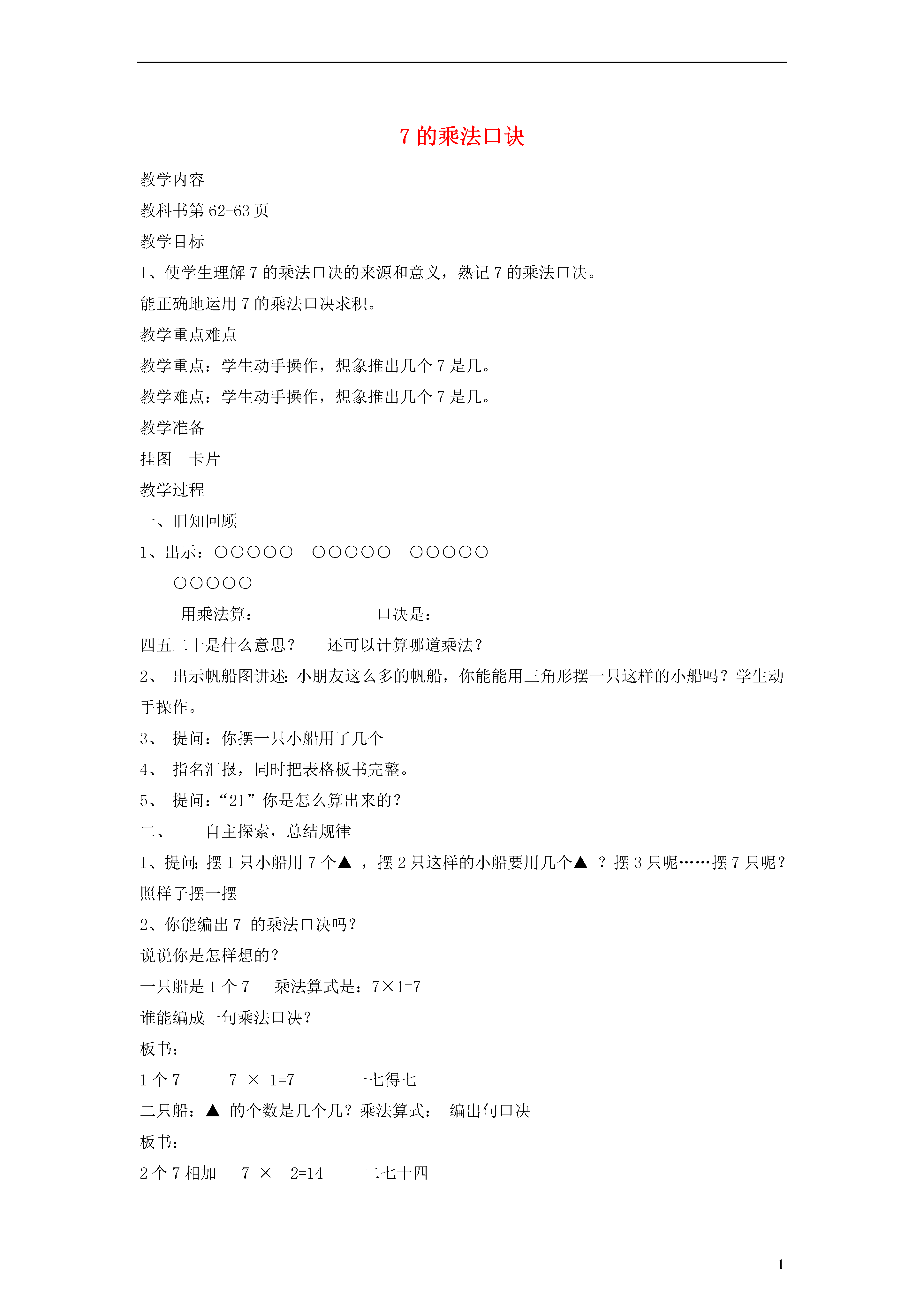 17的乘法口诀教学内容教科书第62-63页教学目标1、使学生理解7的乘法口决的来源和意义,熟记7的乘法口决。能正确地运用7的乘法口决求积。教学重点难点教学重点:学生动手操作,想象推出几个7是几。教学难点:学生动手操作,想象推出几个7是几。教学准备挂图卡片教学过程一、旧知回顾1、出示:○○○○○○○○○○○○○○○○○○○○用乘法算:口决是:四五二十是什么意思?还可以计算哪道乘法?2、出示帆船图讲述:小朋友这么多的帆船,你能能用三角形摆一只这样的小船吗?学生动手操作。3、提问:你摆一只小船用了几个4、指名汇报,同时把表格板书完整。5、提问:“21”你是怎么算出来的?二、自主探索,总结规律1、提问:摆1只小船用7个▲,摆2只这样的小船要用几个▲?摆3只呢……摆7只呢?照样子摆一摆2、你能编出7的乘法口决吗?说说你是怎样想的?一只船是1个7乘法算式是:7×1=7谁能编成一句乘法口决?板书:1个77×1=7一七得七二只船:▲的个数是几个几?乘法算式:编出句口决板书:2个7相加7×2=14二七十四三只、四只……▲的个数表示几个几?乘法算式?口决怎样编?3、学生在书上填写交流并板书:3个7相加7×3=21三七二十一4个7相加7×4=28四七二十八5个7相加7×5=35五七三十五6个7相加7×6=42六七四十二7个7相加7×7=49七七四十九4、齐读口决说说每一句口决有什么变化?熟记口决三、巩固深化,应用拓展1、完成‘想一想“3、完成“想想做做“习题四:总结引导学生自己总结。板书设计7的乘法口诀1个71×7=7(一)七得七2个72×7=14二七(十四)3个73×7=21(三四十二)4个74×7=28(四七二十八)5个75×7=35(五七三十五)6个76×7=42(六七四十二)7个77×7=49(七七四十九)