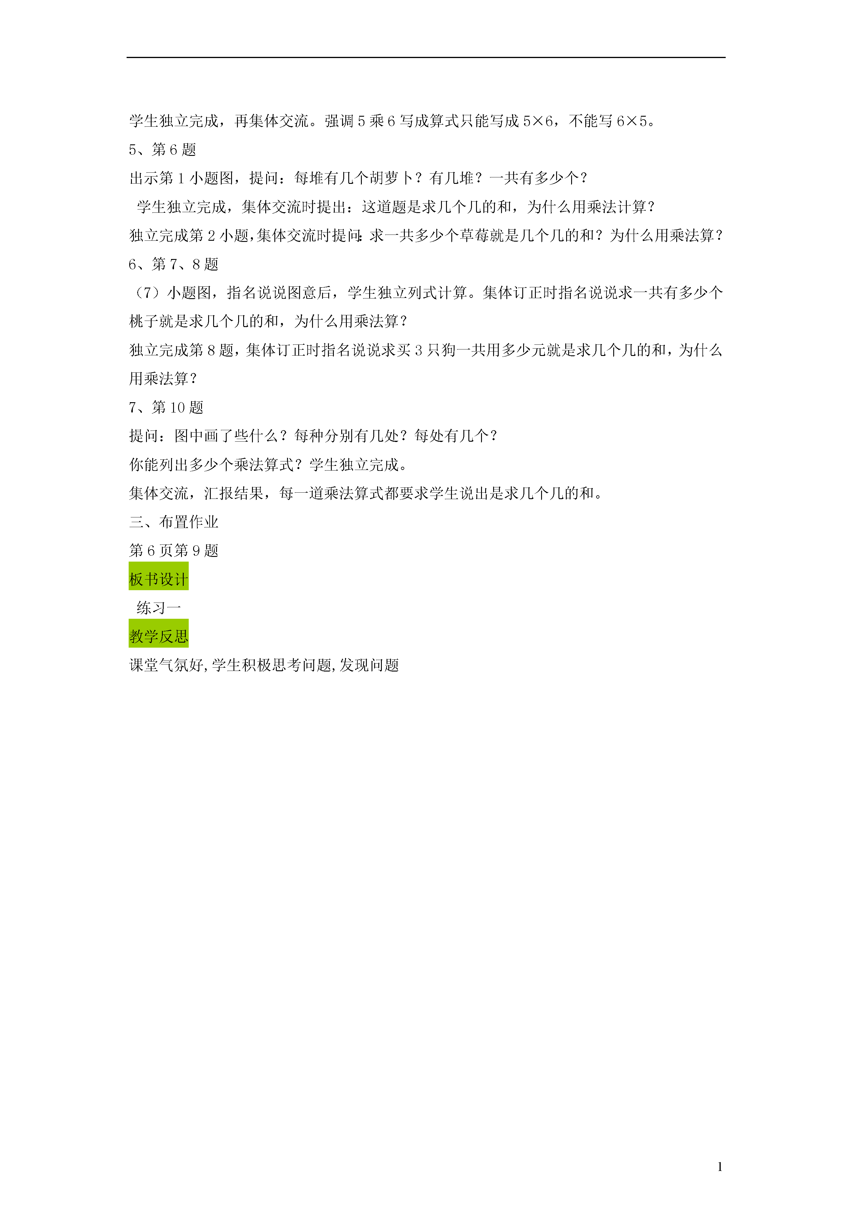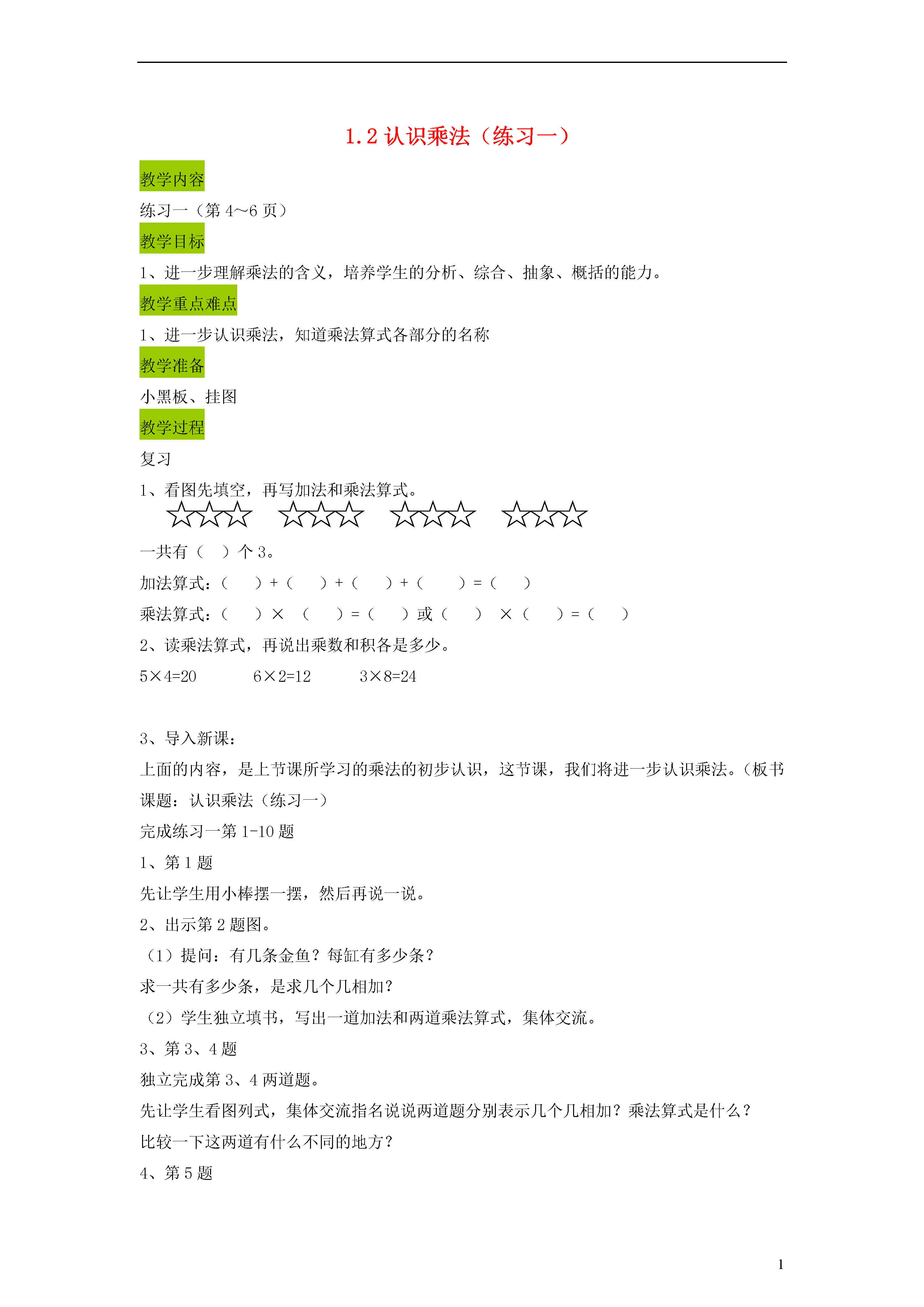 11.2认识乘法(练习一)教学内容练习一(第4~6页)教学目标1、进一步理解乘法的含义,培养学生的分析、综合、抽象、概括的能力。教学重点难点1、进一步认识乘法,知道乘法算式各部分的名称教学准备小黑板、挂图教学过程复习1、看图先填空,再写加法和乘法算式。一共有()个3。加法算式:()+()+()+()=()乘法算式:()×()=()或()×()=()2、读乘法算式,再说出乘数和积各是多少。5×4=206×2=123×8=243、导入新课:上面的内容,是上节课所学习的乘法的初步认识,这节课,我们将进一步认识乘法。(板书课题:认识乘法(练习一)完成练习一第1-10题1、第1题先让学生用小棒摆一摆,然后再说一说。2、出示第2题图。(1)提问:有几条金鱼?每缸有多少条?求一共有多少条,是求几个几相加?(2)学生独立填书,写出一道加法和两道乘法算式,集体交流。3、第3、4题独立完成第3、4两道题。先让学生看图列式,集体交流指名说说两道题分别表示几个几相加?乘法算式是什么?比较一下这两道有什么不同的地方?4、第5题学生独立完成,再集体交流。强调5乘6写成算式只能写成5×6,不能写6×5。5、第6题出示第1小题图,提问:每堆有几个胡萝卜?有几堆?一共有多少个?学生独立完成,集体交流时提出:这道题是求几个几的和,为什么用乘法计算?独立完成第2小题,集体交流时提问:求一共多少个草莓就是几个几的和?为什么用乘法算?6、第7、8题(7)小题图,指名说说图意后,学生独立列式计算。集体订正时指名说说求一共有多少个桃子就是求几个几的和,为什么用乘法算?独立完成第8题,集体订正时指名说说求买3只狗一共用多少元就是求几个几的和,为什么用乘法算?7、第10题提问:图中画了些什么?每种分别有几处?每处有几个?你能列出多少个乘法算式?学生独立完成。集体交流,汇报结果,每一道乘法算式都要求学生说出是求几个几的和。三、布置作业第9题板书设计练习一教学反思课堂气氛好,学生积极思考问题,发现问题
