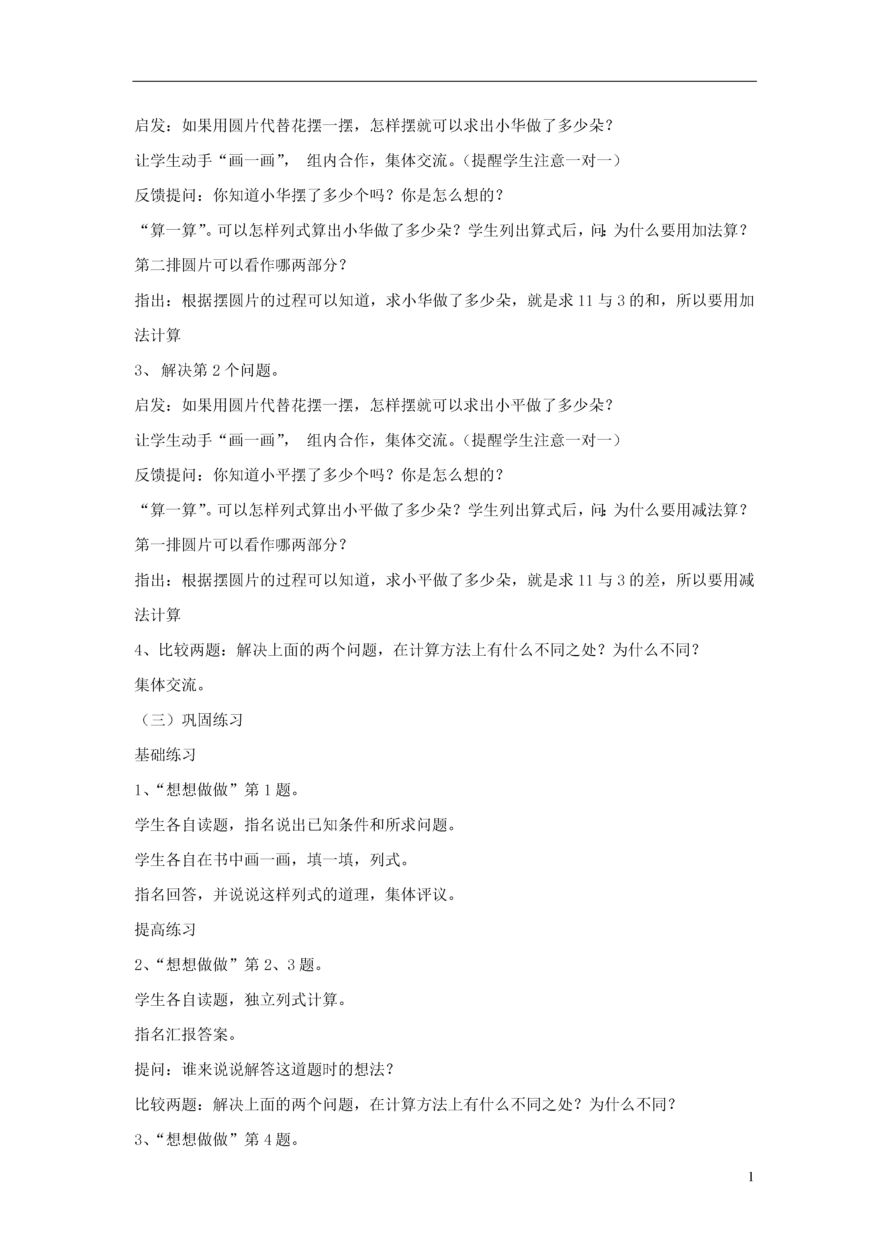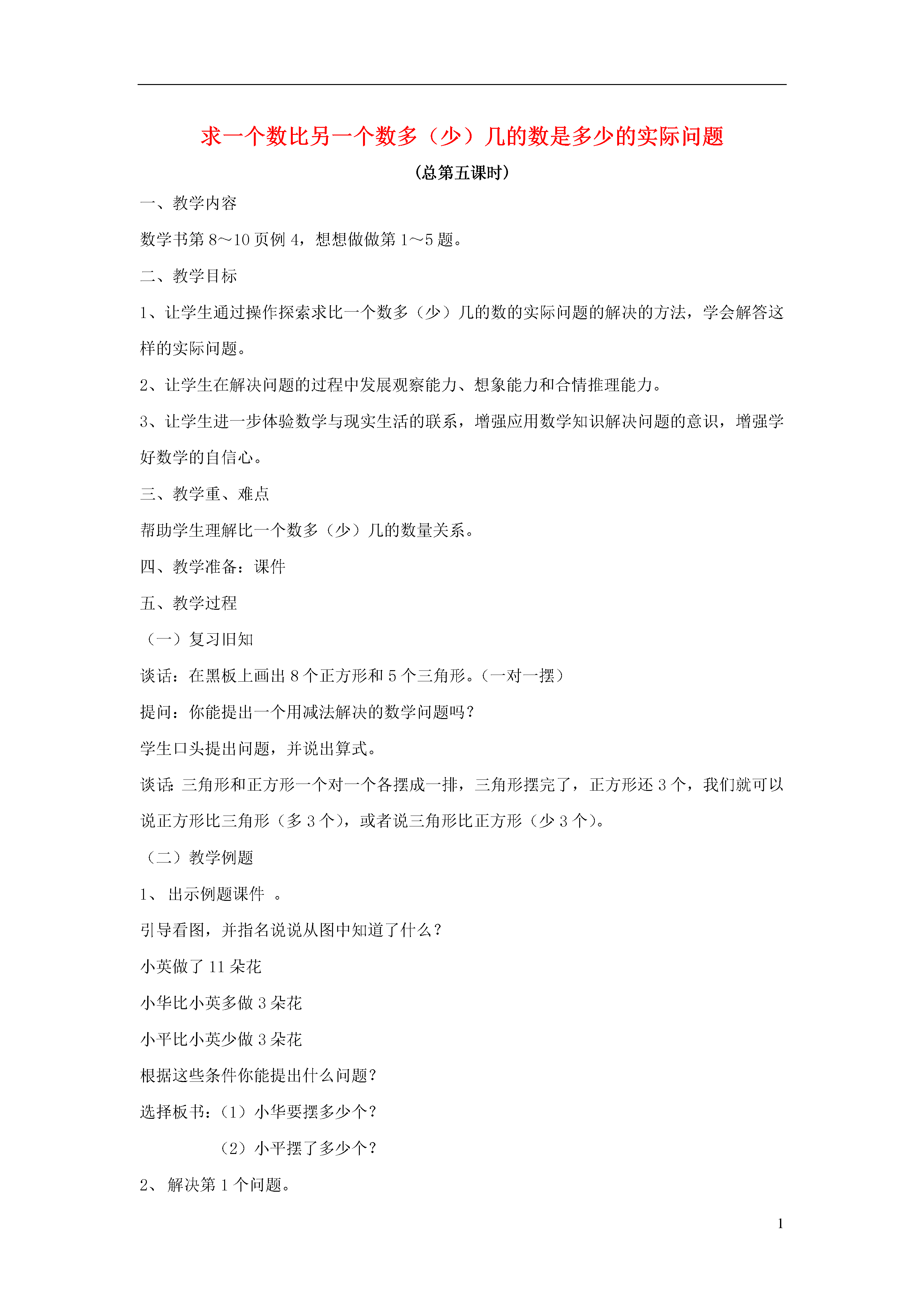 1求一个数比另一个数多(少)几的数是多少的实际问题(总第五课时)一、教学内容数学书第8~10页例4,想想做做第1~5题。二、教学目标1、让学生通过操作探索求比一个数多(少)几的数的实际问题的解决的方法,学会解答这样的实际问题。2、让学生在解决问题的过程中发展观察能力、想象能力和合情推理能力。3、让学生进一步体验数学与现实生活的联系,增强应用数学知识解决问题的意识,增强学好数学的自信心。三、教学重、难点帮助学生理解比一个数多(少)几的数量关系。四、教学准备:课件五、教学过程(一)复习旧知谈话:在黑板上画出8个正方形和5个三角形。(一对一摆)提问:你能提出一个用减法解决的数学问题吗?学生口头提出问题,并说出算式。谈话:三角形和正方形一个对一个各摆成一排,三角形摆完了,正方形还3个,我们就可以说正方形比三角形(多3个),或者说三角形比正方形(少3个)。(二)教学例题出示例题课件。引导看图,并指名说说从图中知道了什么?小英做了11朵花小华比小英多做3朵花小平比小英少做3朵花根据这些条件你能提出什么问题?选择板书:(1)小华要摆多少个?(2)小平摆了多少个?解决第1个问题。启发:如果用圆片代替花摆一摆,怎样摆就可以求出小华做了多少朵?让学生动手“画一画”,组内合作,集体交流。(提醒学生注意一对一)反馈提问:你知道小华摆了多少个吗?你是怎么想的?“算一算”。可以怎样列式算出小华做了多少朵?学生列出算式后,问:为什么要用加法算?第二排圆片可以看作哪两部分?指出:根据摆圆片的过程可以知道,求小华做了多少朵,就是求11与3的和,所以要用加法计算解决第2个问题。启发:如果用圆片代替花摆一摆,怎样摆就可以求出小平做了多少朵?让学生动手“画一画”,组内合作,集体交流。(提醒学生注意一对一)反馈提问:你知道小平摆了多少个吗?你是怎么想的?“算一算”。可以怎样列式算出小平做了多少朵?学生列出算式后,问:为什么要用减法算?第一排圆片可以看作哪两部分?指出:根据摆圆片的过程可以知道,求小平做了多少朵,就是求11与3的差,所以要用减法计算4、比较两题:解决上面的两个问题,在计算方法上有什么不同之处?为什么不同?集体交流。(三)巩固练习基础练习1、“想想做做”第1题。学生各自读题,指名说出已知条件和所求问题。学生各自在书中画一画,填一填,列式。指名回答,并说说这样列式的道理,集体评议。提高练习2、“想想做做”第2、3题。学生各自读题,独立列式计算。指名汇报答案。提问:谁来说说解答这道题时的想法?比较两题:解决上面的两个问题,在计算方法上有什么不同之处?为什么不同?3、“想想做做”第4题。拓展练习4、“想想做做”第5题。让学生读题审题,师帮助学生审查出多余条件。(四)全课总结谁来告诉小朋友们,今天学会了什么新的本领?六、作业设计:数补七、板书设计:求一个数比另一个数多(少)几的数是多少的实际问题。八、教学反思: