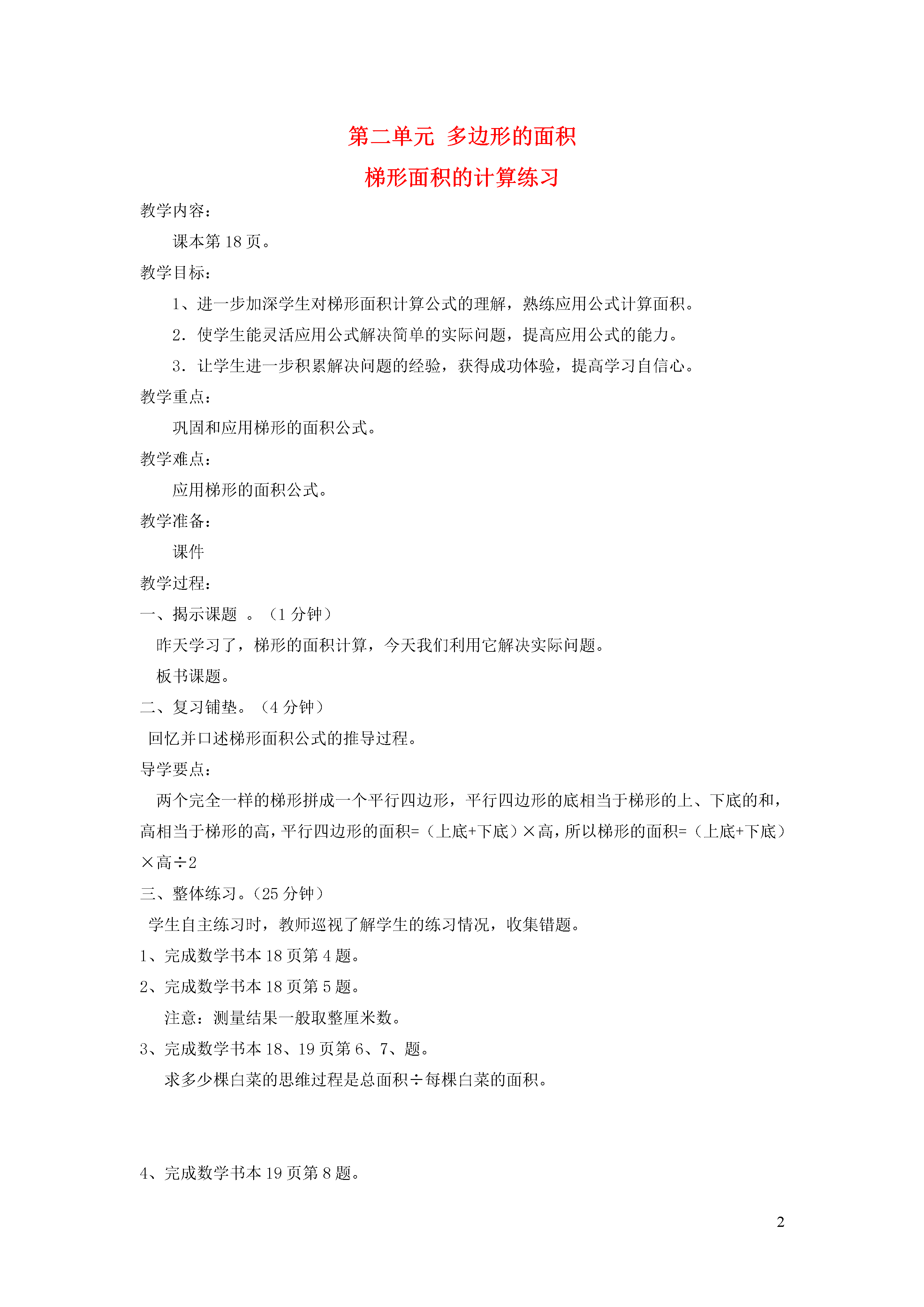 2第二单元多边形的面积梯形面积的计算练习教学内容:课本。教学目标:1、进一步加深学生对梯形面积计算公式的理解,熟练应用公式计算面积。2.使学生能灵活应用公式解决简单的实际问题,提高应用公式的能力。3.让学生进一步积累解决问题的经验,获得成功体验,提高学习自信心。教学重点:巩固和应用梯形的面积公式。教学难点:应用梯形的面积公式。教学准备:课件教学过程:一、揭示课题。(1分钟)昨天学习了,梯形的面积计算,今天我们利用它解决实际问题。板书课题。二、复习铺垫。(4分钟)回忆并口述梯形面积公式的推导过程。导学要点:两个完全一样的梯形拼成一个平行四边形,平行四边形的底相当于梯形的上、下底的和,高相当于梯形的高,平行四边形的面积=(上底+下底)×高,所以梯形的面积=(上底+下底)×高÷2三、整体练习。(25分钟)学生自主练习时,教师巡视了解学生的练习情况,收集错题。1、完成数学书本18页第4题。2、完成数学书本18页第5题。注意:测量结果一般取整厘米数。3、完成数学书本18、19页第6、7、题。求多少棵白菜的思维过程是总面积÷每棵白菜的面积。4、完成数学书本19页第8题。看看谁能想出两种方法解决。该模型尾翼是两个怎样的梯形组成的?可以先求一个梯形的面积再乘2,也可以直接求出这两个梯形拼成平行四边形的面积。5、完成数学书本19页第9题。你是如何知道三角形的底是多少的?四、课堂总结通过这节课的学习,你学到了什么知识呢?教学反思: