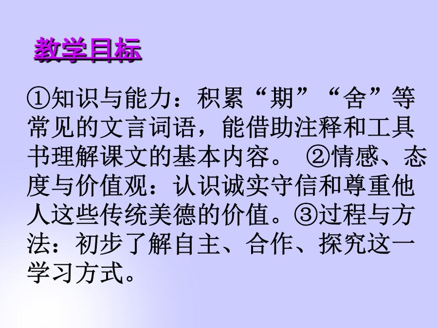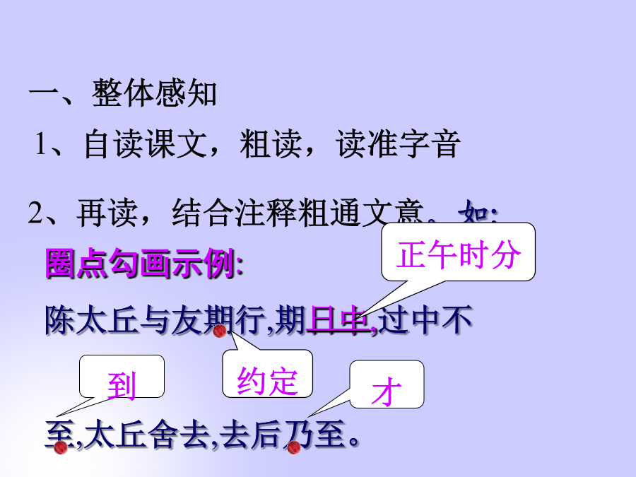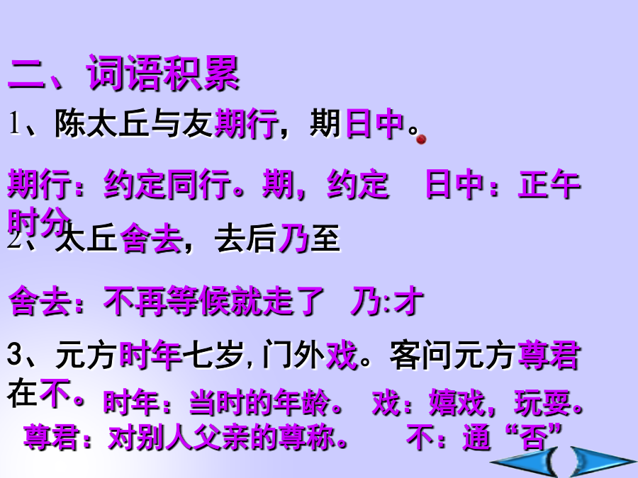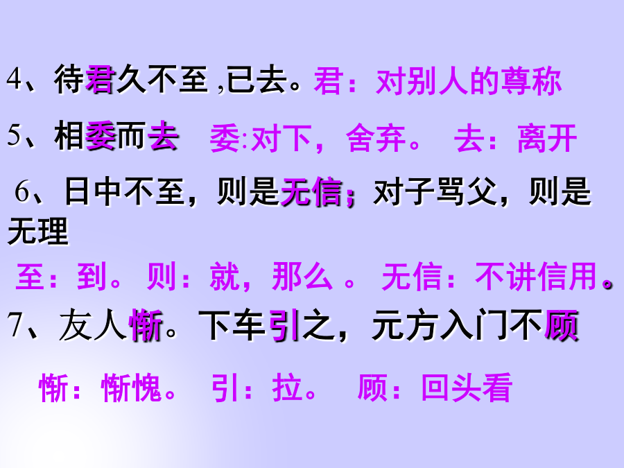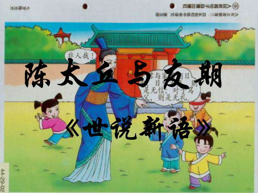 陈太丘与友期《世说新语》教学目标一、整体感知4、待君久不至,已去。5、相委而去6、日中不至,则是无信;对子骂父,则是无理7、友人惭。下车引之,元方入门不顾三、阅读探究陈太丘“期日中,过中不至”,陈太丘的朋友反怒责陈太丘,说明朋友是怎样的人?、陈太丘是县令,“友”为什么敢骂他?2.元方面对父亲朋友的粗野语言,针锋相对地指出他的“无信”“无礼”,这说明元方是个怎样的人?3.有人认为客人已经认错,元方就应该原谅他,而他居然“入门不顾”,弄得客人尴尬之极,无地自容,这的确有些失礼。你是否同意这个看法?4.有人认为,陈太丘的朋友也有可取之处,你同意这个看法吗?5.友人为什么能够哑口无言、赔礼道歉?这则故事给了我们什么启发?想一想说一说——与初一学生共勉