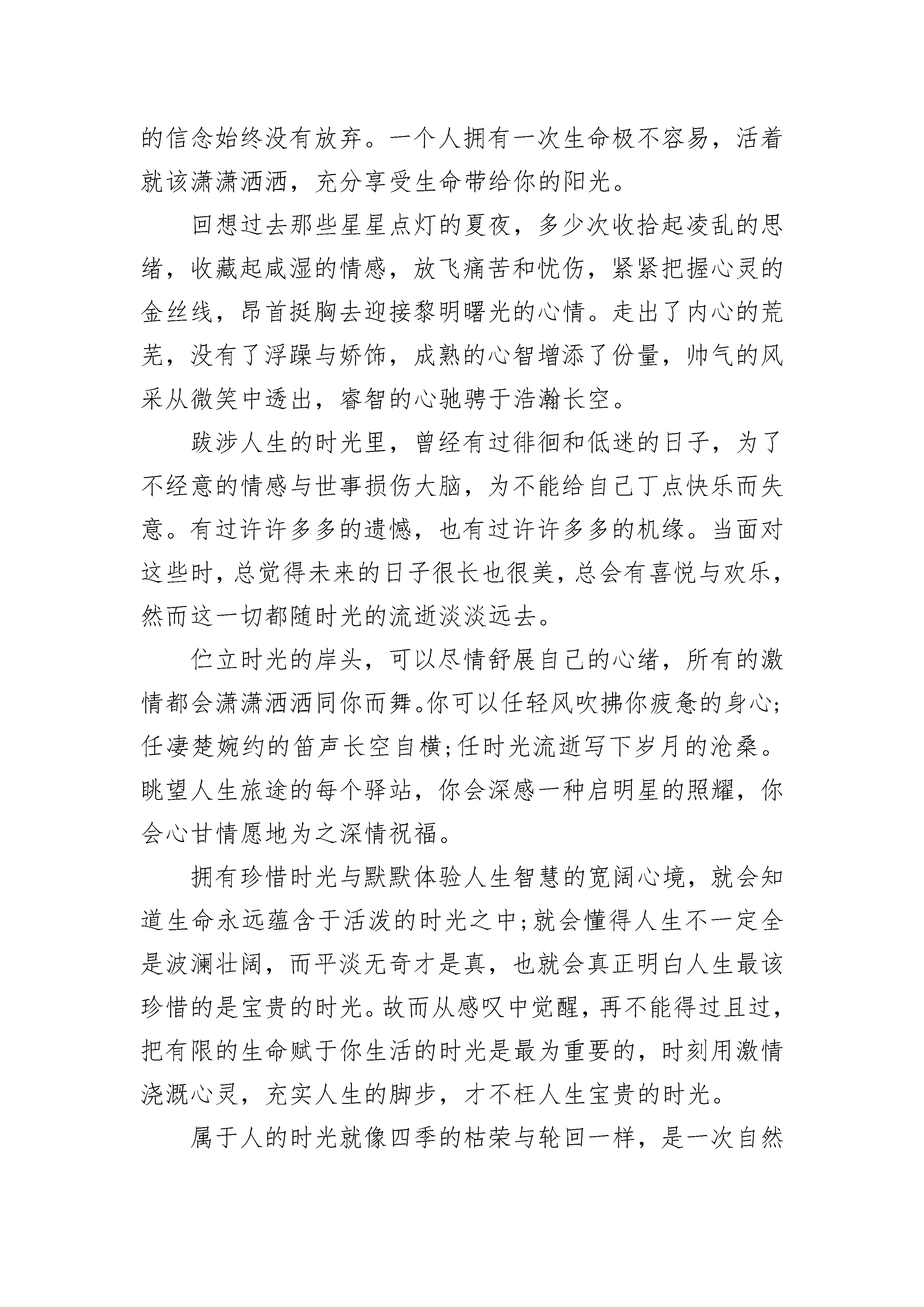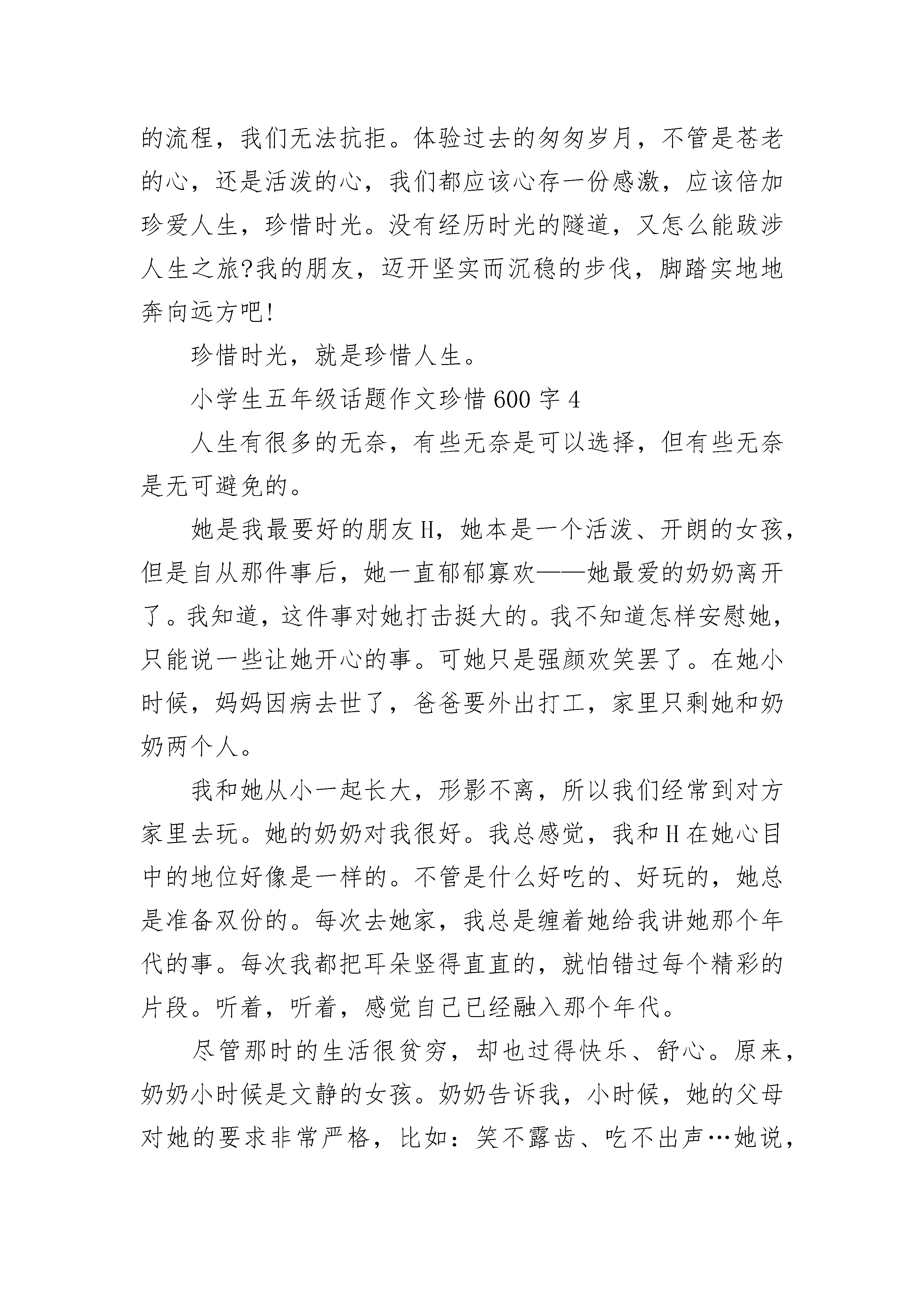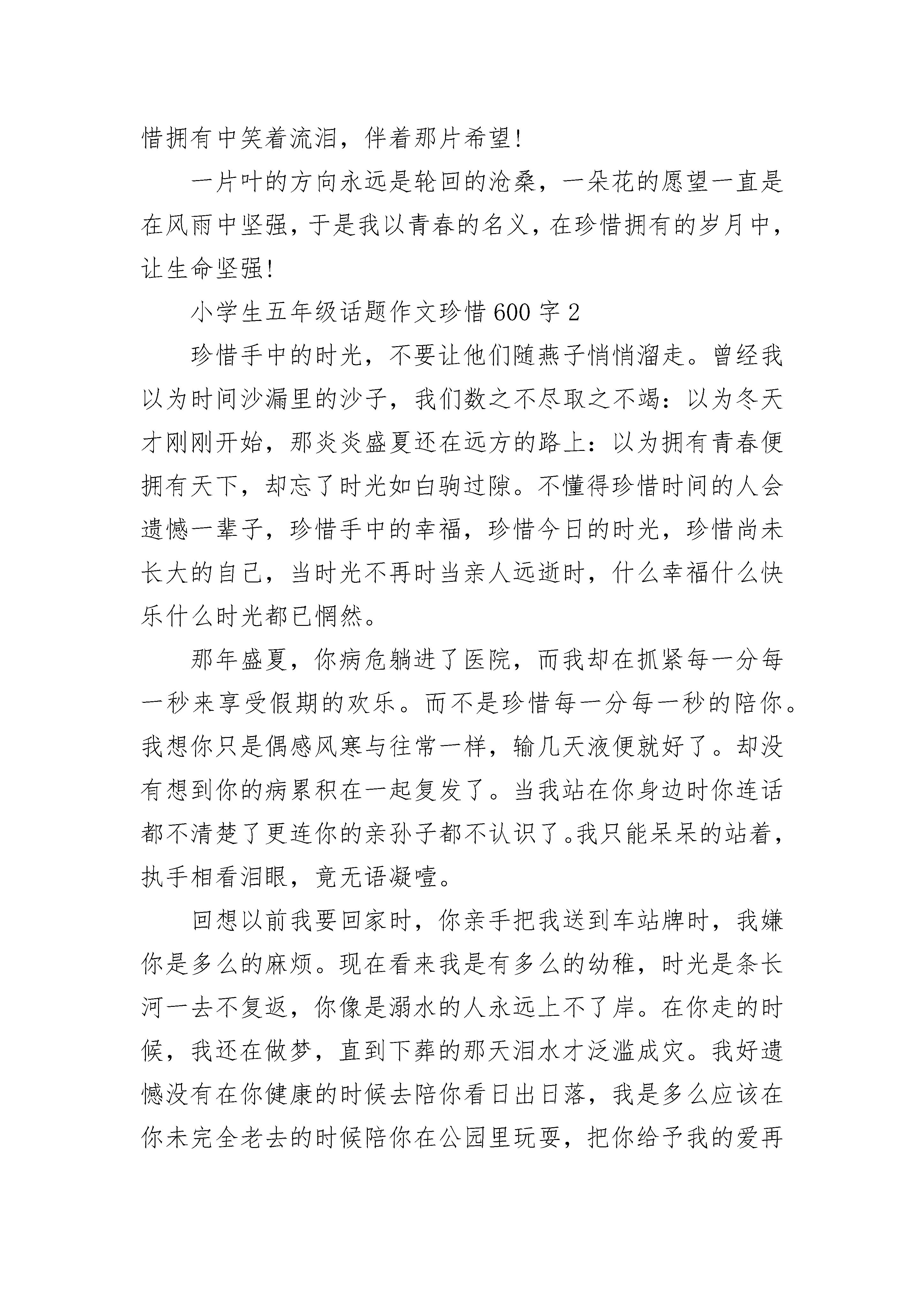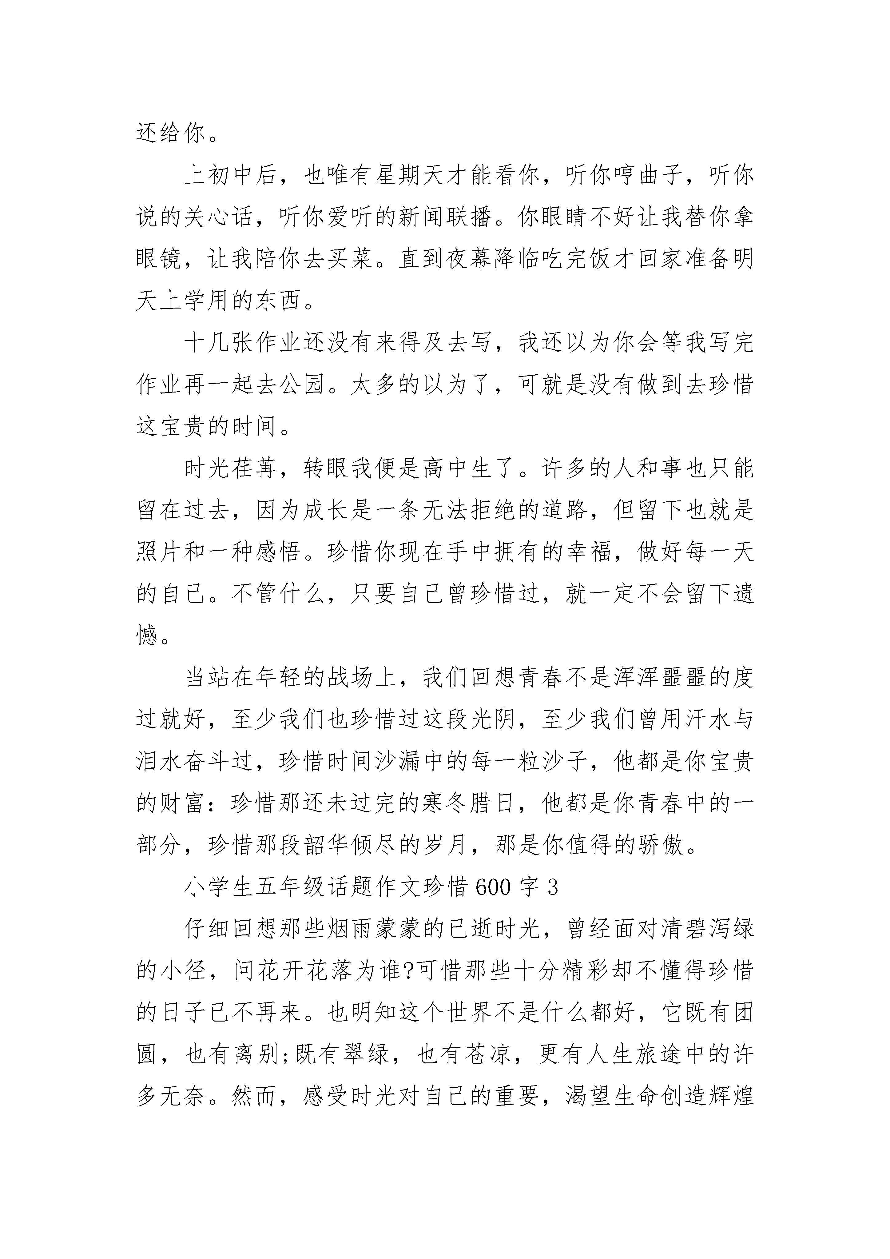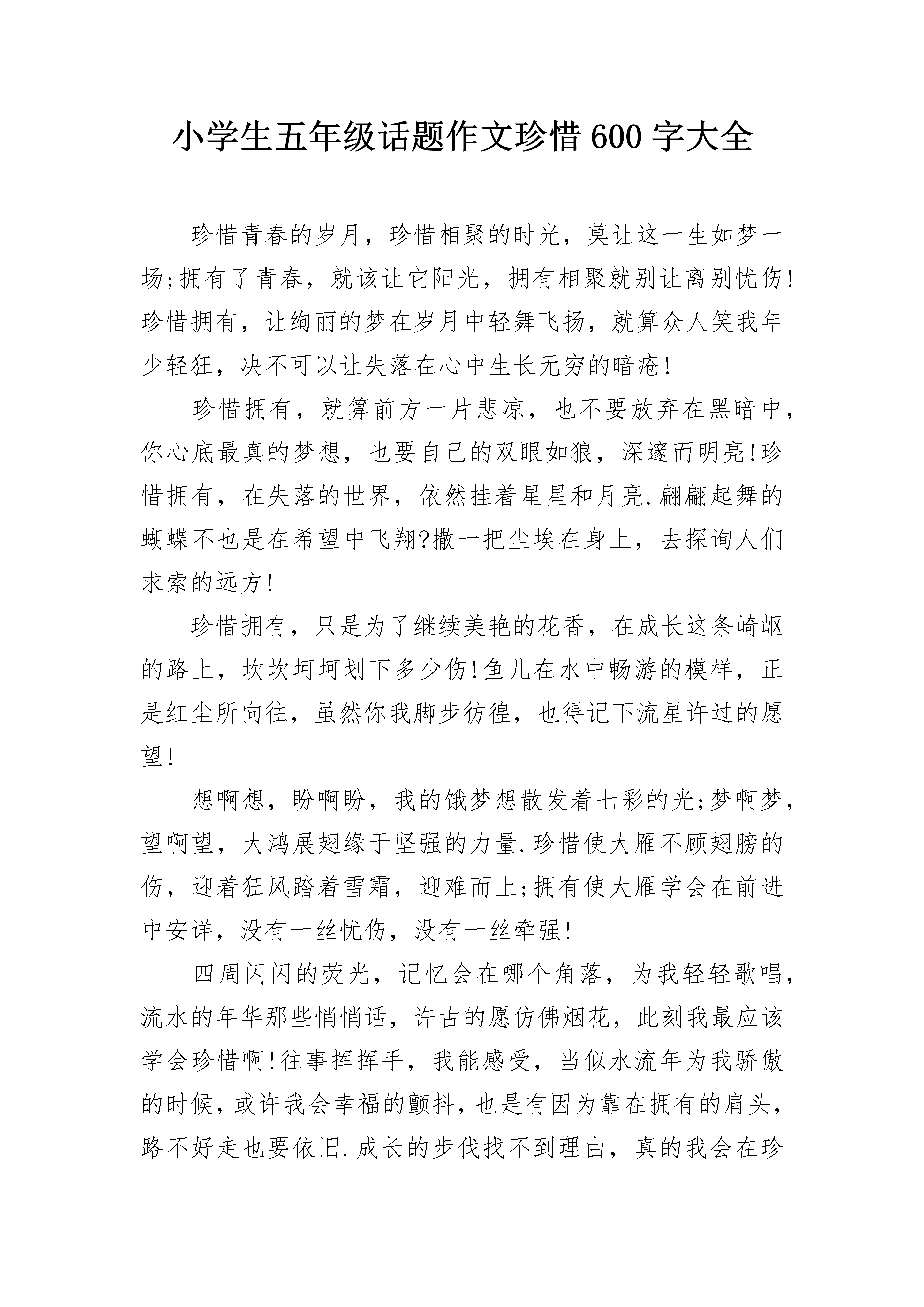 小学生五年级话题作文珍惜600字大全珍惜青春的岁月,珍惜相聚的时光,莫让这一生如梦一场;拥有了青春,就该让它阳光,拥有相聚就别让离别忧伤!珍惜拥有,让绚丽的梦在岁月中轻舞飞扬,就算众人笑我年少轻狂,决不可以让失落在心中生长无穷的暗疮!珍惜拥有,就算前方一片悲凉,也不要放弃在黑暗中,你心底最真的梦想,也要自己的双眼如狼,深邃而明亮!珍惜拥有,在失落的世界,依然挂着星星和月亮.翩翩起舞的蝴蝶不也是在希望中飞翔?撒一把尘埃在身上,去探询人们求索的远方!珍惜拥有,只是为了继续美艳的花香,在成长这条崎岖的路上,坎坎坷坷划下多少伤!鱼儿在水中畅游的模样,正是红尘所向往,虽然你我脚步彷徨,也得记下流星许过的愿望!想啊想,盼啊盼,我的饿梦想散发着七彩的光;梦啊梦,望啊望,大鸿展翅缘于坚强的力量.珍惜使大雁不顾翅膀的伤,迎着狂风踏着雪霜,迎难而上;拥有使大雁学会在前进中安详,没有一丝忧伤,没有一丝牵强!四周闪闪的荧光,记忆会在哪个角落,为我轻轻歌唱,流水的年华那些悄悄话,许古的愿仿佛烟花,此刻我最应该学会珍惜啊!往事挥挥手,我能感受,当似水流年为我骄傲的时候,或许我会幸福的颤抖,也是有因为靠在拥有的肩头,路不好走也要依旧.成长的步伐找不到理由,真的我会在珍惜拥有中笑着流泪,伴着那片希望!一片叶的方向永远是轮回的沧桑,一朵花的愿望一直是在风雨中坚强,于是我以青春的名义,在珍惜拥有的岁月中,让生命坚强!小学生五年级话题作文珍惜600字2珍惜手中的时光,不要让他们随燕子悄悄溜走。曾经我以为时间沙漏里的沙子,我们数之不尽取之不竭:以为冬天才刚刚开始,那炎炎盛夏还在远方的路上:以为拥有青春便拥有天下,却忘了时光如白驹过隙。不懂得珍惜时间的人会遗憾一辈子,珍惜手中的幸福,珍惜今日的时光,珍惜尚未长大的自己,当时光不再时当亲人远逝时,什么幸福什么快乐什么时光都已惘然。那年盛夏,你病危躺进了医院,而我却在抓紧每一分每一秒来享受假期的欢乐。而不是珍惜每一分每一秒的陪你。我想你只是偶感风寒与往常一样,输几天液便就好了。却没有想到你的病累积在一起复发了。当我站在你身边时你连话都不清楚了更连你的亲孙子都不认识了。我只能呆呆的站着,执手相看泪眼,竟无语凝噎。回想以前我要回家时,你亲手把我送到车站牌时,我嫌你是多么的麻烦。现在看来我是有多么的幼稚,时光是条长河一去不复返,你像是溺水的人永远上不了岸。在你走的时候,我还在做梦,直到下葬的那天泪水才泛滥成灾。我好遗憾没有在你健康的时候去陪你看日出日落,我是多么应该在你未完全老去的时候陪你在公园里玩耍,把你给予我的爱再还给你。上初中后,也唯有星期天才能看你,听你哼曲子,听你说的关心话,听你爱听的新闻联播。你眼睛不好让我替你拿眼镜,让我陪你去买菜。直到夜幕降临吃完饭才回家准备明天上学用的东西。十几张作业还没有来得及去写,我还以为你会等我写完作业再一起去公园。太多的以为了,可就是没有做到去珍惜这宝贵的时间。时光荏苒,转眼我便是高中生了。许多的人和事也只能留在过去,因为成长是一条无法拒绝的道路,但留下也就是照片和一种感悟。珍惜你现在手中拥有的幸福,做好每一天的自己。不管什么,只要自己曾珍惜过,就一定不会留下遗憾。当站在年轻的战场上,我们回想青春不是浑浑噩噩的度过就好,至少我们也珍惜过这段光阴,至少我们曾用汗水与泪水奋斗过,珍惜时间沙漏中的每一粒沙子,他都是你宝贵的财富:珍惜那还未过完的寒冬腊日,他都是你青春中的一部分,珍惜那段韶华倾尽的岁月,那是你值得的骄傲。小学生五年级话题作文珍惜600字3仔细回想那些烟雨蒙蒙的已逝时光,曾经面对清碧泻绿的小径,问花开花落为谁?可惜那些十分精彩却不懂得珍惜的日子已不再来。也明知这个世界不是什么都好,它既有团圆,也有离别;既有翠绿,也有苍凉,更有人生旅途中的许多无奈。然而,感受时光对自己的重要,渴望生命创造辉煌的信念始终没有放弃。一个人拥有一次生命极不容易,活着就该潇潇洒洒,充分享受生命带给你的阳光。回想过去那些星星点灯的夏夜,多少次收拾起凌乱的思绪,收藏起咸湿的情感,放飞痛苦和忧伤,紧紧把握心灵的金丝线,昂首挺胸去迎接黎明曙光的心情。走出了内心的荒芜,没有了浮躁与娇饰,成熟的心智增添了份量,帅气的风采从微笑中透出,睿智的心驰骋于浩瀚长空。跋涉人生的时光里,曾经有过徘徊和低迷的日子,为了不经意的情感与世事损伤大脑,为不能给自己丁点快乐而失意。有过许许多多的遗憾,也有过许许多多的机缘。当面对这些时,总觉得未来的日子很长也很美,总会有喜悦与欢乐,然而这一切都随时光的流逝淡淡远去。伫立时光的岸头,可以尽情舒展自己的心绪,所有的激情都会潇潇洒洒同你而舞。你可以任轻风吹拂你疲惫的身心;任凄楚婉约的笛声长空自横;任时光流逝写下岁月的沧桑。眺望人生旅途的每个驿站,你会深感一种启明星的照耀,你会心甘情愿地为之深情