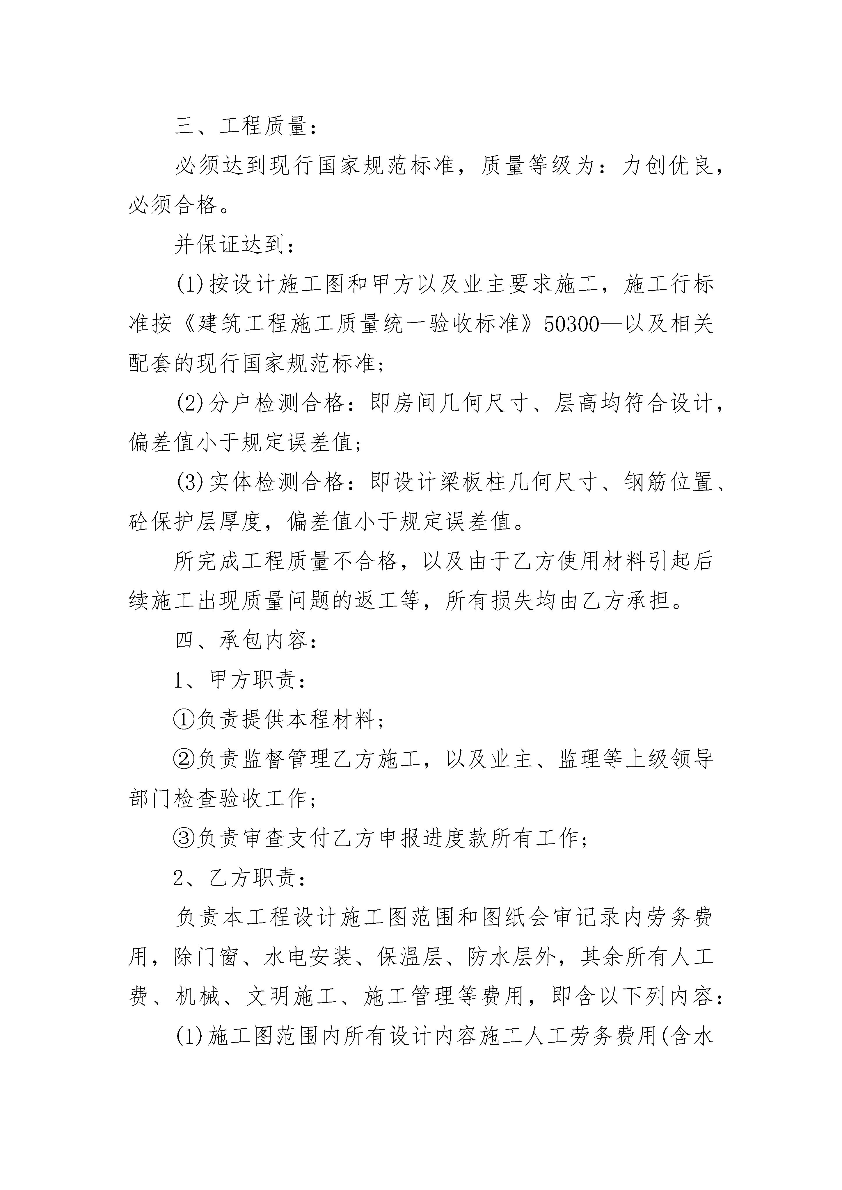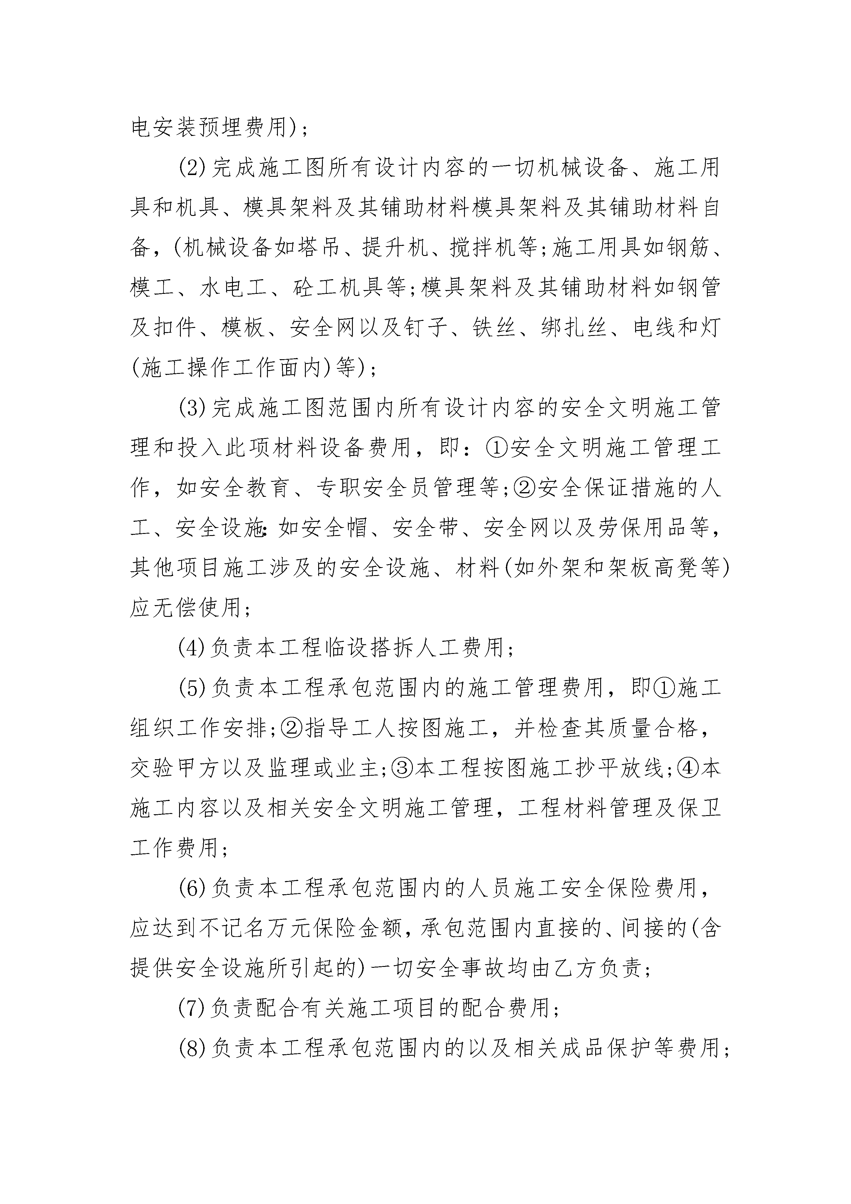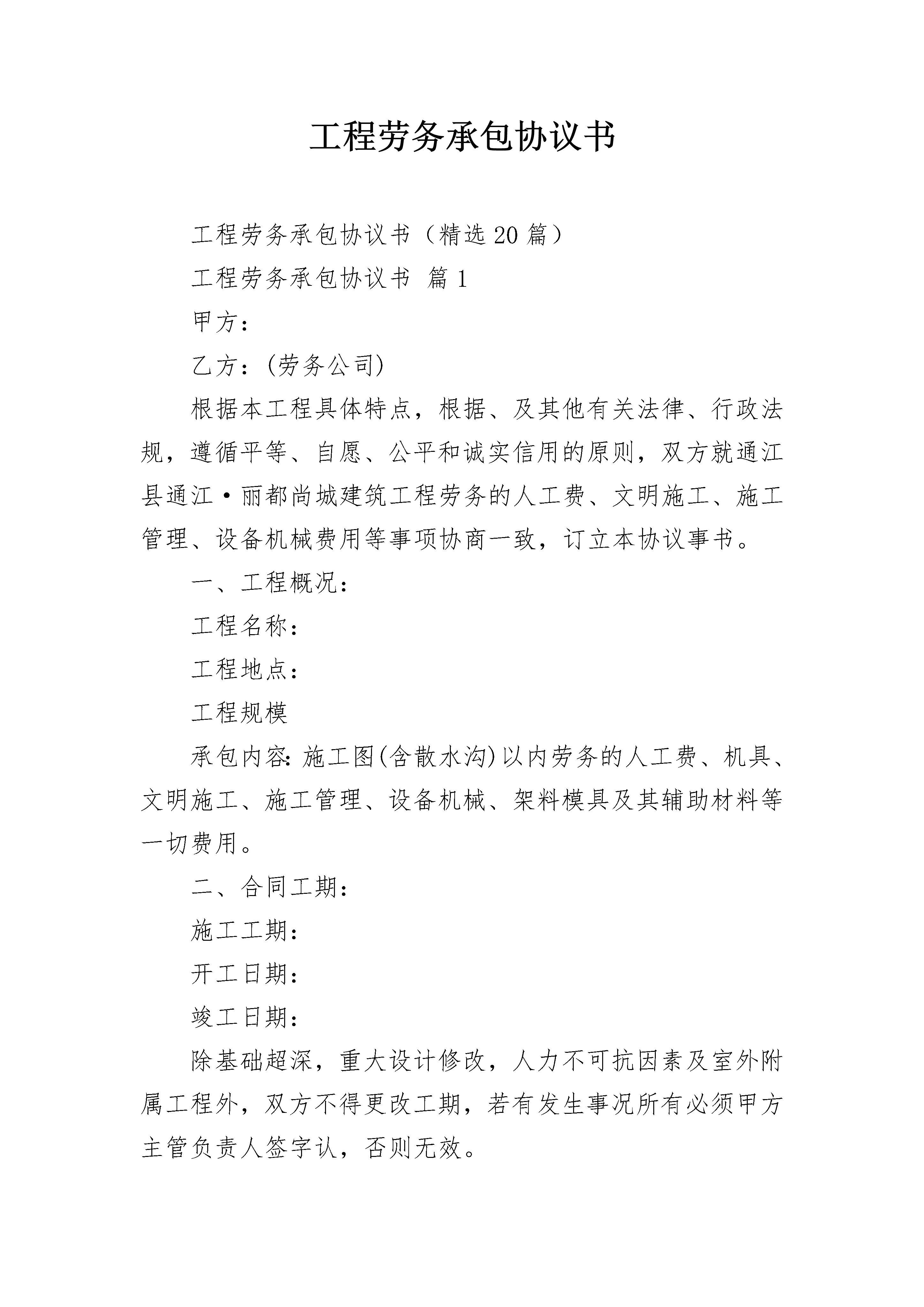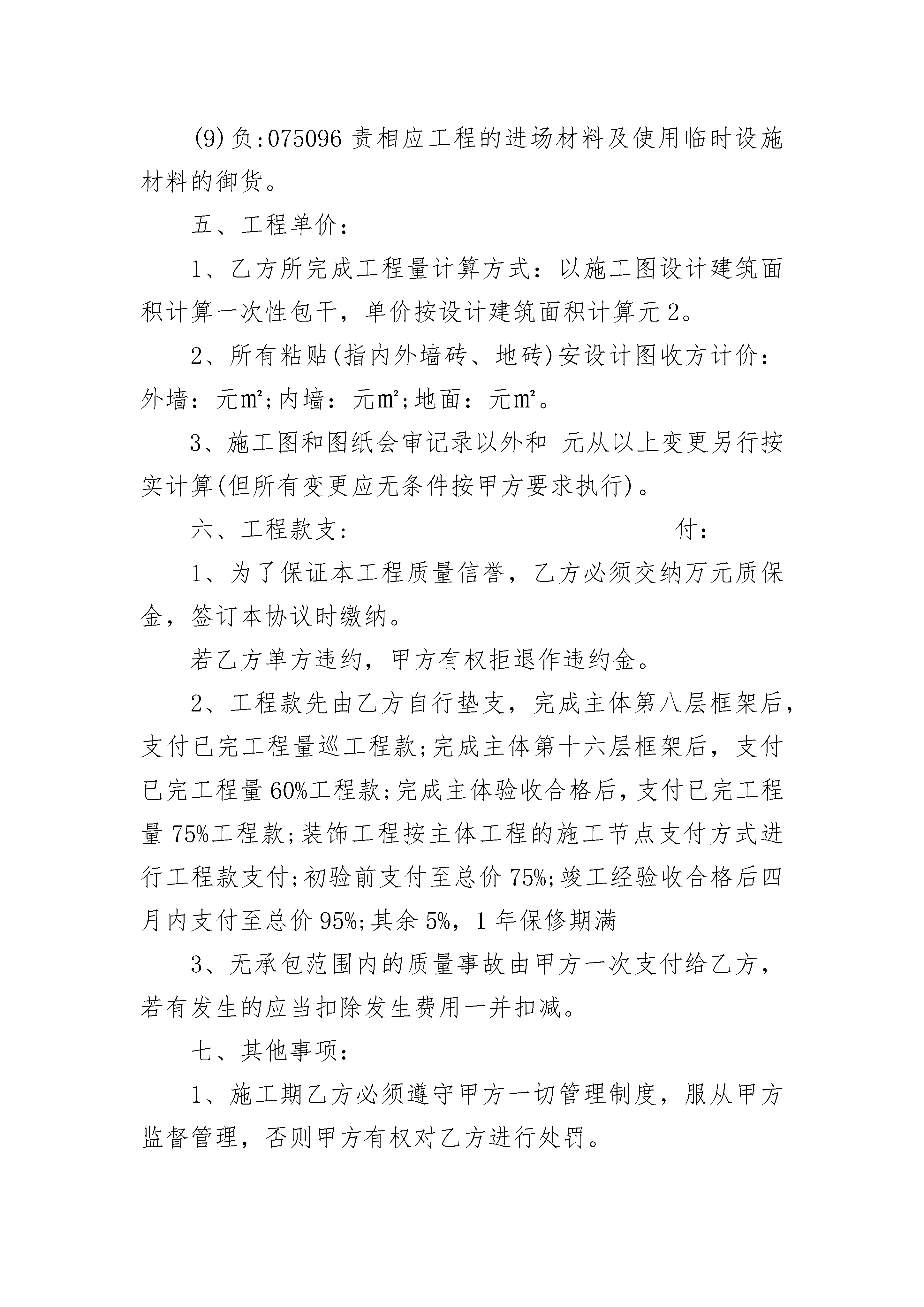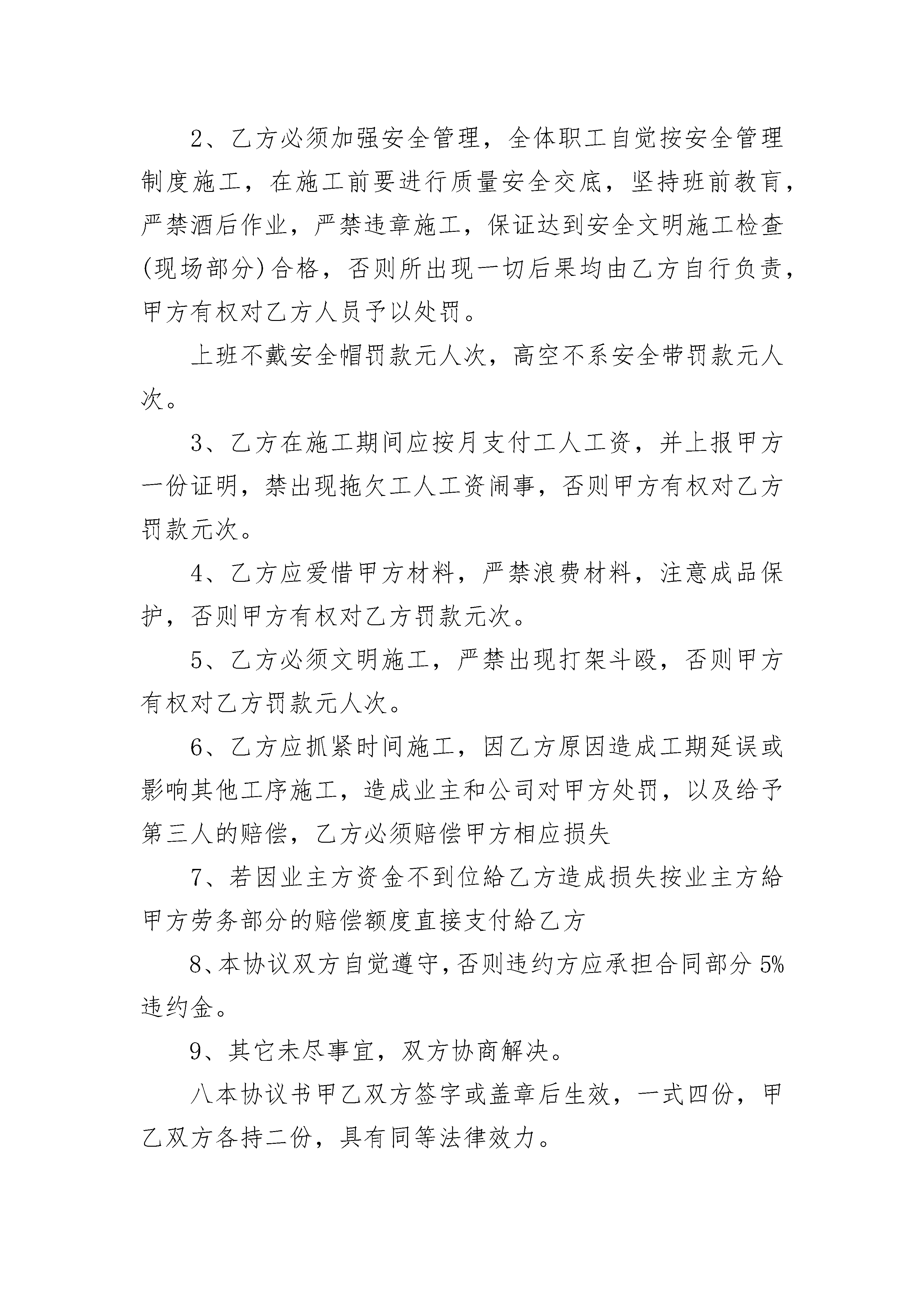工程劳务承包协议书工程劳务承包协议书(精选20篇)工程劳务承包协议书篇1甲方:乙方:(劳务公司)根据本工程具体特点,根据、及其他有关法律、行政法规,遵循平等、自愿、公平和诚实信用的原则,双方就通江县通江·丽都尚城建筑工程劳务的人工费、文明施工、施工管理、设备机械费用等事项协商一致,订立本协议事书。一、工程概况:工程名称:工程地点:工程规模承包内容:施工图(含散水沟)以内劳务的人工费、机具、文明施工、施工管理、设备机械、架料模具及其辅助材料等一切费用。二、合同工期:施工工期:开工日期:竣工日期:除基础超深,重大设计修改,人力不可抗因素及室外附属工程外,双方不得更改工期,若有发生事况所有必须甲方主管负责人签字认,否则无效。三、工程质量:必须达到现行国家规范标准,质量等级为:力创优良,必须合格。并保证达到:(1)按设计施工图和甲方以及业主要求施工,施工行标准按《建筑工程施工质量统一验收标准》50300—以及相关配套的现行国家规范标准;(2)分户检测合格:即房间几何尺寸、层高均符合设计,偏差值小于规定误差值;(3)实体检测合格:即设计梁板柱几何尺寸、钢筋位置、砼保护层厚度,偏差值小于规定误差值。所完成工程质量不合格,以及由于乙方使用材料引起后续施工出现质量问题的返工等,所有损失均由乙方承担。四、承包内容:1、甲方职责:①负责提供本程材料;②负责监督管理乙方施工,以及业主、监理等上级领导部门检查验收工作;③负责审查支付乙方申报进度款所有工作;2、乙方职责:负责本工程设计施工图范围和图纸会审记录内劳务费用,除门窗、水电安装、保温层、防水层外,其余所有人工费、机械、文明施工、施工管理等费用,即含以下列内容:(1)施工图范围内所有设计内容施工人工劳务费用(含水电安装预埋费用);(2)完成施工图所有设计内容的一切机械设备、施工用具和机具、模具架料及其铺助材料模具架料及其铺助材料自备,(机械设备如塔吊、提升机、搅拌机等;施工用具如钢筋、模工、水电工、砼工机具等;模具架料及其铺助材料如钢管及扣件、模板、安全网以及钉子、铁丝、绑扎丝、电线和灯(施工操作工作面内)等);(3)完成施工图范围内所有设计内容的安全文明施工管理和投入此项材料设备费用,即:①安全文明施工管理工作,如安全教育、专职安全员管理等;②安全保证措施的人工、安全设施:如安全帽、安全带、安全网以及劳保用品等,其他项目施工涉及的安全设施、材料(如外架和架板高凳等)应无偿使用;(4)负责本工程临设搭拆人工费用;(5)负责本工程承包范围内的施工管理费用,即①施工组织工作安排;②指导工人按图施工,并检查其质量合格,交验甲方以及监理或业主;③本工程按图施工抄平放线;④本施工内容以及相关安全文明施工管理,工程材料管理及保卫工作费用;(6)负责本工程承包范围内的人员施工安全保险费用,应达到不记名万元保险金额,承包范围内直接的、间接的(含提供安全设施所引起的)一切安全事故均由乙方负责;(7)负责配合有关施工项目的配合费用;(8)负责本工程承包范围内的以及相关成品保护等费用;(9)负:075096责相应工程的进场材料及使用临时设施材料的御货。五、工程单价:1、乙方所完成工程量计算方式:以施工图设计建筑面积计算一次性包干,单价按设计建筑面积计算元2。2、所有粘贴(指内外墙砖、地砖)安设计图收方计价:外墙:元㎡;内墙:元㎡;地面:元㎡。3、施工图和图纸会审记录以外和元从以上变更另行按实计算(但所有变更应无条件按甲方要求执行)。六、工程款支:付:1、为了保证本工程质量信誉,乙方必须交纳万元质保金,签订本协议时缴纳。若乙方单方违约,甲方有权拒退作违约金。2、工程款先由乙方自行垫支,完成主体第八层框架后,支付已完工程量巡工程款;完成主体第十六层框架后,支付已完工程量60%工程款;完成主体验收合格后,支付已完工程量75%工程款;装饰工程按主体工程的施工节点支付方式进行工程款支付;初验前支付至总价75%;竣工经验收合格后四月内支付至总价95%;其余5%,1年保修期满3、无承包范围内的质量事故由甲方一次支付给乙方,若有发生的应当扣除发生费用一并扣减。七、其他事项:1、施工期乙方必须遵守甲方一切管理制度,服从甲方监督管理,否则甲方有权对乙方进行处罚。2、乙方必须加强安全管理,全体职工自觉按安全管理制度施工,在施工前要进行质量安全交底,坚持班前教肓,严禁酒后作业,严禁违章施工,保证达到安全文明施工检查(现场部分)合格,否则所出现一切后果均由乙方自行负责,甲方有权对乙方人员予以处罚。上班不戴安全帽罚款元人次,高空不系安全带罚款元人次。3、乙方在施工期间应按月支付工人工资,并上报甲方一份证明,禁出现拖欠工人工资闹事,否则甲方有权对乙方罚款元次。4、乙方应爱惜甲方材料,严禁浪费材料,注意成品保护,否则