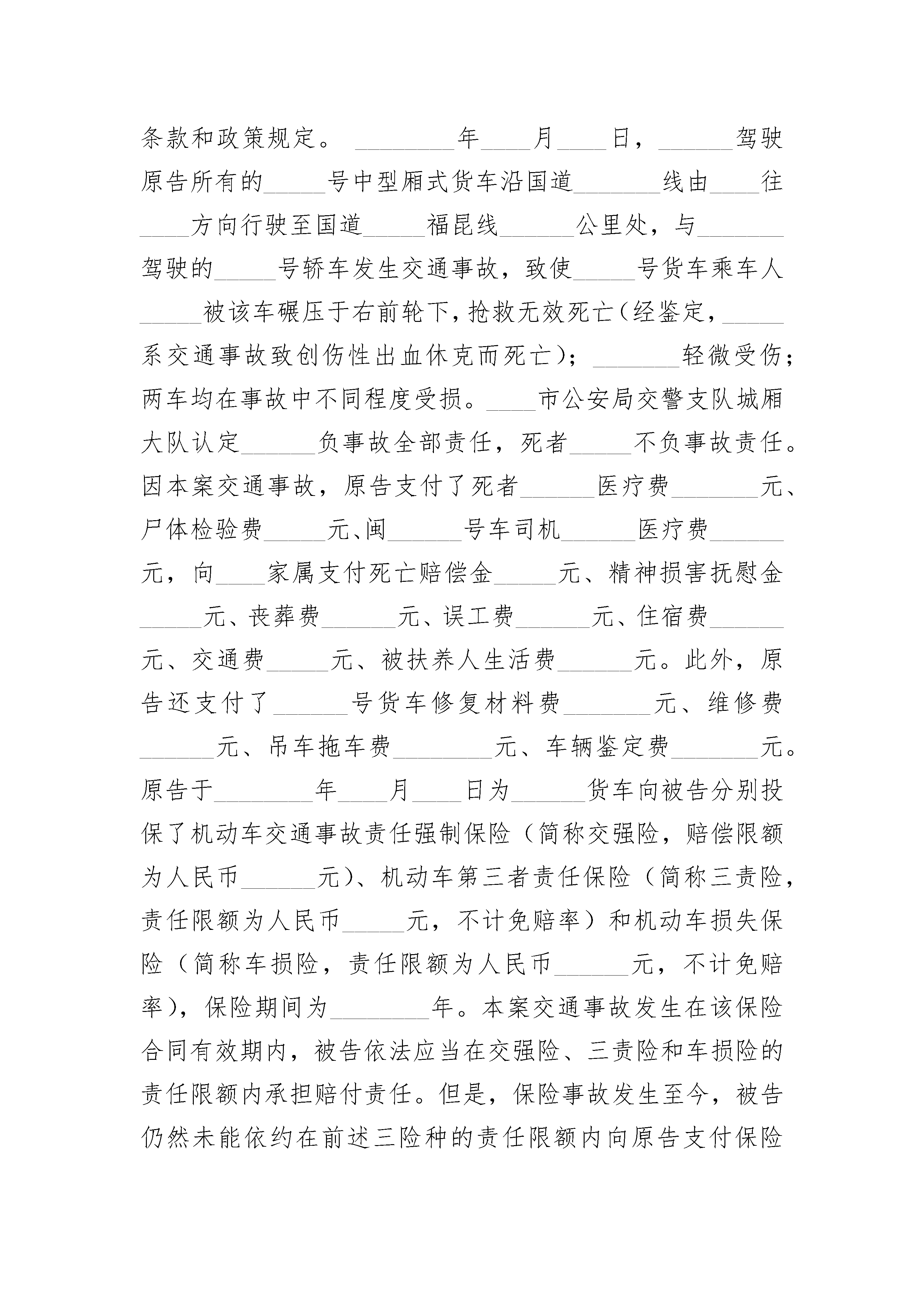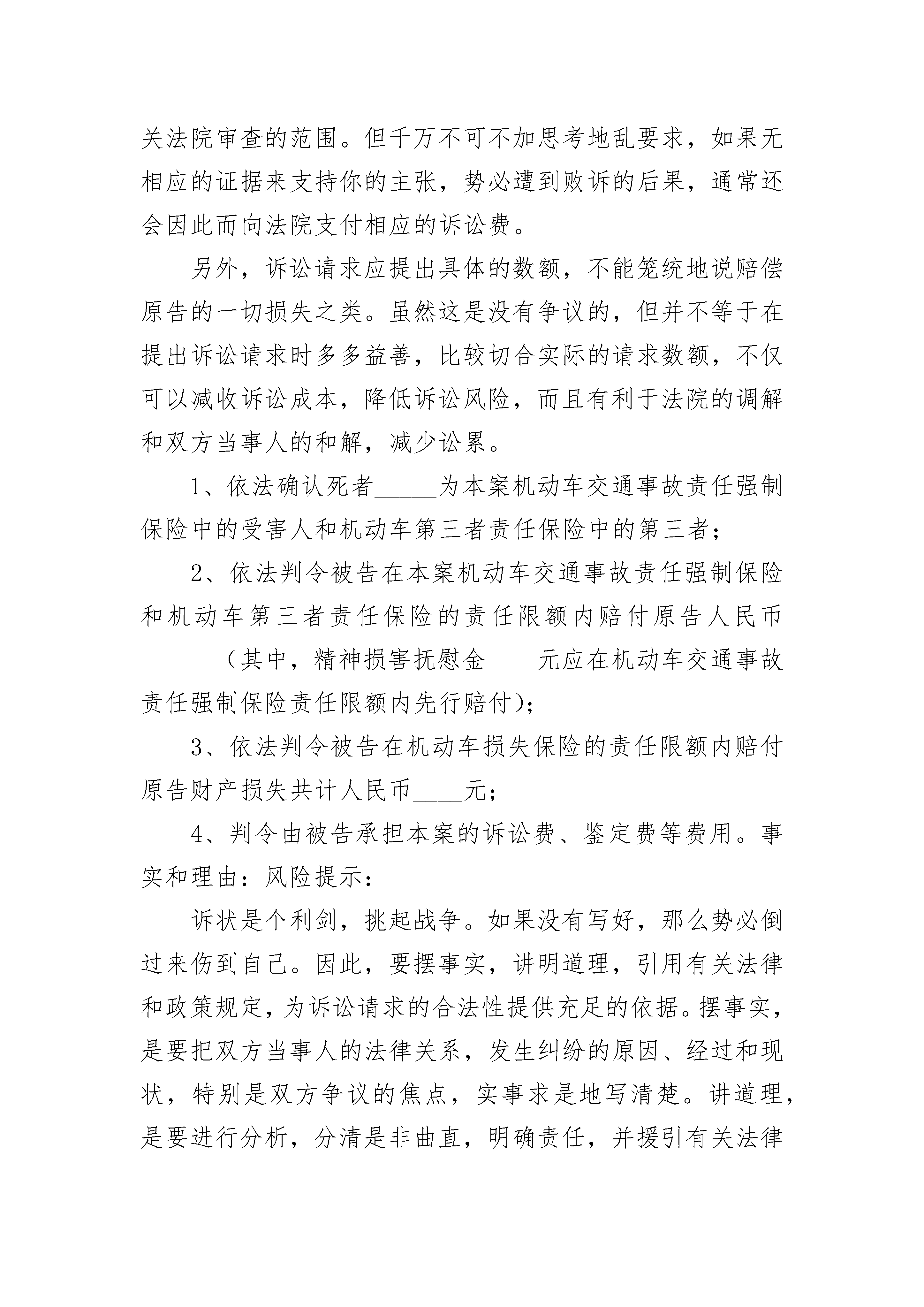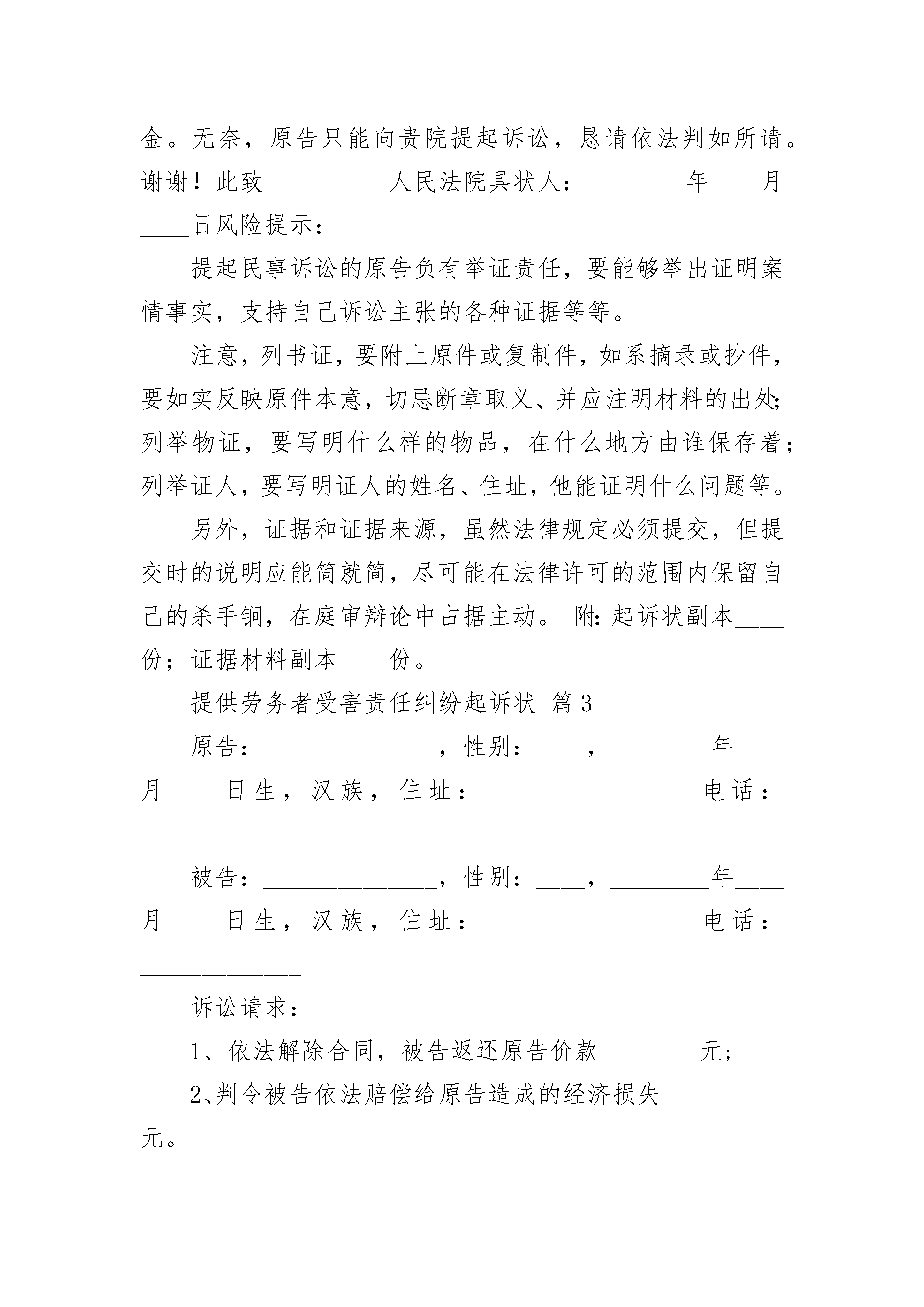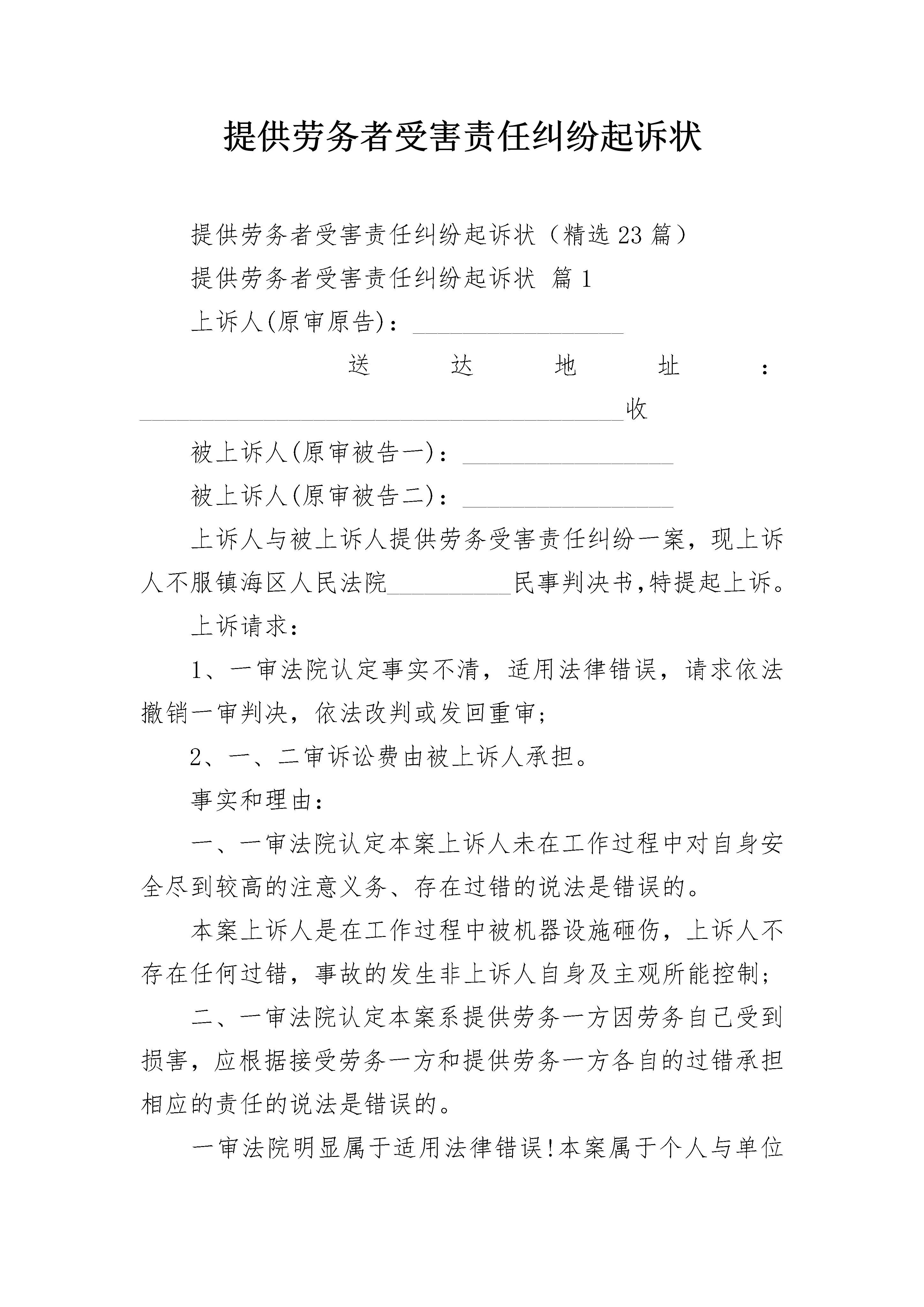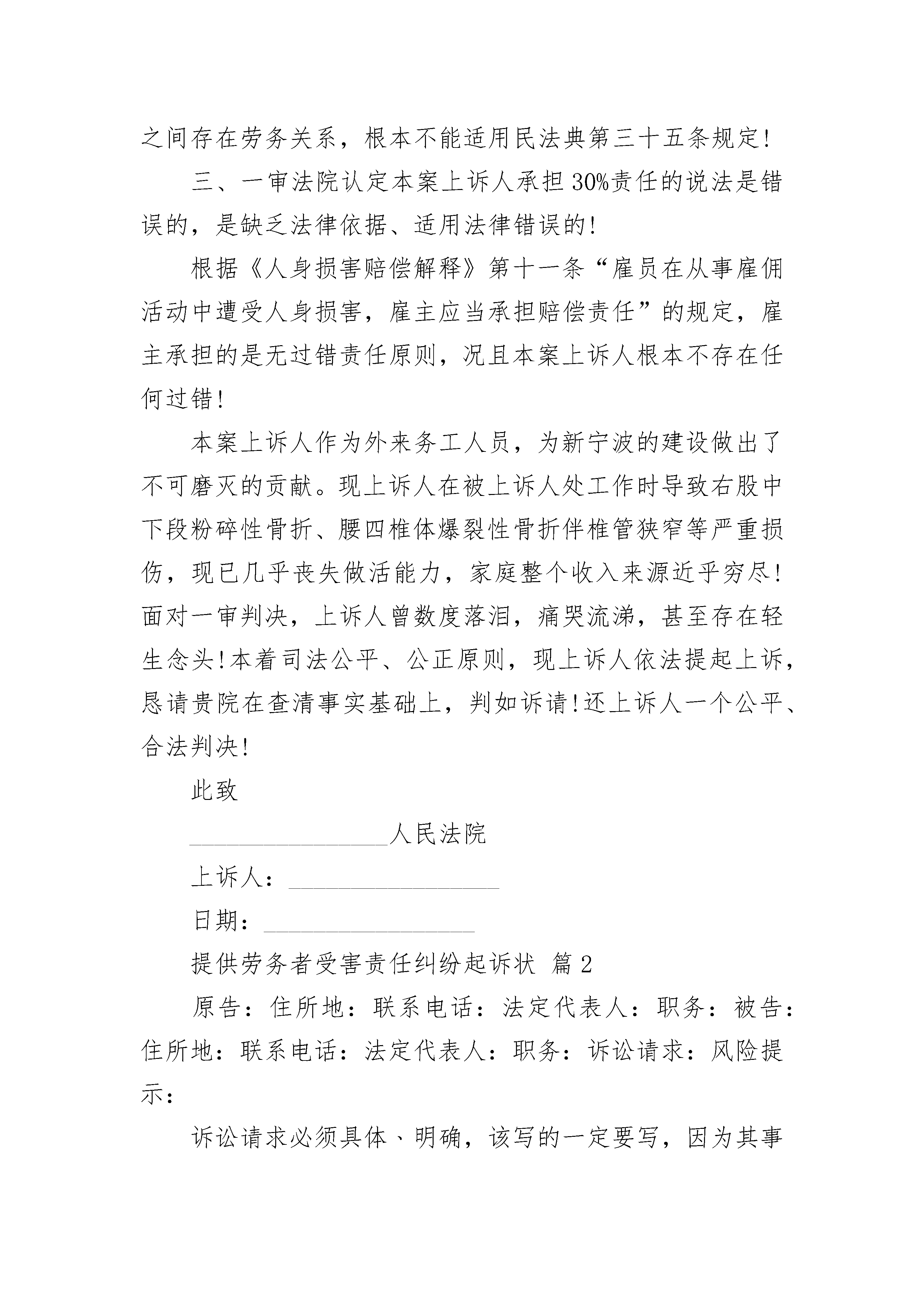 提供劳务者受害责任纠纷起诉状提供劳务者受害责任纠纷起诉状(精选23篇)提供劳务者受害责任纠纷起诉状篇1上诉人(原审原告):_________________送达地址:_______________________________________收被上诉人(原审被告一):_________________被上诉人(原审被告二):_________________上诉人与被上诉人提供劳务受害责任纠纷一案,现上诉人不服镇海区人民法院__________民事判决书,特提起上诉。上诉请求:1、一审法院认定事实不清,适用法律错误,请求依法撤销一审判决,依法改判或发回重审;2、一、二审诉讼费由被上诉人承担。事实和理由:一、一审法院认定本案上诉人未在工作过程中对自身安全尽到较高的注意义务、存在过错的说法是错误的。本案上诉人是在工作过程中被机器设施砸伤,上诉人不存在任何过错,事故的发生非上诉人自身及主观所能控制;二、一审法院认定本案系提供劳务一方因劳务自己受到损害,应根据接受劳务一方和提供劳务一方各自的过错承担相应的责任的说法是错误的。一审法院明显属于适用法律错误!本案属于个人与单位之间存在劳务关系,根本不能适用民法典第三十五条规定!三、一审法院认定本案上诉人承担30%责任的说法是错误的,是缺乏法律依据、适用法律错误的!根据《人身损害赔偿解释》第十一条“雇员在从事雇佣活动中遭受人身损害,雇主应当承担赔偿责任”的规定,雇主承担的是无过错责任原则,况且本案上诉人根本不存在任何过错!本案上诉人作为外来务工人员,为新宁波的建设做出了不可磨灭的贡献。现上诉人在被上诉人处工作时导致右股中下段粉碎性骨折、腰四椎体爆裂性骨折伴椎管狭窄等严重损伤,现已几乎丧失做活能力,家庭整个收入来源近乎穷尽!面对一审判决,上诉人曾数度落泪,痛哭流涕,甚至存在轻生念头!本着司法公平、公正原则,现上诉人依法提起上诉,恳请贵院在查清事实基础上,判如诉请!还上诉人一个公平、合法判决!此致________________人民法院上诉人:_________________日期:_________________提供劳务者受害责任纠纷起诉状篇2原告:住所地:联系电话:法定代表人:职务:被告:住所地:联系电话:法定代表人:职务:诉讼请求:风险提示:诉讼请求必须具体﹑明确,该写的一定要写,因为其事关法院审查的范围。但千万不可不加思考地乱要求,如果无相应的证据来支持你的主张,势必遭到败诉的后果,通常还会因此而向法院支付相应的诉讼费。另外,诉讼请求应提出具体的数额,不能笼统地说赔偿原告的一切损失之类。虽然这是没有争议的,但并不等于在提出诉讼请求时多多益善,比较切合实际的请求数额,不仅可以减收诉讼成本,降低诉讼风险,而且有利于法院的调解和双方当事人的和解,减少讼累。1、依法确认死者_____为本案机动车交通事故责任强制保险中的受害人和机动车第三者责任保险中的第三者;2、依法判令被告在本案机动车交通事故责任强制保险和机动车第三者责任保险的责任限额内赔付原告人民币______(其中,精神损害抚慰金____元应在机动车交通事故责任强制保险责任限额内先行赔付);3、依法判令被告在机动车损失保险的责任限额内赔付原告财产损失共计人民币____元;4、判令由被告承担本案的诉讼费、鉴定费等费用。事实和理由:风险提示:诉状是个利剑,挑起战争。如果没有写好,那么势必倒过来伤到自己。因此,要摆事实,讲明道理,引用有关法律和政策规定,为诉讼请求的合法性提供充足的依据。摆事实,是要把双方当事人的法律关系,发生纠纷的原因、经过和现状,特别是双方争议的焦点,实事求是地写清楚。讲道理,是要进行分析,分清是非曲直,明确责任,并援引有关法律条款和政策规定。________年____月____日,______驾驶原告所有的_____号中型厢式货车沿国道_______线由____往____方向行驶至国道_____福昆线______公里处,与_______驾驶的_____号轿车发生交通事故,致使_____号货车乘车人_____被该车碾压于右前轮下,抢救无效死亡(经鉴定,_____系交通事故致创伤性出血休克而死亡);_______轻微受伤;两车均在事故中不同程度受损。____市公安局交警支队城厢大队认定______负事故全部责任,死者_____不负事故责任。因本案交通事故,原告支付了死者______医疗费_______元、尸体检验费_____元、闽______号车司机______医疗费______元,向____家属支付死亡赔偿金_____元、精神损害抚慰金_____元、丧葬费______元、误工费______元、住宿费______元、交通费_____元、被扶养人生活费______元。此外,原告还支付了______号货车修复材料费_____