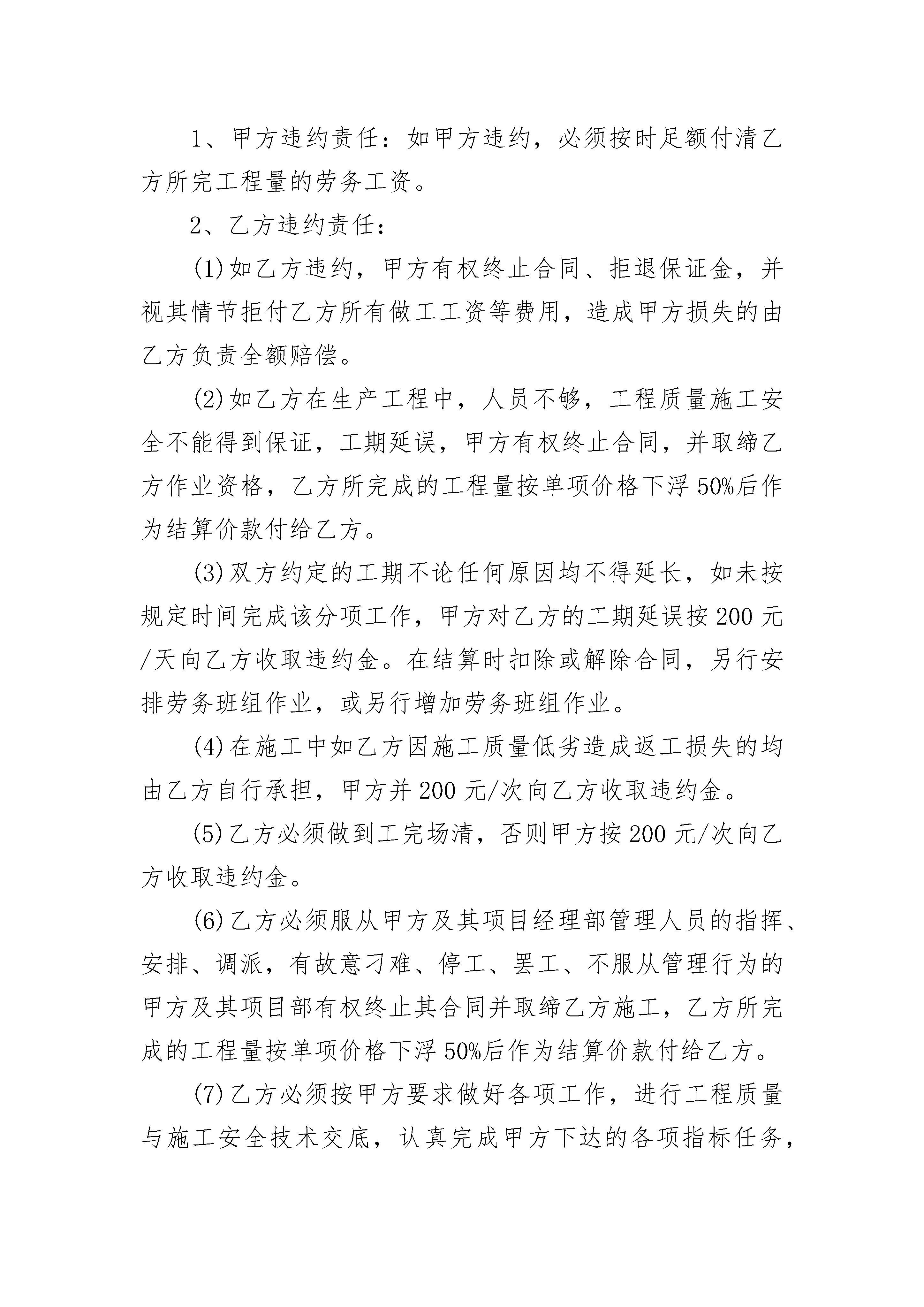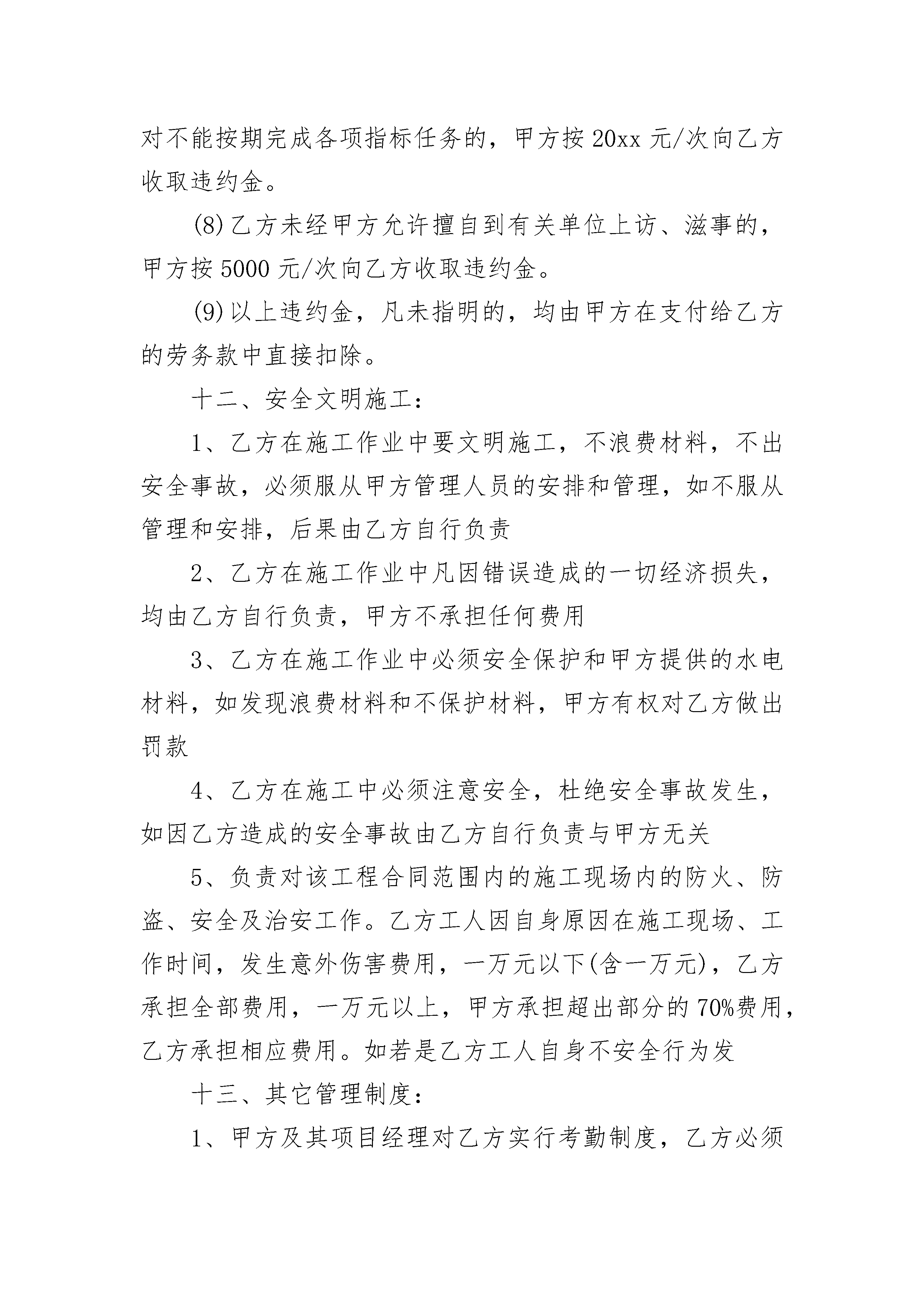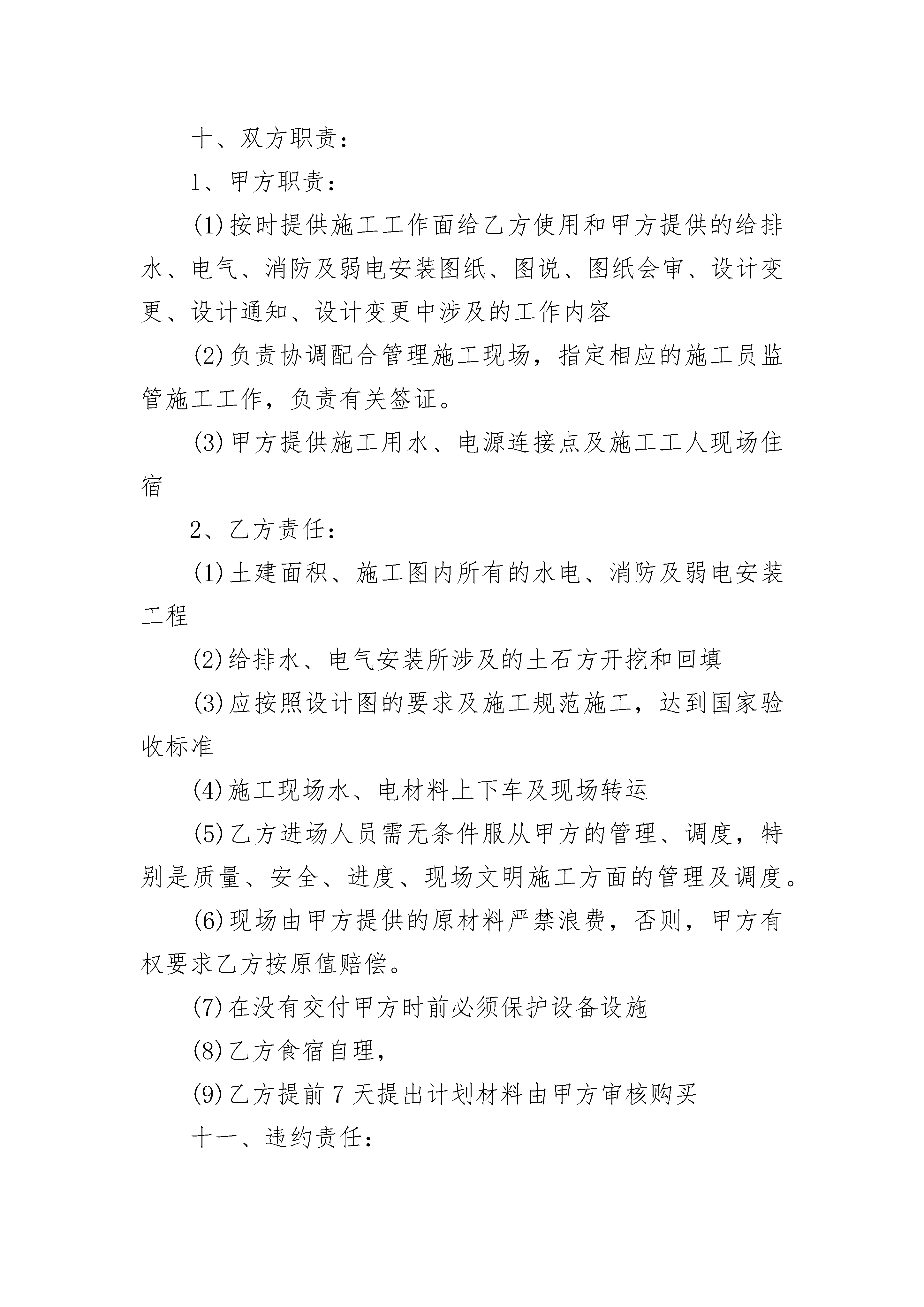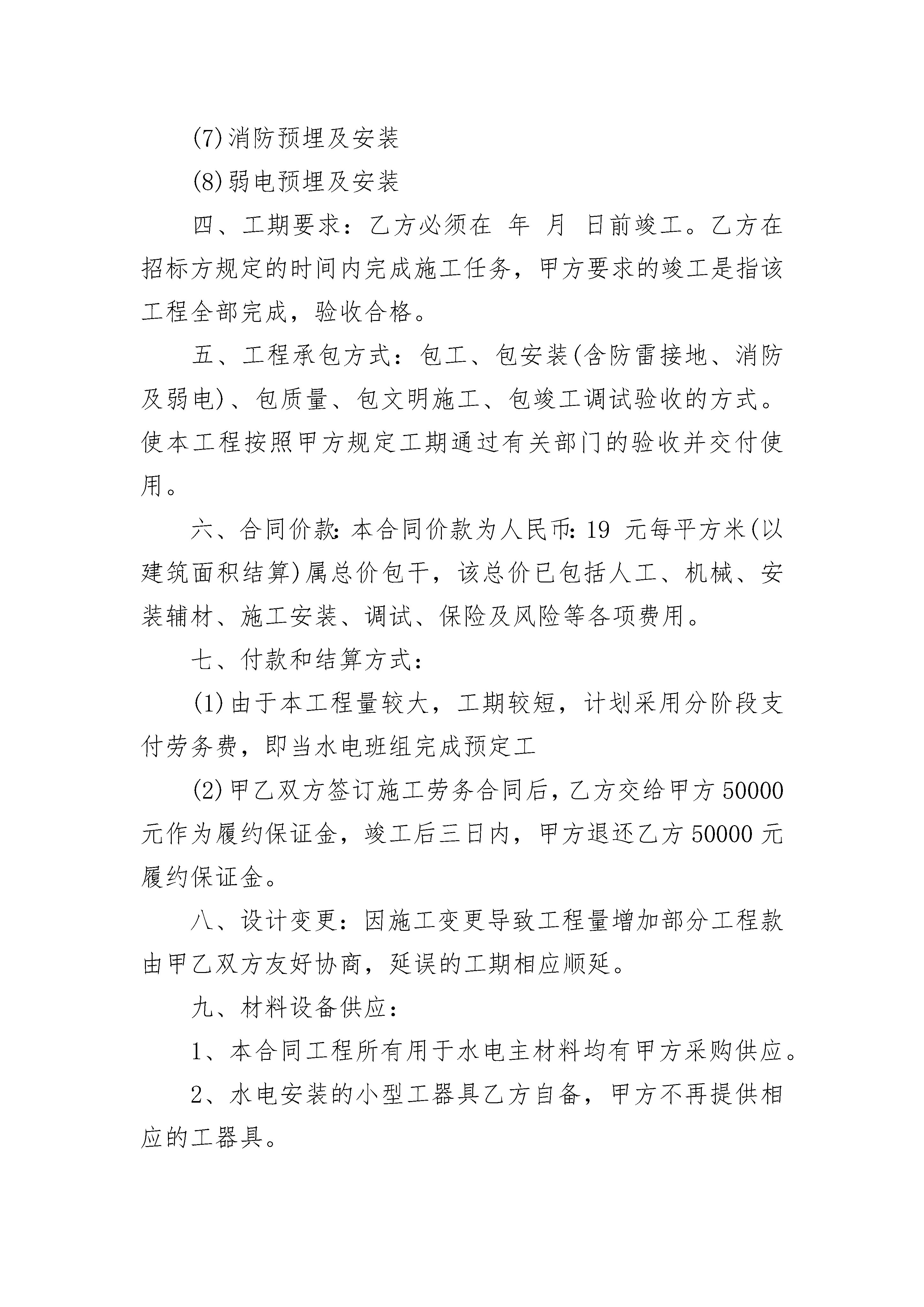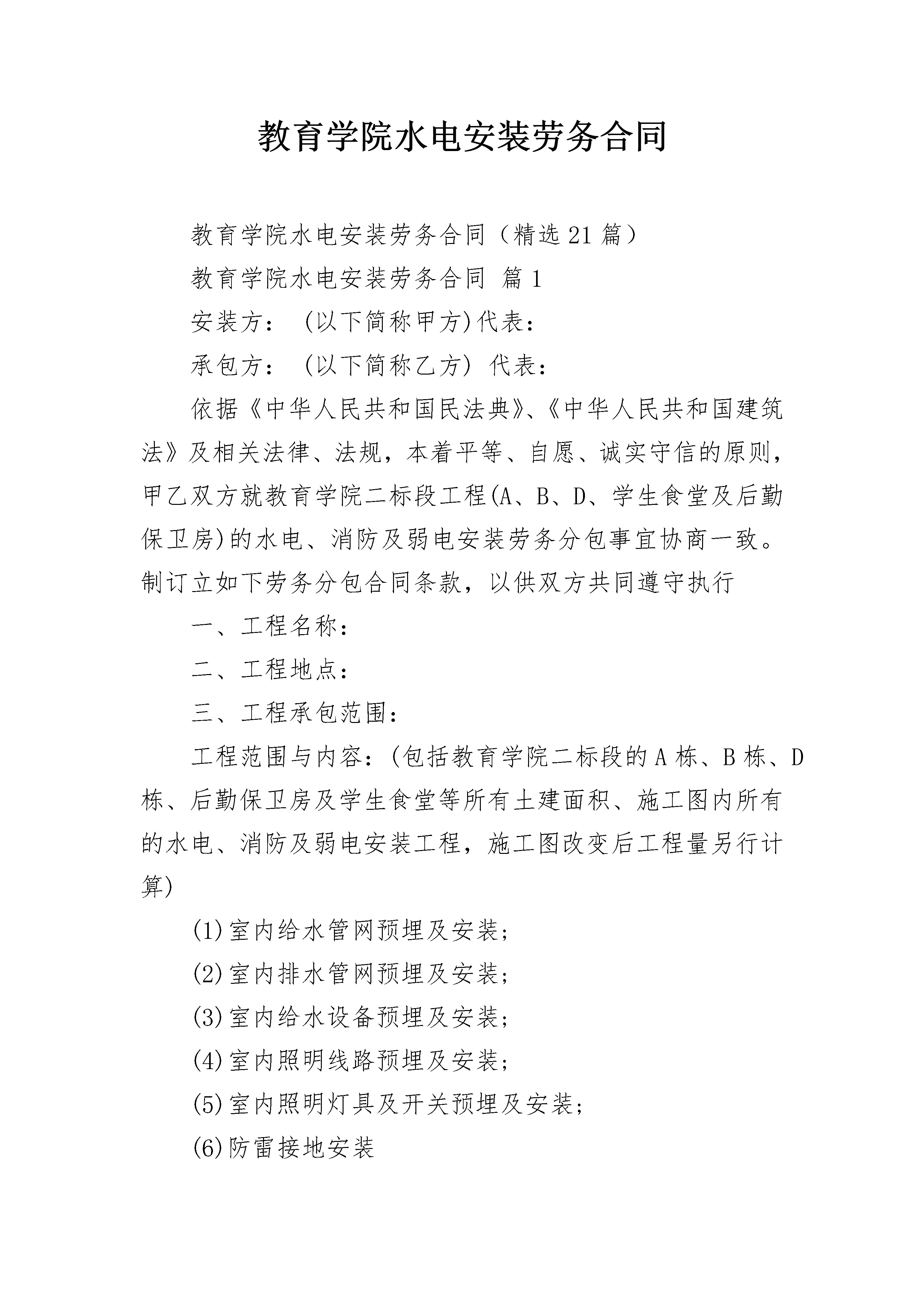 教育学院水电安装劳务合同教育学院水电安装劳务合同(精选21篇)教育学院水电安装劳务合同篇1安装方:(以下简称甲方)代表:承包方:(以下简称乙方)代表:依据《中华人民共和国民法典》、《中华人民共和国建筑法》及相关法律、法规,本着平等、自愿、诚实守信的原则,甲乙双方就教育学院二标段工程(A、B、D、学生食堂及后勤保卫房)的水电、消防及弱电安装劳务分包事宜协商一致。制订立如下劳务分包合同条款,以供双方共同遵守执行一、工程名称:二、工程地点:三、工程承包范围:工程范围与内容:(包括教育学院二标段的A栋、B栋、D栋、后勤保卫房及学生食堂等所有土建面积、施工图内所有的水电、消防及弱电安装工程,施工图改变后工程量另行计算)(1)室内给水管网预埋及安装;(2)室内排水管网预埋及安装;(3)室内给水设备预埋及安装;(4)室内照明线路预埋及安装;(5)室内照明灯具及开关预埋及安装;(6)防雷接地安装(7)消防预埋及安装(8)弱电预埋及安装四、工期要求:乙方必须在年月日前竣工。乙方在招标方规定的时间内完成施工任务,甲方要求的竣工是指该工程全部完成,验收合格。五、工程承包方式:包工、包安装(含防雷接地、消防及弱电)、包质量、包文明施工、包竣工调试验收的方式。使本工程按照甲方规定工期通过有关部门的验收并交付使用。六、合同价款:本合同价款为人民币:19元每平方米(以建筑面积结算)属总价包干,该总价已包括人工、机械、安装辅材、施工安装、调试、保险及风险等各项费用。七、付款和结算方式:(1)由于本工程量较大,工期较短,计划采用分阶段支付劳务费,即当水电班组完成预定工(2)甲乙双方签订施工劳务合同后,乙方交给甲方50000元作为履约保证金,竣工后三日内,甲方退还乙方50000元履约保证金。八、设计变更:因施工变更导致工程量增加部分工程款由甲乙双方友好协商,延误的工期相应顺延。九、材料设备供应:1、本合同工程所有用于水电主材料均有甲方采购供应。2、水电安装的小型工器具乙方自备,甲方不再提供相应的工器具。十、双方职责:1、甲方职责:(1)按时提供施工工作面给乙方使用和甲方提供的给排水、电气、消防及弱电安装图纸、图说、图纸会审、设计变更、设计通知、设计变更中涉及的工作内容(2)负责协调配合管理施工现场,指定相应的施工员监管施工工作,负责有关签证。(3)甲方提供施工用水、电源连接点及施工工人现场住宿2、乙方责任:(1)土建面积、施工图内所有的水电、消防及弱电安装工程(2)给排水、电气安装所涉及的土石方开挖和回填(3)应按照设计图的要求及施工规范施工,达到国家验收标准(4)施工现场水、电材料上下车及现场转运(5)乙方进场人员需无条件服从甲方的管理、调度,特别是质量、安全、进度、现场文明施工方面的管理及调度。(6)现场由甲方提供的原材料严禁浪费,否则,甲方有权要求乙方按原值赔偿。(7)在没有交付甲方时前必须保护设备设施(8)乙方食宿自理,(9)乙方提前7天提出计划材料由甲方审核购买十一、违约责任:1、甲方违约责任:如甲方违约,必须按时足额付清乙方所完工程量的劳务工资。2、乙方违约责任:(1)如乙方违约,甲方有权终止合同、拒退保证金,并视其情节拒付乙方所有做工工资等费用,造成甲方损失的由乙方负责全额赔偿。(2)如乙方在生产工程中,人员不够,工程质量施工安全不能得到保证,工期延误,甲方有权终止合同,并取缔乙方作业资格,乙方所完成的工程量按单项价格下浮50%后作为结算价款付给乙方。(3)双方约定的工期不论任何原因均不得延长,如未按规定时间完成该分项工作,甲方对乙方的工期延误按200元/天向乙方收取违约金。在结算时扣除或解除合同,另行安排劳务班组作业,或另行增加劳务班组作业。(4)在施工中如乙方因施工质量低劣造成返工损失的均由乙方自行承担,甲方并200元/次向乙方收取违约金。(5)乙方必须做到工完场清,否则甲方按200元/次向乙方收取违约金。(6)乙方必须服从甲方及其项目经理部管理人员的指挥、安排、调派,有故意刁难、停工、罢工、不服从管理行为的甲方及其项目部有权终止其合同并取缔乙方施工,乙方所完成的工程量按单项价格下浮50%后作为结算价款付给乙方。(7)乙方必须按甲方要求做好各项工作,进行工程质量与施工安全技术交底,认真完成甲方下达的各项指标任务,对不能按期完成各项指标任务的,甲方按20xx元/次向乙方收取违约金。(8)乙方未经甲方允许擅自到有关单位上访、滋事的,甲方按5000元/次向乙方收取违约金。(9)以上违约金,凡未指明的,均由甲方在支付给乙方的劳务款中直接扣除。十二、安全文明施工:1、乙方在施工作业中要文明施工,不浪费材料,不出安全事故,必须服从甲方管理人员的安排和管理,如不服从管理和安排,后果由乙方自行负责2、乙方在施工作业中凡因错误造成的一切经济损失,均由乙方自行