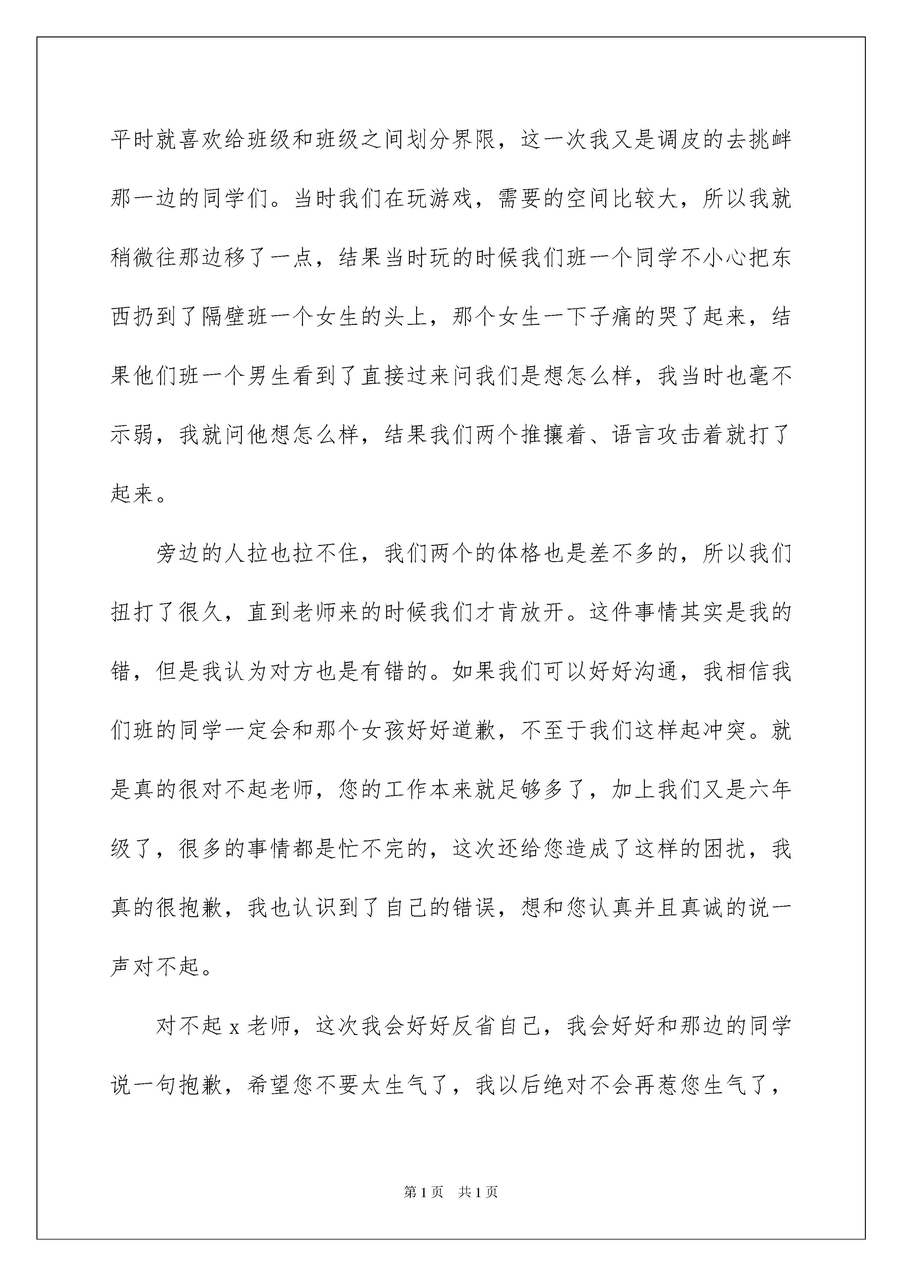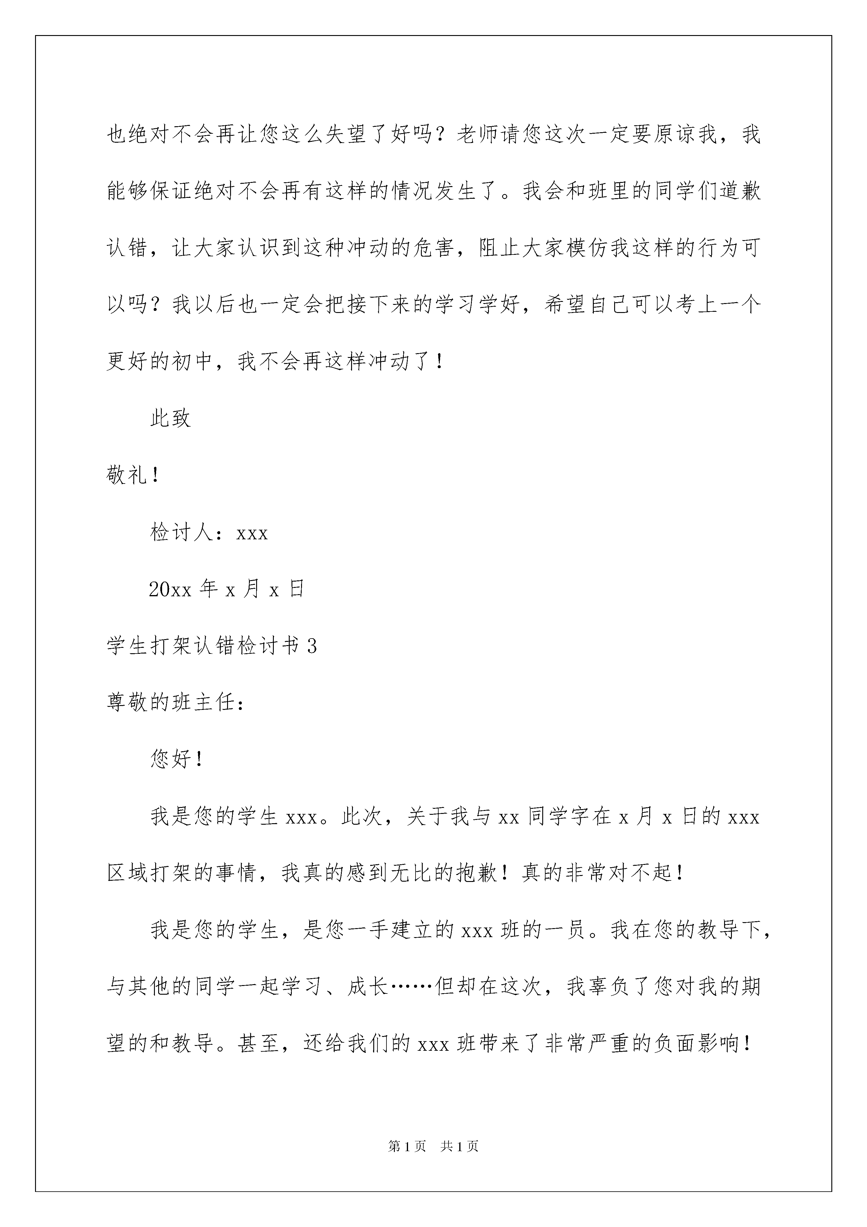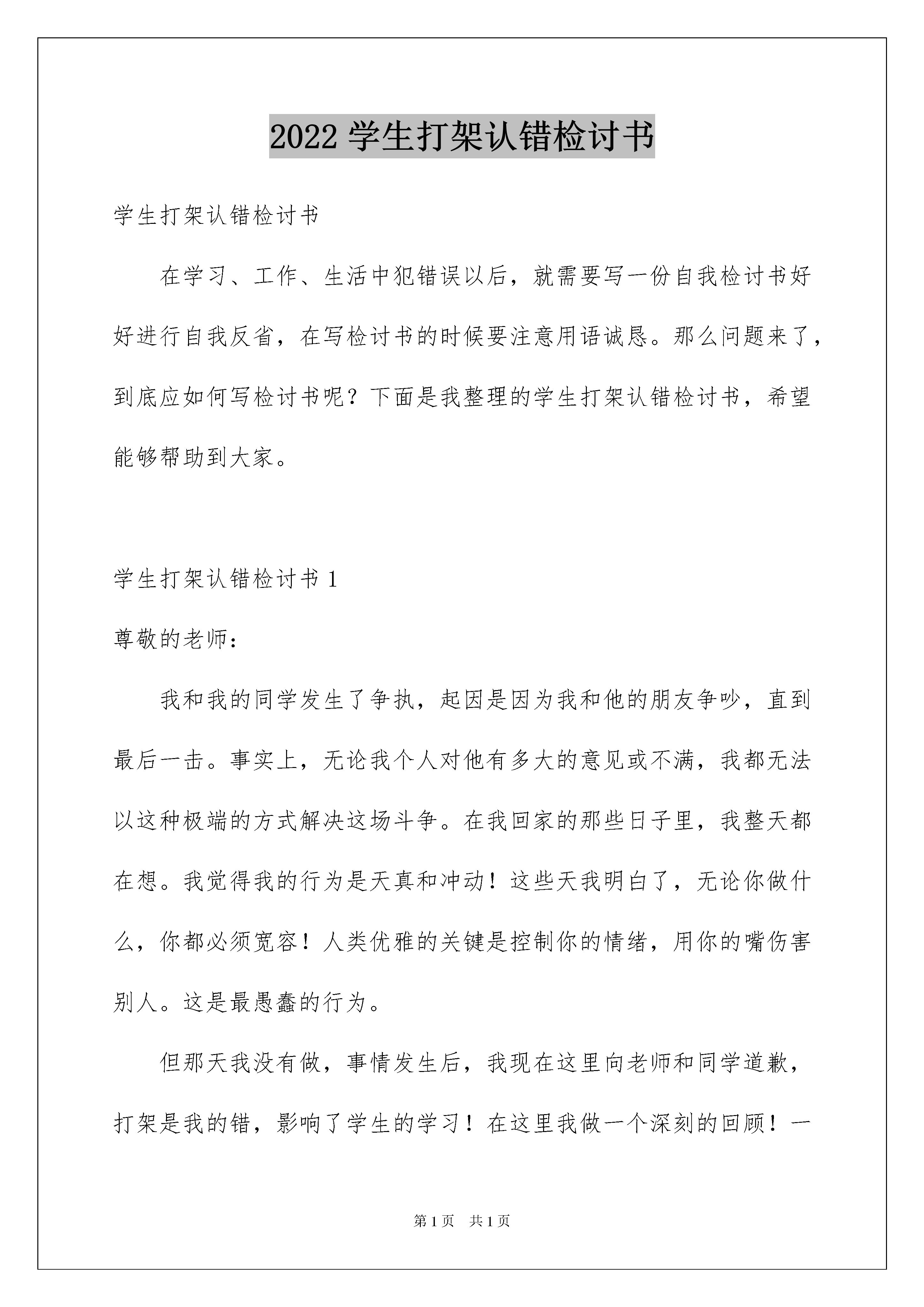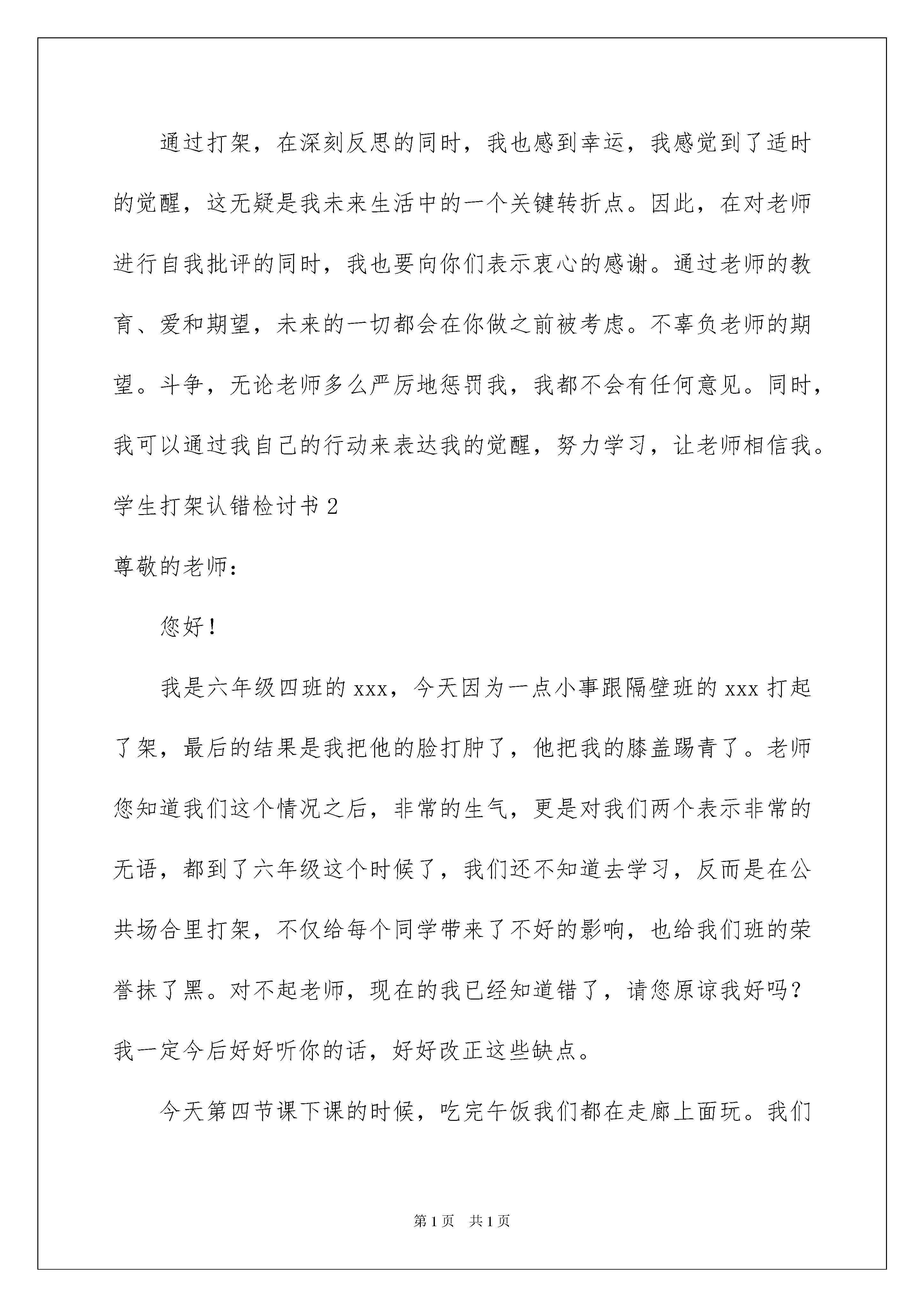 2022学生打架认错检讨书学生打架认错检讨书在学习、工作、生活中犯错误以后,就需要写一份自我检讨书好好进行自我反省,在写检讨书的时候要注意用语诚恳。那么问题来了,到底应如何写检讨书呢?下面是我整理的学生打架认错检讨书,希望能够帮助到大家。学生打架认错检讨书1尊敬的老师:我和我的同学发生了争执,起因是因为我和他的朋友争吵,直到最后一击。事实上,无论我个人对他有多大的意见或不满,我都无法以这种极端的方式解决这场斗争。在我回家的那些日子里,我整天都在想。我觉得我的行为是天真和冲动!这些天我明白了,无论你做什么,你都必须宽容!人类优雅的关键是控制你的情绪,用你的嘴伤害别人。这是最愚蠢的行为。但那天我没有做,事情发生后,我现在这里向老师和同学道歉,打架是我的错,影响了学生的学习!在这里我做一个深刻的回顾!一个人的成长过程不仅是一个不断自由的过程,更是一个学会管理自己情感的过程。我们缺乏自由通常是由于从心底影响我们的坏情绪。能控制坏情绪的人比能占领一座城市的人更强。生活中隐藏着内心的坏情绪,所以我要学会控制,生活中有太多的路要走,有太多的事情要去经历,有太多的人需要接触。我的愤世嫉俗能给我带来什么?我想学会看,宽容我周围的一切。学会慷慨、宽容和细心地处理身边发生的每件事。我应该团结一致,团结是一种来自不同情感的精神。团结不只存在于志同道合的人之间。要成为一个团结优秀的集体,我们只需要真诚地面对集体中的每一个人,让这个集体中的每一个人都能感受到心灵的温暖。学会从别人的欣赏中找到自信,而不是傲慢;学会倾听别人的话,而不是评论;学会客观地看待别人的话,而不是偏袒和仇恨;学会发现别人的长处,而不是夸大他们的缺点;学会和平地处理别人的缺点,而不是挖苦别人;学会在必要时让步,而不是像俗语所说的那样讨价还价:“忍受片刻的平静,退后一步。”当然,要互相帮助,这样才是一个团结的集体!一个团结的集体所遇到的任何困难都将得到解决,因为集体拥有个人无法匹敌的无限智慧。通过打架,在深刻反思的同时,我也感到幸运,我感觉到了适时的觉醒,这无疑是我未来生活中的一个关键转折点。因此,在对老师进行自我批评的同时,我也要向你们表示衷心的感谢。通过老师的教育、爱和期望,未来的一切都会在你做之前被考虑。不辜负老师的期望。斗争,无论老师多么严厉地惩罚我,我都不会有任何意见。同时,我可以通过我自己的行动来表达我的觉醒,努力学习,让老师相信我。学生打架认错检讨书2尊敬的老师:您好!我是六年级四班的xxx,今天因为一点小事跟隔壁班的xxx打起了架,最后的结果是我把他的脸打肿了,他把我的膝盖踢青了。老师您知道我们这个情况之后,非常的生气,更是对我们两个表示非常的无语,都到了六年级这个时候了,我们还不知道去学习,反而是在公共场合里打架,不仅给每个同学带来了不好的影响,也给我们班的荣誉抹了黑。对不起老师,现在的我已经知道错了,请您原谅我好吗?我一定今后好好听你的话,好好改正这些缺点。今天第四节课下课的时候,吃完午饭我们都在走廊上面玩。我们平时就喜欢给班级和班级之间划分界限,这一次我又是调皮的去挑衅那一边的同学们。当时我们在玩游戏,需要的空间比较大,所以我就稍微往那边移了一点,结果当时玩的时候我们班一个同学不小心把东西扔到了隔壁班一个女生的头上,那个女生一下子痛的哭了起来,结果他们班一个男生看到了直接过来问我们是想怎么样,我当时也毫不示弱,我就问他想怎么样,结果我们两个推攘着、语言攻击着就打了起来。旁边的人拉也拉不住,我们两个的体格也是差不多的,所以我们扭打了很久,直到老师来的时候我们才肯放开。这件事情其实是我的错,但是我认为对方也是有错的。如果我们可以好好沟通,我相信我们班的同学一定会和那个女孩好好道歉,不至于我们这样起冲突。就是真的很对不起老师,您的工作本来就足够多了,加上我们又是六年级了,很多的事情都是忙不完的,这次还给您造成了这样的困扰,我真的很抱歉,我也认识到了自己的错误,想和您认真并且真诚的说一声对不起。对不起x老师,这次我会好好反省自己,我会好好和那边的同学说一句抱歉,希望您不要太生气了,我以后绝对不会再惹您生气了,也绝对不会再让您这么失望了好吗?老师请您这次一定要原谅我,我能够保证绝对不会再有这样的情况发生了。我会和班里的同学们道歉认错,让大家认识到这种冲动的危害,阻止大家模仿我这样的行为可以吗?我以后也一定会把接下来的学习学好,希望自己可以考上一个更好的初中,我不会再这样冲动了!此致敬礼!检讨人:xxx20xx年x月x日学生打架认错检讨书3尊敬的班主任:您好!我是您的学生xxx。此次,关于我与xx同学字在x月x日的xxx区