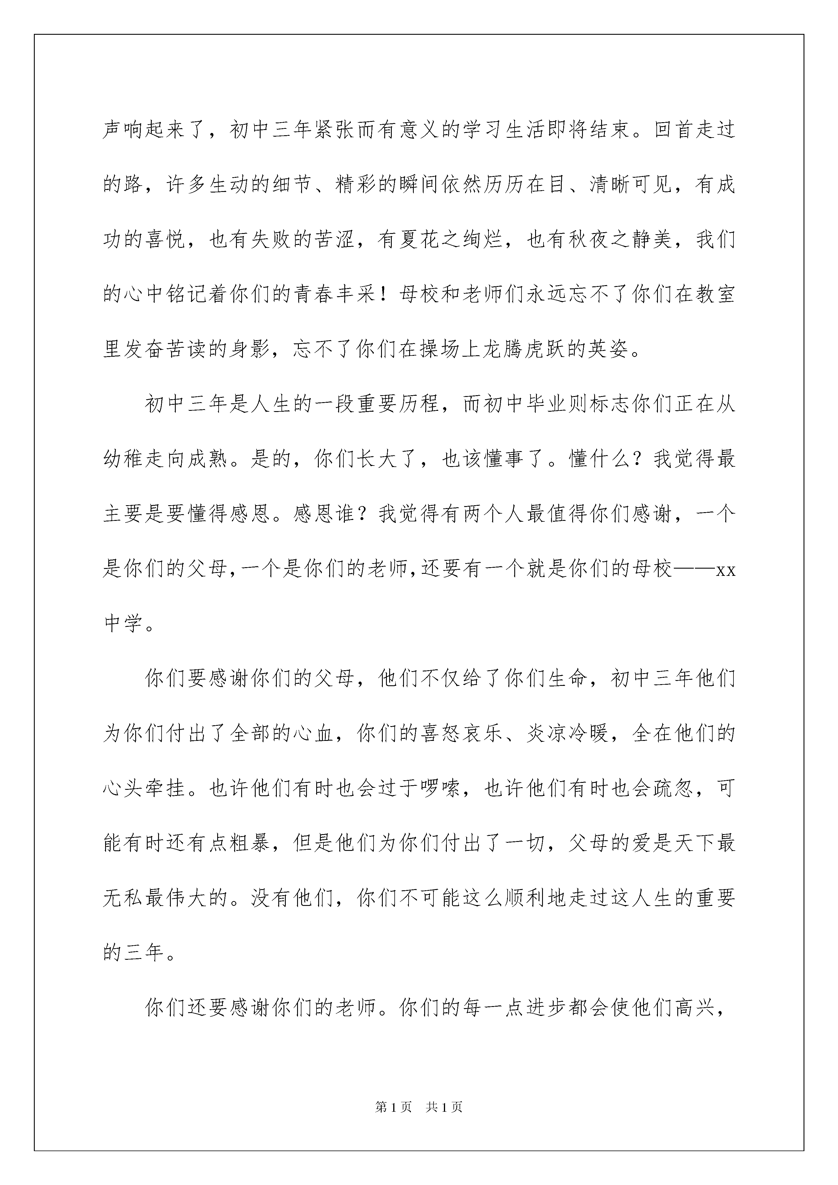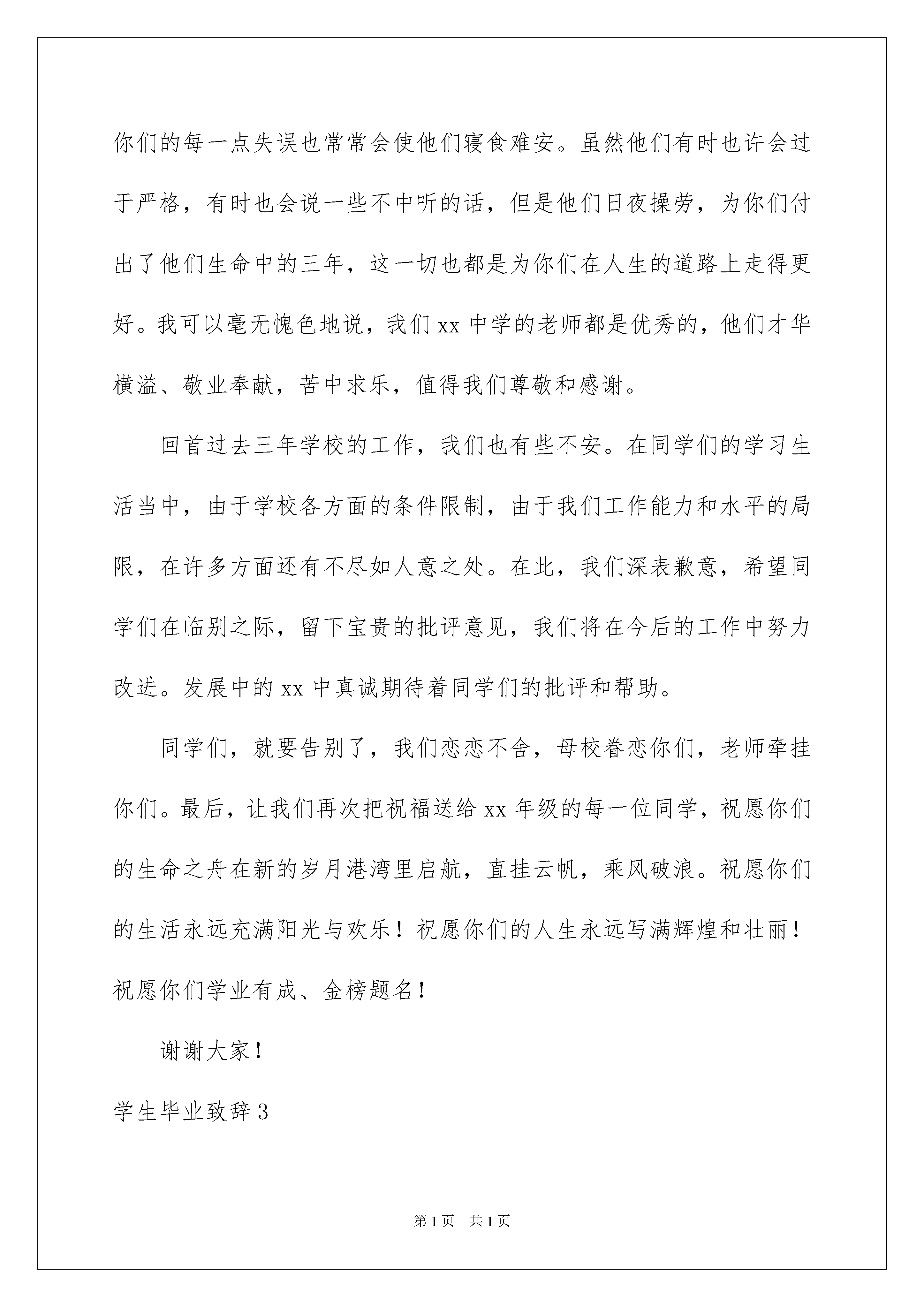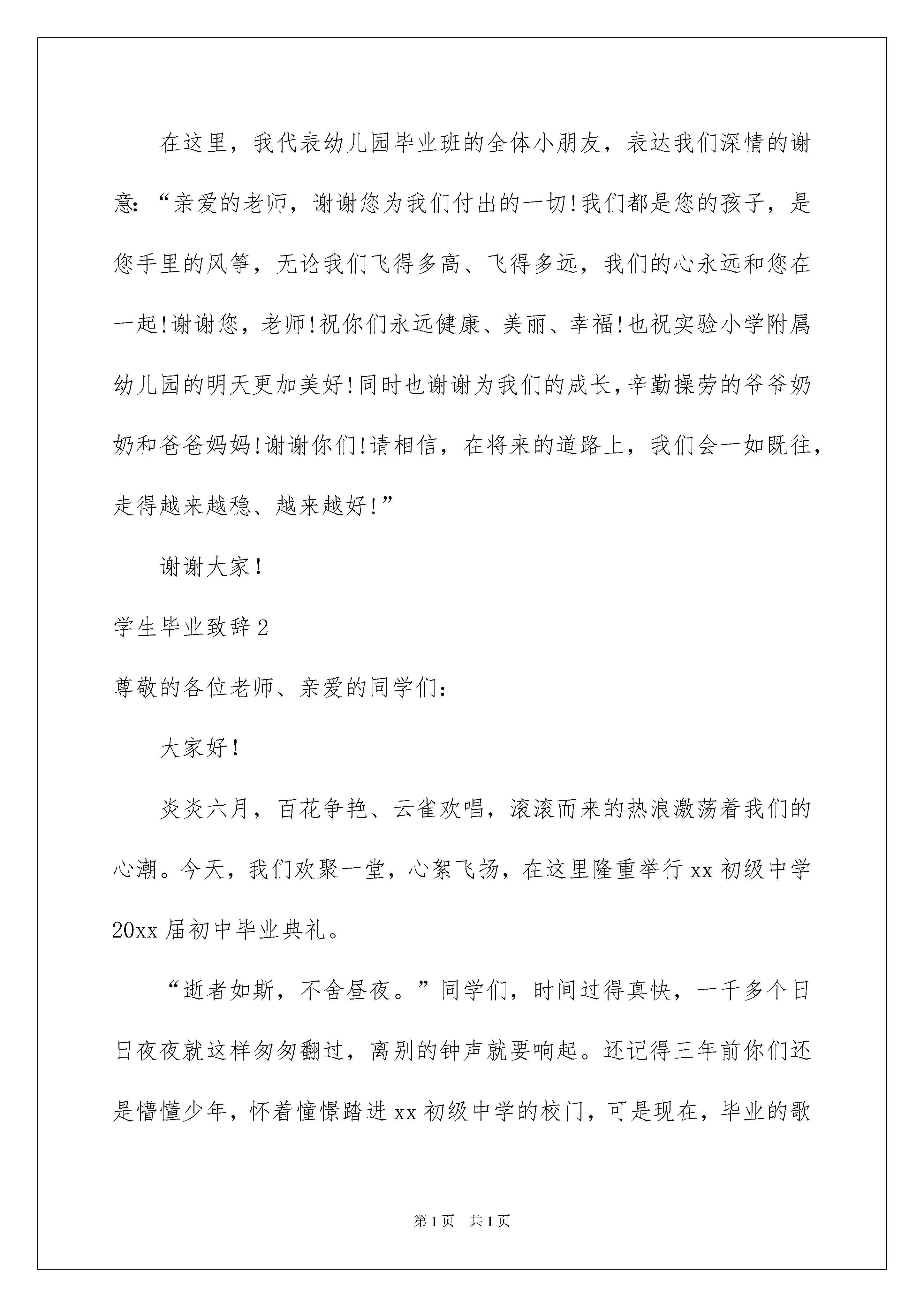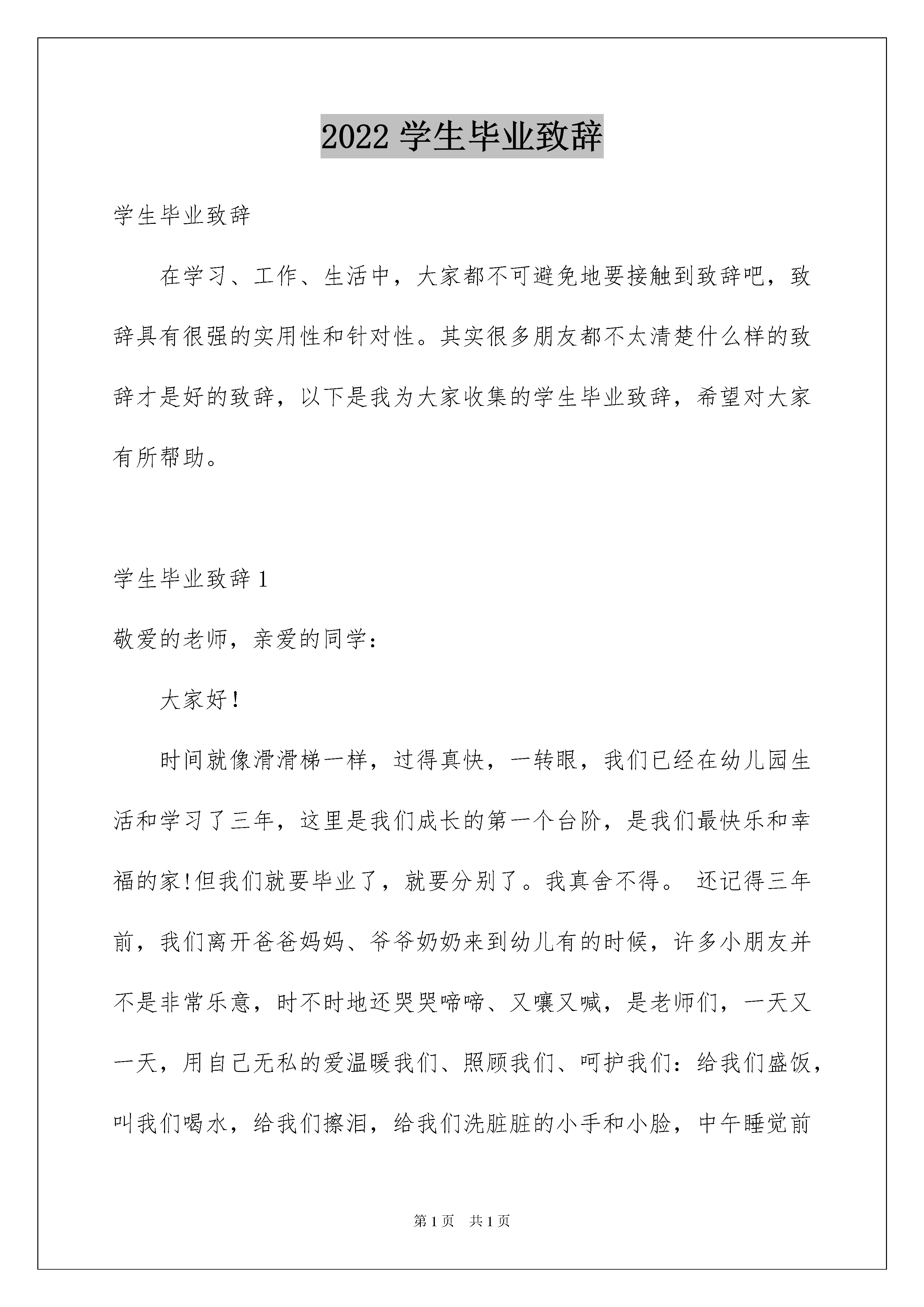 2022学生毕业致辞学生毕业致辞在学习、工作、生活中,大家都不可避免地要接触到致辞吧,致辞具有很强的实用性和针对性。其实很多朋友都不太清楚什么样的致辞才是好的致辞,以下是我为大家收集的学生毕业致辞,希望对大家有所帮助。学生毕业致辞1敬爱的老师,亲爱的同学:大家好!时间就像滑滑梯一样,过得真快,一转眼,我们已经在幼儿园生活和学习了三年,这里是我们成长的第一个台阶,是我们最快乐和幸福的家!但我们就要毕业了,就要分别了。我真舍不得。还记得三年前,我们离开爸爸妈妈、爷爷奶奶来到幼儿有的时候,许多小朋友并不是非常乐意,时不时地还哭哭啼啼、又嚷又喊,是老师们,一天又一天,用自己无私的爱温暖我们、照顾我们、呵护我们:给我们盛饭,叫我们喝水,给我们擦泪,给我们洗脏脏的小手和小脸,中午睡觉前给我们讲故事,给我们扎漂亮的小辫子,带领我们阅读,和我们做游戏,叫我们画画、唱歌、跳舞、计算,指导我们如何和别的小朋友们相处………日复一日,年复一年,我们慢慢的喜欢上了幼儿园,到后来深深地爱上了幼儿园,爱上了这个家。可现在我们就要毕业了,就要离开幼儿园这个温暖的大家庭了。在依依不舍的临别之际,我们相对幼儿园的每位老师说:“老师,您辛苦了!谢谢您!谢谢您给我们的爱和关怀!谢谢您的教育和培养!老师,我们爱您!”三年来,老师教会我们许多本领,现在我们已经会自己阅读、会编故事了,会写字、会画画、会唱歌、会跳舞了,会穿衣、穿鞋甚至洗自己的小袜子、小毛巾了,在这三年里,我们懂得了许多道理,养成了许多生活习惯和学习习惯,我们明白了自己的事情要自己做,要关心和爱护别人,更要尊重和体谅他人,在这人生的第一个台阶上,我们走得越来越棒!现在,我们已经长大了,就要离开幼儿园去上小学了,就好像小鸟长大了,要飞向更为广阔的未来,但是不管我们走的多远,我们也永远不会忘记幼儿园里的快乐时光,永远不会忘记像妈妈一样呵护我们的老师,永远也不会忘记美丽细心的院长妈妈们,在我们心中,你们就是最可亲的人!在这里,我代表幼儿园毕业班的全体小朋友,表达我们深情的谢意:“亲爱的老师,谢谢您为我们付出的一切!我们都是您的孩子,是您手里的风筝,无论我们飞得多高、飞得多远,我们的心永远和您在一起!谢谢您,老师!祝你们永远健康、美丽、幸福!也祝实验小学附属幼儿园的明天更加美好!同时也谢谢为我们的成长,辛勤操劳的爷爷奶奶和爸爸妈妈!谢谢你们!请相信,在将来的道路上,我们会一如既往,走得越来越稳、越来越好!”谢谢大家!学生毕业致辞2尊敬的各位老师、亲爱的同学们:大家好!炎炎六月,百花争艳、云雀欢唱,滚滚而来的热浪激荡着我们的心潮。今天,我们欢聚一堂,心絮飞扬,在这里隆重举行xx初级中学20xx届初中毕业典礼。“逝者如斯,不舍昼夜。”同学们,时间过得真快,一千多个日日夜夜就这样匆匆翻过,离别的钟声就要响起。还记得三年前你们还是懵懂少年,怀着憧憬踏进xx初级中学的校门,可是现在,毕业的歌声响起来了,初中三年紧张而有意义的学习生活即将结束。回首走过的路,许多生动的细节、精彩的瞬间依然历历在目、清晰可见,有成功的喜悦,也有失败的苦涩,有夏花之绚烂,也有秋夜之静美,我们的心中铭记着你们的青春丰采!母校和老师们永远忘不了你们在教室里发奋苦读的身影,忘不了你们在操场上龙腾虎跃的英姿。初中三年是人生的一段重要历程,而初中毕业则标志你们正在从幼稚走向成熟。是的,你们长大了,也该懂事了。懂什么?我觉得最主要是要懂得感恩。感恩谁?我觉得有两个人最值得你们感谢,一个是你们的父母,一个是你们的老师,还要有一个就是你们的母校——xx中学。你们要感谢你们的父母,他们不仅给了你们生命,初中三年他们为你们付出了全部的心血,你们的喜怒哀乐、炎凉冷暖,全在他们的心头牵挂。也许他们有时也会过于啰嗦,也许他们有时也会疏忽,可能有时还有点粗暴,但是他们为你们付出了一切,父母的爱是天下最无私最伟大的。没有他们,你们不可能这么顺利地走过这人生的重要的三年。你们还要感谢你们的老师。你们的每一点进步都会使他们高兴,你们的每一点失误也常常会使他们寝食难安。虽然他们有时也许会过于严格,有时也会说一些不中听的话,但是他们日夜操劳,为你们付出了他们生命中的三年,这一切也都是为你们在人生的道路上走得更好。我可以毫无愧色地说,我们xx中学的老师都是优秀的,他们才华横溢、敬业奉献,苦中求乐,值得我们尊敬和感谢。回首过去三年学校的工作,我们也有些不安。在同学们的学习生活当中,由于学校各方面的条件限制,由于我们工作能力和水平的局限,在许多方面还有不尽如人意之处。在此,我们深表歉意,希望同学们在临别之际,留下宝贵的批评意见,我们将在