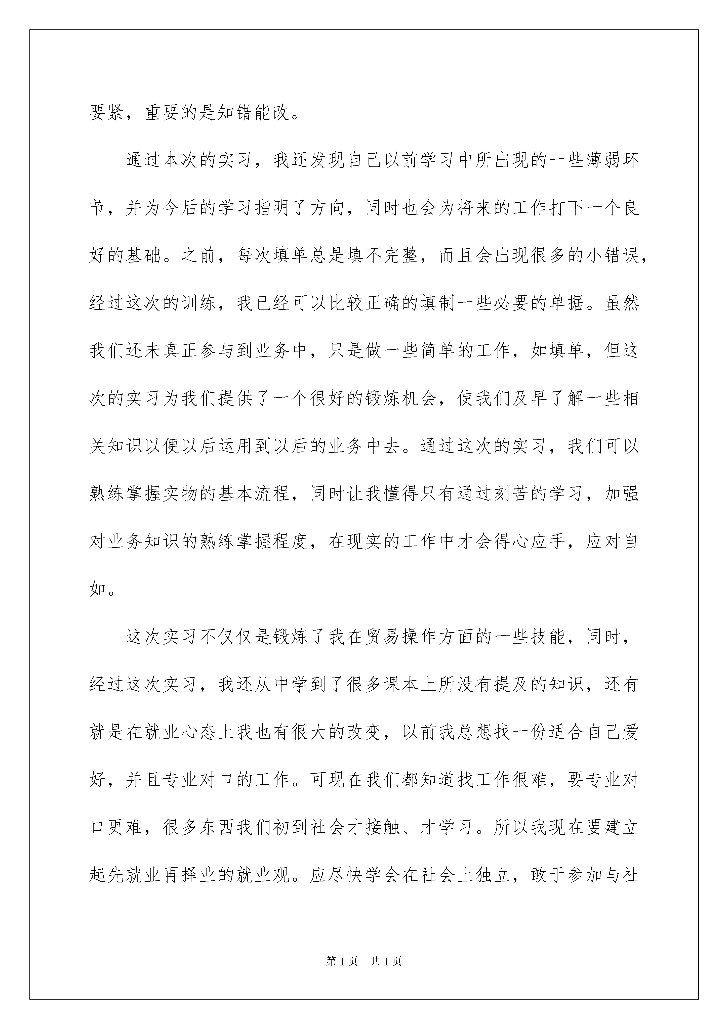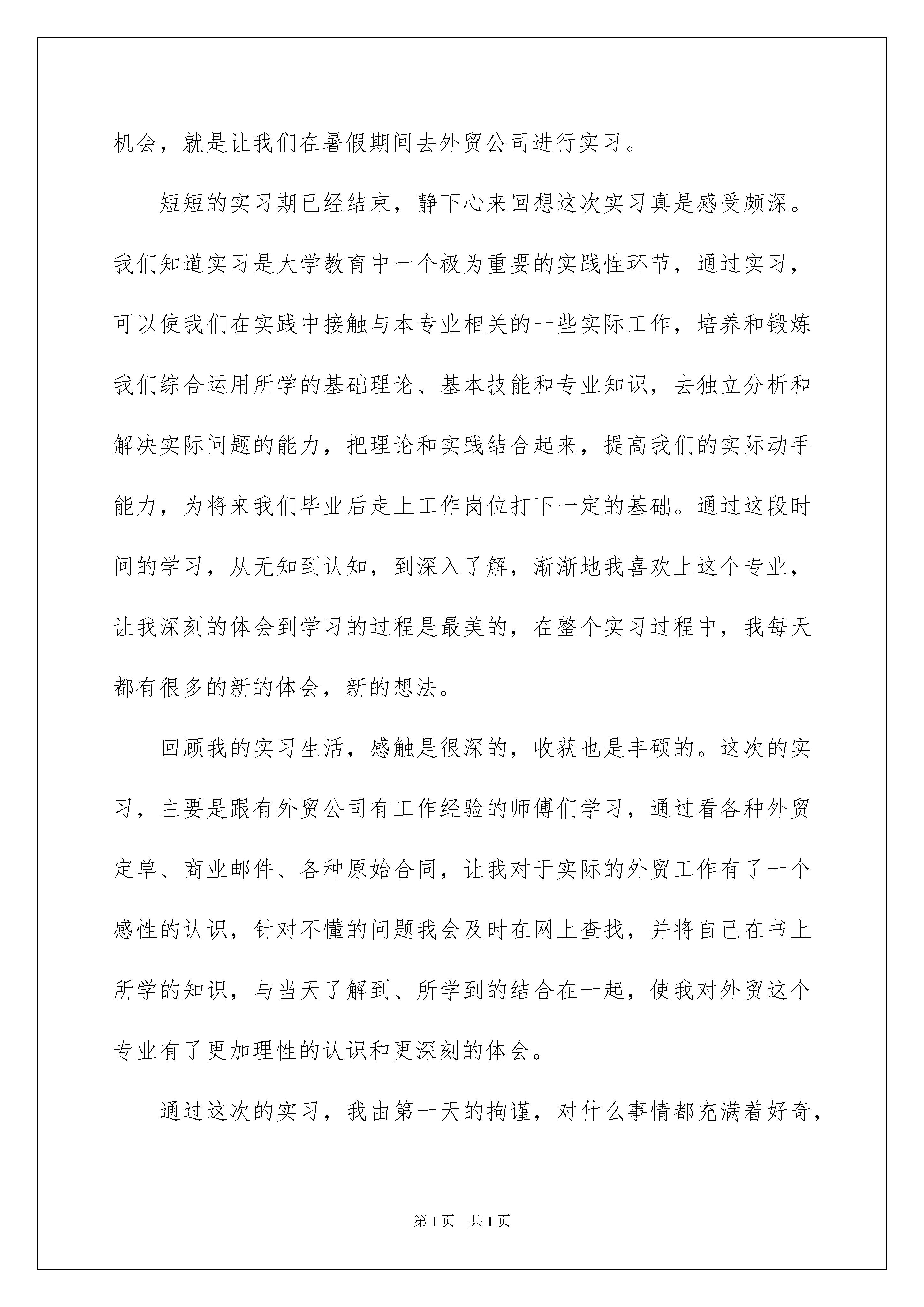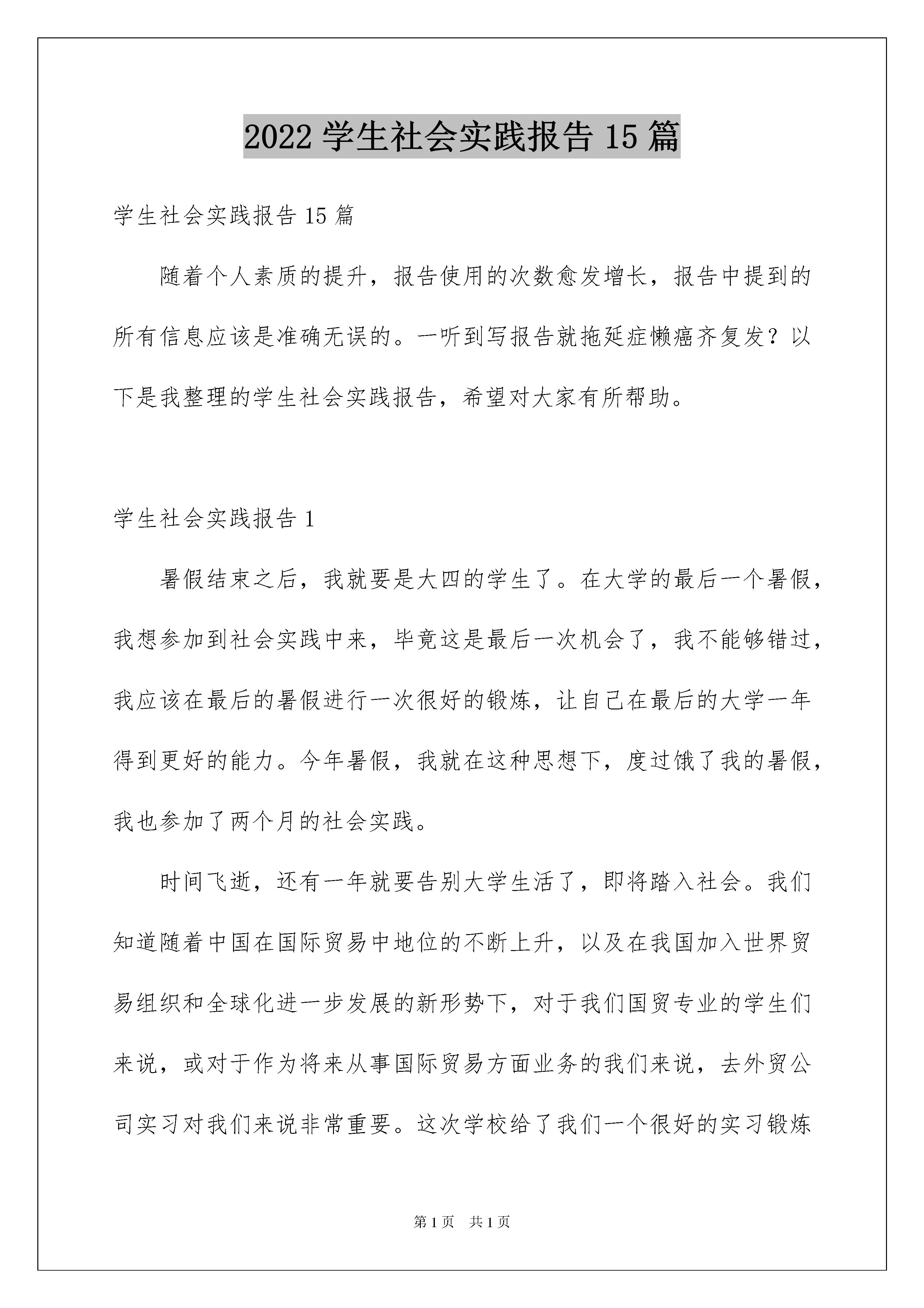 2022学生社会实践报告15篇学生社会实践报告15篇随着个人素质的提升,报告使用的次数愈发增长,报告中提到的所有信息应该是准确无误的。一听到写报告就拖延症懒癌齐复发?以下是我整理的学生社会实践报告,希望对大家有所帮助。学生社会实践报告1暑假结束之后,我就要是大四的学生了。在大学的最后一个暑假,我想参加到社会实践中来,毕竟这是最后一次机会了,我不能够错过,我应该在最后的暑假进行一次很好的锻炼,让自己在最后的大学一年得到更好的能力。今年暑假,我就在这种思想下,度过饿了我的暑假,我也参加了两个月的社会实践。时间飞逝,还有一年就要告别大学生活了,即将踏入社会。我们知道随着中国在国际贸易中地位的不断上升,以及在我国加入世界贸易组织和全球化进一步发展的新形势下,对于我们国贸专业的学生们来说,或对于作为将来从事国际贸易方面业务的我们来说,去外贸公司实习对我们来说非常重要。这次学校给了我们一个很好的实习锻炼机会,就是让我们在暑假期间去外贸公司进行实习。短短的实习期已经结束,静下心来回想这次实习真是感受颇深。我们知道实习是大学教育中一个极为重要的实践性环节,通过实习,可以使我们在实践中接触与本专业相关的一些实际工作,培养和锻炼我们综合运用所学的基础理论、基本技能和专业知识,去独立分析和解决实际问题的能力,把理论和实践结合起来,提高我们的实际动手能力,为将来我们毕业后走上工作岗位打下一定的基础。通过这段时间的学习,从无知到认知,到深入了解,渐渐地我喜欢上这个专业,让我深刻的体会到学习的过程是最美的,在整个实习过程中,我每天都有很多的新的体会,新的想法。回顾我的实习生活,感触是很深的,收获也是丰硕的。这次的实习,主要是跟有外贸公司有工作经验的师傅们学习,通过看各种外贸定单、商业邮件、各种原始合同,让我对于实际的外贸工作有了一个感性的认识,针对不懂的问题我会及时在网上查找,并将自己在书上所学的知识,与当天了解到、所学到的结合在一起,使我对外贸这个专业有了更加理性的认识和更深刻的体会。通过这次的实习,我由第一天的拘谨,对什么事情都充满着好奇,转而逐渐适应了这样的生活,做事情按部就班,循序渐进。这次的实习,让我懂得了许多,知道了许多,大学文凭其实只是一块敲门砖。进入工作单位后,大家都是从头开始,凡事都要自己去摸索,没有人会手把手教你。所以,我们有必要培养主动学习能力和创新能力,必须努力提高自身的综合素质,适应时代的需要。虽说大学文凭只是一块敲门砖,但是个人的综合素质却仍是你就业时的重要筹码。首先是学习成绩,用人单位认为成绩的好坏从一定程度上说明了你学习能力的强弱,所以,学习成绩是他们非常看重的一点。因此,我们首先要学好自己的专业知识。其次,他们看重的就是就是我们的社会实践能力。这一点就要看我们平时的实际动手及操作能力。经过这段时间的实习,我主要有以下感想:一、要确立明确的目标,并端正自己的态度。平时,我们不管做什么事,都要明确自己的目标,就像我们到公司工作以后,要知道自己能否胜任这份工作,关键是看你自己对待工作的态度,态度对了,即使自己以前没学过的知识也可以在工作中逐渐的掌握。因此,要树立正确的目标,在实现目标的过程中一定要多看别人怎样做,多听别人怎样说,多想自己应该怎样做,然后自己亲自动手去多做。只有这样我们才能把事情做好。二、要有坚持不懈的精神。作为在校生,我们不管到哪家公司,一开始都不会立刻给工作我们做,一般都是先让我们熟悉公司的工作环境,时间短的要几天,时间长的要几周,或更长的时间,在这段时间里很多人会觉得很无聊,没事可做,便会产生离开的念头,在这个时候我们一定要坚持,不能轻易放弃。三、要勤劳,任劳任怨。我们到公司去实习,由于我们不是正式职员,所以公司多数是把我们当学生看待。公司在这个期间一般不会给我们什么重要的工作去做,可又不想让我们闲着,因此,他们会交给我们一些比较简单的工作。与此同时,我们应该自己主动找一些事情来做,从小事做起,刚开始也只有这样。这样公司的同事才会更快地接受你,领导才会喜欢你,接下来才会让你做一些相对比较重要的工作。四、要虚心学习,不耻下问。在工作过程中,我们肯定会碰到很多的问题,有很多是我们所不懂的,不懂的东西我们就要虚心向同事请教,当别人教我们知识的时候,我们也应该虚心地接受。同时,我们也不要怕犯错。每一个人都有犯错的时候,工作中第一次做错了不要紧,重要的是知错能改。通过本次的实习,我还发现自己以前学习中所出现的一些薄弱环节,并为今后的学习指明了方向,同时也会为将来的工作打下一个良好的基础。之前,每次填单总是填不完整,而且会出现很多的小错误,经过这次的训练,我已经可