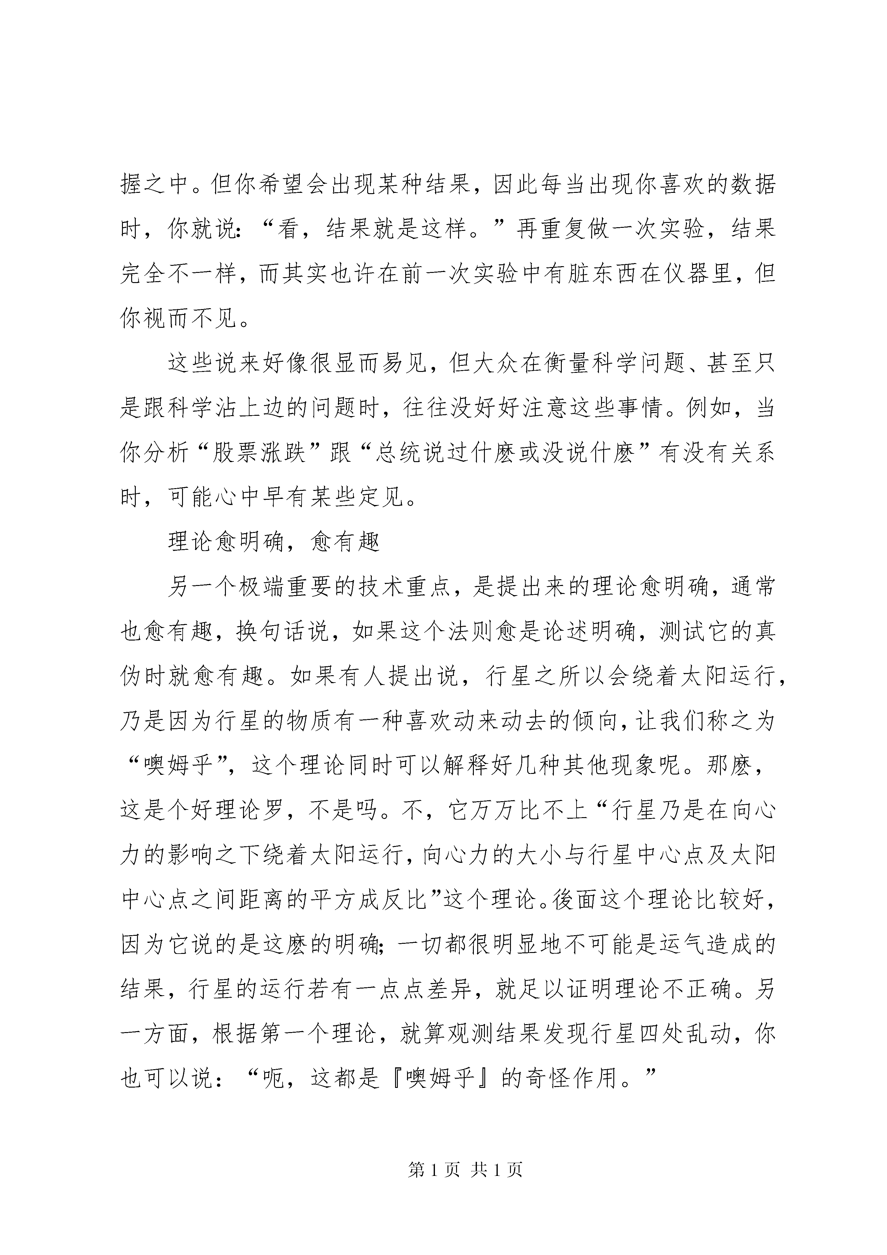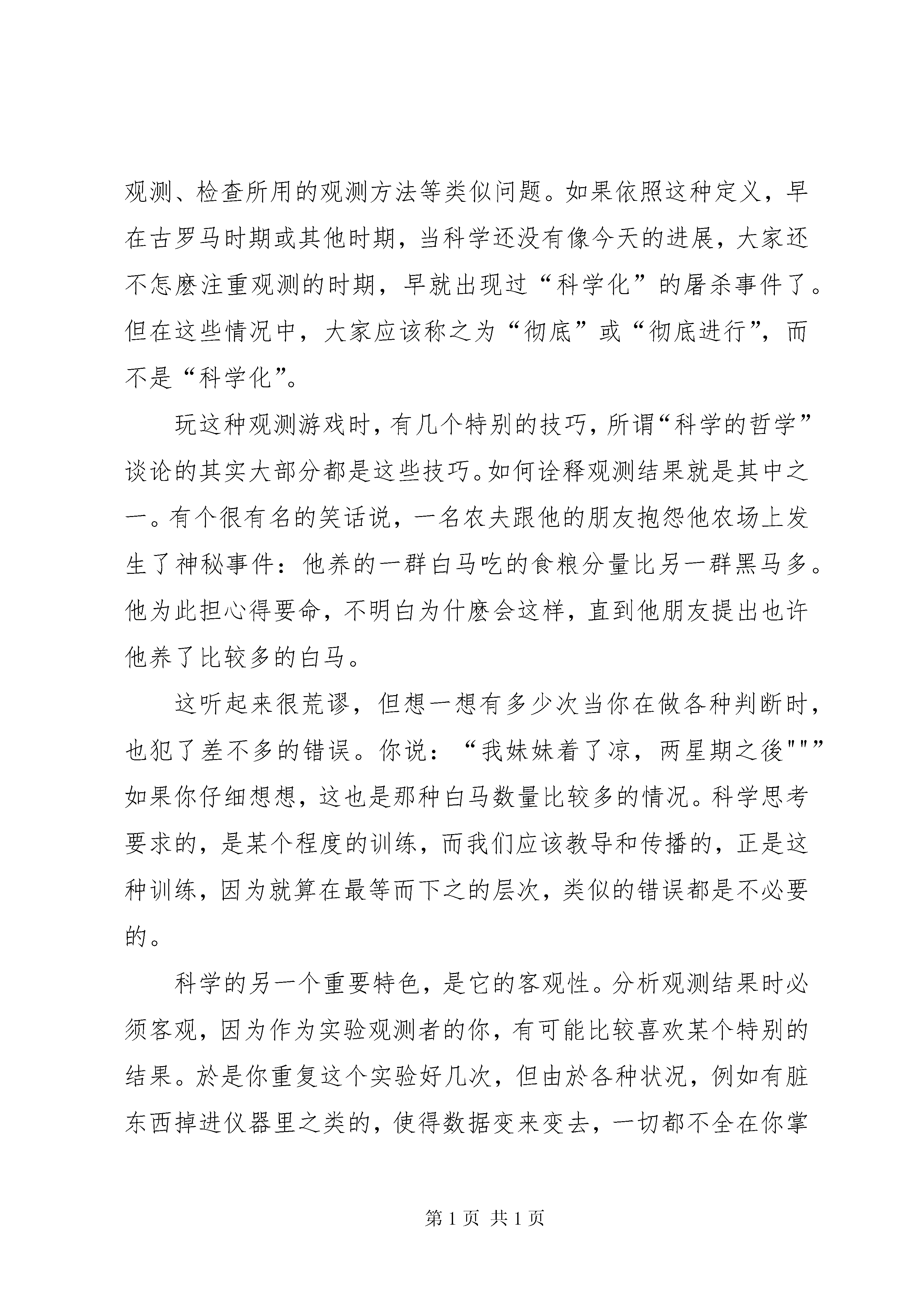 关于科学的演讲·费曼·我了解科学,我很清楚科学的概念、科学使用的方法、科学看待知识的态度、它进步的原动力,以及它在心智上的纪律。因此,我将要谈一谈我所了解的科学。任何人想要谈某个领域中的观念如何冲击另一个领域中的观念时,结果都会自曝其蠢,自找麻烦。在这个讲究事业专门的年头,没几个人能同时深入了解两个不同领域的知识,因此总是会在其中一个领域里出尽洋相。很多古老观念早已演变成普通常识,用不着再作讨论或说明了。但是,当我看看周围的人时,就会觉得,跟科学发展这个大题目相关的诸多观念,并不是人人都能领略或欣赏的。没错,有很多人懂科学,懂得欣赏科学,特别是在大学殿堂之内,大部分的人都了解科学是怎麽一回事。“观测”是终极大法官我要谈的第三个科学层面,是追根究柢的方法。这个方法的基础,是认定观测(observation)是“检验某些事物是否为真”的大法官。当我们明白,观测才是“判断某个想法是否包含真理”的终极大法官时,科学的其他面相或特色就都变得明显易懂了。不过,科学上的所谓“证明”(prove)在这里的意思其实是检验(test),对大众而言,这整个想法应该翻译为“任何法则都必须接受异常情况的考验”;或者用另一种说法,“『例外』证明了某个法则的错误。”这就是科学的原理。任何法则如果出现例外情况,而如果这例外情况经过观测之後证实不虚,那麽原先设定的法则就错了。这些例外本身都是十分有趣的,因为它们显示了旧法则的谬误。而因此,找出正确的法则(如果有的话),就是最教人兴奋的事。大家会深入研究这些例外个案以及其他出现差不多结果的情况。科学家总是在尝试找出更多的例外,判定这些例外情况的特性。这种过程愈发展下去愈教人兴奋。科学家不会企图掩饰法则出了错这件事;刚好相反,这是一种进展和刺激十分的事。事实上,他还想尽快地证明他原先的想法有错误不周之处。“观测是最後的裁判”这个原理,严格限制了我们可以问的问题种类。我们能够问的问题只限於像“如果我这样这样做,会发生什麽事。”这些问题都是可以做做看,看看结果到底如何的。像“我应不应该这样做。”以及“这有什麽价值。”等类似的问题,完全是另一种形态的问题。但是,假如有些不怎麽科学的东西,尽管我们无法透过观测来检验,却并不表示这个东西一定行不通、错误或者是笨得要命。我们并不是说,科学就一定是好的而其他东西就都不好。科学只考虑那些可以靠法则进行分析的东西,因此所有现称作科学的东西全都被发现了;但还有很多遗漏掉的东西,是科学方法无能为力的。这不等於说那些东西不重要,其实从很多角度看来它们才是最重要的。但在决定任何行动之前,当你必须决定下一步该做什麽时,永远牵涉了“应不应该这样做。”这重考量,你不能单从“如果我做这些会发生什麽事。”的角度来找出解决方案。你说,“当然可以,你可以先看看会发生什麽事,然後再决定想不想这些事情发生。”但最後那一步决定你想不想这些事情发生,正好就是科学家帮不上忙的一步。你可以弄清楚将会发生什麽事,但你必须决定是否喜欢那样的发展方式。“彻底”不等於“科学化”从“以观测为裁判”这个科学原理,还衍生出好几个技术性的後续结论。例如,观测不能做得太粗糙。你必须极为小心,也许仪器里头有一块脏东西,使得被观测的东西颜色变了,而跟你原先设想的不一样。你必须仔细检查观测结果,检查再检查,确定你很清楚所有的实验条件,确定你没有错误地诠释你所做的一切。有趣的是,很多时候这种“彻底”的做法、这种好习惯,会被误解或歪曲掉。当有人说某件事的做法很科学化时,许多时候他的意思只不过是这件事做得很彻底。我听过有人说德国很“科学化”地屠杀犹太人,但其实这件事一点都不科学,而只不过是够彻底。在整个屠杀事件中,完全没有任何为了判定什麽而进行观测、检查所用的观测方法等类似问题。如果依照这种定义,早在古罗马时期或其他时期,当科学还没有像今天的进展,大家还不怎麽注重观测的时期,早就出现过“科学化”的屠杀事件了。但在这些情况中,大家应该称之为“彻底”或“彻底进行”,而不是“科学化”。玩这种观测游戏时,有几个特别的技巧,所谓“科学的哲学”谈论的其实大部分都是这些技巧。如何诠释观测结果就是其中之一。有个很有名的笑话说,一名农夫跟他的朋友抱怨他农场上发生了神秘事件:他养的一群白马吃的食粮分量比另一群黑马多。他为此担心得要命,不明白为什麽会这样,直到他朋友提出也许他养了比较多的白马。这听起来很荒谬,但想一想有多少次当你在做各种判断时,也犯了差不多的错误。你说:“我妹妹着了凉,两星期之後""”如果你仔细想想,这也是那种白马数量比较多的情况。科学思考要求的,是某个程度的训练,而我们应该教导和传播的,正是这种训练,因为就算在最等而下之的层次,类似的错误都是不必要的。科学的另一个重要特色,是它的客观性。分析观测结果时必须客观,因为作为实验观