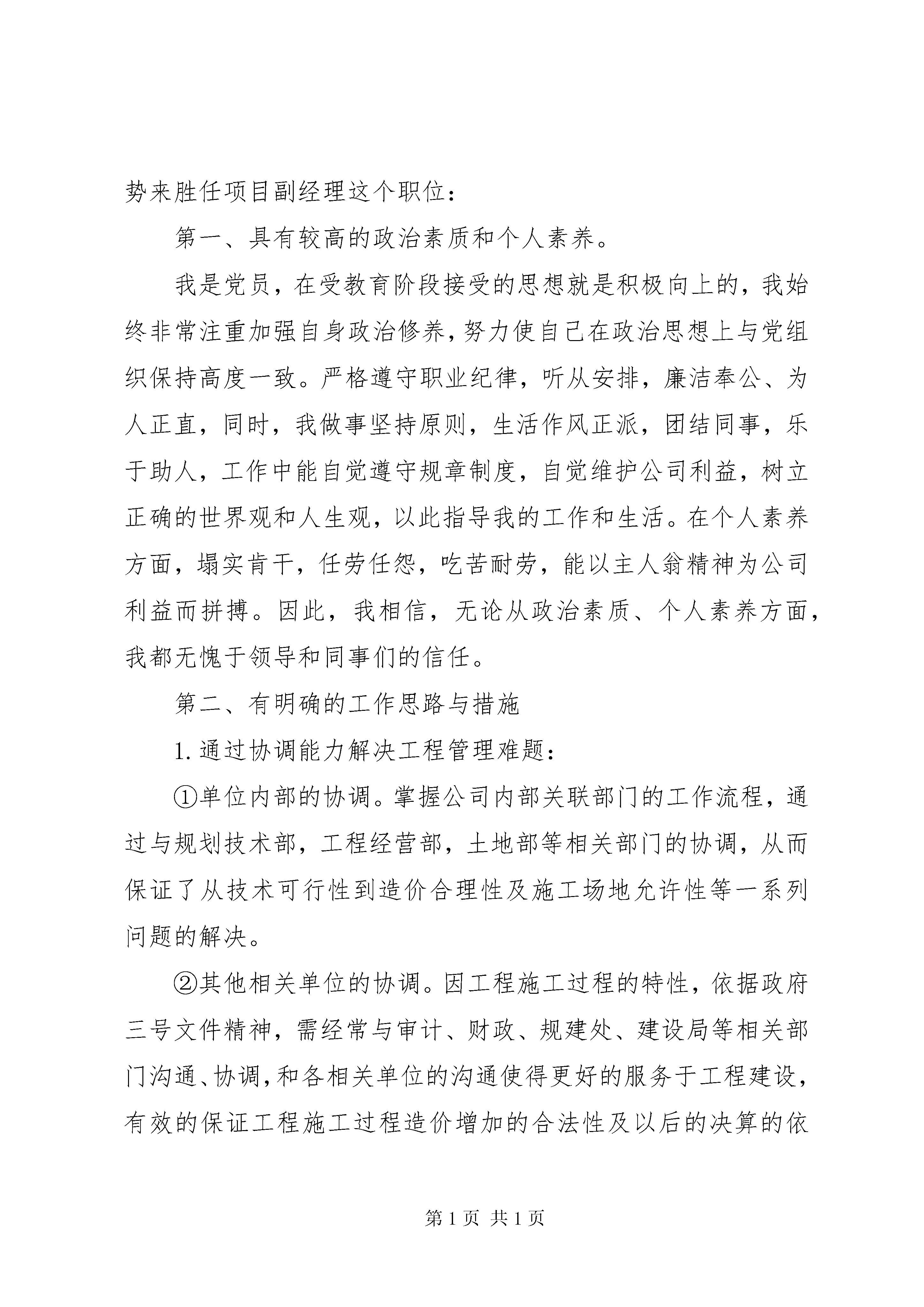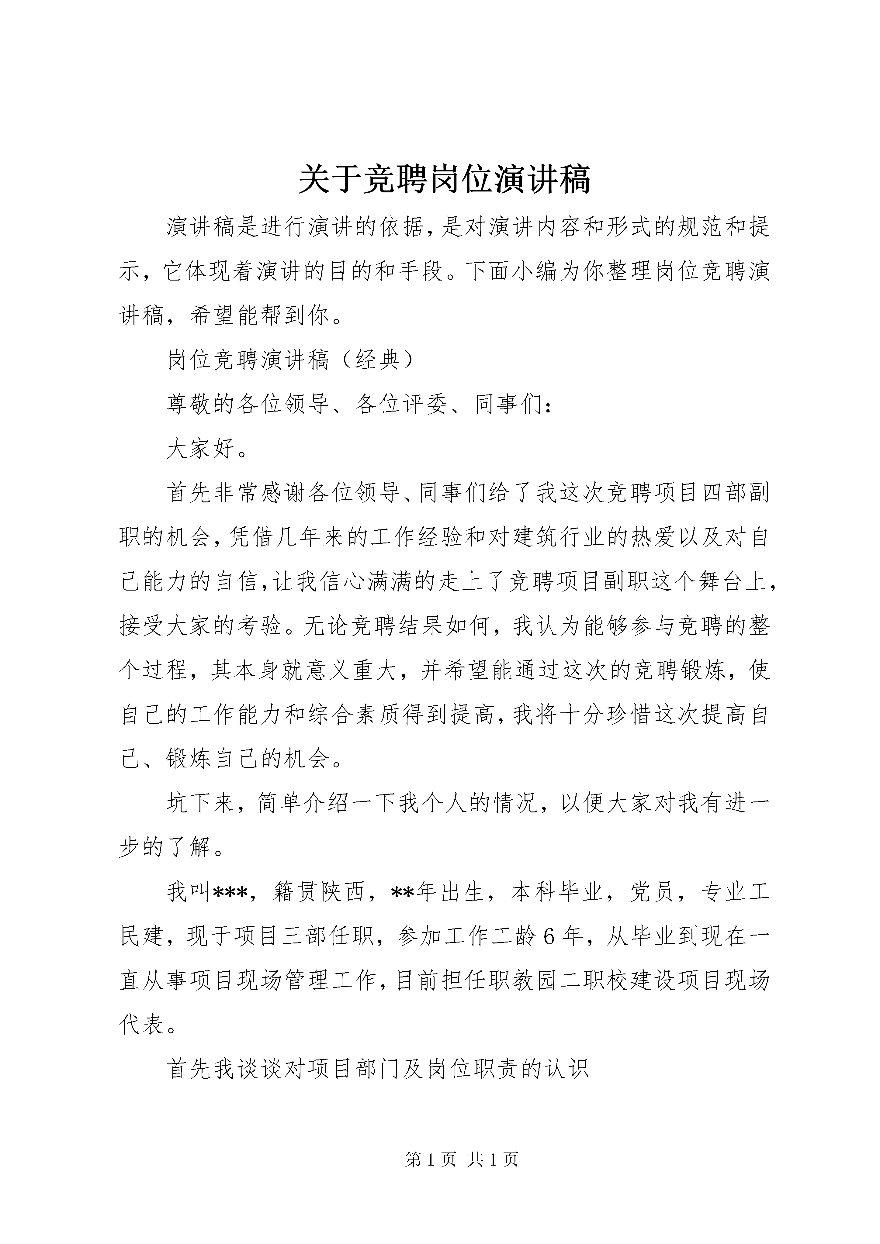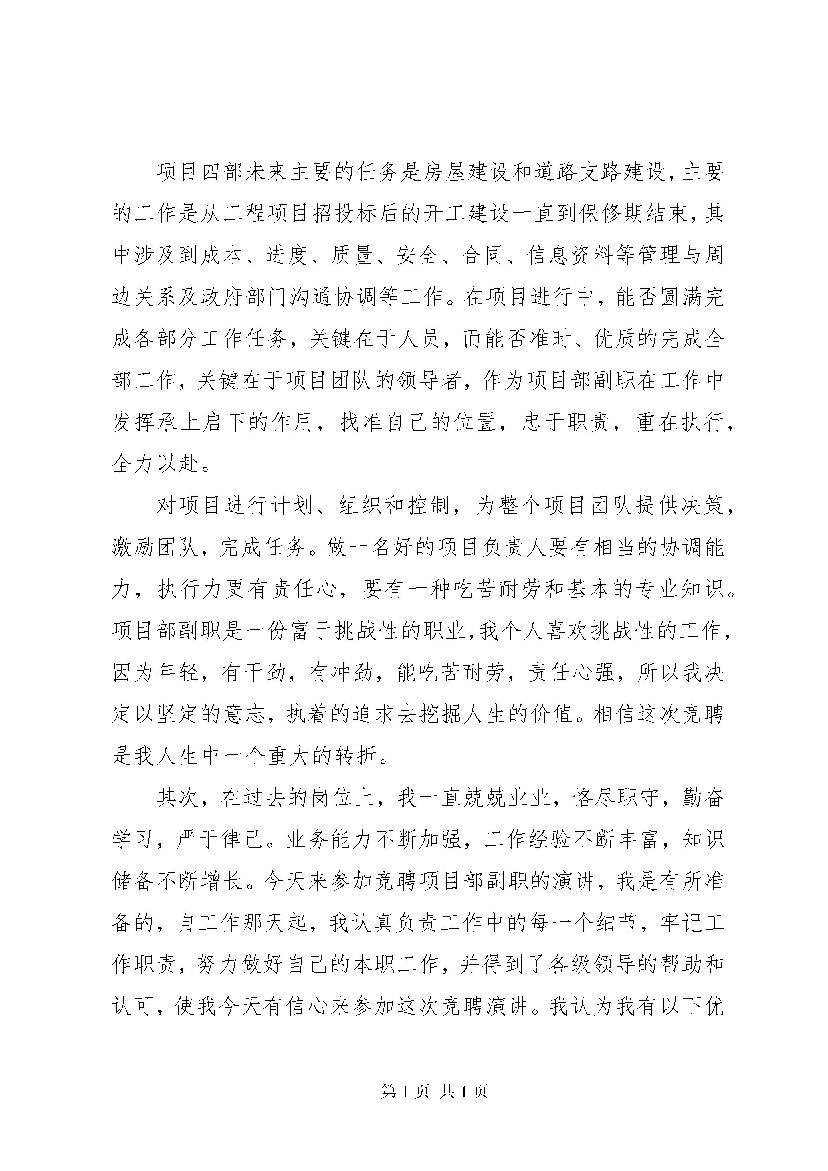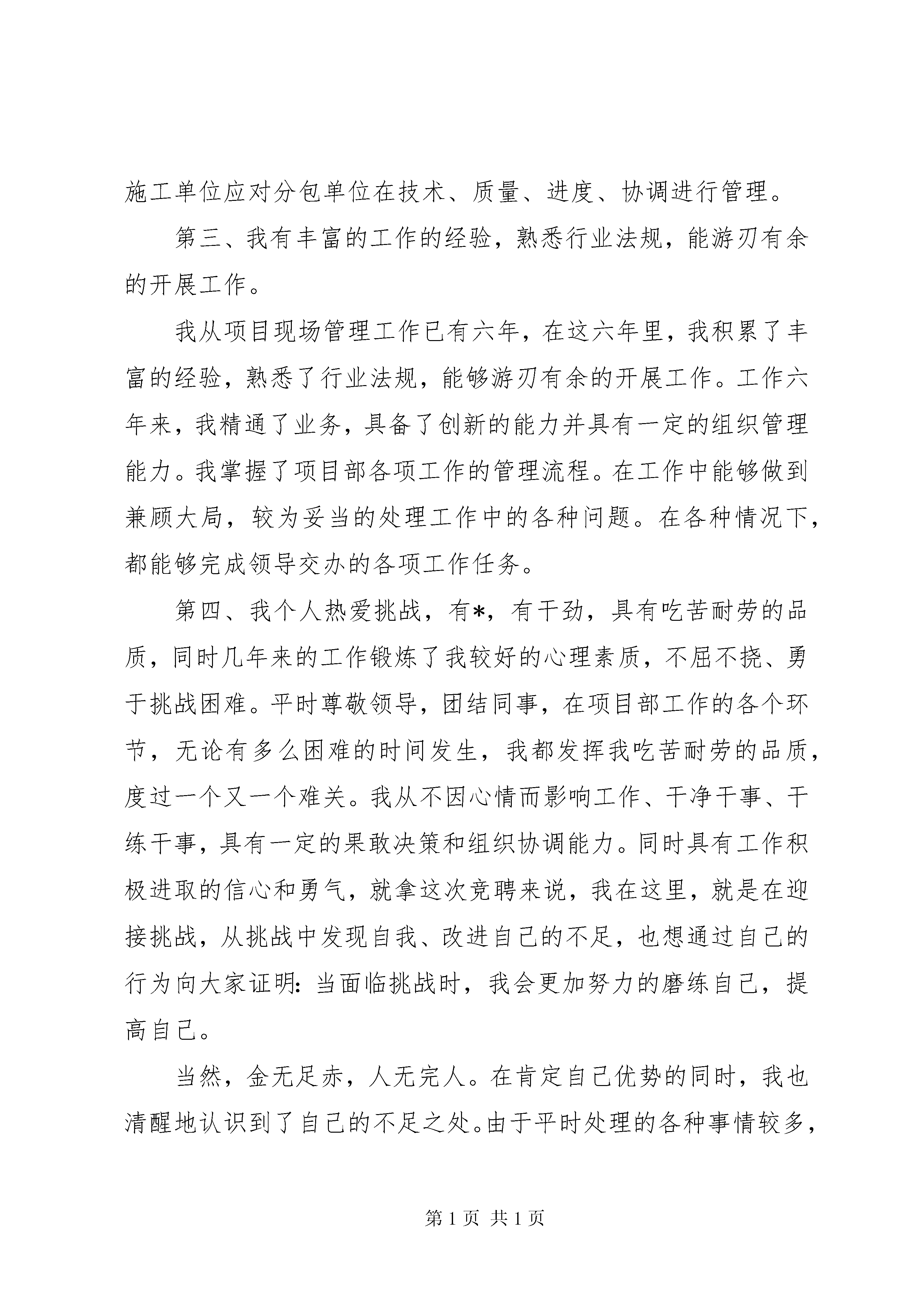 关于竞聘岗位演讲稿演讲稿是进行演讲的依据,是对演讲内容和形式的规范和提示,它体现着演讲的目的和手段。下面小编为你整理岗位竞聘演讲稿,希望能帮到你。岗位竞聘演讲稿(经典)尊敬的各位领导、各位评委、同事们:大家好。首先非常感谢各位领导、同事们给了我这次竞聘项目四部副职的机会,凭借几年来的工作经验和对建筑行业的热爱以及对自己能力的自信,让我信心满满的走上了竞聘项目副职这个舞台上,接受大家的考验。无论竞聘结果如何,我认为能够参与竞聘的整个过程,其本身就意义重大,并希望能通过这次的竞聘锻炼,使自己的工作能力和综合素质得到提高,我将十分珍惜这次提高自己、锻炼自己的机会。坑下来,简单介绍一下我个人的情况,以便大家对我有进一步的了解。我叫***,籍贯陕西,**年出生,本科毕业,党员,专业工民建,现于项目三部任职,参加工作工龄6年,从毕业到现在一直从事项目现场管理工作,目前担任职教园二职校建设项目现场代表。首先我谈谈对项目部门及岗位职责的认识项目四部未来主要的任务是房屋建设和道路支路建设,主要的工作是从工程项目招投标后的开工建设一直到保修期结束,其中涉及到成本、进度、质量、安全、合同、信息资料等管理与周边关系及政府部门沟通协调等工作。在项目进行中,能否圆满完成各部分工作任务,关键在于人员,而能否准时、优质的完成全部工作,关键在于项目团队的领导者,作为项目部副职在工作中发挥承上启下的作用,找准自己的位置,忠于职责,重在执行,全力以赴。对项目进行计划、组织和控制,为整个项目团队提供决策,激励团队,完成任务。做一名好的项目负责人要有相当的协调能力,执行力更有责任心,要有一种吃苦耐劳和基本的专业知识。项目部副职是一份富于挑战性的职业,我个人喜欢挑战性的工作,因为年轻,有干劲,有冲劲,能吃苦耐劳,责任心强,所以我决定以坚定的意志,执着的追求去挖掘人生的价值。相信这次竞聘是我人生中一个重大的转折。其次,在过去的岗位上,我一直兢兢业业,恪尽职守,勤奋学习,严于律己。业务能力不断加强,工作经验不断丰富,知识储备不断增长。今天来参加竞聘项目部副职的演讲,我是有所准备的,自工作那天起,我认真负责工作中的每一个细节,牢记工作职责,努力做好自己的本职工作,并得到了各级领导的帮助和认可,使我今天有信心来参加这次竞聘演讲。我认为我有以下优势来胜任项目副经理这个职位:第一、具有较高的政治素质和个人素养。我是党员,在受教育阶段接受的思想就是积极向上的,我始终非常注重加强自身政治修养,努力使自己在政治思想上与党组织保持高度一致。严格遵守职业纪律,听从安排,廉洁奉公、为人正直,同时,我做事坚持原则,生活作风正派,团结同事,乐于助人,工作中能自觉遵守规章制度,自觉维护公司利益,树立正确的世界观和人生观,以此指导我的工作和生活。在个人素养方面,塌实肯干,任劳任怨,吃苦耐劳,能以主人翁精神为公司利益而拼搏。因此,我相信,无论从政治素质、个人素养方面,我都无愧于领导和同事们的信任。第二、有明确的工作思路与措施1.通过协调能力解决工程管理难题:①单位内部的协调。掌握公司内部关联部门的工作流程,通过与规划技术部,工程经营部,土地部等相关部门的协调,从而保证了从技术可行性到造价合理性及施工场地允许性等一系列问题的解决。②其他相关单位的协调。因工程施工过程的特性,依据政府三号文件精神,需经常与审计、财政、规建处、建设局等相关部门沟通、协调,和各相关单位的沟通使得更好的服务于工程建设,有效的保证工程施工过程造价增加的合法性及以后的决算的依据性。③施工单位协调。参与工程建设的单位有地质勘察单位、设计单位、监理单位、总包单位、甲方分包单位、甲供材料供应单位、试验检测单位等好几十家,涉及的合同也好几十份,处理好甲方分包、甲供材料供应单位与总包单位的关系。同时还要处理好与施工单位的关系,除了监管与被监管的关系外,还有协作、配合的关系,可概括为监、帮、促的关系。甲方代表除了依照工程合同、图纸、规范对施工活动认真严格监督管理之外,对其施工中的实际困难应尽其所能给予帮助解决;对施工技术上的问题要当好参谋,对于施工单位的合法利益应给予保护。2.通过有效管理,推进项目又好、又快开展①加强对监理单位管理。工程施工过程中应以监理单位的管理为主,要求监理单位应熟悉图纸及现场情况,并为工程的质量、进度、投资控制负责。同时严格要求总监,要求总监按照监理合同、监理规划和实施细则执行,配齐相关人员,组织好监理例会的召开。②加强施工单位管理。(1)对施工管理,施工单位是在工作流程上、质量控质、进度控制上主要执行者。因此加强对施工单位的管理一定程度上起到了质量、进度流程等管理。特别是对项目经理的管理,要求项目经理按合同、规范及相关法律法规执行,在施工过程中要求施工单位应对分包单位在技术、质量、进度、协调进行