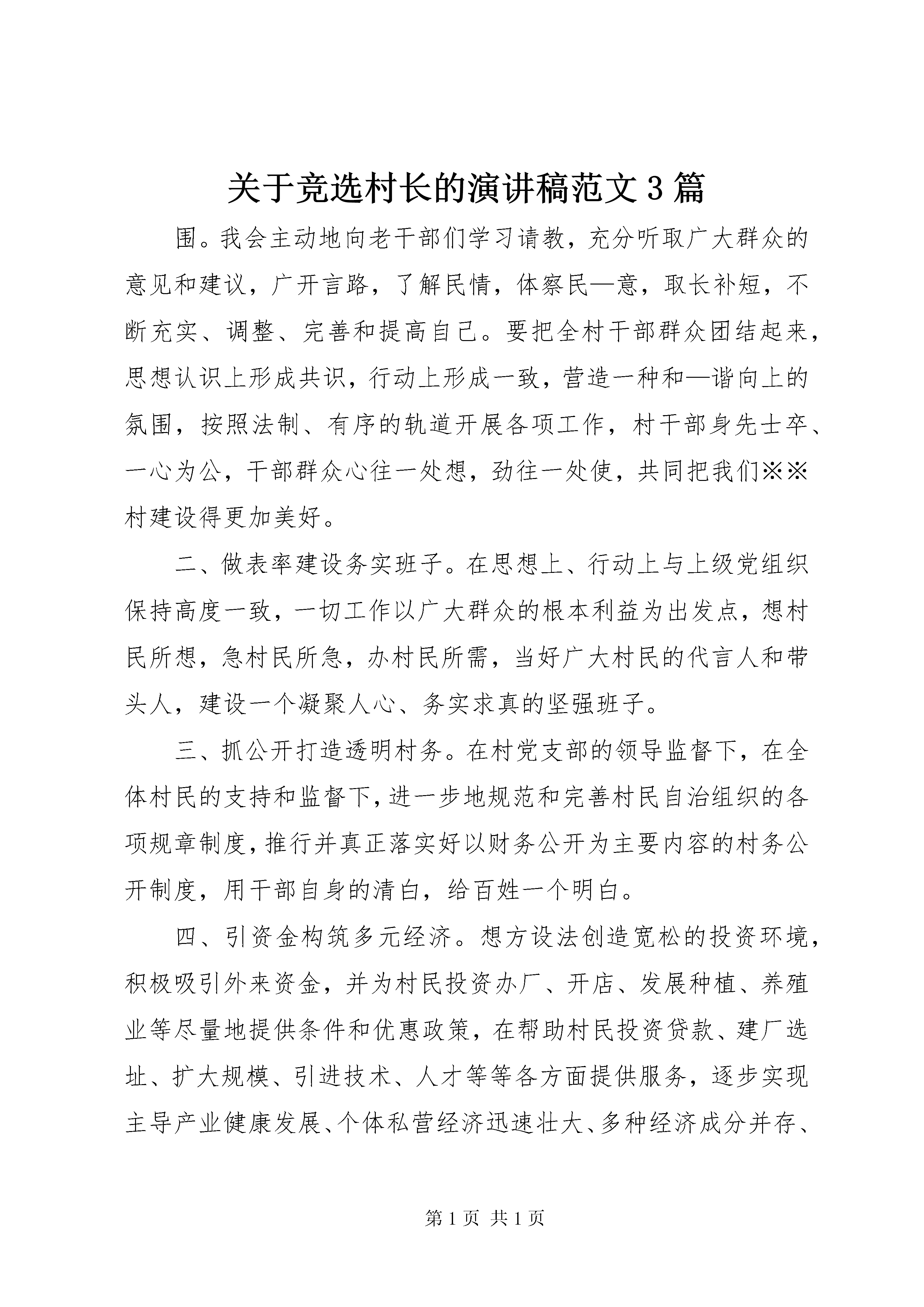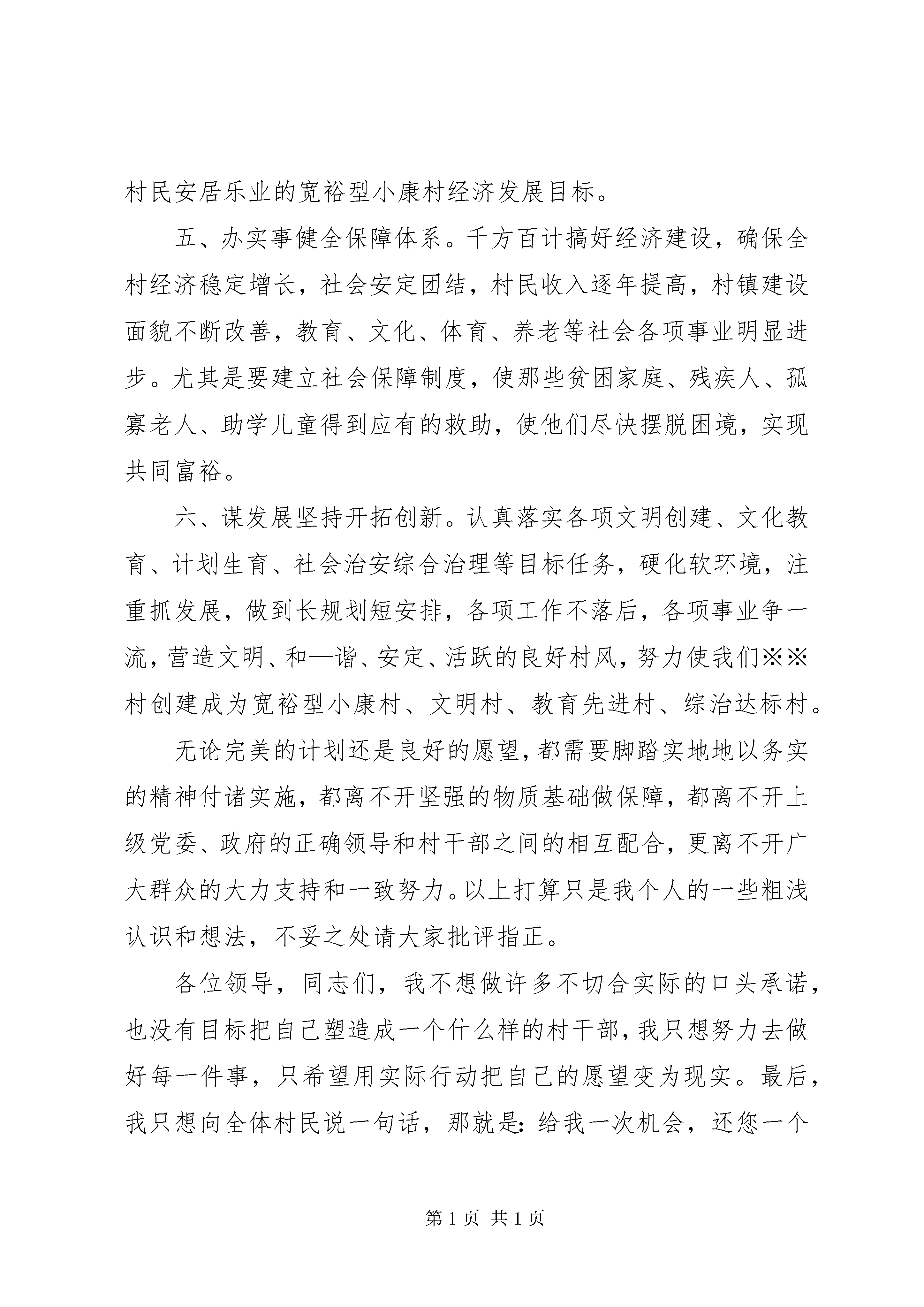 关于竞选村长的演讲稿范文3篇围。我会主动地向老干部们学习请教,充分听取广大群众的意见和建议,广开言路,了解民情,体察民—意,取长补短,不断充实、调整、完善和提高自己。要把全村干部群众团结起来,思想认识上形成共识,行动上形成一致,营造一种和—谐向上的氛围,按照法制、有序的轨道开展各项工作,村干部身先士卒、一心为公,干部群众心往一处想,劲往一处使,共同把我们※※村建设得更加美好。二、做表率建设务实班子。在思想上、行动上与上级党组织保持高度一致,一切工作以广大群众的根本利益为出发点,想村民所想,急村民所急,办村民所需,当好广大村民的代言人和带头人,建设一个凝聚人心、务实求真的坚强班子。三、抓公开打造透明村务。在村党支部的领导监督下,在全体村民的支持和监督下,进一步地规范和完善村民自治组织的各项规章制度,推行并真正落实好以财务公开为主要内容的村务公开制度,用干部自身的清白,给百姓一个明白。四、引资金构筑多元经济。想方设法创造宽松的投资环境,积极吸引外来资金,并为村民投资办厂、开店、发展种植、养殖业等尽量地提供条件和优惠政策,在帮助村民投资贷款、建厂选址、扩大规模、引进技术、人才等等各方面提供服务,逐步实现主导产业健康发展、个体私营经济迅速壮大、多种经济成分并存、村民安居乐业的宽裕型小康村经济发展目标。五、办实事健全保障体系。千方百计搞好经济建设,确保全村经济稳定增长,社会安定团结,村民收入逐年提高,村镇建设面貌不断改善,教育、文化、体育、养老等社会各项事业明显进步。尤其是要建立社会保障制度,使那些贫困家庭、残疾人、孤寡老人、助学儿童得到应有的救助,使他们尽快摆脱困境,实现共同富裕。六、谋发展坚持开拓创新。认真落实各项文明创建、文化教育、计划生育、社会治安综合治理等目标任务,硬化软环境,注重抓发展,做到长规划短安排,各项工作不落后,各项事业争一流,营造文明、和—谐、安定、活跃的良好村风,努力使我们※※村创建成为宽裕型小康村、文明村、教育先进村、综治达标村。无论完美的计划还是良好的愿望,都需要脚踏实地地以务实的精神付诸实施,都离不开坚强的物质基础做保障,都离不开上级党委、政府的正确领导和村干部之间的相互配合,更离不开广大群众的大力支持和一致努力。以上打算只是我个人的一些粗浅认识和想法,不妥之处请大家批评指正。各位领导,同志们,我不想做许多不切合实际的口头承诺,也没有目标把自己塑造成一个什么样的村干部,我只想努力去做好每一件事,只希望用实际行动把自己的愿望变为现实。最后,我只想向全体村民说一句话,那就是:给我一次机会,还您一个满意。谢谢大家。