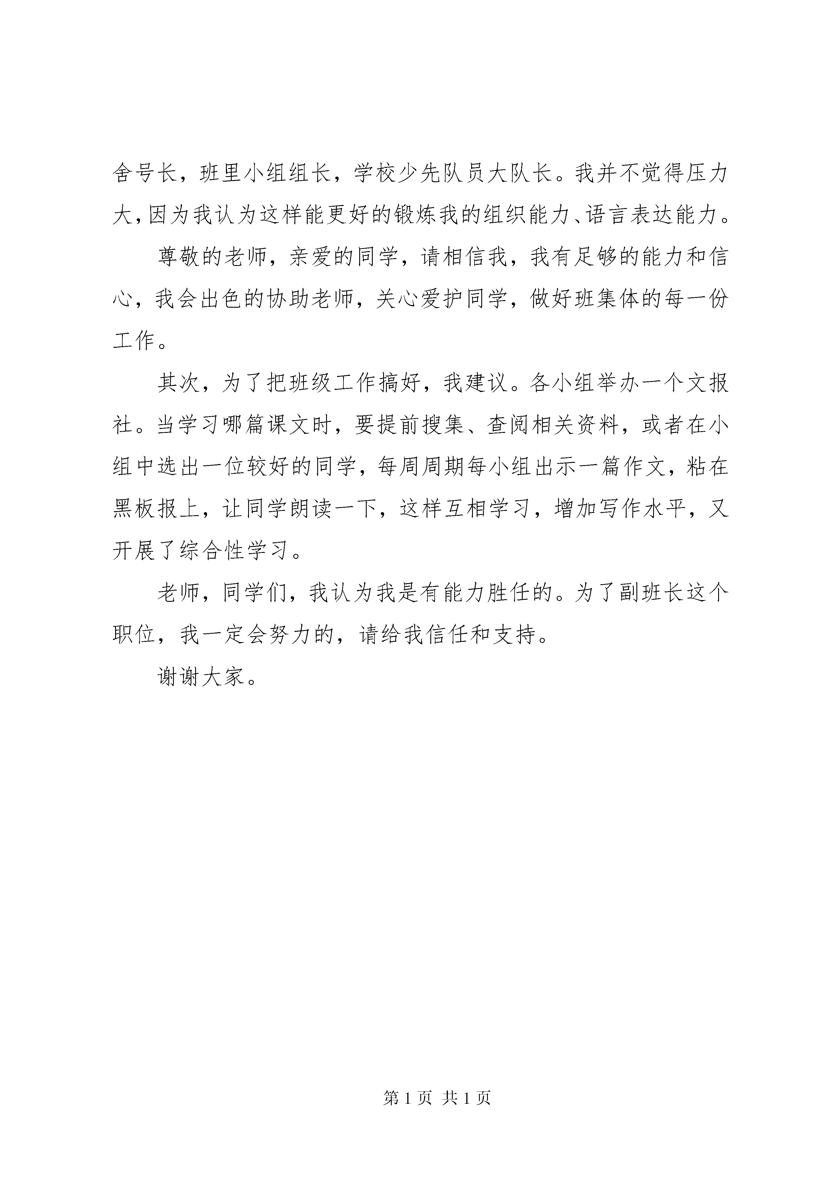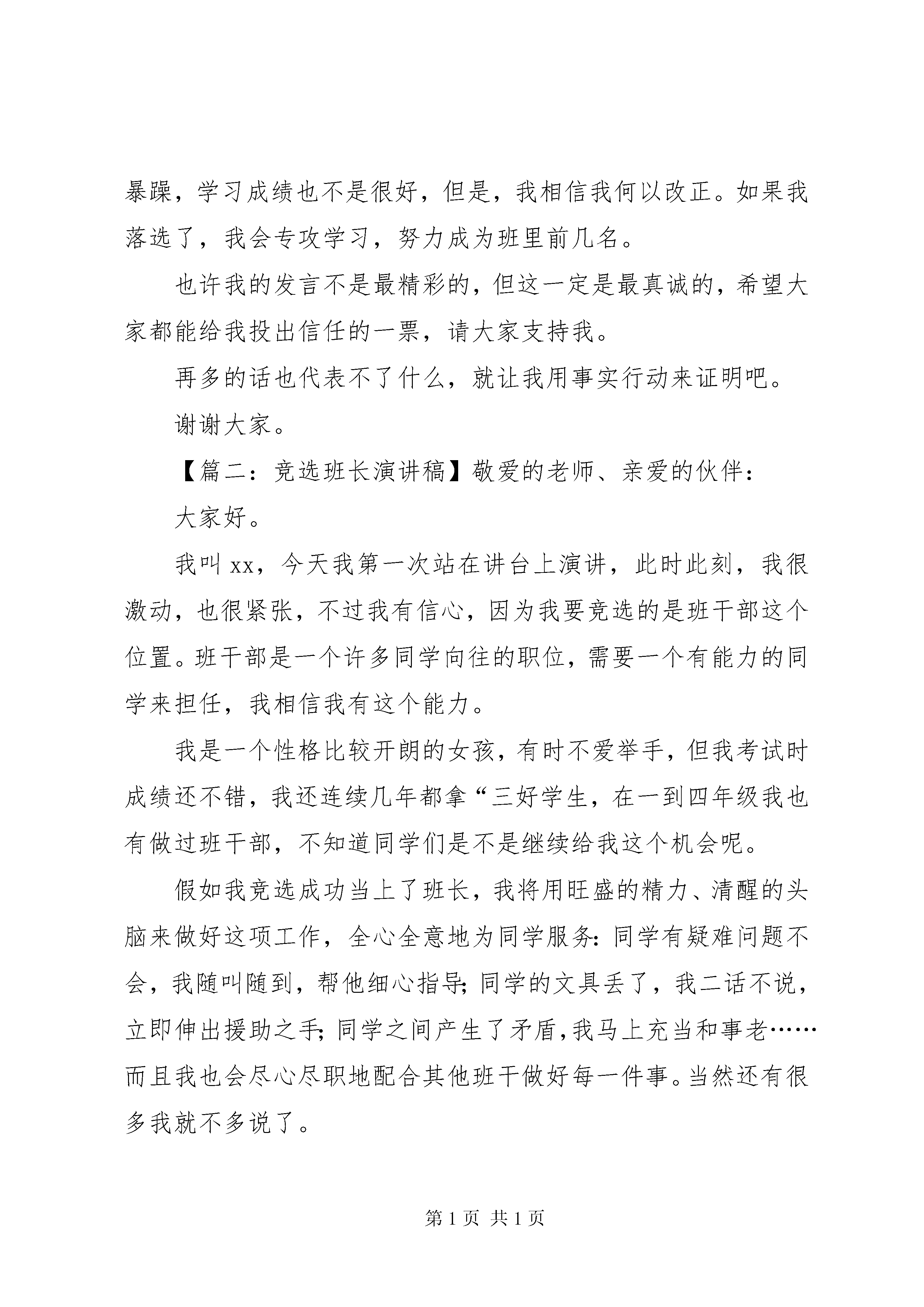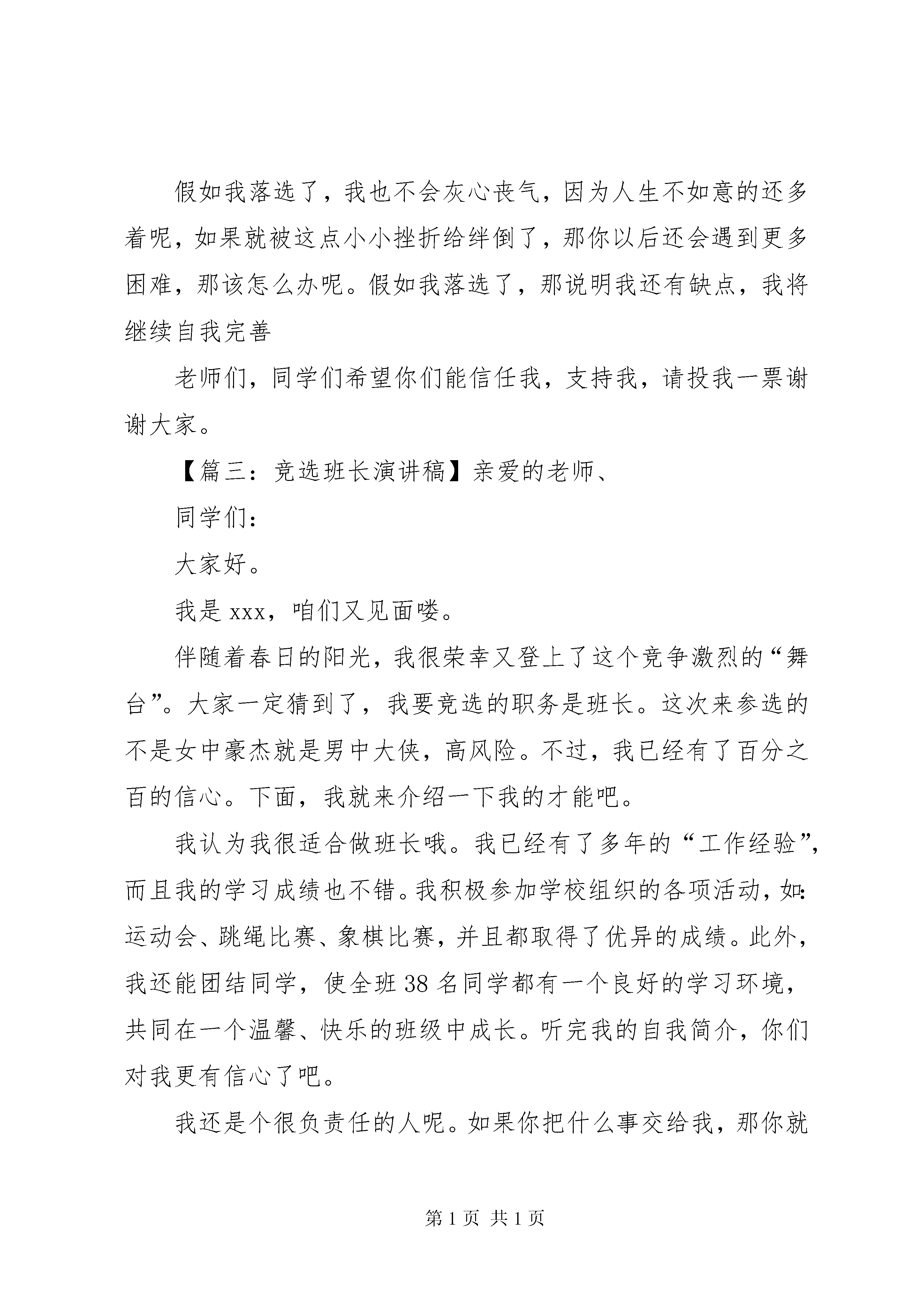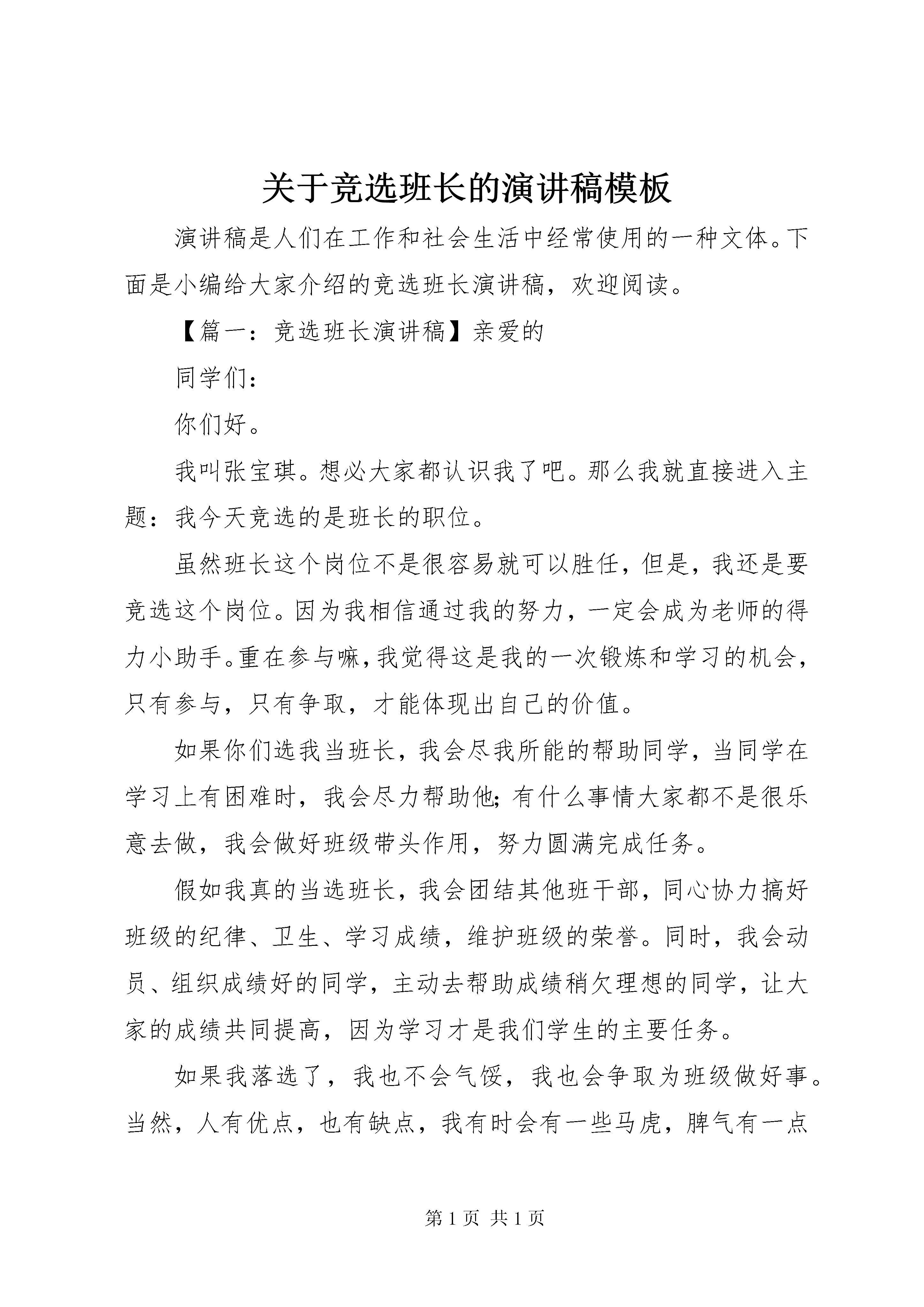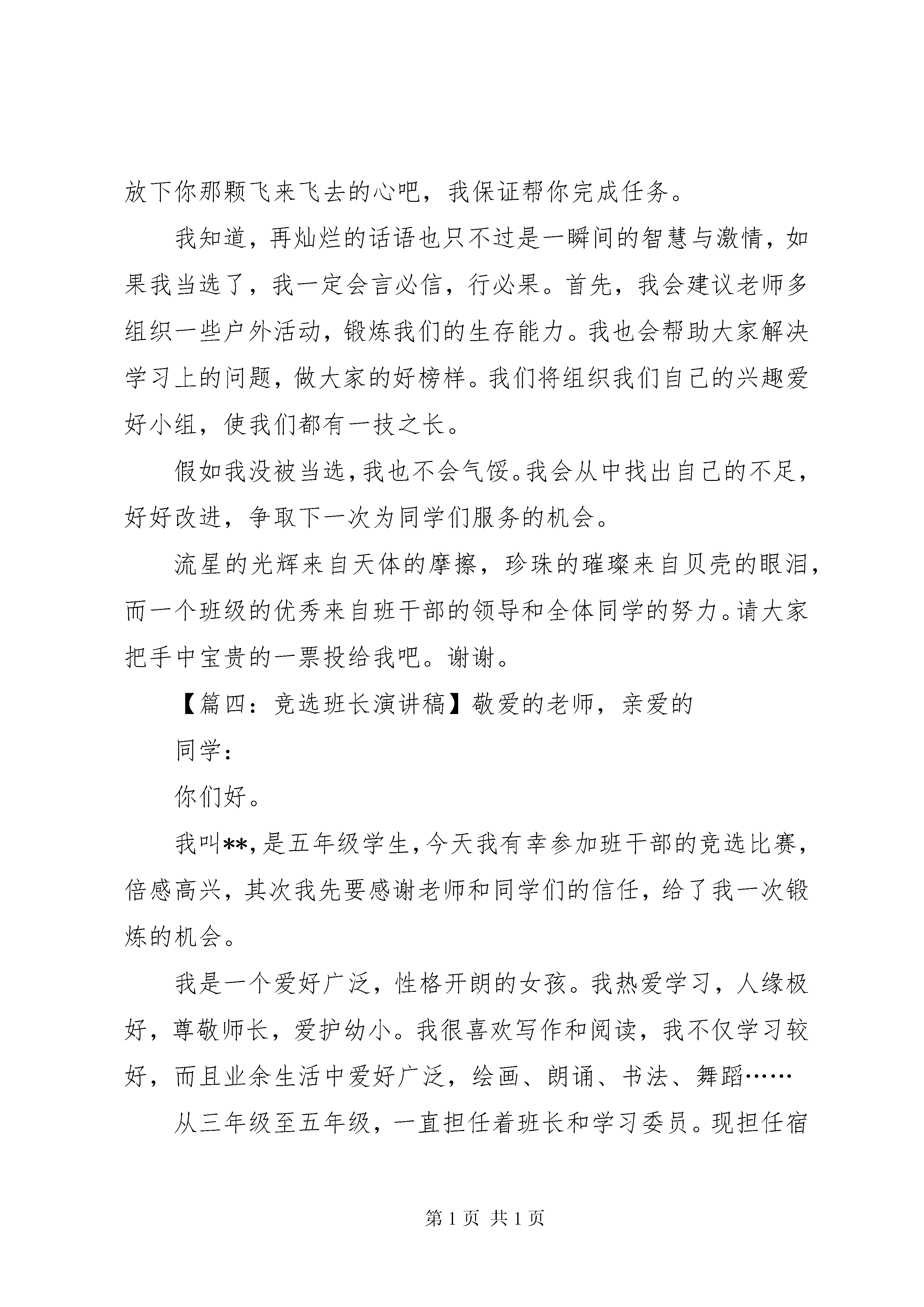 关于竞选班长的演讲稿模板演讲稿是人们在工作和社会生活中经常使用的一种文体。下面是小编给大家介绍的竞选班长演讲稿,欢迎阅读。【篇一:竞选班长演讲稿】亲爱的同学们:你们好。我叫张宝琪。想必大家都认识我了吧。那么我就直接进入主题:我今天竞选的是班长的职位。虽然班长这个岗位不是很容易就可以胜任,但是,我还是要竞选这个岗位。因为我相信通过我的努力,一定会成为老师的得力小助手。重在参与嘛,我觉得这是我的一次锻炼和学习的机会,只有参与,只有争取,才能体现出自己的价值。如果你们选我当班长,我会尽我所能的帮助同学,当同学在学习上有困难时,我会尽力帮助他;有什么事情大家都不是很乐意去做,我会做好班级带头作用,努力圆满完成任务。假如我真的当选班长,我会团结其他班干部,同心协力搞好班级的纪律、卫生、学习成绩,维护班级的荣誉。同时,我会动员、组织成绩好的同学,主动去帮助成绩稍欠理想的同学,让大家的成绩共同提高,因为学习才是我们学生的主要任务。如果我落选了,我也不会气馁,我也会争取为班级做好事。当然,人有优点,也有缺点,我有时会有一些马虎,脾气有一点暴躁,学习成绩也不是很好,但是,我相信我何以改正。如果我落选了,我会专攻学习,努力成为班里前几名。也许我的发言不是最精彩的,但这一定是最真诚的,希望大家都能给我投出信任的一票,请大家支持我。再多的话也代表不了什么,就让我用事实行动来证明吧。谢谢大家。【篇二:竞选班长演讲稿】敬爱的老师、亲爱的伙伴:大家好。我叫xx,今天我第一次站在讲台上演讲,此时此刻,我很激动,也很紧张,不过我有信心,因为我要竞选的是班干部这个位置。班干部是一个许多同学向往的职位,需要一个有能力的同学来担任,我相信我有这个能力。我是一个性格比较开朗的女孩,有时不爱举手,但我考试时成绩还不错,我还连续几年都拿“三好学生,在一到四年级我也有做过班干部,不知道同学们是不是继续给我这个机会呢。假如我竞选成功当上了班长,我将用旺盛的精力、清醒的头脑来做好这项工作,全心全意地为同学服务:同学有疑难问题不会,我随叫随到,帮他细心指导;同学的文具丢了,我二话不说,立即伸出援助之手;同学之间产生了矛盾,我马上充当和事老……而且我也会尽心尽职地配合其他班干做好每一件事。当然还有很多我就不多说了。假如我落选了,我也不会灰心丧气,因为人生不如意的还多着呢,如果就被这点小小挫折给绊倒了,那你以后还会遇到更多困难,那该怎么办呢。假如我落选了,那说明我还有缺点,我将继续自我完善老师们,同学们希望你们能信任我,支持我,请投我一票谢谢大家。【篇三:竞选班长演讲稿】亲爱的老师、同学们:大家好。我是xxx,咱们又见面喽。伴随着春日的阳光,我很荣幸又登上了这个竞争激烈的“舞台”。大家一定猜到了,我要竞选的职务是班长。这次来参选的不是女中豪杰就是男中大侠,高风险。不过,我已经有了百分之百的信心。下面,我就来介绍一下我的才能吧。我认为我很适合做班长哦。我已经有了多年的“工作经验”,而且我的学习成绩也不错。我积极参加学校组织的各项活动,如:运动会、跳绳比赛、象棋比赛,并且都取得了优异的成绩。此外,我还能团结同学,使全班38名同学都有一个良好的学习环境,共同在一个温馨、快乐的班级中成长。听完我的自我简介,你们对我更有信心了吧。我还是个很负责任的人呢。如果你把什么事交给我,那你就放下你那颗飞来飞去的心吧,我保证帮你完成任务。我知道,再灿烂的话语也只不过是一瞬间的智慧与激情,如果我当选了,我一定会言必信,行必果。首先,我会建议老师多组织一些户外活动,锻炼我们的生存能力。我也会帮助大家解决学习上的问题,做大家的好榜样。我们将组织我们自己的兴趣爱好小组,使我们都有一技之长。假如我没被当选,我也不会气馁。我会从中找出自己的不足,好好改进,争取下一次为同学们服务的机会。流星的光辉来自天体的摩擦,珍珠的璀璨来自贝壳的眼泪,而一个班级的优秀来自班干部的领导和全体同学的努力。请大家把手中宝贵的一票投给我吧。谢谢。【篇四:竞选班长演讲稿】敬爱的老师,亲爱的同学:你们好。我叫**,是五年级学生,今天我有幸参加班干部的竞选比赛,倍感高兴,其次我先要感谢老师和同学们的信任,给了我一次锻炼的机会。我是一个爱好广泛,性格开朗的女孩。我热爱学习,人缘极好,尊敬师长,爱护幼小。我很喜欢写作和阅读,我不仅学习较好,而且业余生活中爱好广泛,绘画、朗诵、书法、舞蹈……从三年级至五年级,一直担任着班长和学习委员。现担任宿舍号长,班里小组组长,学校少先队员大队长。我并不觉得压力大,因为我认为这样能更好的锻炼我的组织能力、语言表达能力。尊敬的老师,亲爱的同学,请相信我,我有足够的能力和信心,我会出色的协助老师,关心爱护同学,做好班集体的每一份工作。其次,为了把班级工作搞好,我建议。各小组举办一个文报社。当学习