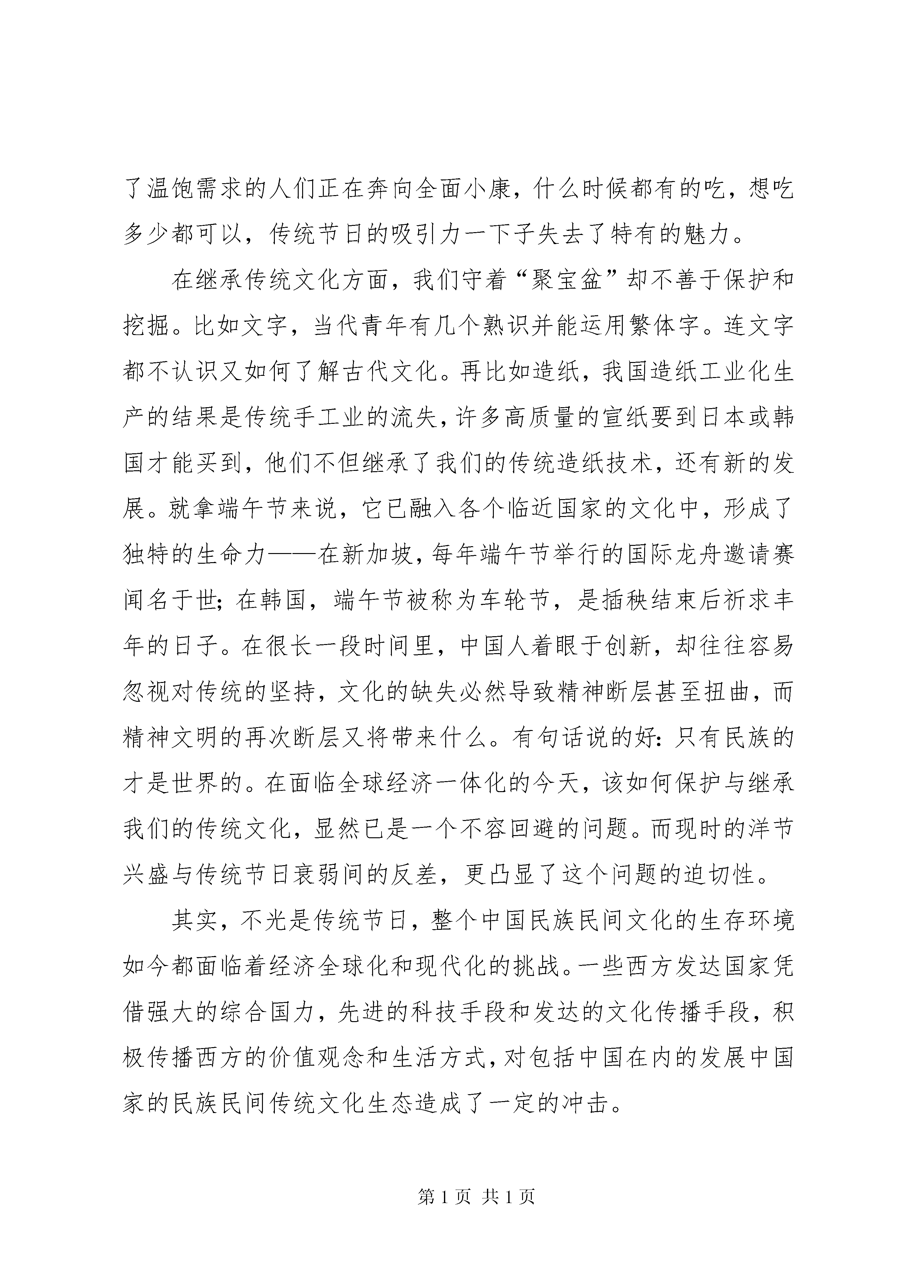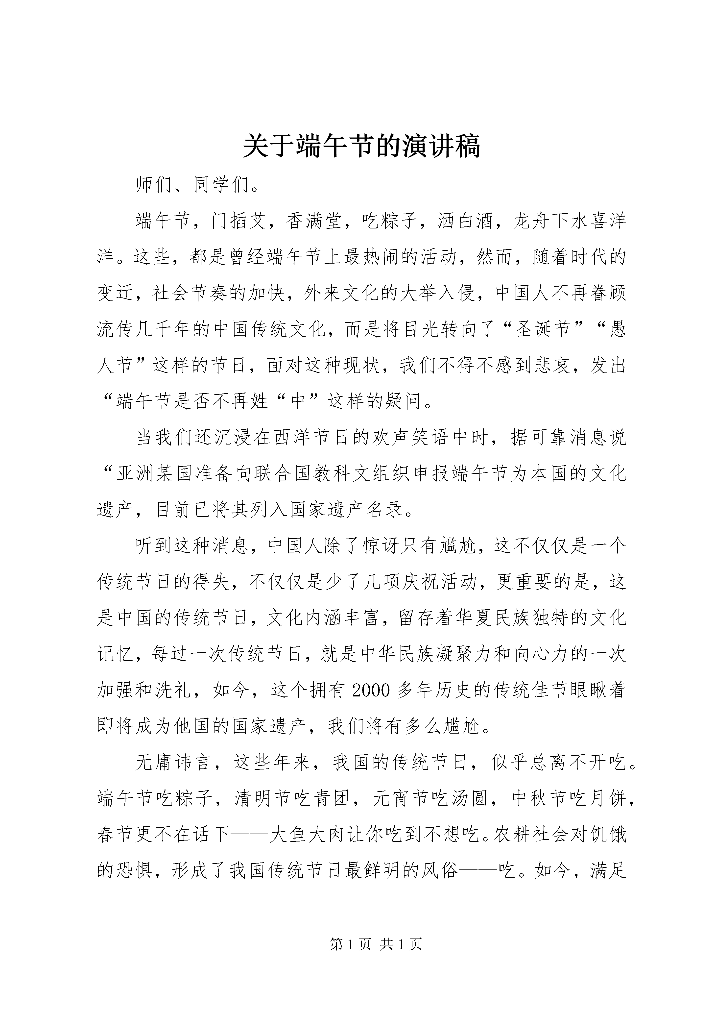 关于端午节的演讲稿师们、同学们。端午节,门插艾,香满堂,吃粽子,洒白酒,龙舟下水喜洋洋。这些,都是曾经端午节上最热闹的活动,然而,随着时代的变迁,社会节奏的加快,外来文化的大举入侵,中国人不再眷顾流传几千年的中国传统文化,而是将目光转向了“圣诞节”“愚人节”这样的节日,面对这种现状,我们不得不感到悲哀,发出“端午节是否不再姓“中”这样的疑问。当我们还沉浸在西洋节日的欢声笑语中时,据可靠消息说“亚洲某国准备向联合国教科文组织申报端午节为本国的文化遗产,目前已将其列入国家遗产名录。听到这种消息,中国人除了惊讶只有尴尬,这不仅仅是一个传统节日的得失,不仅仅是少了几项庆祝活动,更重要的是,这是中国的传统节日,文化内涵丰富,留存着华夏民族独特的文化记忆,每过一次传统节日,就是中华民族凝聚力和向心力的一次加强和洗礼,如今,这个拥有2000多年历史的传统佳节眼瞅着即将成为他国的国家遗产,我们将有多么尴尬。无庸讳言,这些年来,我国的传统节日,似乎总离不开吃。端午节吃粽子,清明节吃青团,元宵节吃汤圆,中秋节吃月饼,春节更不在话下——大鱼大肉让你吃到不想吃。农耕社会对饥饿的恐惧,形成了我国传统节日最鲜明的风俗——吃。如今,满足了温饱需求的人们正在奔向全面小康,什么时候都有的吃,想吃多少都可以,传统节日的吸引力一下子失去了特有的魅力。在继承传统文化方面,我们守着“聚宝盆”却不善于保护和挖掘。比如文字,当代青年有几个熟识并能运用繁体字。连文字都不认识又如何了解古代文化。再比如造纸,我国造纸工业化生产的结果是传统手工业的流失,许多高质量的宣纸要到日本或韩国才能买到,他们不但继承了我们的传统造纸技术,还有新的发展。就拿端午节来说,它已融入各个临近国家的文化中,形成了独特的生命力——在新加坡,每年端午节举行的国际龙舟邀请赛闻名于世;在韩国,端午节被称为车轮节,是插秧结束后祈求丰年的日子。在很长一段时间里,中国人着眼于创新,却往往容易忽视对传统的坚持,文化的缺失必然导致精神断层甚至扭曲,而精神文明的再次断层又将带来什么。有句话说的好:只有民族的才是世界的。在面临全球经济一体化的今天,该如何保护与继承我们的传统文化,显然已是一个不容回避的问题。而现时的洋节兴盛与传统节日衰弱间的反差,更凸显了这个问题的迫切性。其实,不光是传统节日,整个中国民族民间文化的生存环境如今都面临着经济全球化和现代化的挑战。一些西方发达国家凭借强大的综合国力,先进的科技手段和发达的文化传播手段,积极传播西方的价值观念和生活方式,对包括中国在内的发展中国家的民族民间传统文化生态造成了一定的冲击。中国的传统节日五彩缤纷,文化内涵丰厚,留存着人类独特的文化记忆,对祖先创造的历史文化遗存,必须怀有敬畏之心,必须高度重视。我们是中华民族的栋梁之才,中华文明需要我们共同传承。同学们,不要冷落了中国自己的传统节日,让华夏文明在中国彻彻底底的红火起来吧。
