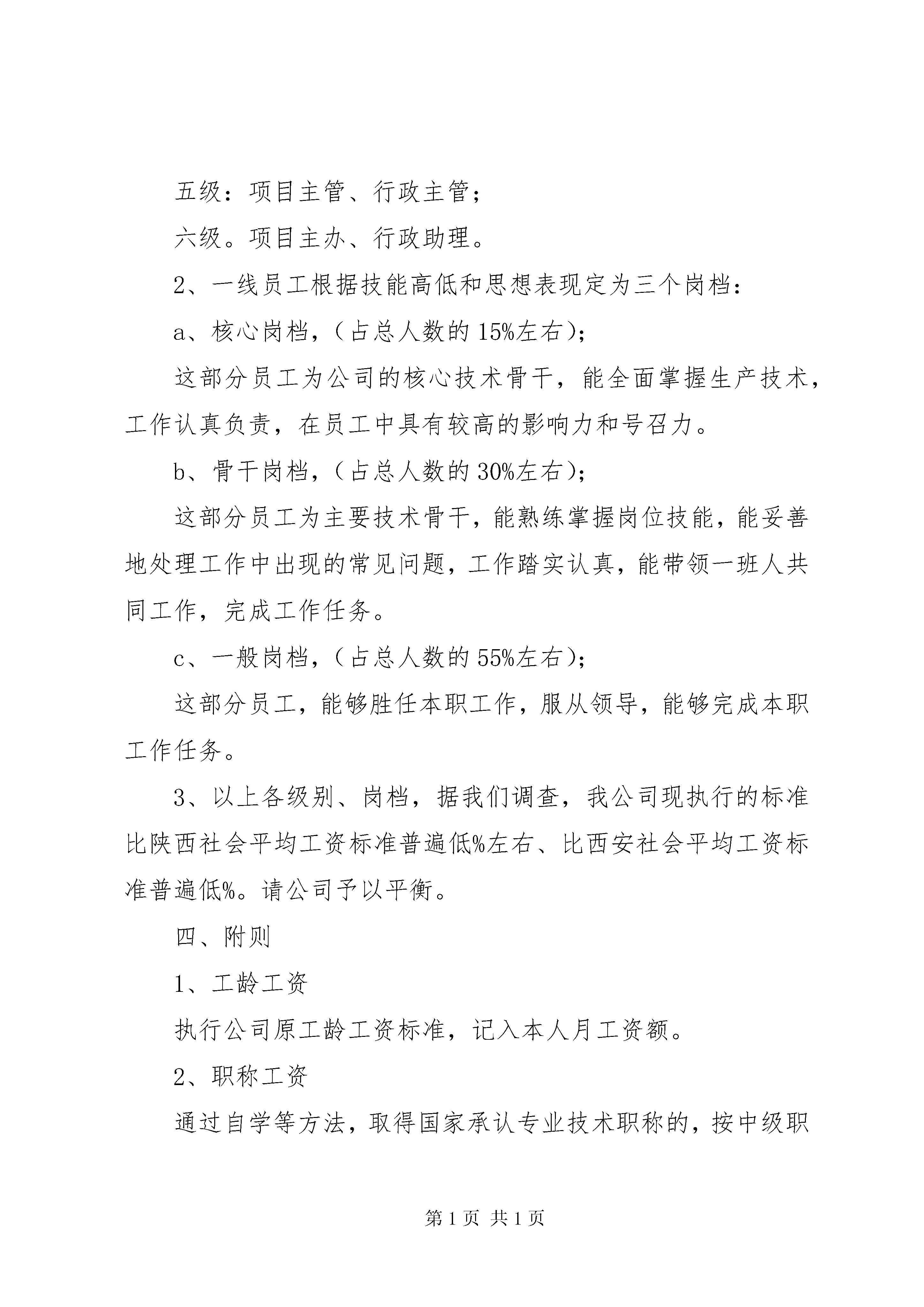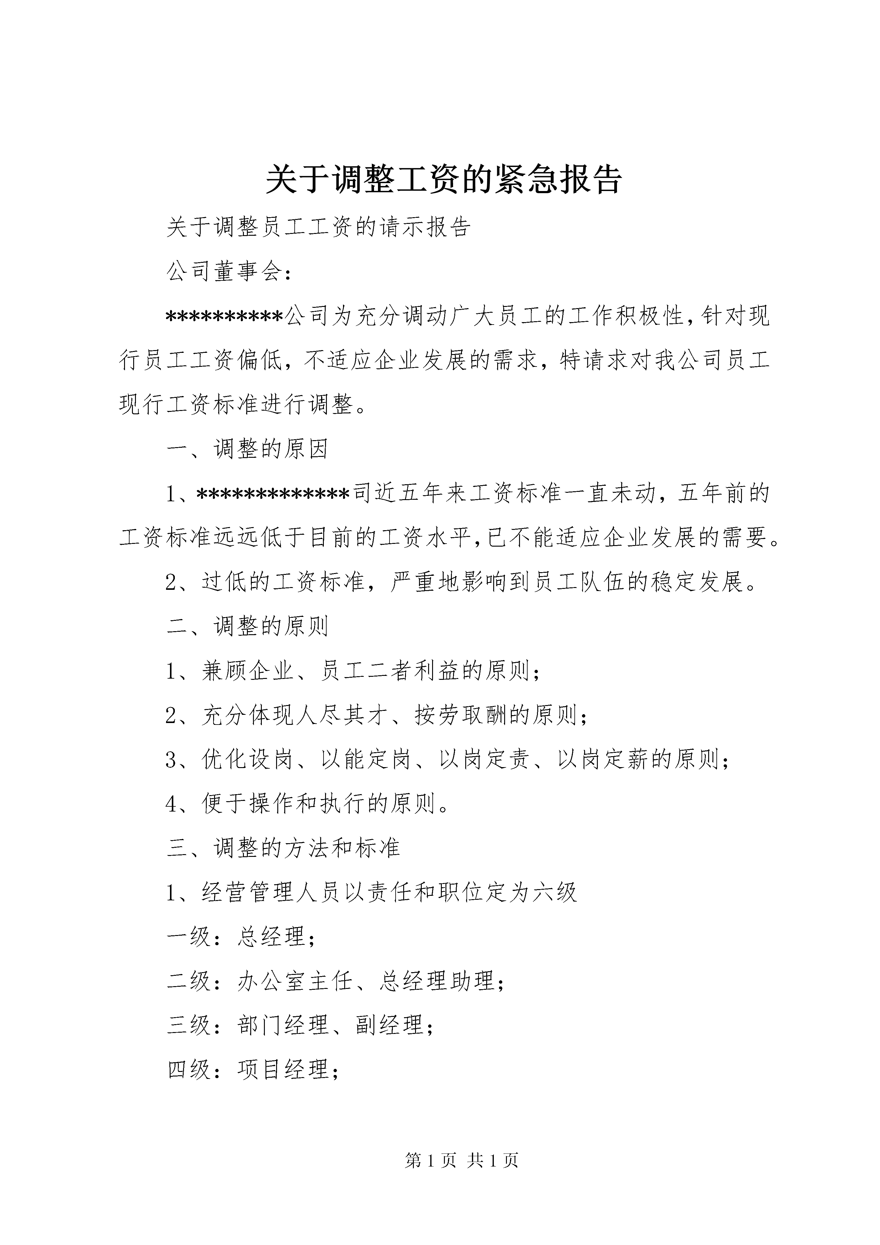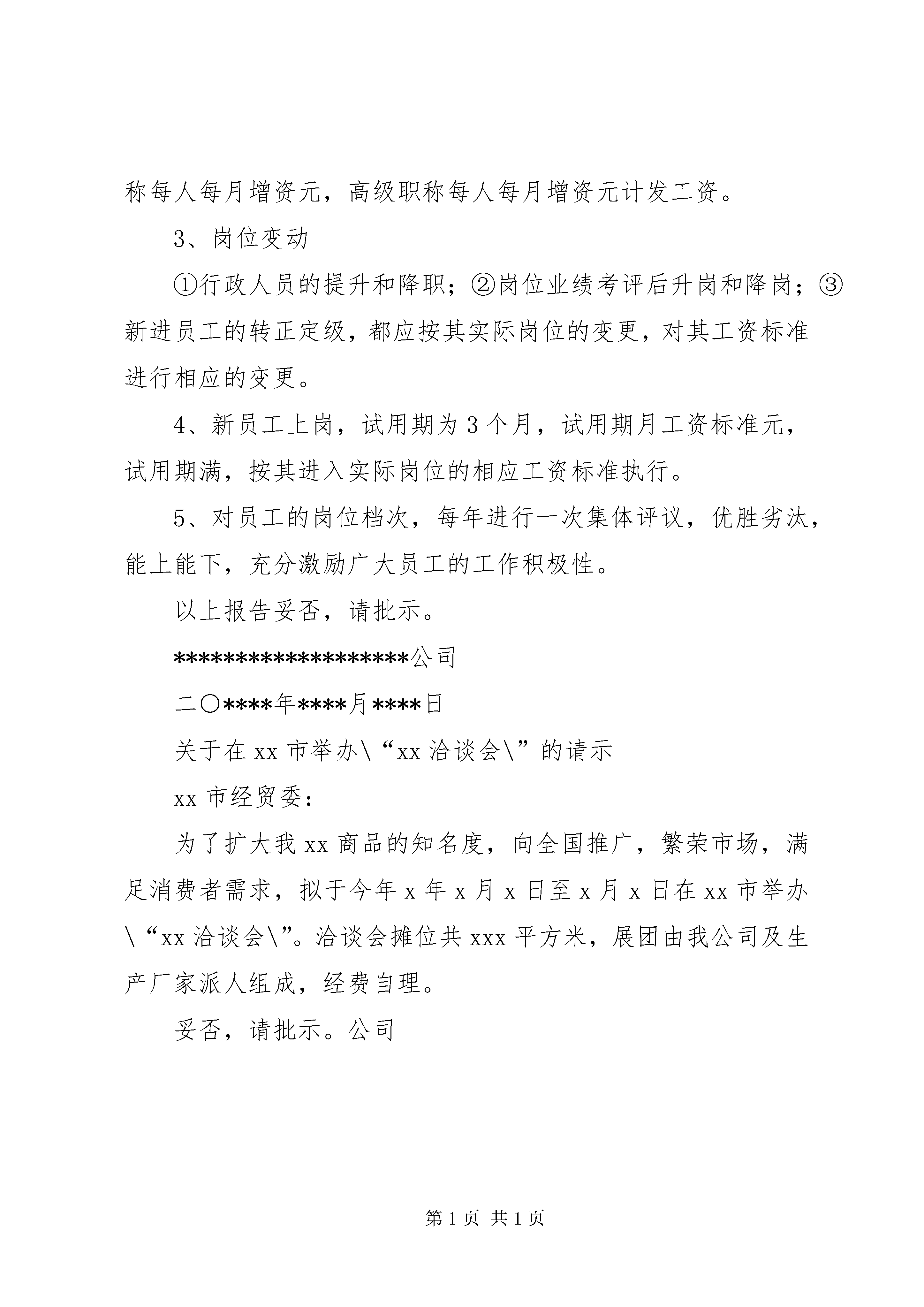 关于调整工资的紧急报告关于调整员工工资的请示报告公司董事会:**********公司为充分调动广大员工的工作积极性,针对现行员工工资偏低,不适应企业发展的需求,特请求对我公司员工现行工资标准进行调整。一、调整的原因1、*************司近五年来工资标准一直未动,五年前的工资标准远远低于目前的工资水平,已不能适应企业发展的需要。2、过低的工资标准,严重地影响到员工队伍的稳定发展。二、调整的原则1、兼顾企业、员工二者利益的原则;2、充分体现人尽其才、按劳取酬的原则;3、优化设岗、以能定岗、以岗定责、以岗定薪的原则;4、便于操作和执行的原则。三、调整的方法和标准1、经营管理人员以责任和职位定为六级一级:总经理;二级:办公室主任、总经理助理;三级:部门经理、副经理;四级:项目经理;五级:项目主管、行政主管;六级。项目主办、行政助理。2、一线员工根据技能高低和思想表现定为三个岗档:a、核心岗档,(占总人数的15%左右);这部分员工为公司的核心技术骨干,能全面掌握生产技术,工作认真负责,在员工中具有较高的影响力和号召力。b、骨干岗档,(占总人数的30%左右);这部分员工为主要技术骨干,能熟练掌握岗位技能,能妥善地处理工作中出现的常见问题,工作踏实认真,能带领一班人共同工作,完成工作任务。c、一般岗档,(占总人数的55%左右);这部分员工,能够胜任本职工作,服从领导,能够完成本职工作任务。3、以上各级别、岗档,据我们调查,我公司现执行的标准比陕西社会平均工资标准普遍低%左右、比西安社会平均工资标准普遍低%。请公司予以平衡。四、附则1、工龄工资执行公司原工龄工资标准,记入本人月工资额。2、职称工资通过自学等方法,取得国家承认专业技术职称的,按中级职称每人每月增资元,高级职称每人每月增资元计发工资。3、岗位变动①行政人员的提升和降职;②岗位业绩考评后升岗和降岗;③新进员工的转正定级,都应按其实际岗位的变更,对其工资标准进行相应的变更。4、新员工上岗,试用期为3个月,试用期月工资标准元,试用期满,按其进入实际岗位的相应工资标准执行。5、对员工的岗位档次,每年进行一次集体评议,优胜劣汰,能上能下,充分激励广大员工的工作积极性。以上报告妥否,请批示。*******************公司二○****年****月****日关于在xx市举办\“xx洽谈会\”的请示xx市经贸委:为了扩大我xx商品的知名度,向全国推广,繁荣市场,满足消费者需求,拟于今年x年x月x日至x月x日在xx市举办\“xx洽谈会\”。洽谈会摊位共xxx平方米,展团由我公司及生产厂家派人组成,经费自理。妥否,请批示。公司