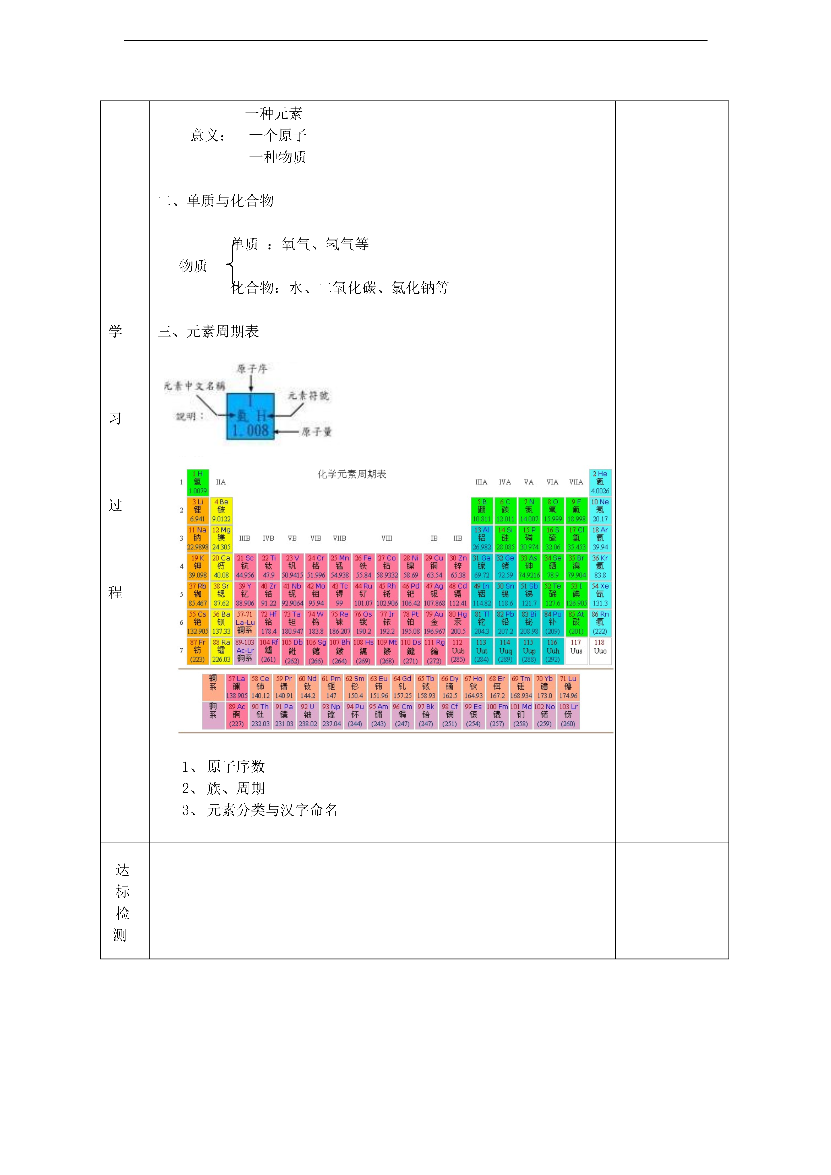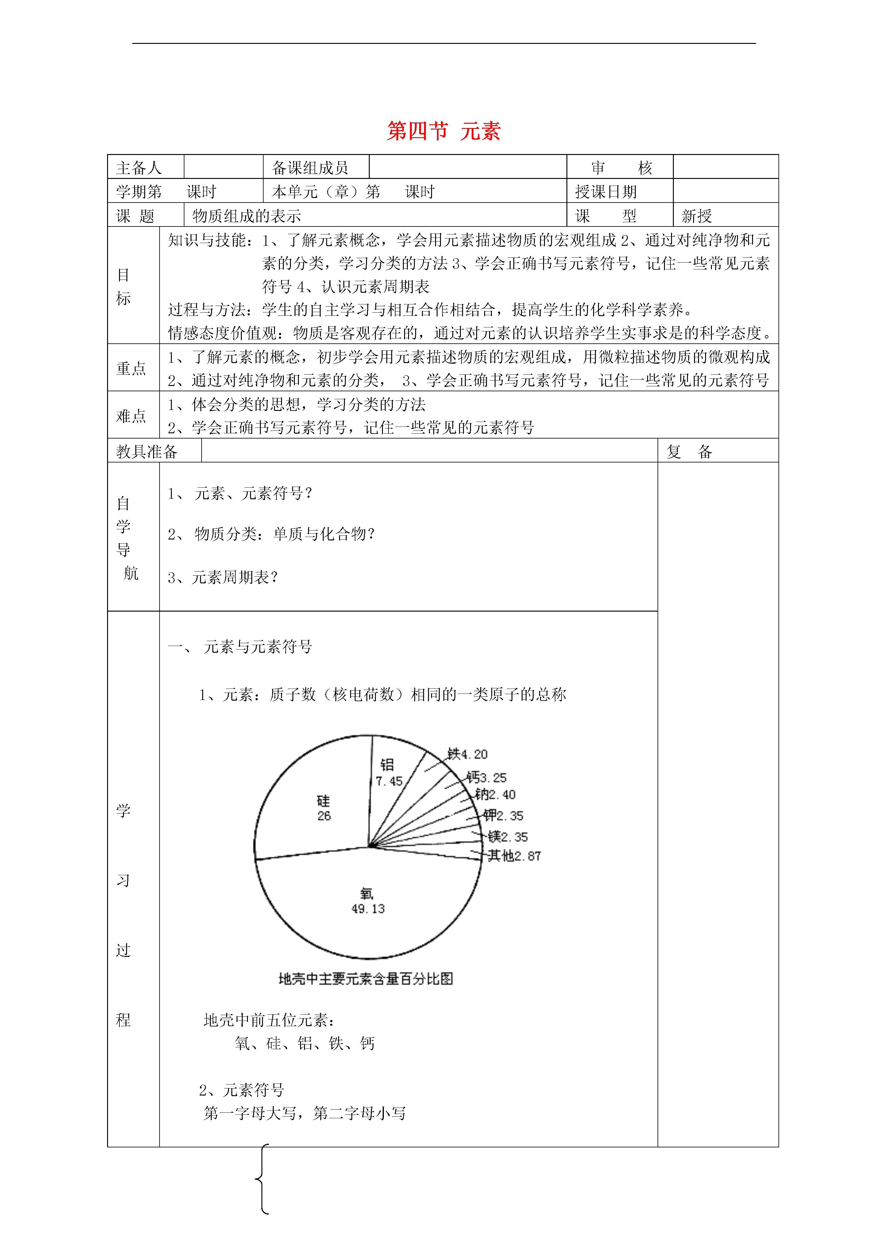 第四节元素主备人备课组成员审核学期第课时本单元(章)第课时授课日期课题物质组成的表示课型新授目标知识与技能:1、了解元素概念,学会用元素描述物质的宏观组成2、通过对纯净物和元素的分类,学习分类的方法3、学会正确书写元素符号,记住一些常见元素符号4、认识元素周期表过程与方法:学生的自主学习与相互合作相结合,提高学生的化学科学素养。情感态度价值观:物质是客观存在的,通过对元素的认识培养学生实事求是的科学态度。重点1、了解元素的概念,初步学会用元素描述物质的宏观组成,用微粒描述物质的微观构成2、通过对纯净物和元素的分类,3、学会正确书写元素符号,记住一些常见的元素符号难点1、体会分类的思想,学习分类的方法2、学会正确书写元素符号,记住一些常见的元素符号教具准备复备自学导航元素、元素符号?物质分类:单质与化合物?3、元素周期表?学习过程学习过程元素与元素符号1、元素:质子数(核电荷数)相同的一类原子的总称地壳中前五位元素:氧、硅、铝、铁、钙2、元素符号第一字母大写,第二字母小写一种元素意义:一个原子一种物质二、单质与化合物单质:氧气、氢气等物质化合物:水、二氧化碳、氯化钠等三、元素周期表原子序数族、周期元素分类与汉字命名达标检测