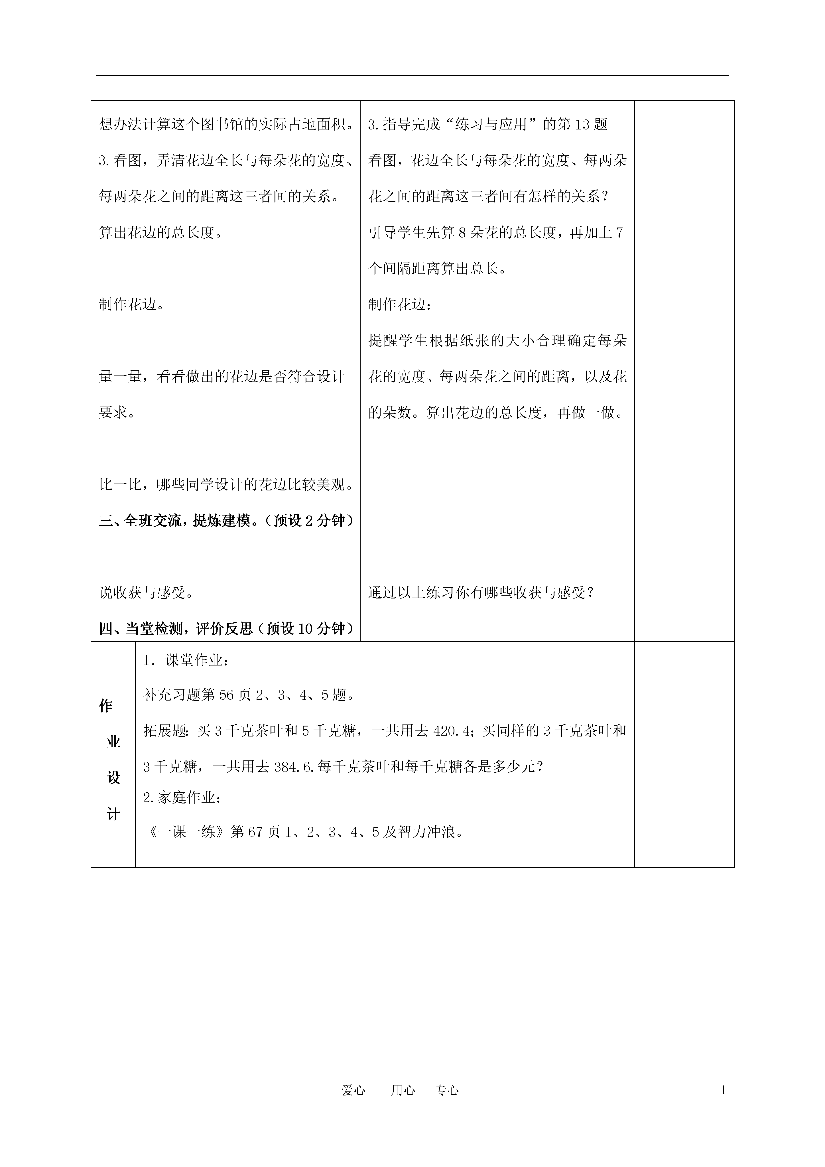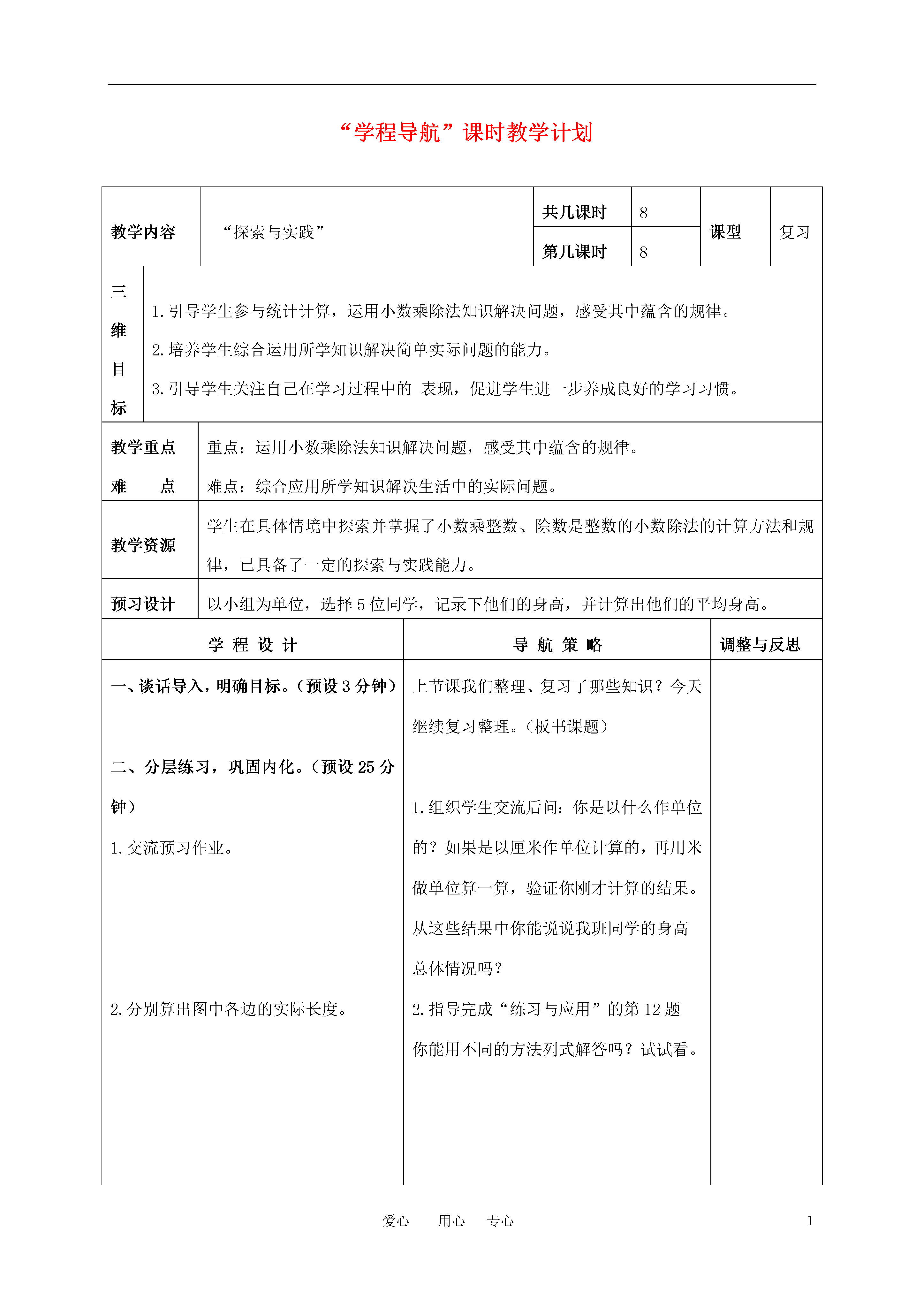 1爱心用心专心“学程导航”课时教学计划教学内容“探索与实践”共几课时8课型复习第几课时8三维目标1.引导学生参与统计计算,运用小数乘除法知识解决问题,感受其中蕴含的规律。2.培养学生综合运用所学知识解决简单实际问题的能力。3.引导学生关注自己在学习过程中的表现,促进学生进一步养成良好的学习习惯。教学重点难点重点:运用小数乘除法知识解决问题,感受其中蕴含的规律。难点:综合应用所学知识解决生活中的实际问题。教学资源学生在具体情境中探索并掌握了小数乘整数、除数是整数的小数除法的计算方法和规律,已具备了一定的探索与实践能力。预习设计以小组为单位,选择5位同学,记录下他们的身高,并计算出他们的平均身高。学程设计导航策略调整与反思一、谈话导入,明确目标。(预设3分钟)二、分层练习,巩固内化。(预设25分钟)1.交流预习作业。2.分别算出图中各边的实际长度。想办法计算这个图书馆的实际占地面积。3.看图,弄清花边全长与每朵花的宽度、每两朵花之间的距离这三者间的关系。算出花边的总长度。制作花边。量一量,看看做出的花边是否符合设计要求。比一比,哪些同学设计的花边比较美观。三、全班交流,提炼建模。(预设2分钟)说收获与感受。四、当堂检测,评价反思(预设10分钟)上节课我们整理、复习了哪些知识?今天继续复习整理。(板书课题)1.组织学生交流后问:你是以什么作单位的?如果是以厘米作单位计算的,再用米做单位算一算,验证你刚才计算的结果。从这些结果中你能说说我班同学的身高总体情况吗?2.指导完成“练习与应用”的第12题你能用不同的方法列式解答吗?试试看。3.指导完成“练习与应用”的第13题看图,花边全长与每朵花的宽度、每两朵花之间的距离这三者间有怎样的关系?引导学生先算8朵花的总长度,再加上7个间隔距离算出总长。制作花边:提醒学生根据纸张的大小合理确定每朵花的宽度、每两朵花之间的距离,以及花的朵数。算出花边的总长度,再做一做。通过以上练习你有哪些收获与感受?作业设计1.课堂作业:补充习题2、3、4、5题。拓展题:买3千克茶叶和5千克糖,一共用去420.4;买同样的3千克茶叶和3千克糖,一共用去384.6.每千克茶叶和每千克糖各是多少元?2.家庭作业:《一课一练》1、2、3、4、5及智力冲浪。
