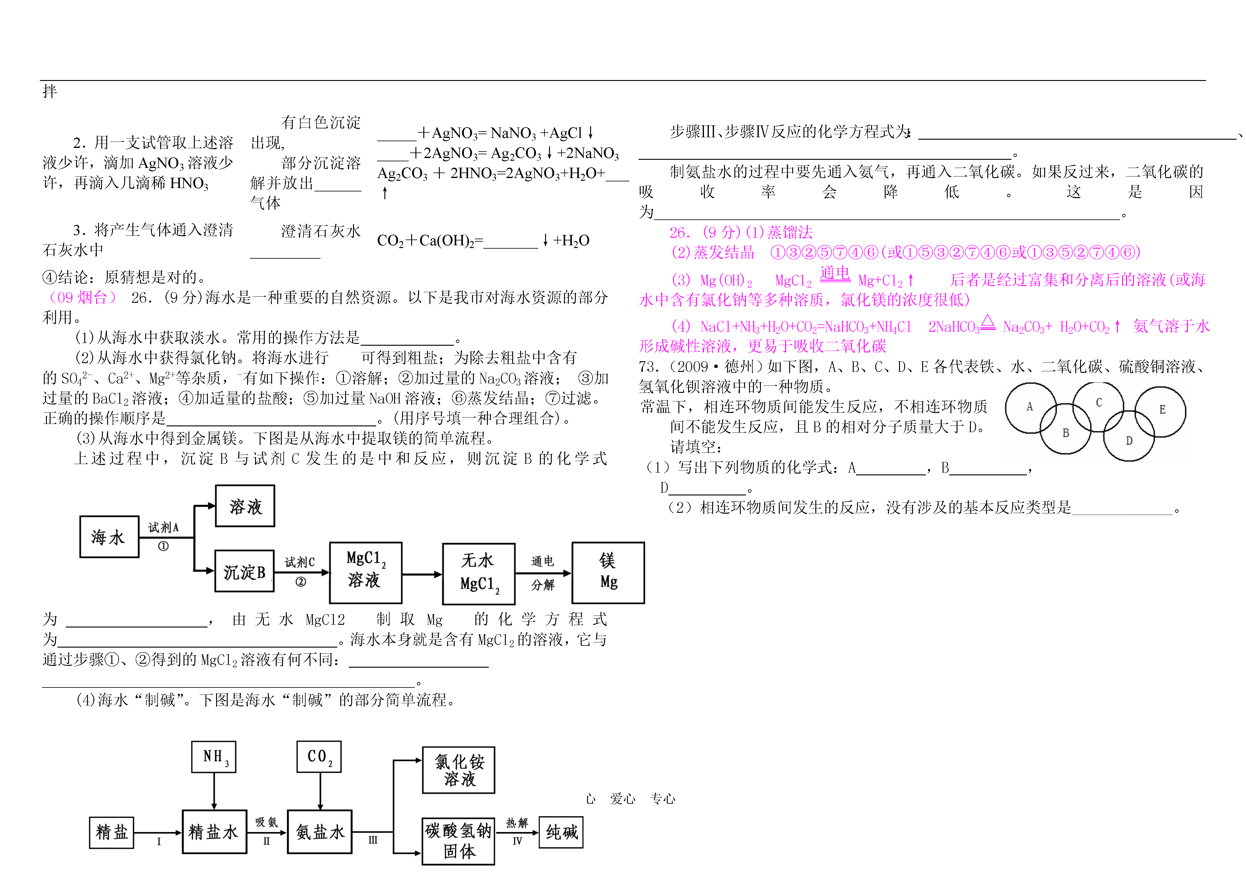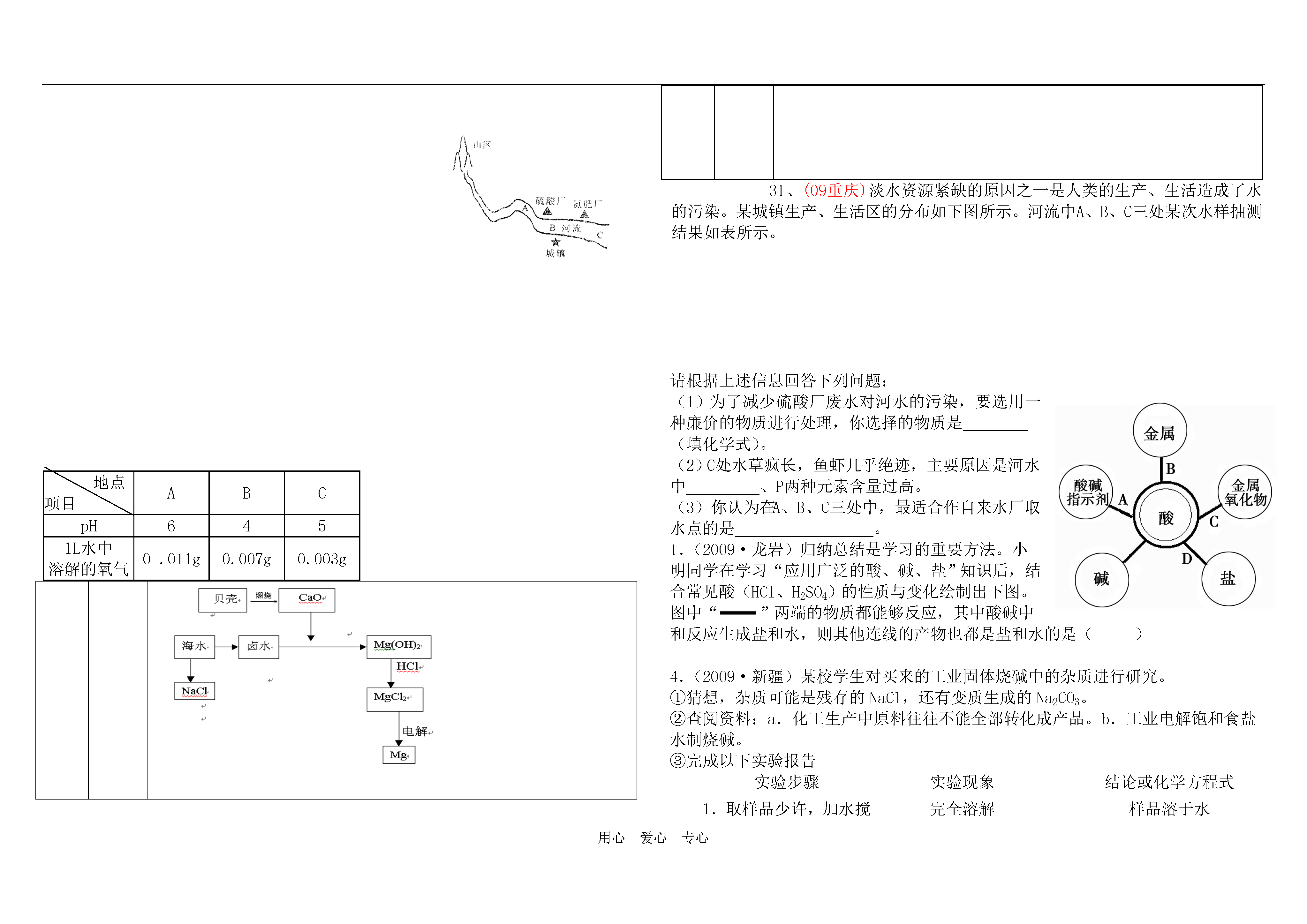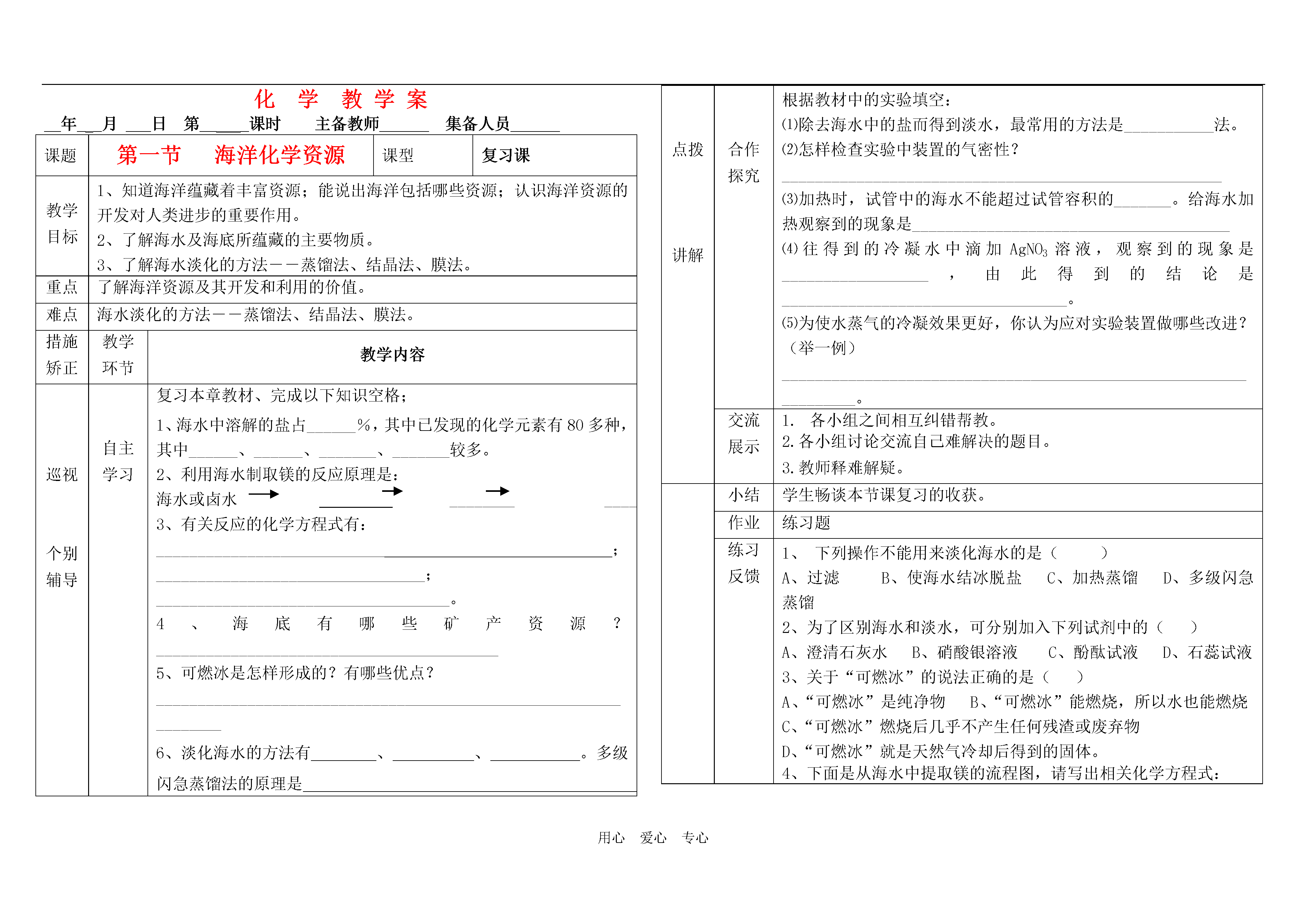 用心爱心专心化学教学案__年__月___日第___课时主备教师______集备人员______课题第一节海洋化学资源课型复习课教学目标1、知道海洋蕴藏着丰富资源;能说出海洋包括哪些资源;认识海洋资源的开发对人类进步的重要作用。2、了解海水及海底所蕴藏的主要物质。3、了解海水淡化的方法--蒸馏法、结晶法、膜法。重点了解海洋资源及其开发和利用的价值。难点海水淡化的方法--蒸馏法、结晶法、膜法。措施矫正教学环节教学内容巡视个别辅导点拨讲解自主学习复习本章教材、完成以下知识空格;1、海水中溶解的盐占______%,其中已发现的化学元素有80多种,其中______、______、_______、_______较多。2、利用海水制取镁的反应原理是:海水或卤水__________________3、有关反应的化学方程式有:____________________________;_________________________________;____________________________________。4、海底有哪些矿产资源?__________________________________________5、可燃冰是怎样形成的?有哪些优点?_________________________________________________________________6、淡化海水的方法有、、。多级闪急蒸馏法的原理是。合作探究根据教材中的实验填空:⑴除去海水中的盐而得到淡水,最常用的方法是___________法。⑵怎样检查实验中装置的气密性?______________________________________________________⑶加热时,试管中的海水不能超过试管容积的_______。给海水加热观察到的现象是_______________________________________⑷往得到的冷凝水中滴加AgNO3溶液,观察到的现象是__________________,由此得到的结论是___________________________________。⑸为使水蒸气的冷凝效果更好,你认为应对实验装置做哪些改进?(举一例)__________________________________________________________________。交流展示各小组之间相互纠错帮教。2.各小组讨论交流自己难解决的题目。3.教师释难解疑。小结学生畅谈本节课复习的收获。作业练习题练习反馈1、下列操作不能用来淡化海水的是()A、过滤B、使海水结冰脱盐C、加热蒸馏D、多级闪急蒸馏2、为了区别海水和淡水,可分别加入下列试剂中的()A、澄清石灰水B、硝酸银溶液C、酚酞试液D、石蕊试液3、关于“可燃冰”的说法正确的是()A、“可燃冰”是纯净物B、“可燃冰”能燃烧,所以水也能燃烧C、“可燃冰”燃烧后几乎不产生任何残渣或废弃物D、“可燃冰”就是天然气冷却后得到的固体。4、下面是从海水中提取镁的流程图,请写出相关化学方程式:31、(09重庆)淡水资源紧缺的原因之一是人类的生产、生活造成了水的污染。某城镇生产、生活区的分布如下图所示。河流中A、B、C三处某次水样抽测结果如表所示。地点项目ABCpH6451L水中溶解的氧气0.011g0.007g0.003g请根据上述信息回答下列问题:(1)为了减少硫酸厂废水对河水的污染,要选用一种廉价的物质进行处理,你选择的物质是(填化学式)。(2)C处水草疯长,鱼虾几乎绝迹,主要原因是河水中、P两种元素含量过高。(3)你认为在A、B、C三处中,最适合作自来水厂取水点的是。1.(2009·龙岩)归纳总结是学习的重要方法。小明同学在学习“应用广泛的酸、碱、盐”知识后,结合常见酸(HCl、H2SO4)的性质与变化绘制出下图。图中“”两端的物质都能够反应,其中酸碱中和反应生成盐和水,则其他连线的产物也都是盐和水的是()4.(2009·新疆)某校学生对买来的工业固体烧碱中的杂质进行研究。①猜想,杂质可能是残存的NaCl,还有变质生成的Na2CO3。②查阅资料:a.化工生产中原料往往不能全部转化成产品。b.工业电解饱和食盐水制烧碱。③完成以下实验报告实验步骤实验现象结论或化学方程式1.取样品少许,加水搅拌完全溶解样品溶于水2.用一支试管取上述溶液少许,滴加AgNO3溶液少许,再滴入几滴稀HNO3有白色沉淀出现,部分沉淀溶解并放出______气体_____+AgNO3=NaNO3+AgCl↓____