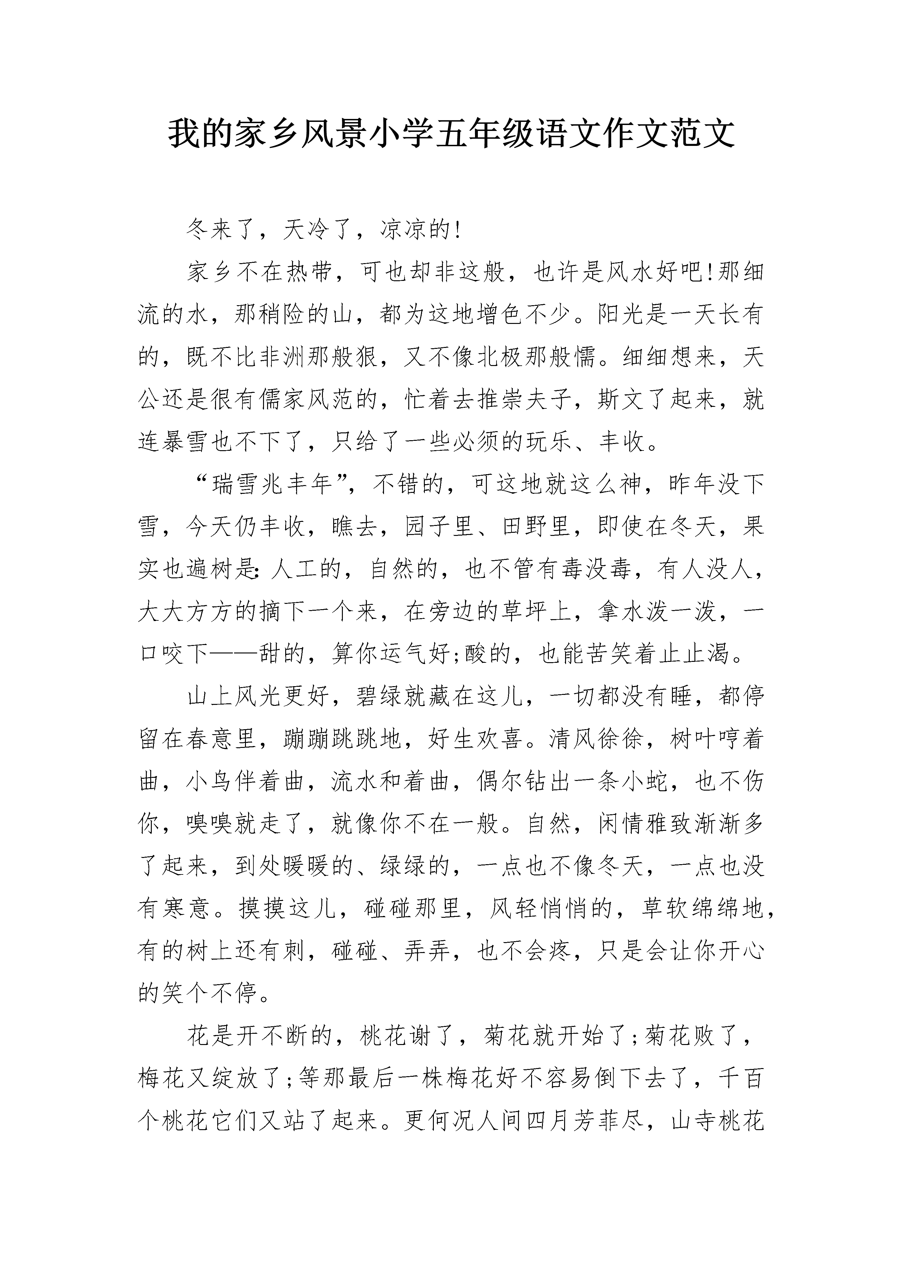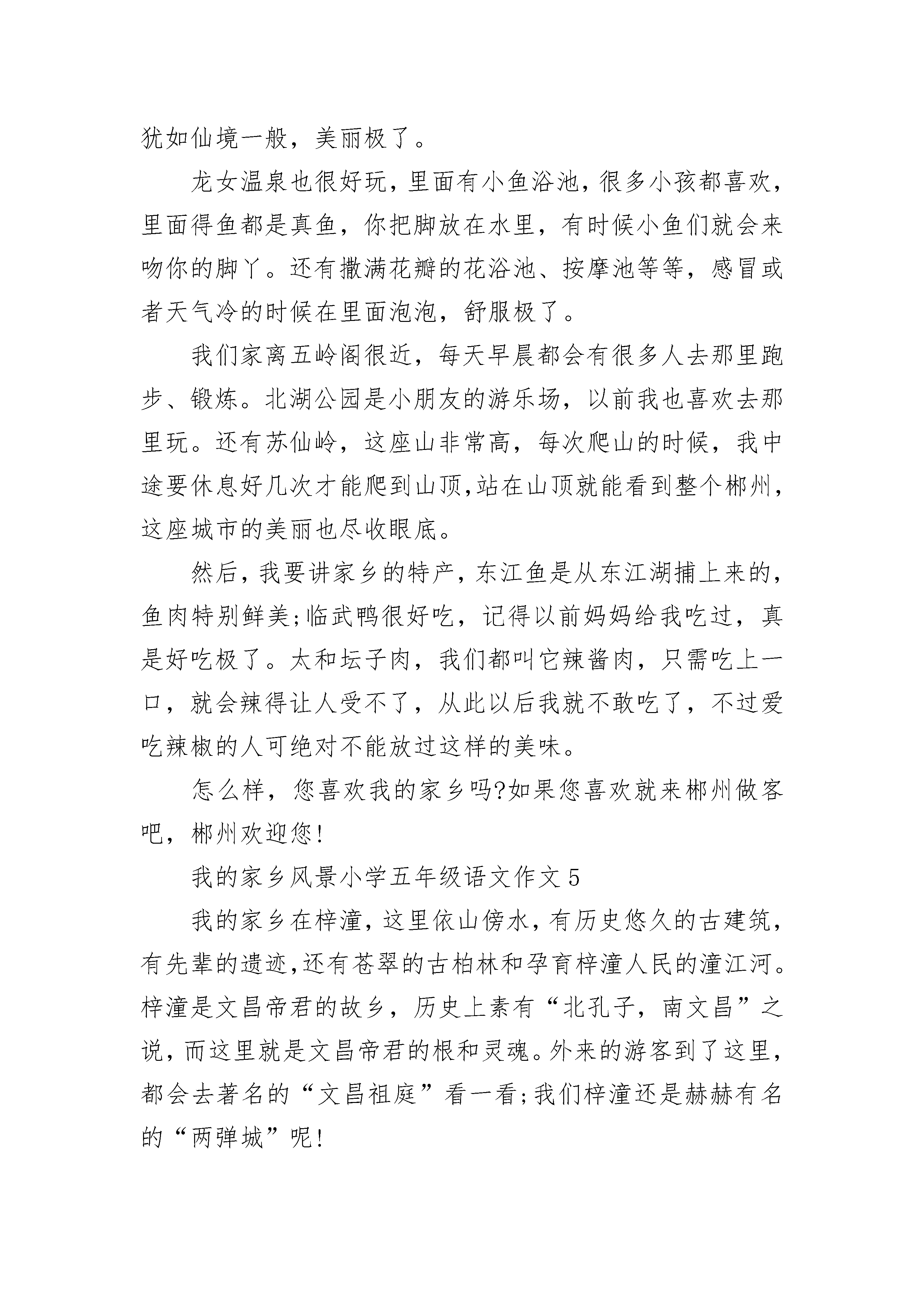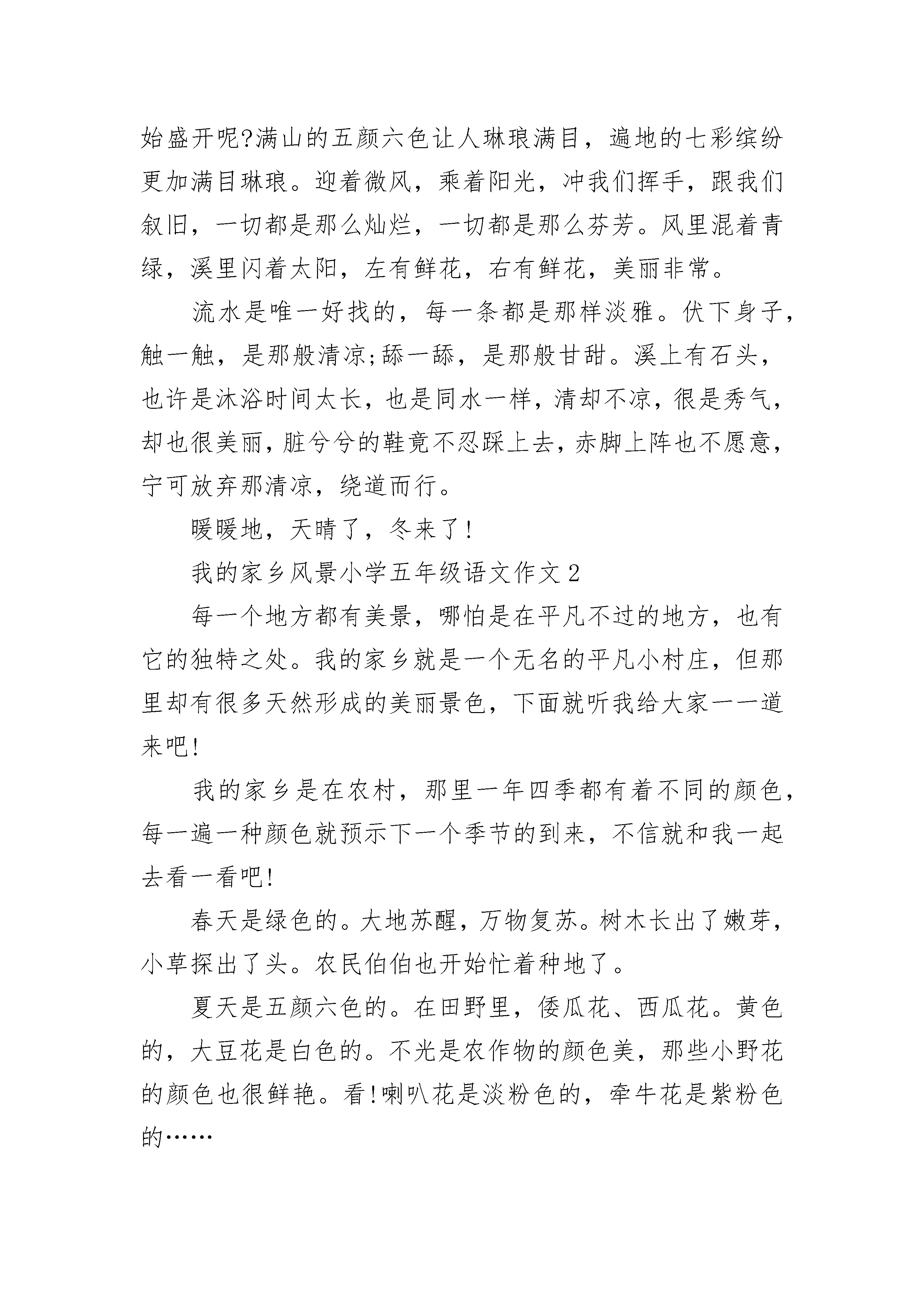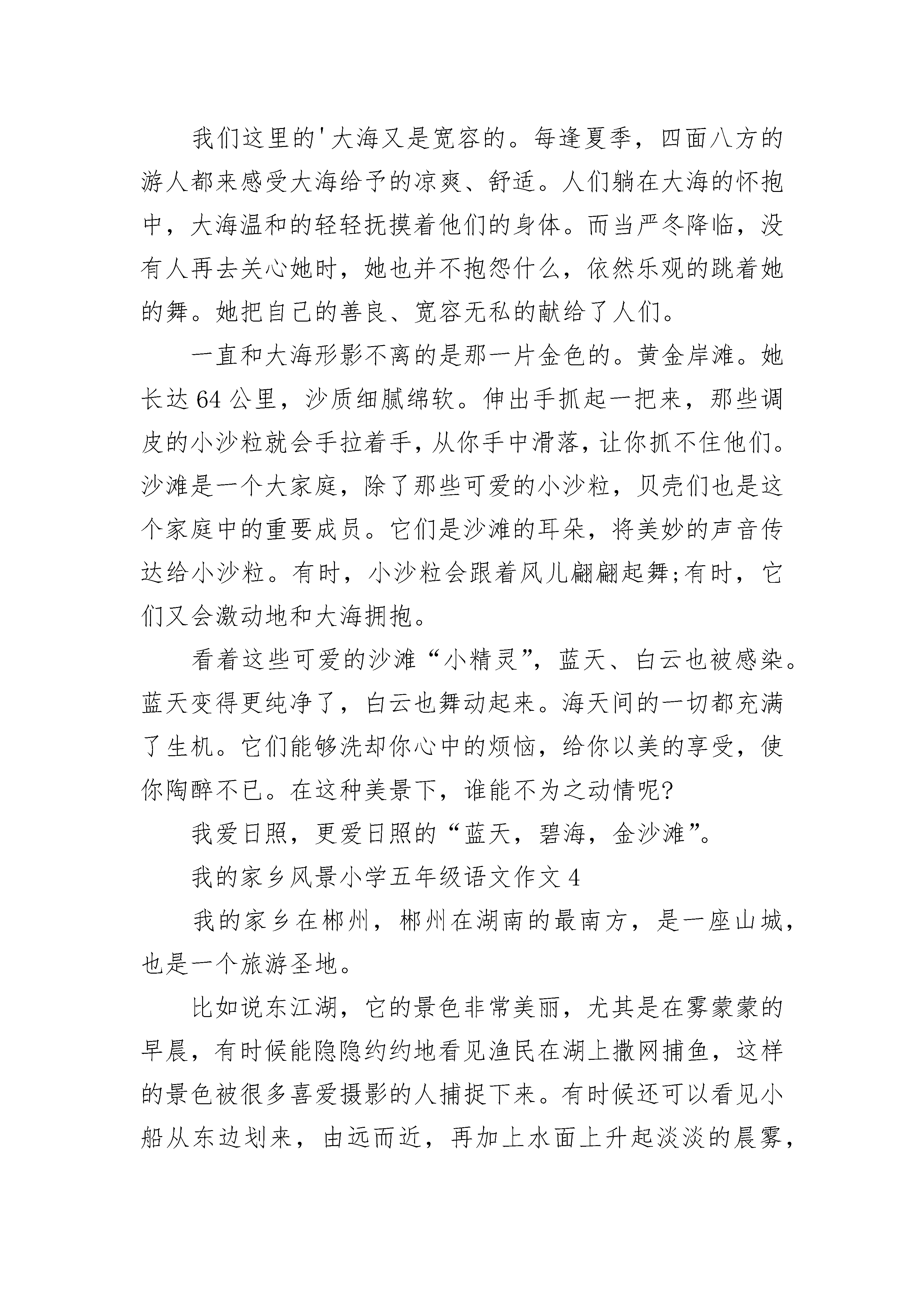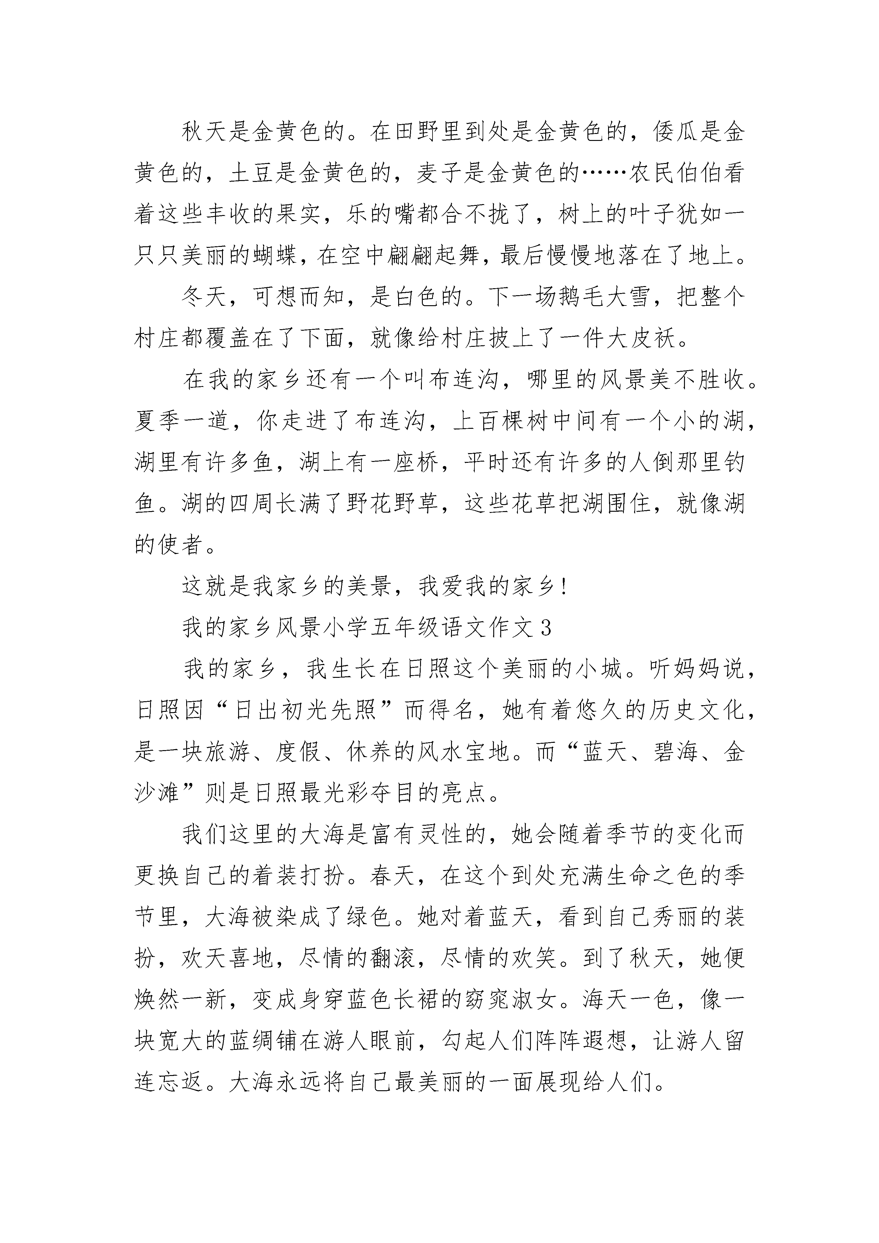 我的家乡风景小学五年级语文作文范文冬来了,天冷了,凉凉的!家乡不在热带,可也却非这般,也许是风水好吧!那细流的水,那稍险的山,都为这地增色不少。阳光是一天长有的,既不比非洲那般狠,又不像北极那般懦。细细想来,天公还是很有儒家风范的,忙着去推崇夫子,斯文了起来,就连暴雪也不下了,只给了一些必须的玩乐、丰收。“瑞雪兆丰年”,不错的,可这地就这么神,昨年没下雪,今天仍丰收,瞧去,园子里、田野里,即使在冬天,果实也遍树是:人工的,自然的,也不管有毒没毒,有人没人,大大方方的摘下一个来,在旁边的草坪上,拿水泼一泼,一口咬下——甜的,算你运气好;酸的,也能苦笑着止止渴。山上风光更好,碧绿就藏在这儿,一切都没有睡,都停留在春意里,蹦蹦跳跳地,好生欢喜。清风徐徐,树叶哼着曲,小鸟伴着曲,流水和着曲,偶尔钻出一条小蛇,也不伤你,嗅嗅就走了,就像你不在一般。自然,闲情雅致渐渐多了起来,到处暖暖的、绿绿的,一点也不像冬天,一点也没有寒意。摸摸这儿,碰碰那里,风轻悄悄的,草软绵绵地,有的树上还有刺,碰碰、弄弄,也不会疼,只是会让你开心的笑个不停。花是开不断的,桃花谢了,菊花就开始了;菊花败了,梅花又绽放了;等那最后一株梅花好不容易倒下去了,千百个桃花它们又站了起来。更何况人间四月芳菲尽,山寺桃花始盛开呢?满山的五颜六色让人琳琅满目,遍地的七彩缤纷更加满目琳琅。迎着微风,乘着阳光,冲我们挥手,跟我们叙旧,一切都是那么灿烂,一切都是那么芬芳。风里混着青绿,溪里闪着太阳,左有鲜花,右有鲜花,美丽非常。流水是唯一好找的,每一条都是那样淡雅。伏下身子,触一触,是那般清凉;舔一舔,是那般甘甜。溪上有石头,也许是沐浴时间太长,也是同水一样,清却不凉,很是秀气,却也很美丽,脏兮兮的鞋竟不忍踩上去,赤脚上阵也不愿意,宁可放弃那清凉,绕道而行。暖暖地,天晴了,冬来了!我的家乡风景小学五年级语文作文2每一个地方都有美景,哪怕是在平凡不过的地方,也有它的独特之处。我的家乡就是一个无名的平凡小村庄,但那里却有很多天然形成的美丽景色,下面就听我给大家一一道来吧!我的家乡是在农村,那里一年四季都有着不同的颜色,每一遍一种颜色就预示下一个季节的到来,不信就和我一起去看一看吧!春天是绿色的。大地苏醒,万物复苏。树木长出了嫩芽,小草探出了头。农民伯伯也开始忙着种地了。夏天是五颜六色的。在田野里,倭瓜花、西瓜花。黄色的,大豆花是白色的。不光是农作物的颜色美,那些小野花的颜色也很鲜艳。看!喇叭花是淡粉色的,牵牛花是紫粉色的……秋天是金黄色的。在田野里到处是金黄色的,倭瓜是金黄色的,土豆是金黄色的,麦子是金黄色的……农民伯伯看着这些丰收的果实,乐的嘴都合不拢了,树上的叶子犹如一只只美丽的蝴蝶,在空中翩翩起舞,最后慢慢地落在了地上。冬天,可想而知,是白色的。下一场鹅毛大雪,把整个村庄都覆盖在了下面,就像给村庄披上了一件大皮袄。在我的家乡还有一个叫布连沟,哪里的风景美不胜收。夏季一道,你走进了布连沟,上百棵树中间有一个小的湖,湖里有许多鱼,湖上有一座桥,平时还有许多的人倒那里钓鱼。湖的四周长满了野花野草,这些花草把湖围住,就像湖的使者。这就是我家乡的美景,我爱我的家乡!我的家乡风景小学五年级语文作文3我的家乡,我生长在日照这个美丽的小城。听妈妈说,日照因“日出初光先照”而得名,她有着悠久的历史文化,是一块旅游、度假、休养的风水宝地。而“蓝天、碧海、金沙滩”则是日照最光彩夺目的亮点。我们这里的大海是富有灵性的,她会随着季节的变化而更换自己的着装打扮。春天,在这个到处充满生命之色的季节里,大海被染成了绿色。她对着蓝天,看到自己秀丽的装扮,欢天喜地,尽情的翻滚,尽情的欢笑。到了秋天,她便焕然一新,变成身穿蓝色长裙的窈窕淑女。海天一色,像一块宽大的蓝绸铺在游人眼前,勾起人们阵阵遐想,让游人留连忘返。大海永远将自己最美丽的一面展现给人们。我们这里的'大海又是宽容的。每逢夏季,四面八方的游人都来感受大海给予的凉爽、舒适。人们躺在大海的怀抱中,大海温和的轻轻抚摸着他们的身体。而当严冬降临,没有人再去关心她时,她也并不抱怨什么,依然乐观的跳着她的舞。她把自己的善良、宽容无私的献给了人们。一直和大海形影不离的是那一片金色的。黄金岸滩。她长达64公里,沙质细腻绵软。伸出手抓起一把来,那些调皮的小沙粒就会手拉着手,从你手中滑落,让你抓不住他们。沙滩是一个大家庭,除了那些可爱的小沙粒,贝壳们也是这个家庭中的重要成员。它们是沙滩的耳朵,将美妙的声音传达给小沙粒。有时,小沙粒会跟着风儿翩翩起舞;有时,它们又会激动地和大海拥抱。看着这些可爱的沙滩“小精灵”,蓝天、白云也被感染。蓝天变得更纯净了,白云也舞动起来。海天间的一切都充满了生机。它们能够洗却你心中的烦恼,给你以美的享受,使你陶醉不已。在这种美景下,谁能不为之动情呢