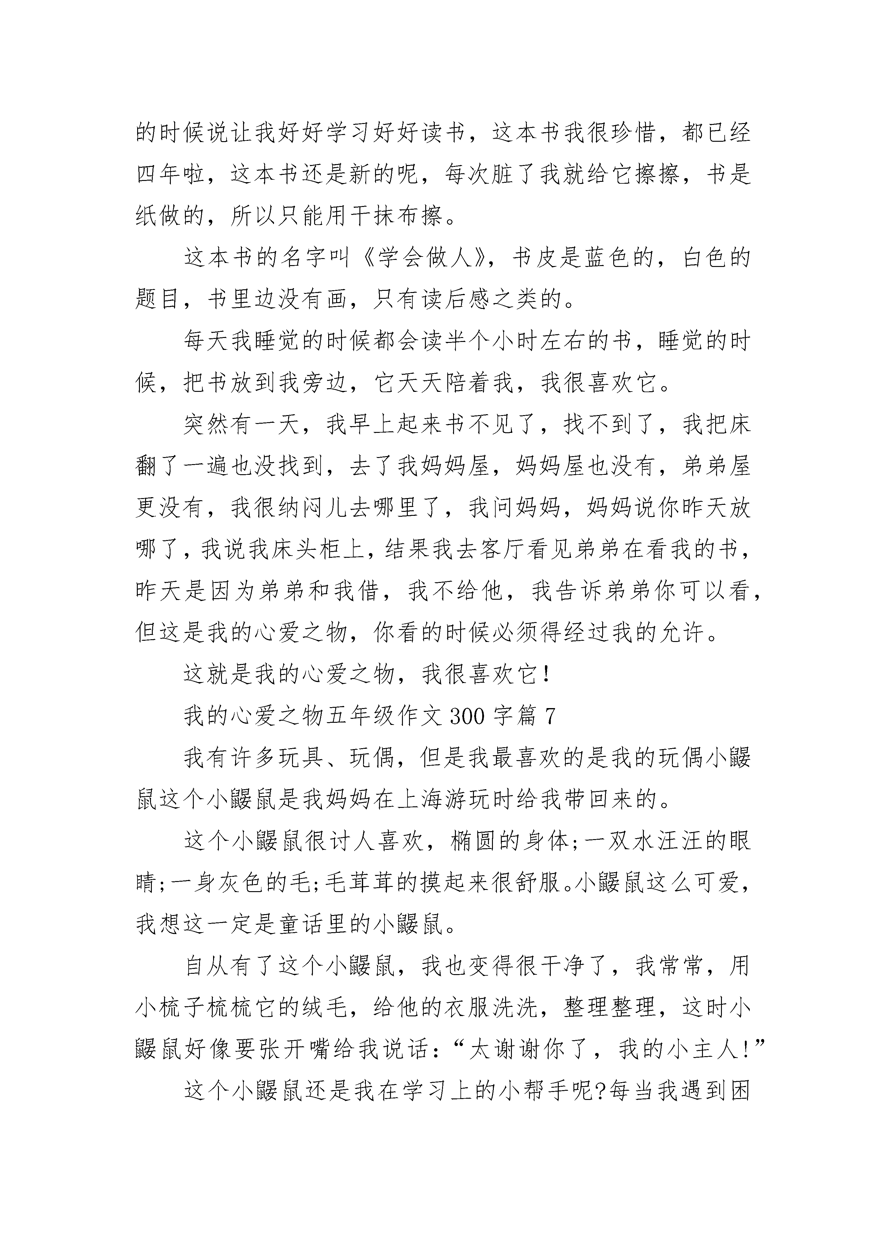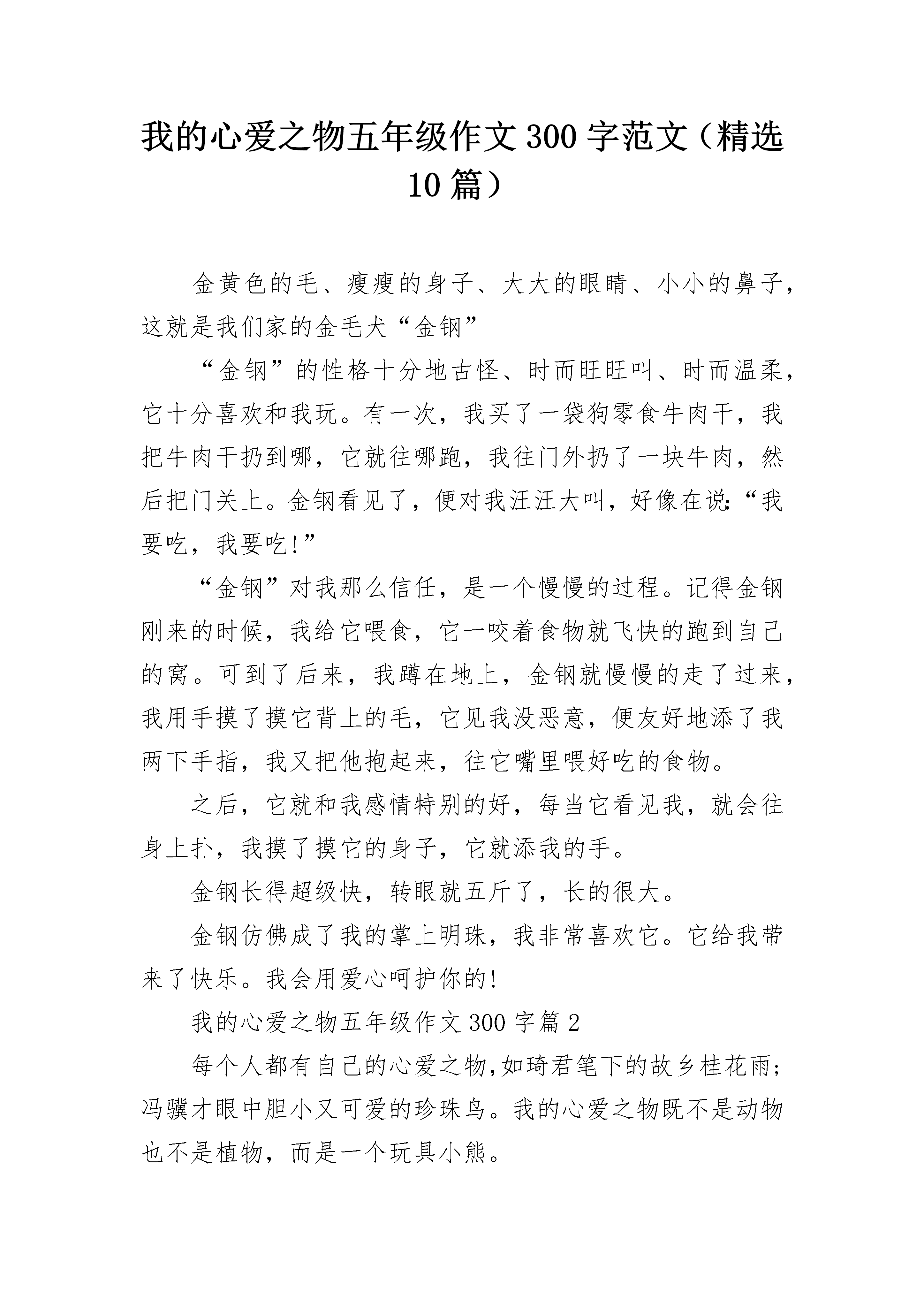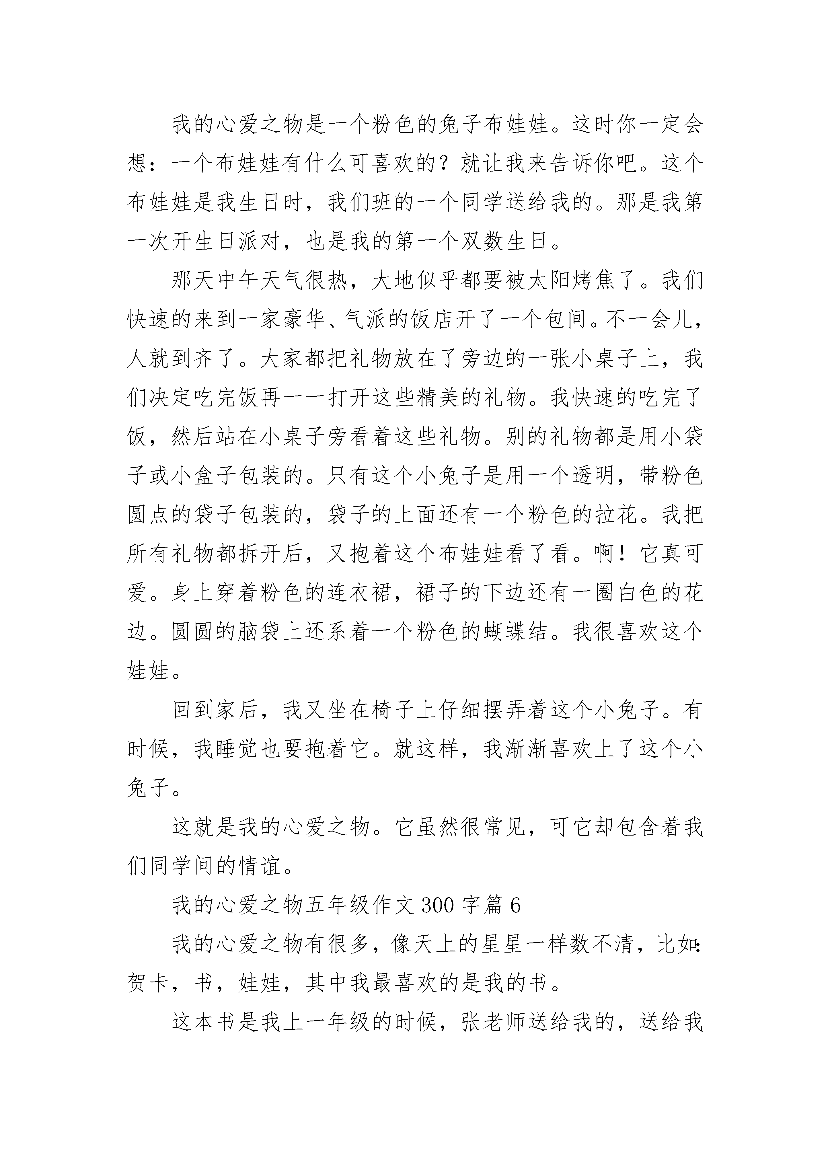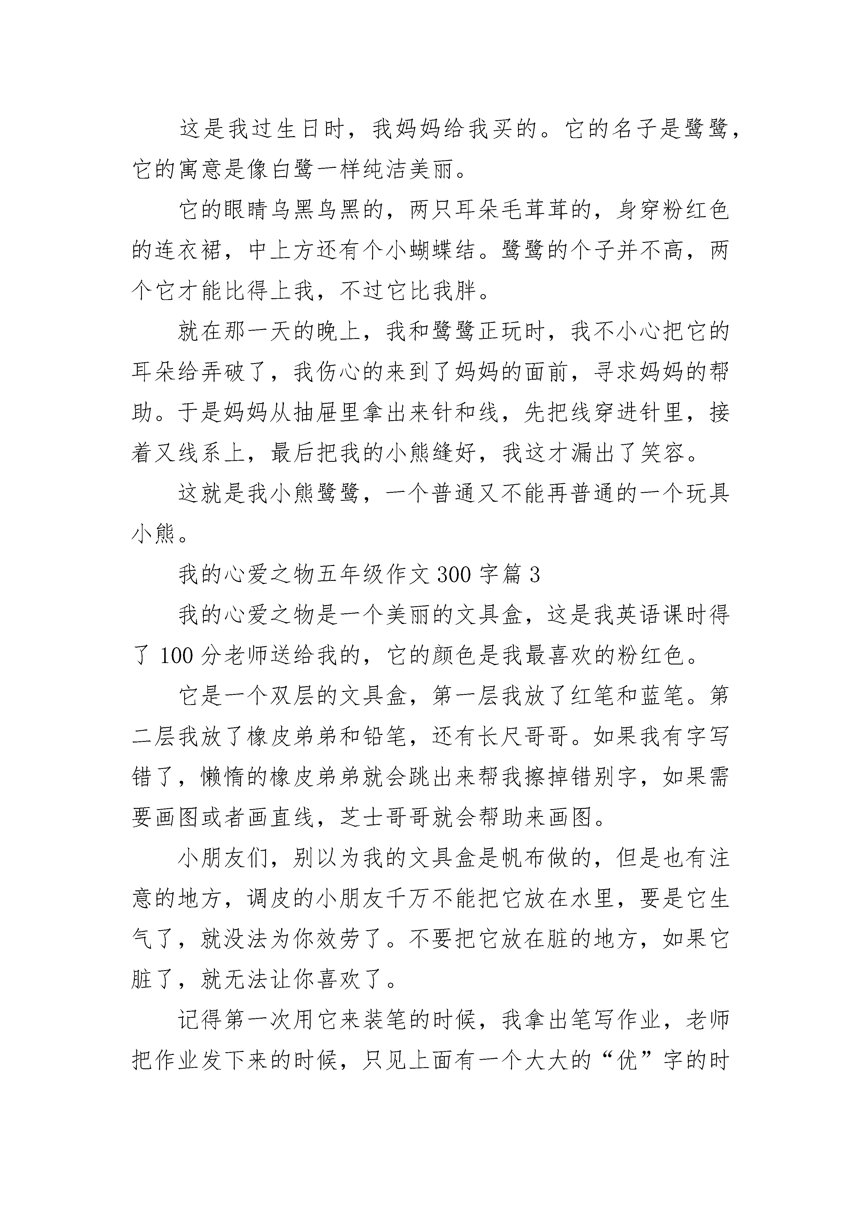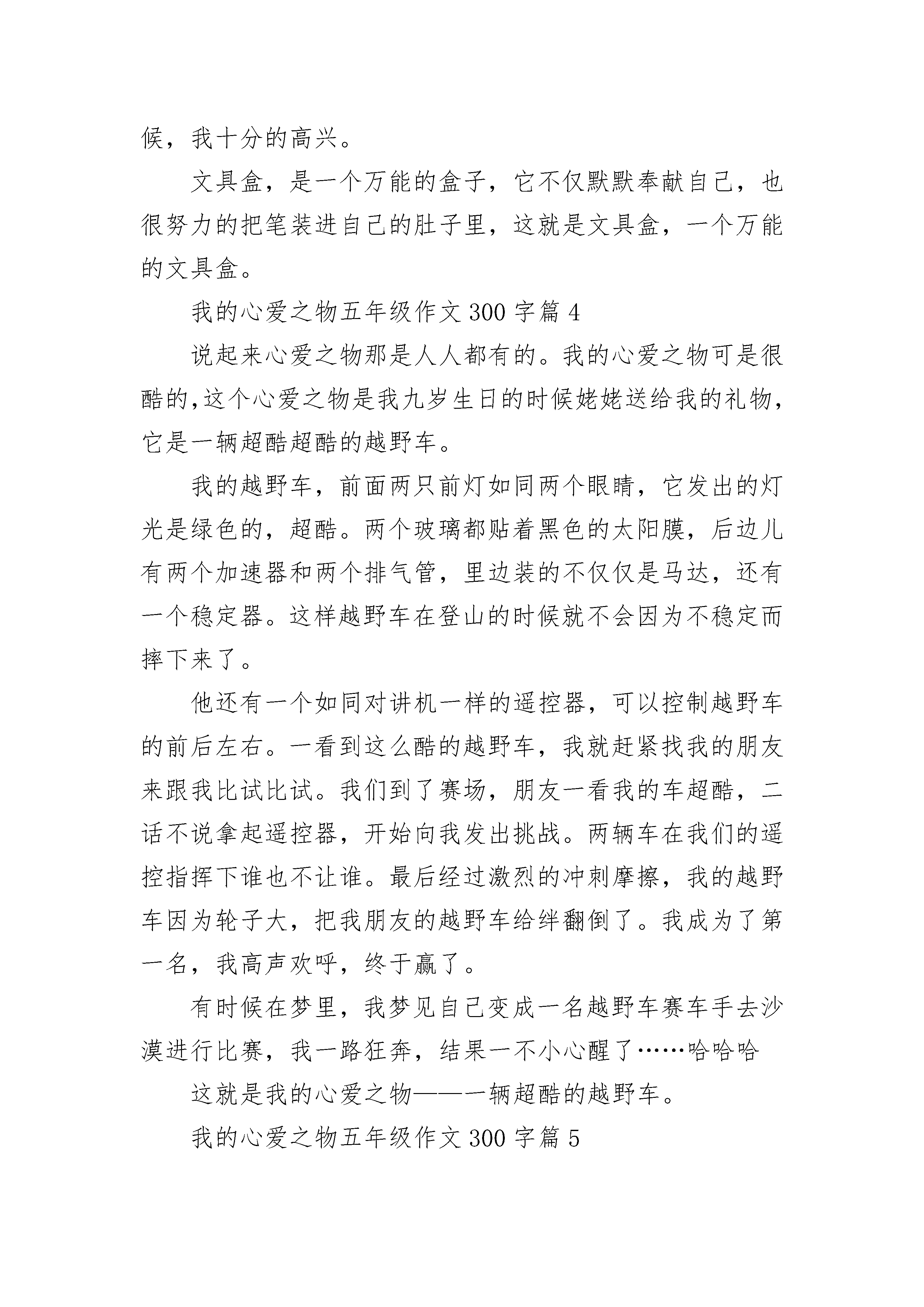 我的心爱之物五年级作文300字范文(精选10篇)金黄色的毛、瘦瘦的身子、大大的眼睛、小小的鼻子,这就是我们家的金毛犬“金钢”“金钢”的性格十分地古怪、时而旺旺叫、时而温柔,它十分喜欢和我玩。有一次,我买了一袋狗零食牛肉干,我把牛肉干扔到哪,它就往哪跑,我往门外扔了一块牛肉,然后把门关上。金钢看见了,便对我汪汪大叫,好像在说:“我要吃,我要吃!”“金钢”对我那么信任,是一个慢慢的过程。记得金钢刚来的时候,我给它喂食,它一咬着食物就飞快的跑到自己的窝。可到了后来,我蹲在地上,金钢就慢慢的走了过来,我用手摸了摸它背上的毛,它见我没恶意,便友好地添了我两下手指,我又把他抱起来,往它嘴里喂好吃的食物。之后,它就和我感情特别的好,每当它看见我,就会往身上扑,我摸了摸它的身子,它就添我的手。金钢长得超级快,转眼就五斤了,长的很大。金钢仿佛成了我的掌上明珠,我非常喜欢它。它给我带来了快乐。我会用爱心呵护你的!我的心爱之物五年级作文300字篇2每个人都有自己的心爱之物,如琦君笔下的故乡桂花雨;冯骥才眼中胆小又可爱的珍珠鸟。我的心爱之物既不是动物也不是植物,而是一个玩具小熊。这是我过生日时,我妈妈给我买的。它的名子是鹭鹭,它的寓意是像白鹭一样纯洁美丽。它的眼睛乌黑鸟黑的,两只耳朵毛茸茸的,身穿粉红色的连衣裙,中上方还有个小蝴蝶结。鹭鹭的个子并不高,两个它才能比得上我,不过它比我胖。就在那一天的晚上,我和鹭鹭正玩时,我不小心把它的耳朵给弄破了,我伤心的来到了妈妈的面前,寻求妈妈的帮助。于是妈妈从抽屉里拿出来针和线,先把线穿进针里,接着又线系上,最后把我的小熊缝好,我这才漏出了笑容。这就是我小熊鹭鹭,一个普通又不能再普通的一个玩具小熊。我的心爱之物五年级作文300字篇3我的心爱之物是一个美丽的文具盒,这是我英语课时得了100分老师送给我的,它的颜色是我最喜欢的粉红色。它是一个双层的文具盒,第一层我放了红笔和蓝笔。第二层我放了橡皮弟弟和铅笔,还有长尺哥哥。如果我有字写错了,懒惰的橡皮弟弟就会跳出来帮我擦掉错别字,如果需要画图或者画直线,芝士哥哥就会帮助来画图。小朋友们,别以为我的文具盒是帆布做的,但是也有注意的地方,调皮的小朋友千万不能把它放在水里,要是它生气了,就没法为你效劳了。不要把它放在脏的地方,如果它脏了,就无法让你喜欢了。记得第一次用它来装笔的时候,我拿出笔写作业,老师把作业发下来的时候,只见上面有一个大大的“优”字的时候,我十分的高兴。文具盒,是一个万能的盒子,它不仅默默奉献自己,也很努力的把笔装进自己的肚子里,这就是文具盒,一个万能的文具盒。我的心爱之物五年级作文300字篇4说起来心爱之物那是人人都有的。我的心爱之物可是很酷的,这个心爱之物是我九岁生日的时候姥姥送给我的礼物,它是一辆超酷超酷的越野车。我的越野车,前面两只前灯如同两个眼睛,它发出的灯光是绿色的,超酷。两个玻璃都贴着黑色的太阳膜,后边儿有两个加速器和两个排气管,里边装的不仅仅是马达,还有一个稳定器。这样越野车在登山的时候就不会因为不稳定而摔下来了。他还有一个如同对讲机一样的遥控器,可以控制越野车的前后左右。一看到这么酷的越野车,我就赶紧找我的朋友来跟我比试比试。我们到了赛场,朋友一看我的车超酷,二话不说拿起遥控器,开始向我发出挑战。两辆车在我们的遥控指挥下谁也不让谁。最后经过激烈的冲刺摩擦,我的越野车因为轮子大,把我朋友的越野车给绊翻倒了。我成为了第一名,我高声欢呼,终于赢了。有时候在梦里,我梦见自己变成一名越野车赛车手去沙漠进行比赛,我一路狂奔,结果一不小心醒了……哈哈哈这就是我的心爱之物——一辆超酷的越野车。我的心爱之物五年级作文300字篇5我的心爱之物是一个粉色的兔子布娃娃。这时你一定会想:一个布娃娃有什么可喜欢的?就让我来告诉你吧。这个布娃娃是我生日时,我们班的一个同学送给我的。那是我第一次开生日派对,也是我的第一个双数生日。那天中午天气很热,大地似乎都要被太阳烤焦了。我们快速的来到一家豪华、气派的饭店开了一个包间。不一会儿,人就到齐了。大家都把礼物放在了旁边的一张小桌子上,我们决定吃完饭再一一打开这些精美的礼物。我快速的吃完了饭,然后站在小桌子旁看着这些礼物。别的礼物都是用小袋子或小盒子包装的。只有这个小兔子是用一个透明,带粉色圆点的袋子包装的,袋子的上面还有一个粉色的拉花。我把所有礼物都拆开后,又抱着这个布娃娃看了看。啊!它真可爱。身上穿着粉色的连衣裙,裙子的下边还有一圈白色的花边。圆圆的脑袋上还系着一个粉色的蝴蝶结。我很喜欢这个娃娃。回到家后,我又坐在椅子上仔细摆弄着这个小兔子。有时候,我睡觉也要抱着它。就这样,我渐渐喜欢上了这个小兔子。这就是我的心爱之物。它虽然很常见,可它却包含着我们同学间的情谊。我的心爱之物五年级作文300字篇6我的心爱之物有很多,像天