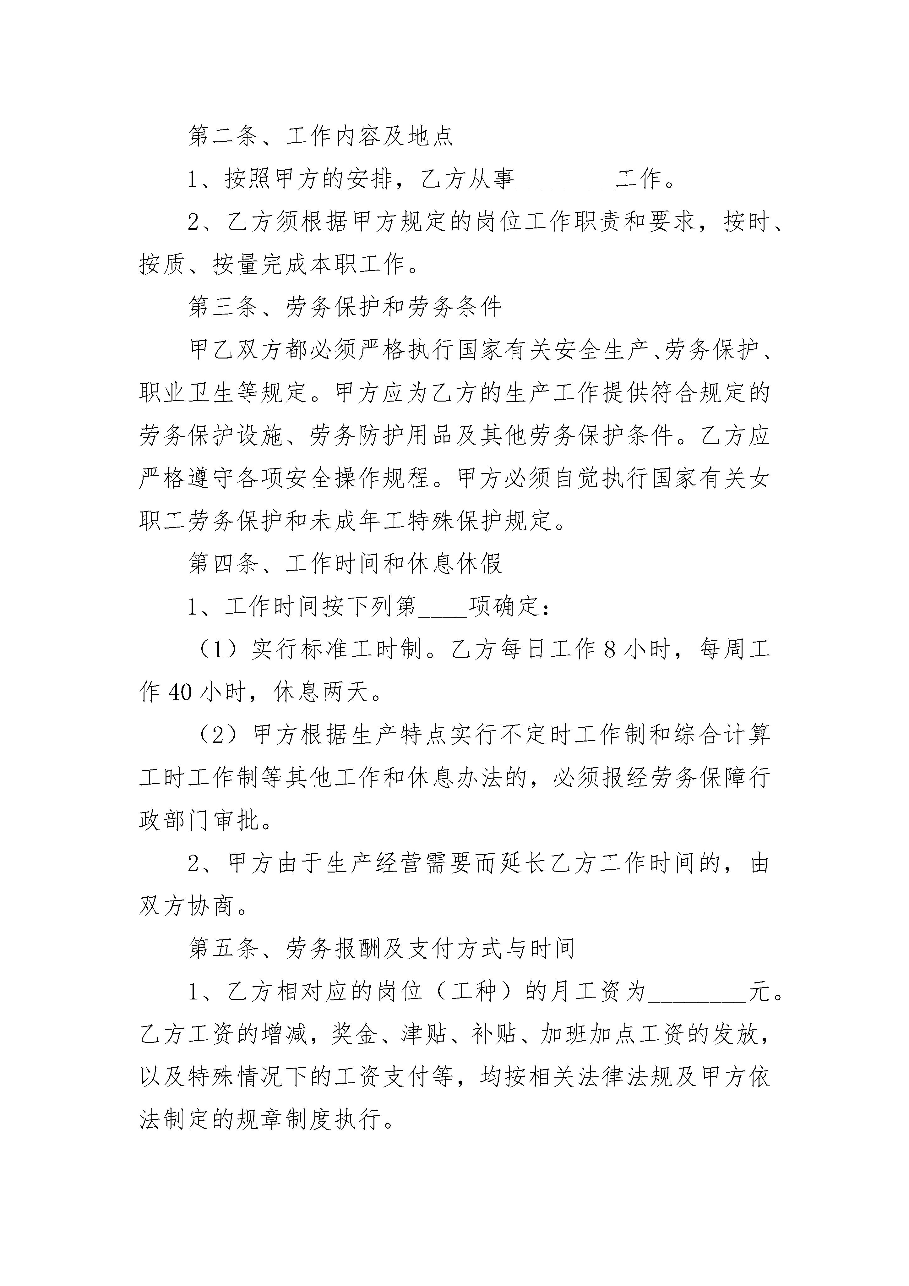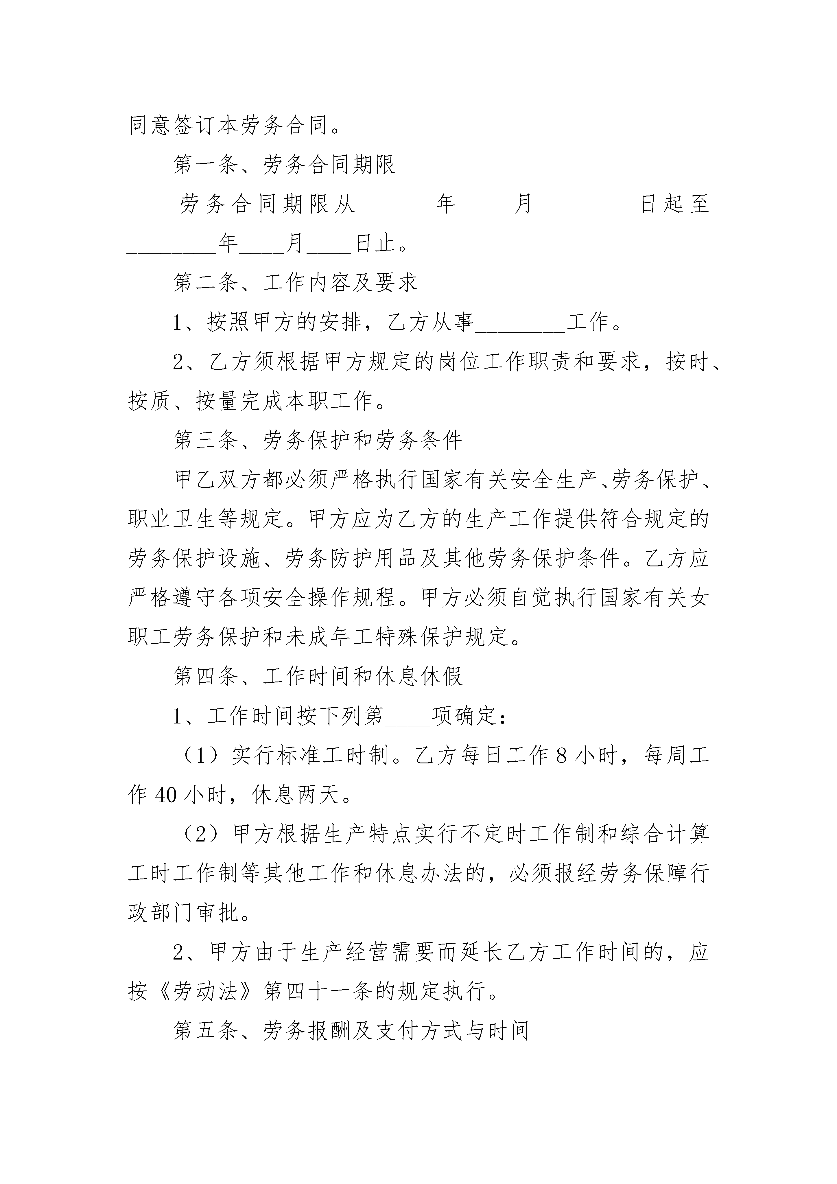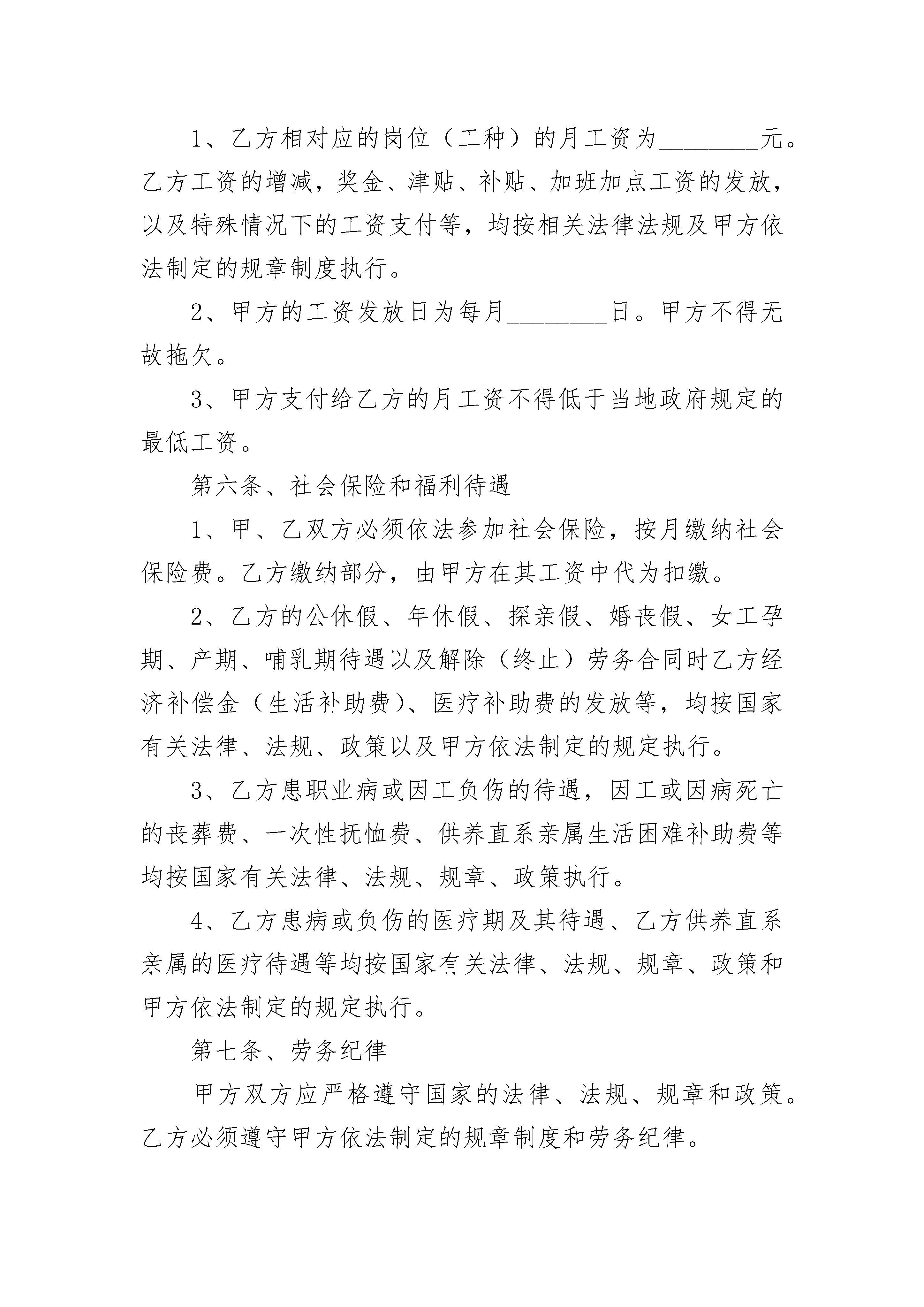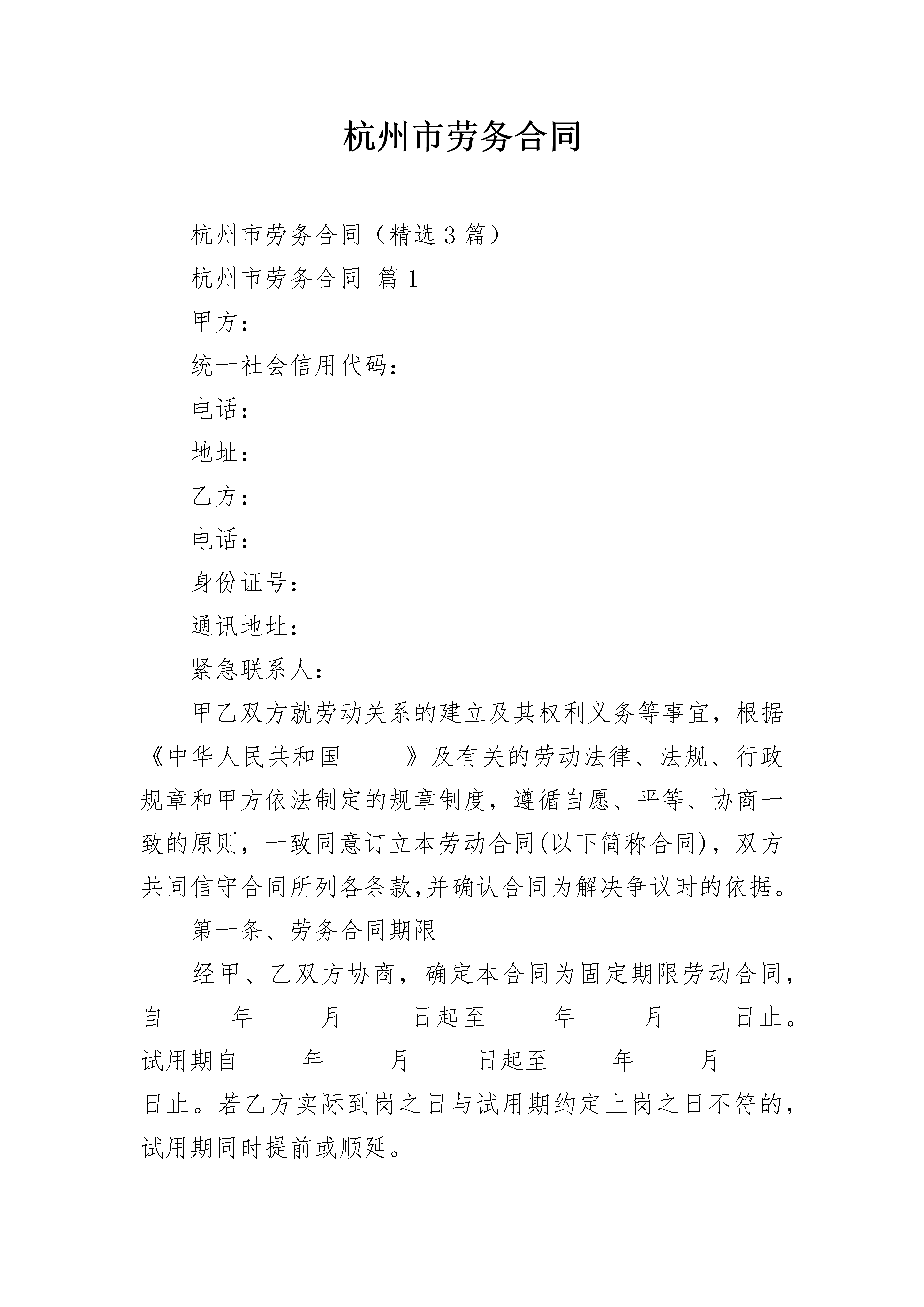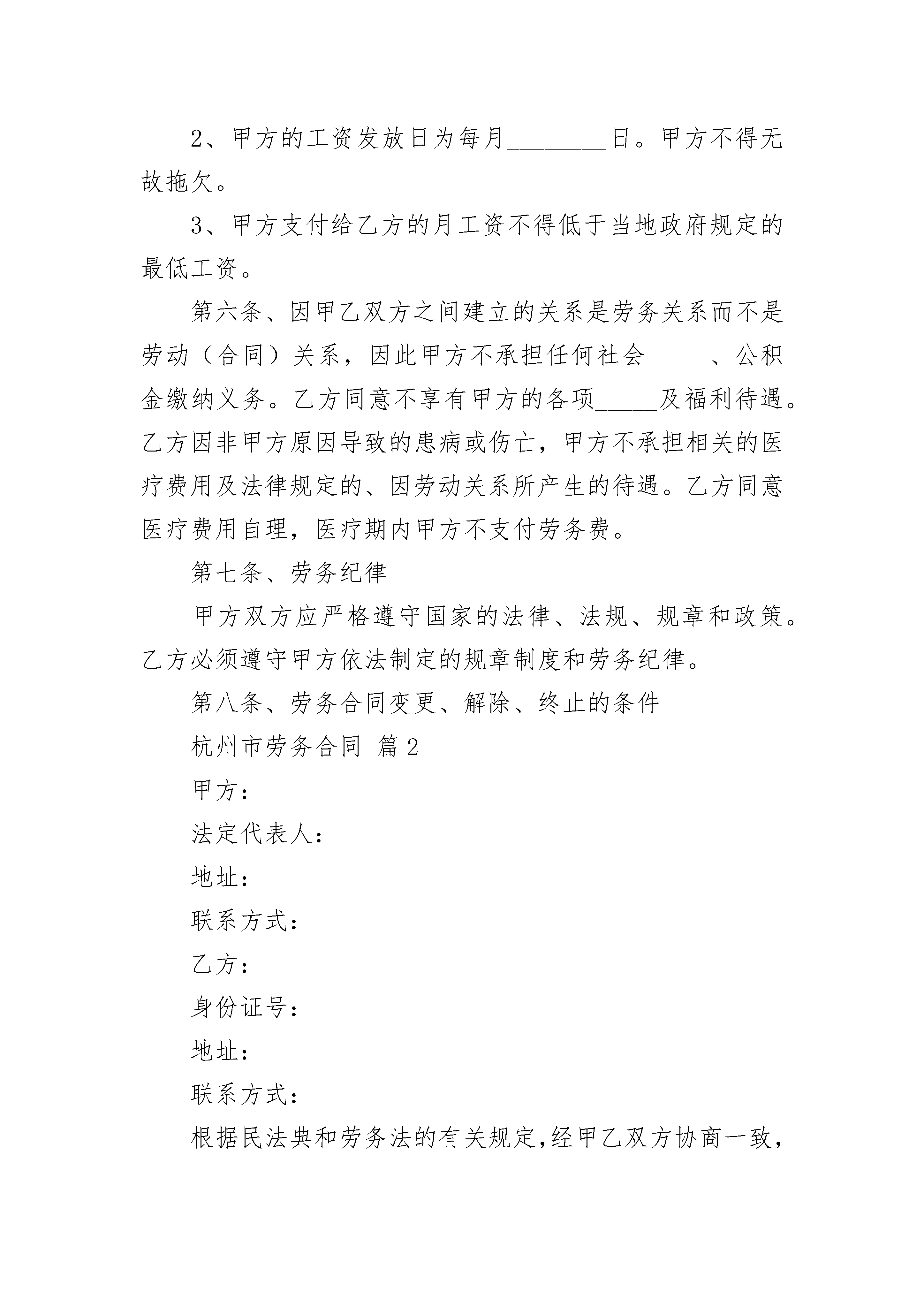 杭州市劳务合同杭州市劳务合同(精选3篇)杭州市劳务合同篇1甲方:统一社会信用代码:电话:地址:乙方:电话:身份证号:通讯地址:紧急联系人:甲乙双方就劳动关系的建立及其权利义务等事宜,根据《中华人民共和国_____》及有关的劳动法律、法规、行政规章和甲方依法制定的规章制度,遵循自愿、平等、协商一致的原则,一致同意订立本劳动合同(以下简称合同),双方共同信守合同所列各条款,并确认合同为解决争议时的依据。第一条、劳务合同期限经甲、乙双方协商,确定本合同为固定期限劳动合同,自_____年_____月_____日起至_____年_____月_____日止。试用期自_____年_____月_____日起至_____年_____月_____日止。若乙方实际到岗之日与试用期约定上岗之日不符的,试用期同时提前或顺延。第二条、工作内容及地点1、按照甲方的安排,乙方从事________工作。2、乙方须根据甲方规定的岗位工作职责和要求,按时、按质、按量完成本职工作。第三条、劳务保护和劳务条件甲乙双方都必须严格执行国家有关安全生产、劳务保护、职业卫生等规定。甲方应为乙方的生产工作提供符合规定的劳务保护设施、劳务防护用品及其他劳务保护条件。乙方应严格遵守各项安全操作规程。甲方必须自觉执行国家有关女职工劳务保护和未成年工特殊保护规定。第四条、工作时间和休息休假1、工作时间按下列第____项确定:(1)实行标准工时制。乙方每日工作8小时,每周工作40小时,休息两天。(2)甲方根据生产特点实行不定时工作制和综合计算工时工作制等其他工作和休息办法的,必须报经劳务保障行政部门审批。2、甲方由于生产经营需要而延长乙方工作时间的,由双方协商。第五条、劳务报酬及支付方式与时间1、乙方相对应的岗位(工种)的月工资为________元。乙方工资的增减,奖金、津贴、补贴、加班加点工资的发放,以及特殊情况下的工资支付等,均按相关法律法规及甲方依法制定的规章制度执行。2、甲方的工资发放日为每月________日。甲方不得无故拖欠。3、甲方支付给乙方的月工资不得低于当地政府规定的最低工资。第六条、因甲乙双方之间建立的关系是劳务关系而不是劳动(合同)关系,因此甲方不承担任何社会_____、公积金缴纳义务。乙方同意不享有甲方的各项_____及福利待遇。乙方因非甲方原因导致的患病或伤亡,甲方不承担相关的医疗费用及法律规定的、因劳动关系所产生的待遇。乙方同意医疗费用自理,医疗期内甲方不支付劳务费。第七条、劳务纪律甲方双方应严格遵守国家的法律、法规、规章和政策。乙方必须遵守甲方依法制定的规章制度和劳务纪律。第八条、劳务合同变更、解除、终止的条件杭州市劳务合同篇2甲方:法定代表人:地址:联系方式:乙方:身份证号:地址:联系方式:根据民法典和劳务法的有关规定,经甲乙双方协商一致,同意签订本劳务合同。第一条、劳务合同期限劳务合同期限从______年____月________日起至________年____月____日止。第二条、工作内容及要求1、按照甲方的安排,乙方从事________工作。2、乙方须根据甲方规定的岗位工作职责和要求,按时、按质、按量完成本职工作。第三条、劳务保护和劳务条件甲乙双方都必须严格执行国家有关安全生产、劳务保护、职业卫生等规定。甲方应为乙方的生产工作提供符合规定的劳务保护设施、劳务防护用品及其他劳务保护条件。乙方应严格遵守各项安全操作规程。甲方必须自觉执行国家有关女职工劳务保护和未成年工特殊保护规定。第四条、工作时间和休息休假1、工作时间按下列第____项确定:(1)实行标准工时制。乙方每日工作8小时,每周工作40小时,休息两天。(2)甲方根据生产特点实行不定时工作制和综合计算工时工作制等其他工作和休息办法的,必须报经劳务保障行政部门审批。2、甲方由于生产经营需要而延长乙方工作时间的,应按《劳动法》第四十一条的规定执行。第五条、劳务报酬及支付方式与时间1、乙方相对应的岗位(工种)的月工资为________元。乙方工资的增减,奖金、津贴、补贴、加班加点工资的发放,以及特殊情况下的工资支付等,均按相关法律法规及甲方依法制定的规章制度执行。2、甲方的工资发放日为每月________日。甲方不得无故拖欠。3、甲方支付给乙方的月工资不得低于当地政府规定的最低工资。第六条、社会保险和福利待遇1、甲、乙双方必须依法参加社会保险,按月缴纳社会保险费。乙方缴纳部分,由甲方在其工资中代为扣缴。2、乙方的公休假、年休假、探亲假、婚丧假、女工孕期、产期、哺乳期待遇以及解除(终止)劳务合同时乙方经济补偿金(生活补助费)、医疗补助费的发放等,均按国家有关法律、法规、政策以及甲方依法制定的规定执行。3、乙方患职业病或因工负伤的待遇,因工或因病死亡的丧葬费、一次性抚恤费、供养直系亲属生活困难补助费等