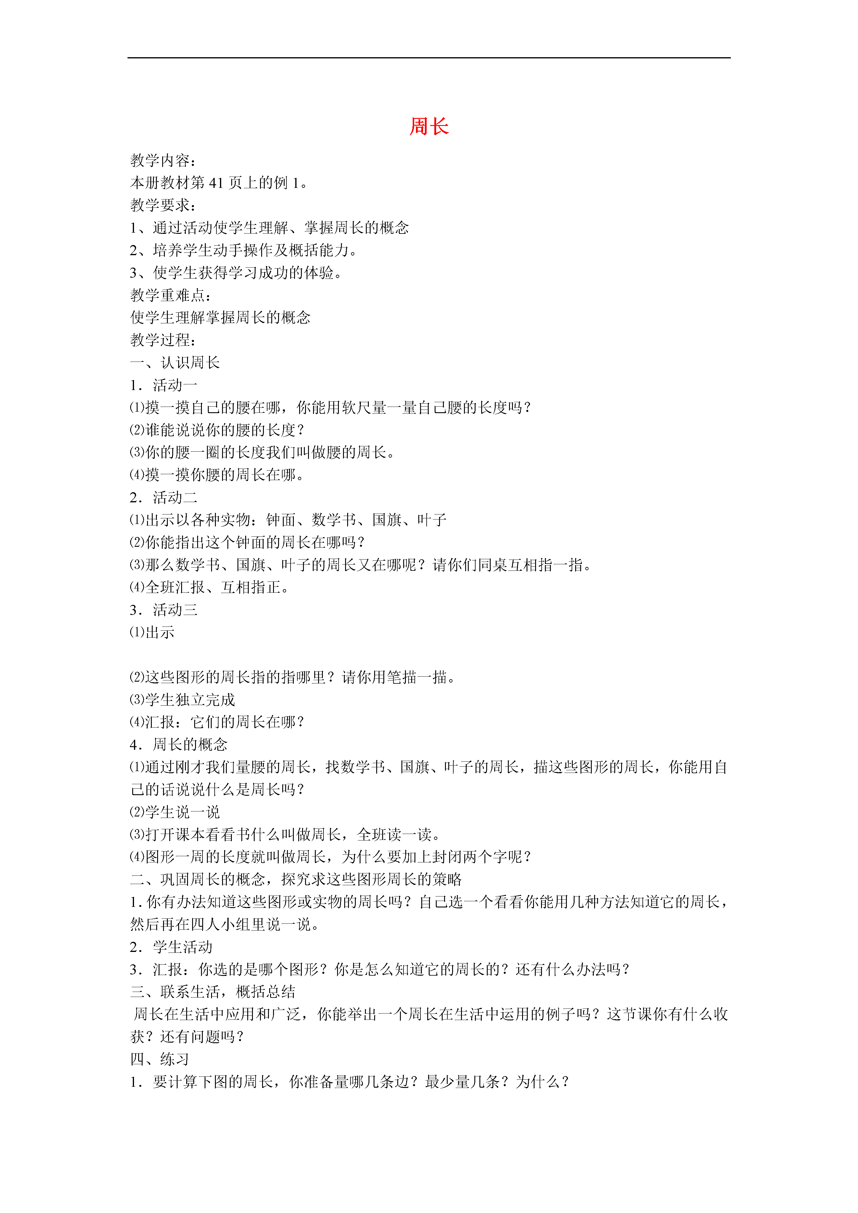 周长教学内容:本册教材上的例1。教学要求:1、通过活动使学生理解、掌握周长的概念2、培养学生动手操作及概括能力。3、使学生获得学习成功的体验。教学重难点:使学生理解掌握周长的概念教学过程:一、认识周长1.活动一⑴摸一摸自己的腰在哪,你能用软尺量一量自己腰的长度吗?⑵谁能说说你的腰的长度?⑶你的腰一圈的长度我们叫做腰的周长。⑷摸一摸你腰的周长在哪。2.活动二⑴出示以各种实物:钟面、数学书、国旗、叶子⑵你能指出这个钟面的周长在哪吗?⑶那么数学书、国旗、叶子的周长又在哪呢?请你们同桌互相指一指。⑷全班汇报、互相指正。3.活动三⑴出示⑵这些图形的周长指的指哪里?请你用笔描一描。⑶学生独立完成⑷汇报:它们的周长在哪?4.周长的概念⑴通过刚才我们量腰的周长,找数学书、国旗、叶子的周长,描这些图形的周长,你能用自己的话说说什么是周长吗?⑵学生说一说⑶打开课本看看书什么叫做周长,全班读一读。⑷图形一周的长度就叫做周长,为什么要加上封闭两个字呢?二、巩固周长的概念,探究求这些图形周长的策略1.你有办法知道这些图形或实物的周长吗?自己选一个看看你能用几种方法知道它的周长,然后再在四人小组里说一说。2.学生活动3.汇报:你选的是哪个图形?你是怎么知道它的周长的?还有什么办法吗?三、联系生活,概括总结周长在生活中应用和广泛,你能举出一个周长在生活中运用的例子吗?这节课你有什么收获?还有问题吗?四、练习1.要计算下图的周长,你准备量哪几条边?最少量几条?为什么?⑴⑵2.思考题:小冬沿着跑道跑一圈,他跑的总长度是不是运动场的周长?在长方形镜框的四周围上铁皮,铁皮的长度是不是这个长方形镜框的周长?五、]作业:回家和爸爸妈妈说说什么是周长,量一量自己家里人头、腰的周长,并记录下来。教学反思: