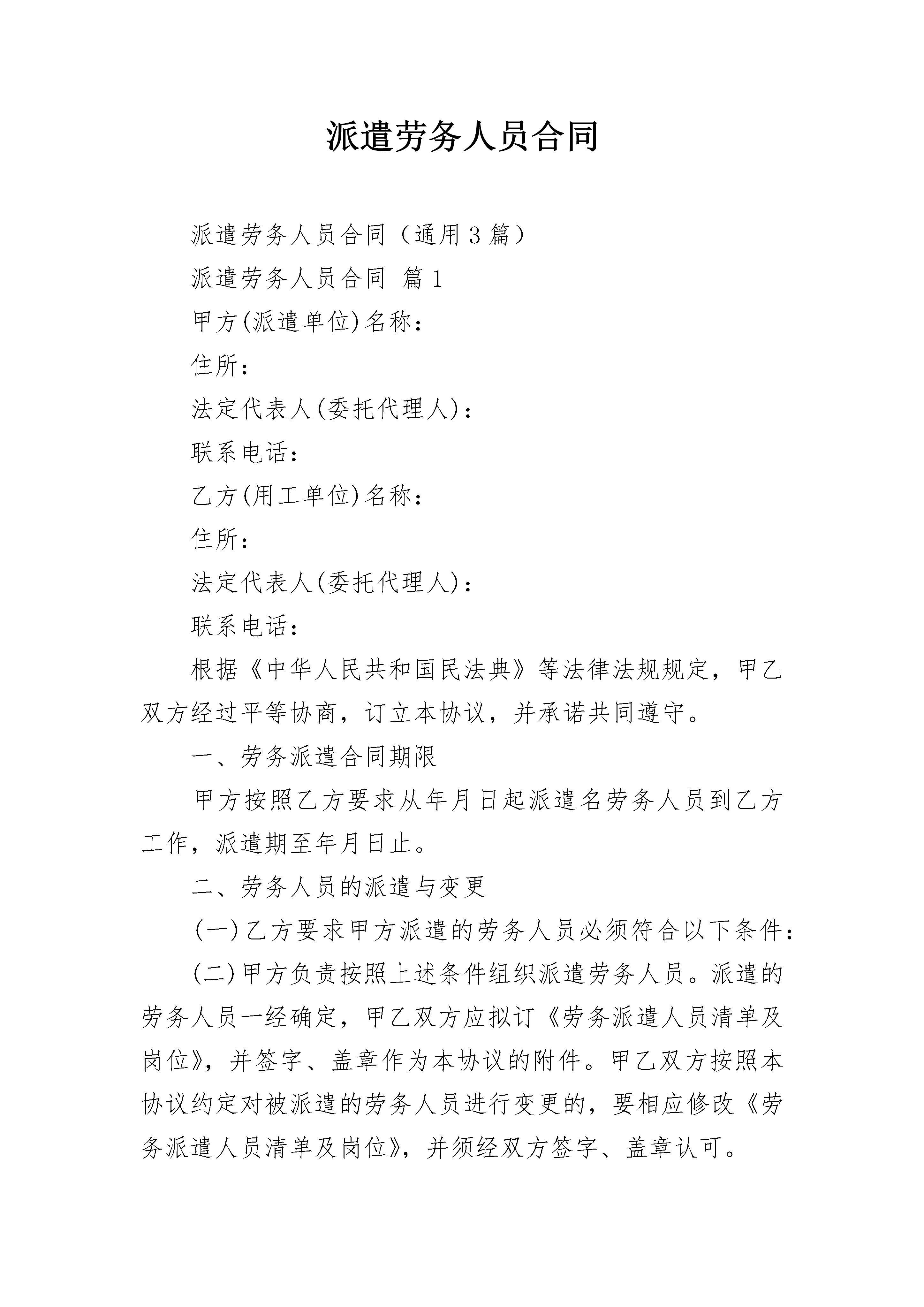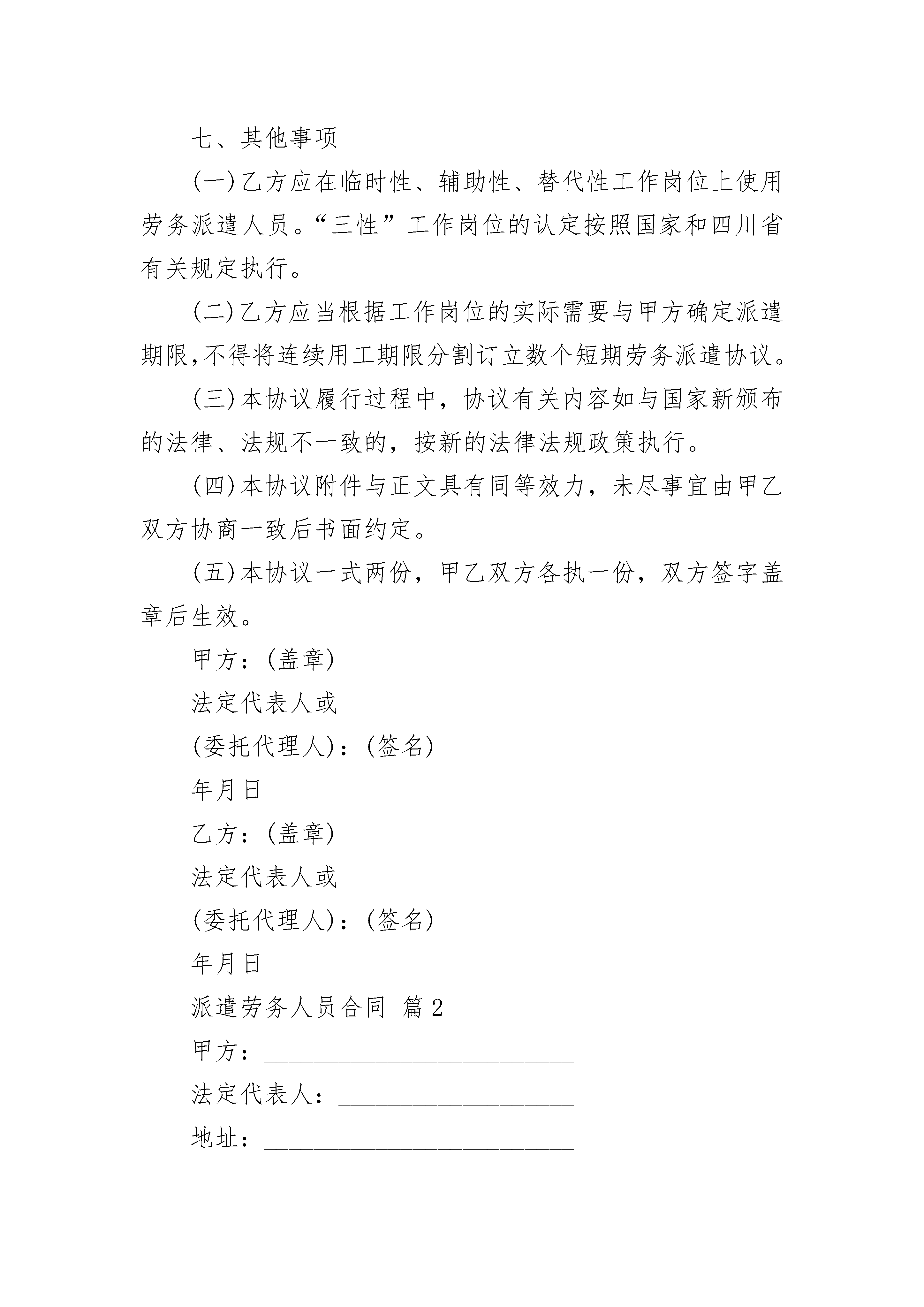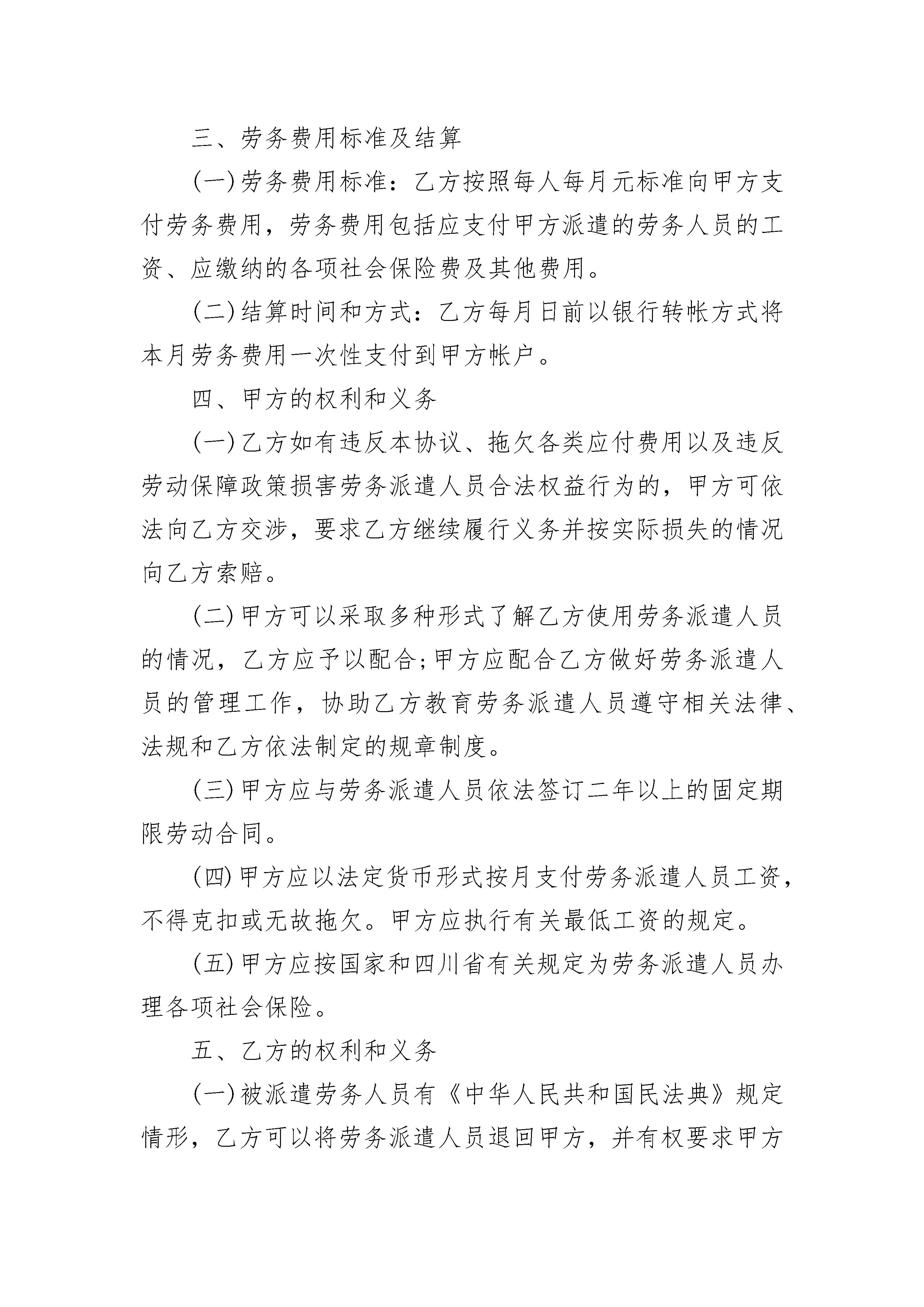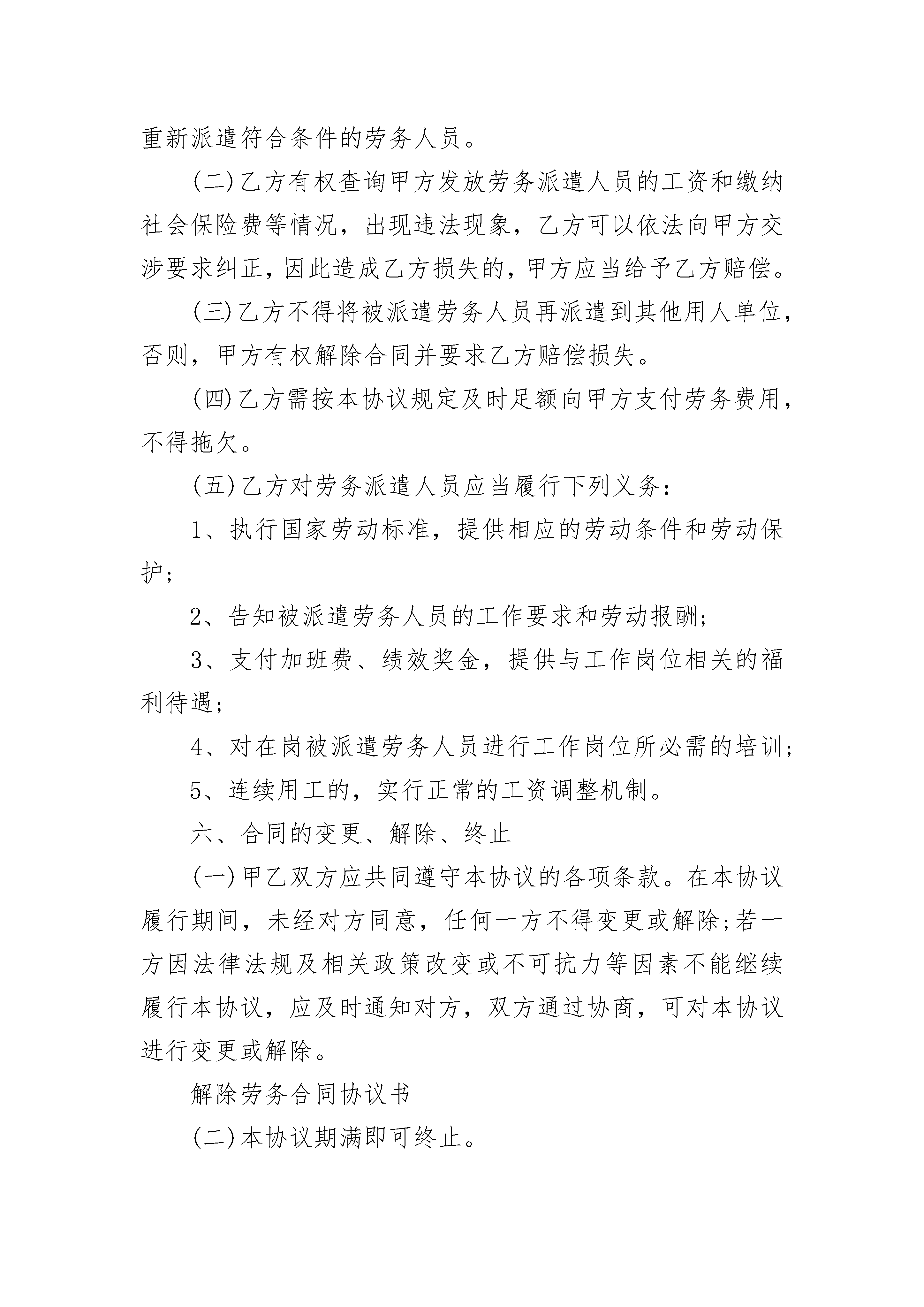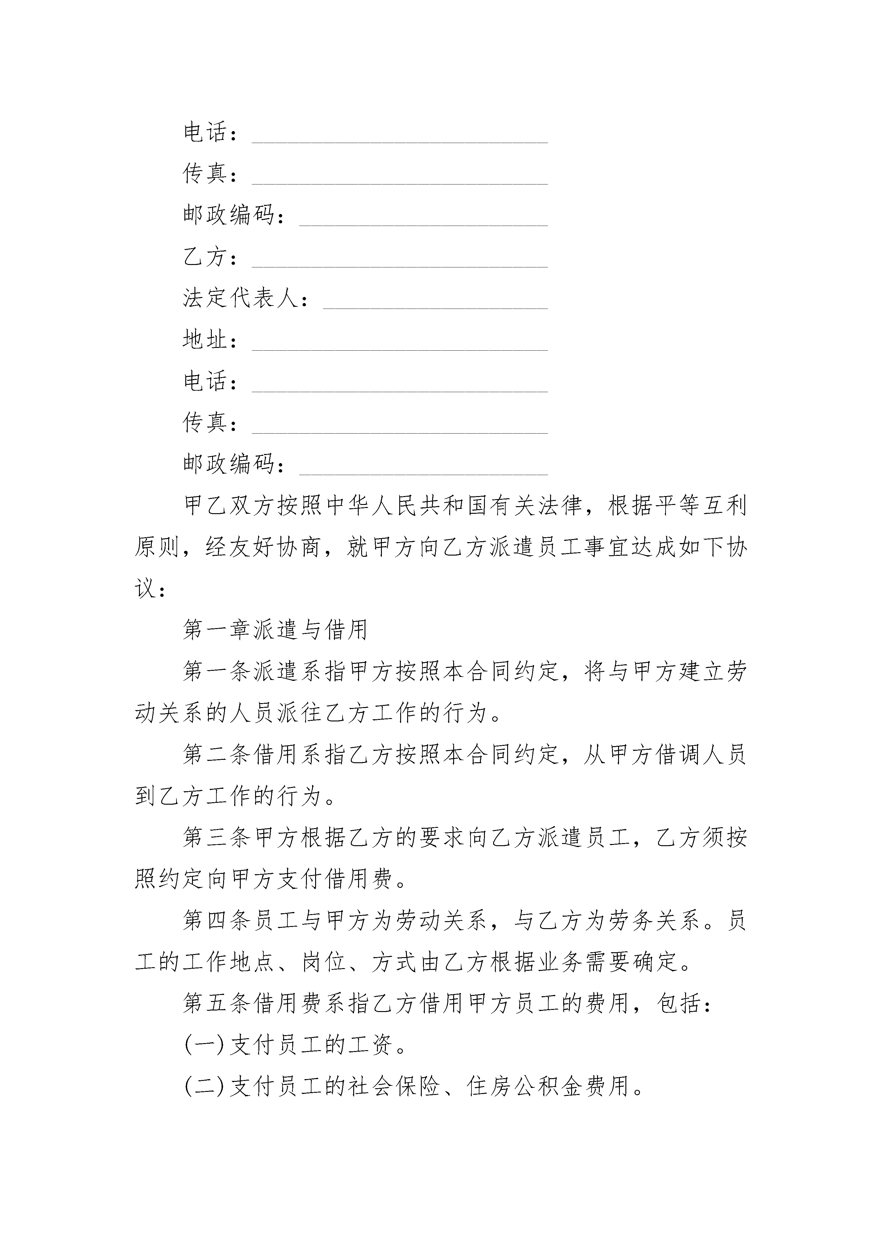 派遣劳务人员合同派遣劳务人员合同(通用3篇)派遣劳务人员合同篇1甲方(派遣单位)名称:住所:法定代表人(委托代理人):联系电话:乙方(用工单位)名称:住所:法定代表人(委托代理人):联系电话:根据《中华人民共和国民法典》等法律法规规定,甲乙双方经过平等协商,订立本协议,并承诺共同遵守。一、劳务派遣合同期限甲方按照乙方要求从年月日起派遣名劳务人员到乙方工作,派遣期至年月日止。二、劳务人员的派遣与变更(一)乙方要求甲方派遣的劳务人员必须符合以下条件:(二)甲方负责按照上述条件组织派遣劳务人员。派遣的劳务人员一经确定,甲乙双方应拟订《劳务派遣人员清单及岗位》,并签字、盖章作为本协议的附件。甲乙双方按照本协议约定对被派遣的劳务人员进行变更的,要相应修改《劳务派遣人员清单及岗位》,并须经双方签字、盖章认可。三、劳务费用标准及结算(一)劳务费用标准:乙方按照每人每月元标准向甲方支付劳务费用,劳务费用包括应支付甲方派遣的劳务人员的工资、应缴纳的各项社会保险费及其他费用。(二)结算时间和方式:乙方每月日前以银行转帐方式将本月劳务费用一次性支付到甲方帐户。四、甲方的权利和义务(一)乙方如有违反本协议、拖欠各类应付费用以及违反劳动保障政策损害劳务派遣人员合法权益行为的,甲方可依法向乙方交涉,要求乙方继续履行义务并按实际损失的情况向乙方索赔。(二)甲方可以采取多种形式了解乙方使用劳务派遣人员的情况,乙方应予以配合;甲方应配合乙方做好劳务派遣人员的管理工作,协助乙方教育劳务派遣人员遵守相关法律、法规和乙方依法制定的规章制度。(三)甲方应与劳务派遣人员依法签订二年以上的固定期限劳动合同。(四)甲方应以法定货币形式按月支付劳务派遣人员工资,不得克扣或无故拖欠。甲方应执行有关最低工资的规定。(五)甲方应按国家和四川省有关规定为劳务派遣人员办理各项社会保险。五、乙方的权利和义务(一)被派遣劳务人员有《中华人民共和国民法典》规定情形,乙方可以将劳务派遣人员退回甲方,并有权要求甲方重新派遣符合条件的劳务人员。(二)乙方有权查询甲方发放劳务派遣人员的工资和缴纳社会保险费等情况,出现违法现象,乙方可以依法向甲方交涉要求纠正,因此造成乙方损失的,甲方应当给予乙方赔偿。(三)乙方不得将被派遣劳务人员再派遣到其他用人单位,否则,甲方有权解除合同并要求乙方赔偿损失。(四)乙方需按本协议规定及时足额向甲方支付劳务费用,不得拖欠。(五)乙方对劳务派遣人员应当履行下列义务:1、执行国家劳动标准,提供相应的劳动条件和劳动保护;2、告知被派遣劳务人员的工作要求和劳动报酬;3、支付加班费、绩效奖金,提供与工作岗位相关的福利待遇;4、对在岗被派遣劳务人员进行工作岗位所必需的培训;5、连续用工的,实行正常的工资调整机制。六、合同的变更、解除、终止(一)甲乙双方应共同遵守本协议的各项条款。在本协议履行期间,未经对方同意,任何一方不得变更或解除;若一方因法律法规及相关政策改变或不可抗力等因素不能继续履行本协议,应及时通知对方,双方通过协商,可对本协议进行变更或解除。解除劳务合同协议书(二)本协议期满即可终止。七、其他事项(一)乙方应在临时性、辅助性、替代性工作岗位上使用劳务派遣人员。“三性”工作岗位的认定按照国家和四川省有关规定执行。(二)乙方应当根据工作岗位的实际需要与甲方确定派遣期限,不得将连续用工期限分割订立数个短期劳务派遣协议。(三)本协议履行过程中,协议有关内容如与国家新颁布的法律、法规不一致的,按新的法律法规政策执行。(四)本协议附件与正文具有同等效力,未尽事宜由甲乙双方协商一致后书面约定。(五)本协议一式两份,甲乙双方各执一份,双方签字盖章后生效。甲方:(盖章)法定代表人或(委托代理人):(签名)年月日乙方:(盖章)法定代表人或(委托代理人):(签名)年月日派遣劳务人员合同篇2甲方:_________________________法定代表人:___________________地址:_________________________电话:_________________________传真:_________________________邮政编码:_____________________乙方:_________________________法定代表人:___________________地址:_________________________电话:_________________________传真:_________________________邮政编码:_____________________甲乙双方按照中华人民共和国有关法律,根据平等互利原则,经友好协商,就甲方向乙方派遣员工事宜达成如下协议:第一章派遣与借用第一条派遣系指甲方按照本合同约定,将与甲方