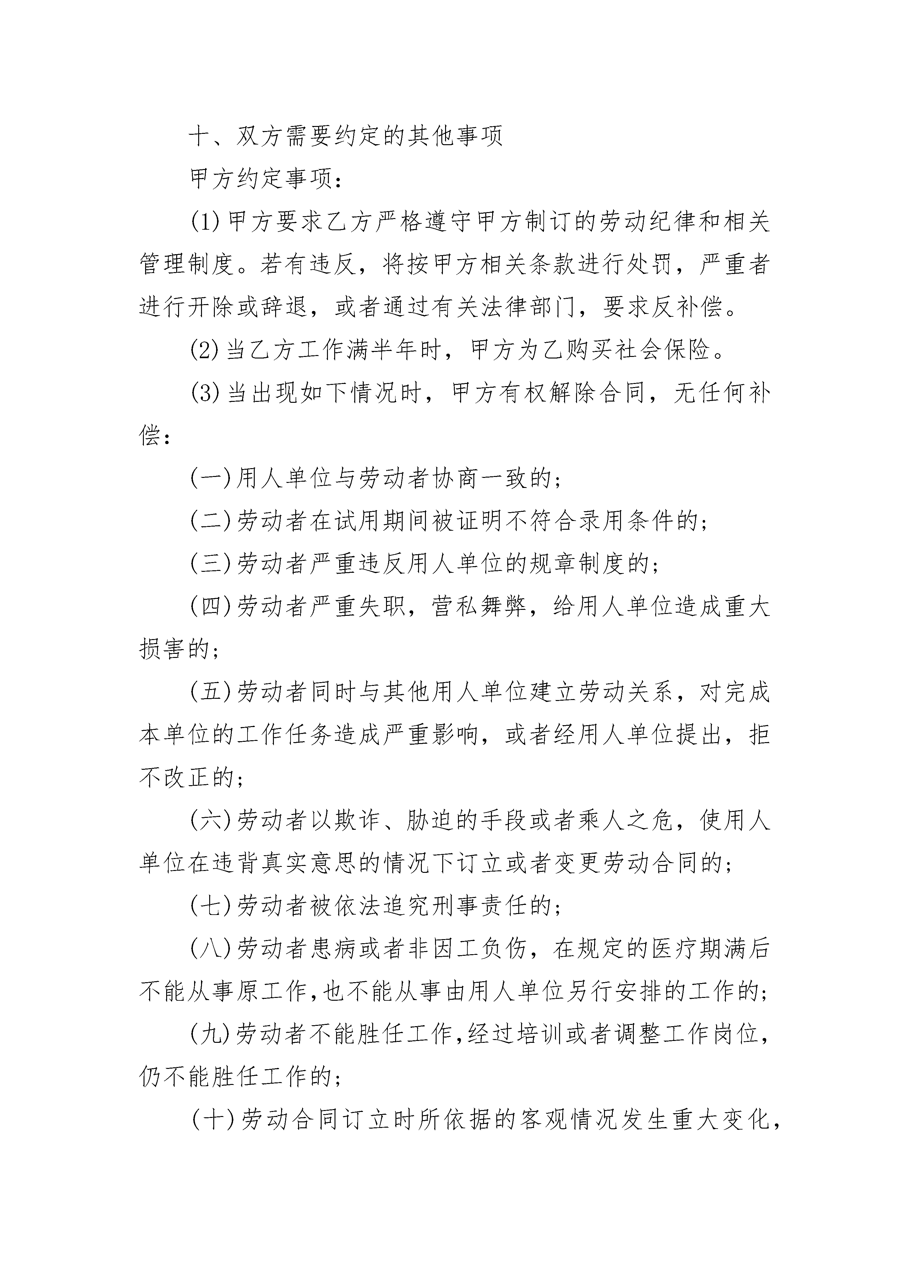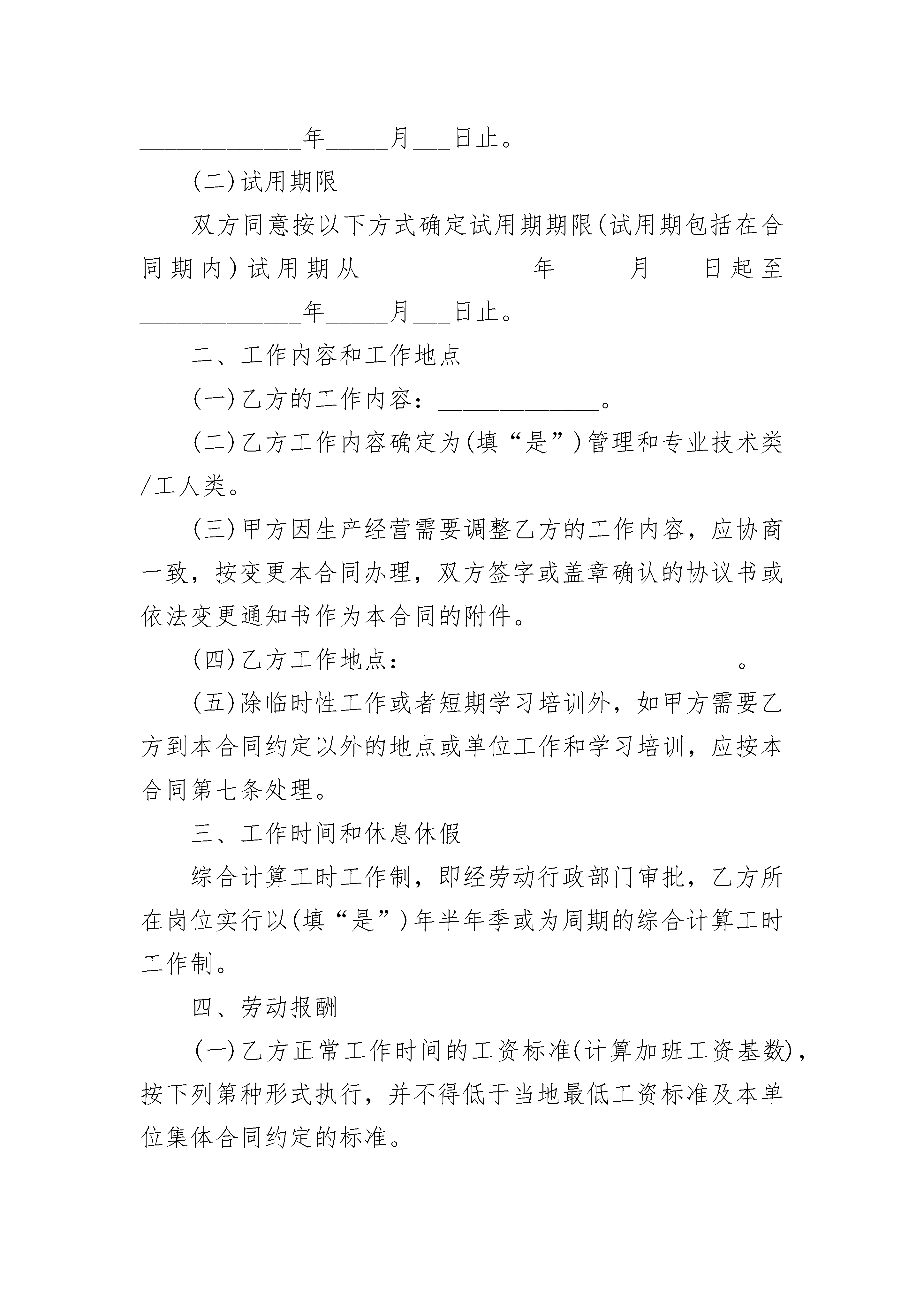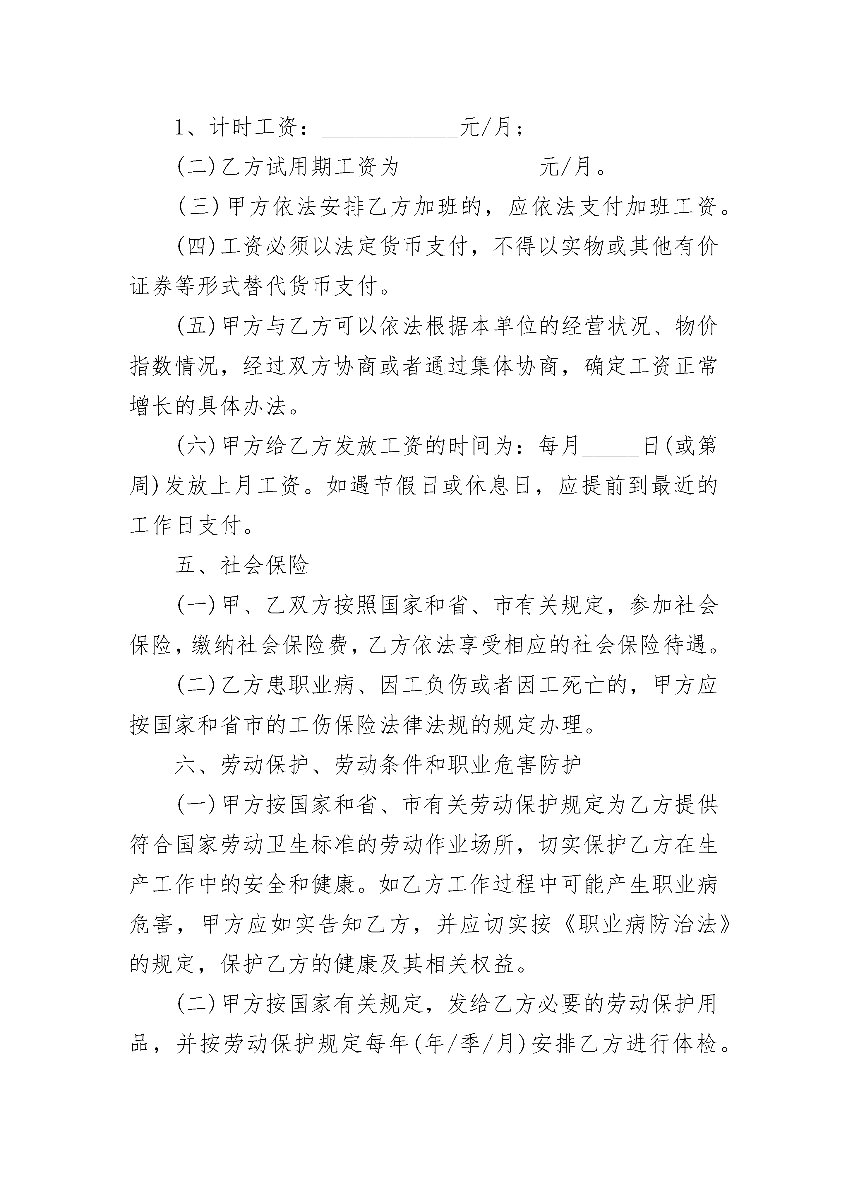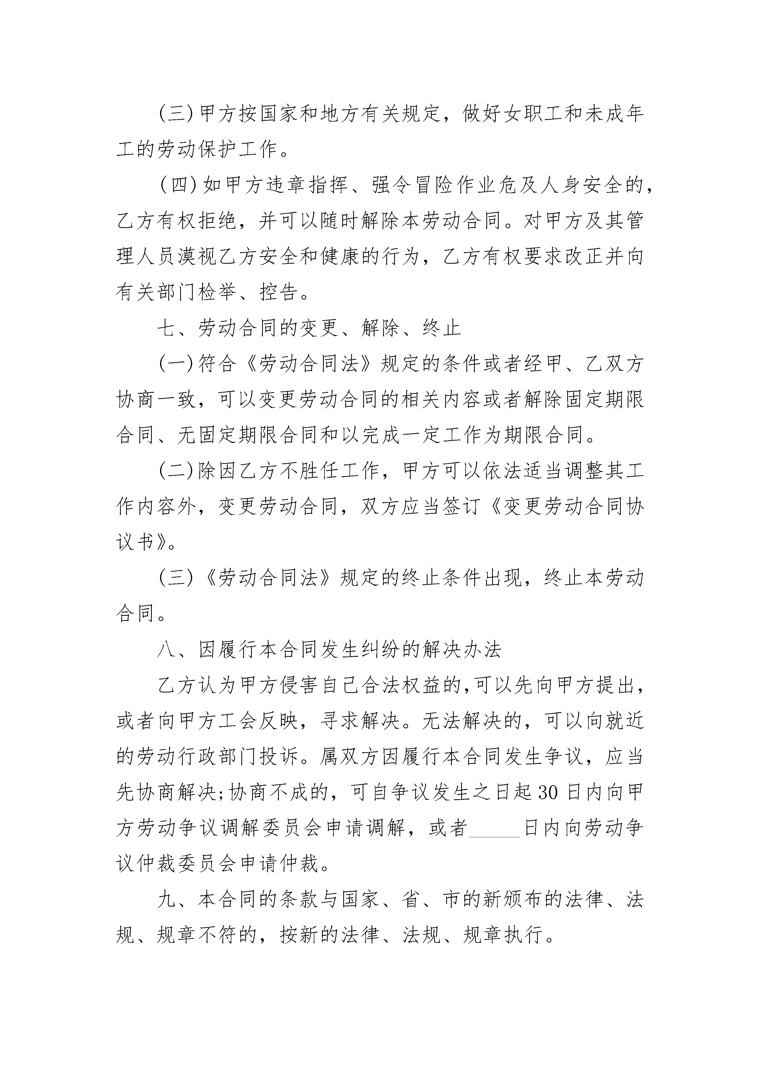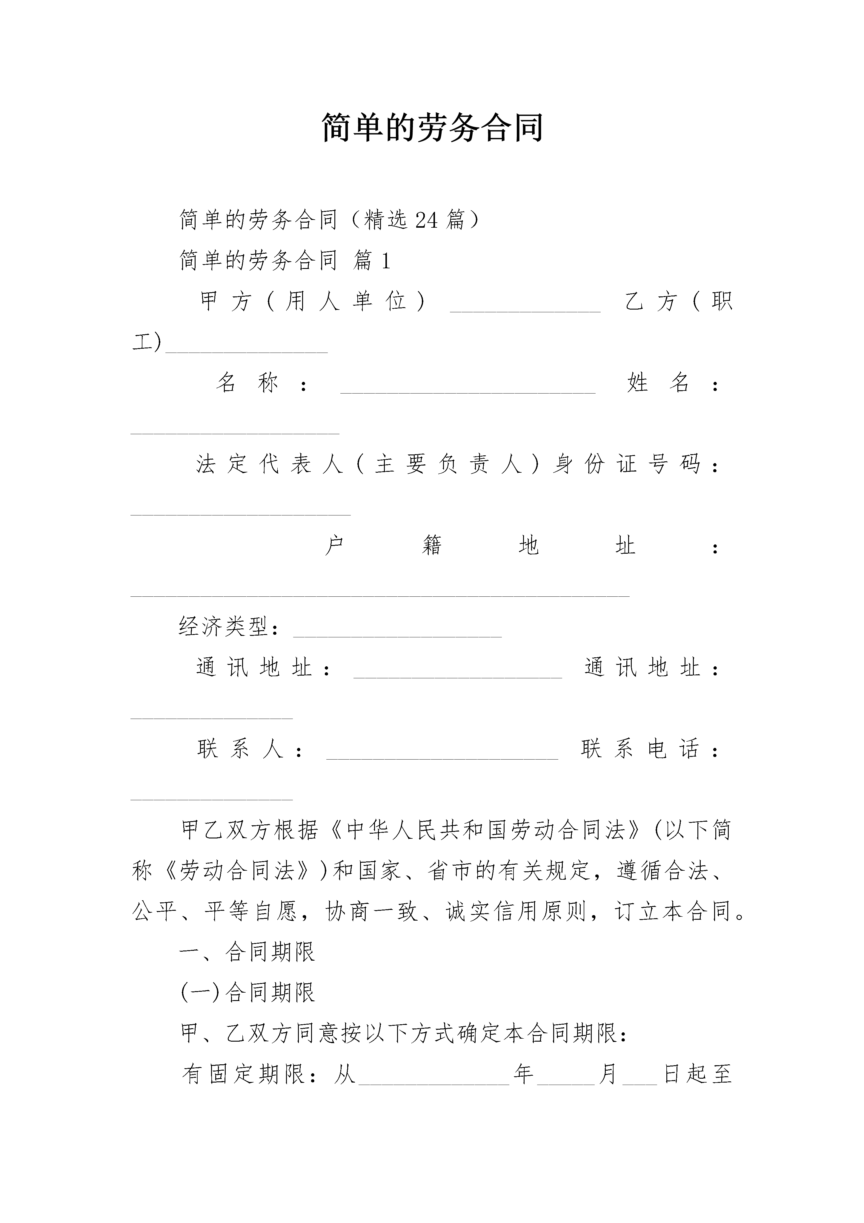 简单的劳务合同简单的劳务合同(精选24篇)简单的劳务合同篇1甲方(用人单位)_____________乙方(职工)______________名称:______________________姓名:__________________法定代表人(主要负责人)身份证号码:___________________户籍地址:___________________________________________经济类型:__________________通讯地址:__________________通讯地址:______________联系人:____________________联系电话:______________甲乙双方根据《中华人民共和国劳动合同法》(以下简称《劳动合同法》)和国家、省市的有关规定,遵循合法、公平、平等自愿,协商一致、诚实信用原则,订立本合同。一、合同期限(一)合同期限甲、乙双方同意按以下方式确定本合同期限:有固定期限:从_____________年_____月___日起至_____________年_____月___日止。(二)试用期限双方同意按以下方式确定试用期期限(试用期包括在合同期内)试用期从_____________年_____月___日起至_____________年_____月___日止。二、工作内容和工作地点(一)乙方的工作内容:_____________。(二)乙方工作内容确定为(填“是”)管理和专业技术类/工人类。(三)甲方因生产经营需要调整乙方的工作内容,应协商一致,按变更本合同办理,双方签字或盖章确认的协议书或依法变更通知书作为本合同的附件。(四)乙方工作地点:__________________________。(五)除临时性工作或者短期学习培训外,如甲方需要乙方到本合同约定以外的地点或单位工作和学习培训,应按本合同第七条处理。三、工作时间和休息休假综合计算工时工作制,即经劳动行政部门审批,乙方所在岗位实行以(填“是”)年半年季或为周期的综合计算工时工作制。四、劳动报酬(一)乙方正常工作时间的工资标准(计算加班工资基数),按下列第种形式执行,并不得低于当地最低工资标准及本单位集体合同约定的标准。1、计时工资:____________元/月;(二)乙方试用期工资为____________元/月。(三)甲方依法安排乙方加班的,应依法支付加班工资。(四)工资必须以法定货币支付,不得以实物或其他有价证券等形式替代货币支付。(五)甲方与乙方可以依法根据本单位的经营状况、物价指数情况,经过双方协商或者通过集体协商,确定工资正常增长的具体办法。(六)甲方给乙方发放工资的时间为:每月_____日(或第周)发放上月工资。如遇节假日或休息日,应提前到最近的工作日支付。五、社会保险(一)甲、乙双方按照国家和省、市有关规定,参加社会保险,缴纳社会保险费,乙方依法享受相应的社会保险待遇。(二)乙方患职业病、因工负伤或者因工死亡的,甲方应按国家和省市的工伤保险法律法规的规定办理。六、劳动保护、劳动条件和职业危害防护(一)甲方按国家和省、市有关劳动保护规定为乙方提供符合国家劳动卫生标准的劳动作业场所,切实保护乙方在生产工作中的安全和健康。如乙方工作过程中可能产生职业病危害,甲方应如实告知乙方,并应切实按《职业病防治法》的规定,保护乙方的健康及其相关权益。(二)甲方按国家有关规定,发给乙方必要的劳动保护用品,并按劳动保护规定每年(年/季/月)安排乙方进行体检。(三)甲方按国家和地方有关规定,做好女职工和未成年工的劳动保护工作。(四)如甲方违章指挥、强令冒险作业危及人身安全的,乙方有权拒绝,并可以随时解除本劳动合同。对甲方及其管理人员漠视乙方安全和健康的行为,乙方有权要求改正并向有关部门检举、控告。七、劳动合同的变更、解除、终止(一)符合《劳动合同法》规定的条件或者经甲、乙双方协商一致,可以变更劳动合同的相关内容或者解除固定期限合同、无固定期限合同和以完成一定工作为期限合同。(二)除因乙方不胜任工作,甲方可以依法适当调整其工作内容外,变更劳动合同,双方应当签订《变更劳动合同协议书》。(三)《劳动合同法》规定的终止条件出现,终止本劳动合同。八、因履行本合同发生纠纷的解决办法乙方认为甲方侵害自己合法权益的,可以先向甲方提出,或者向甲方工会反映,寻求解决。无法解决的,可以向就近的劳动行政部门投诉。属双方因履行本合同发生争议,应当先协商解决;协商不成的,可自争议发生之日起30日内向甲方劳动争议调解委员会申请调解,或者_____日内向劳动争议仲裁委员会申请仲裁。九、本合同的条款与国家、省、市的新颁布的法律、法规、规章不符的,按新的法律、法规、规章执行。十、双方需要约定的其他事项甲方约定事项:(1)甲方要求乙方严格遵守甲方制