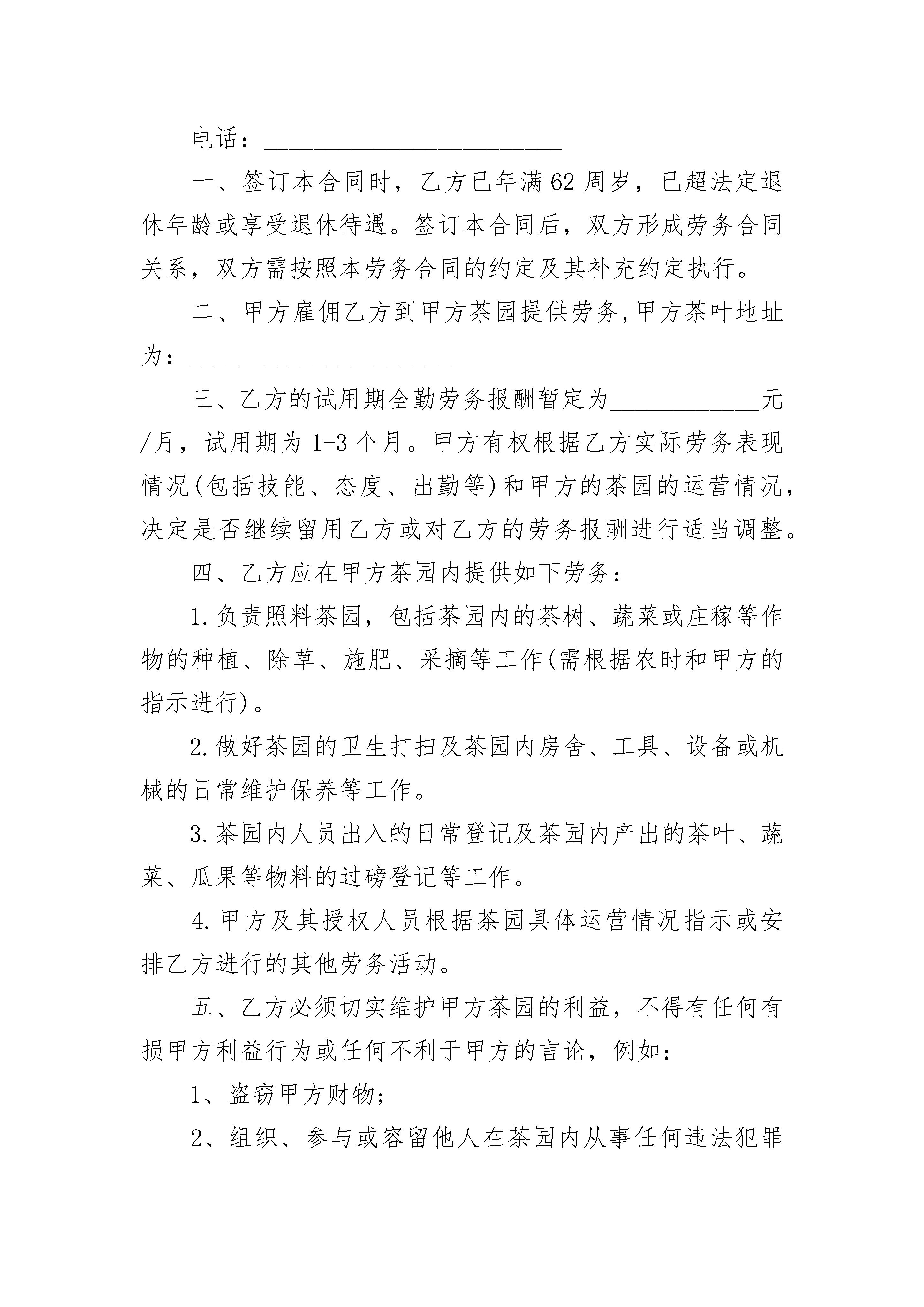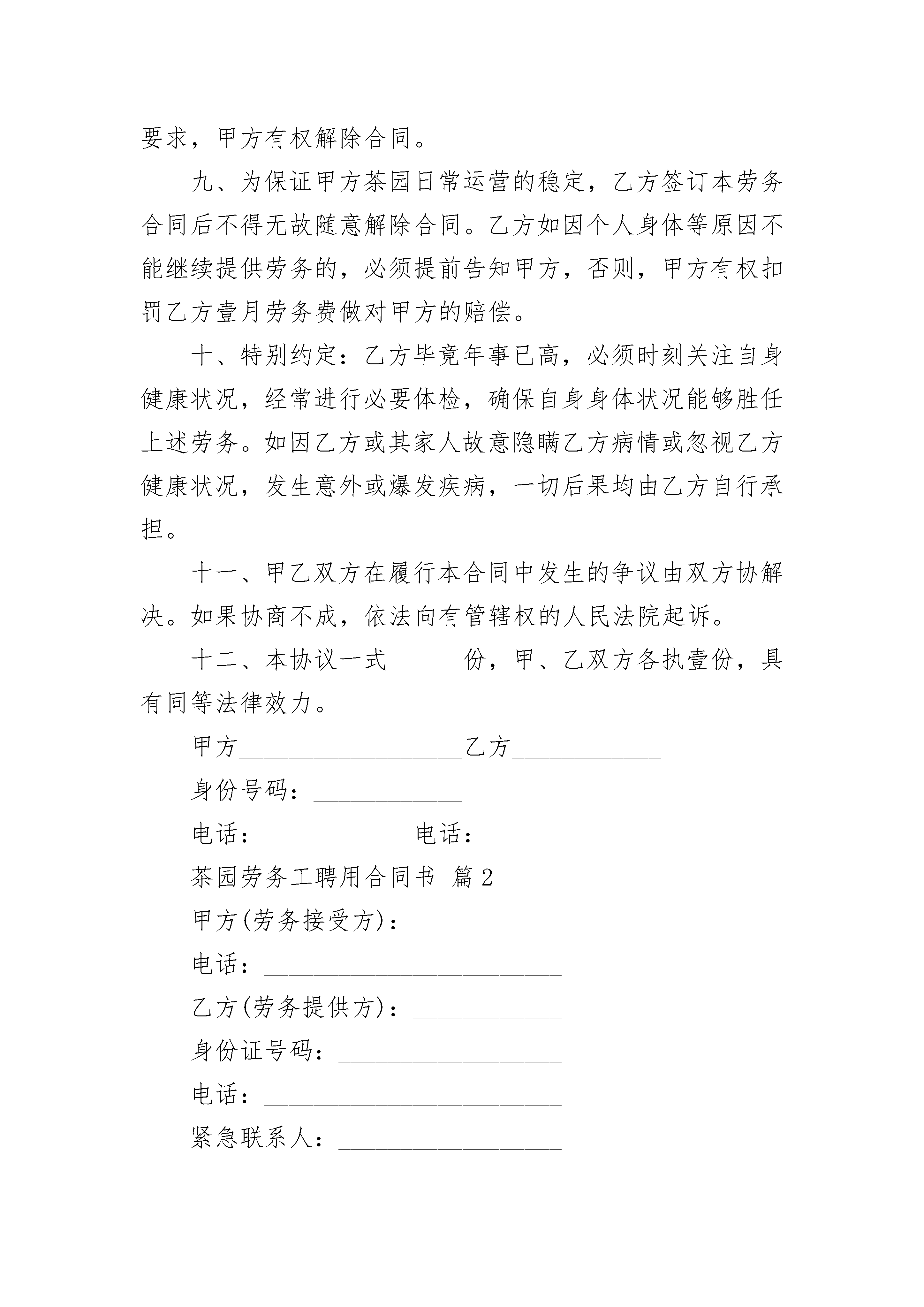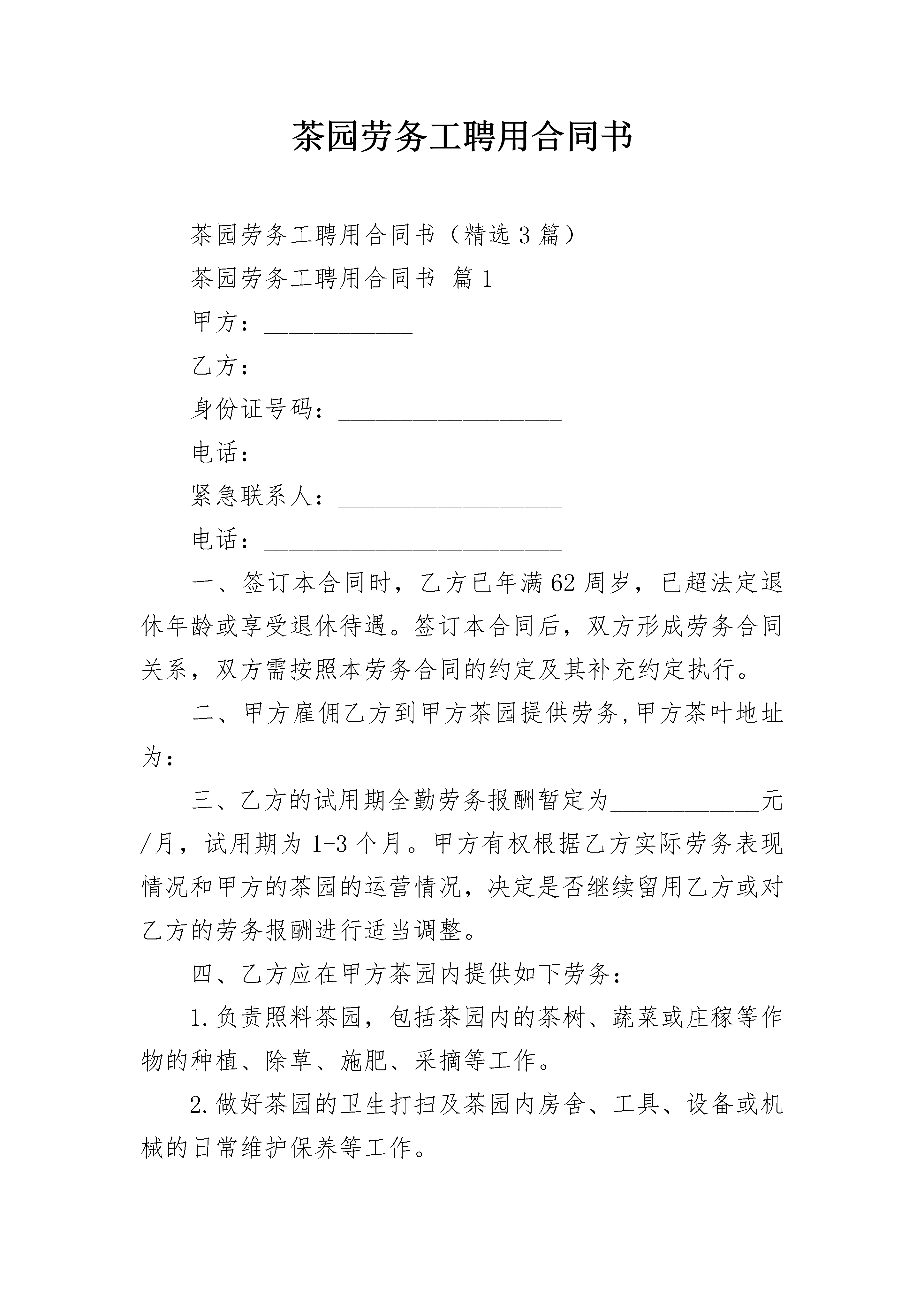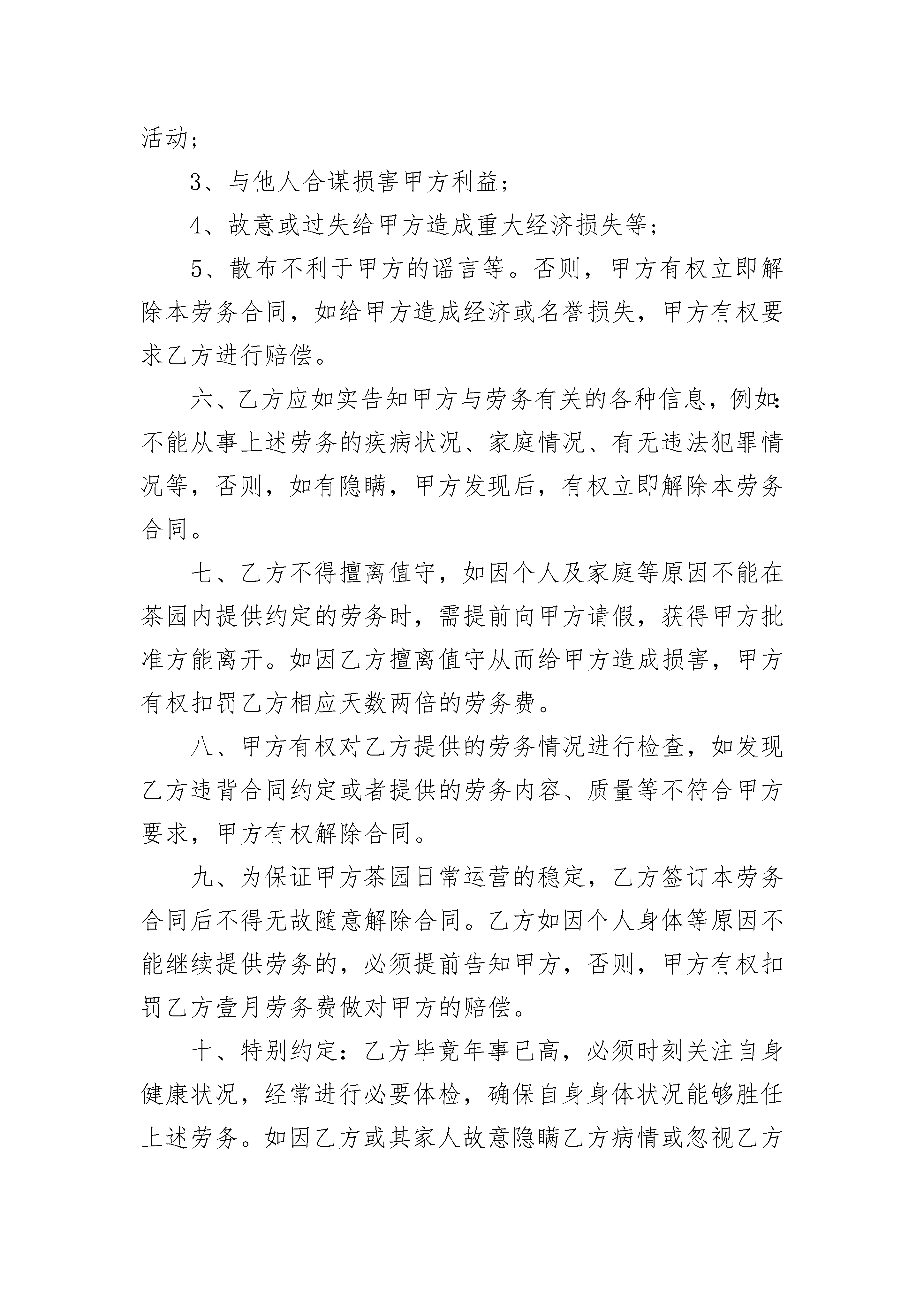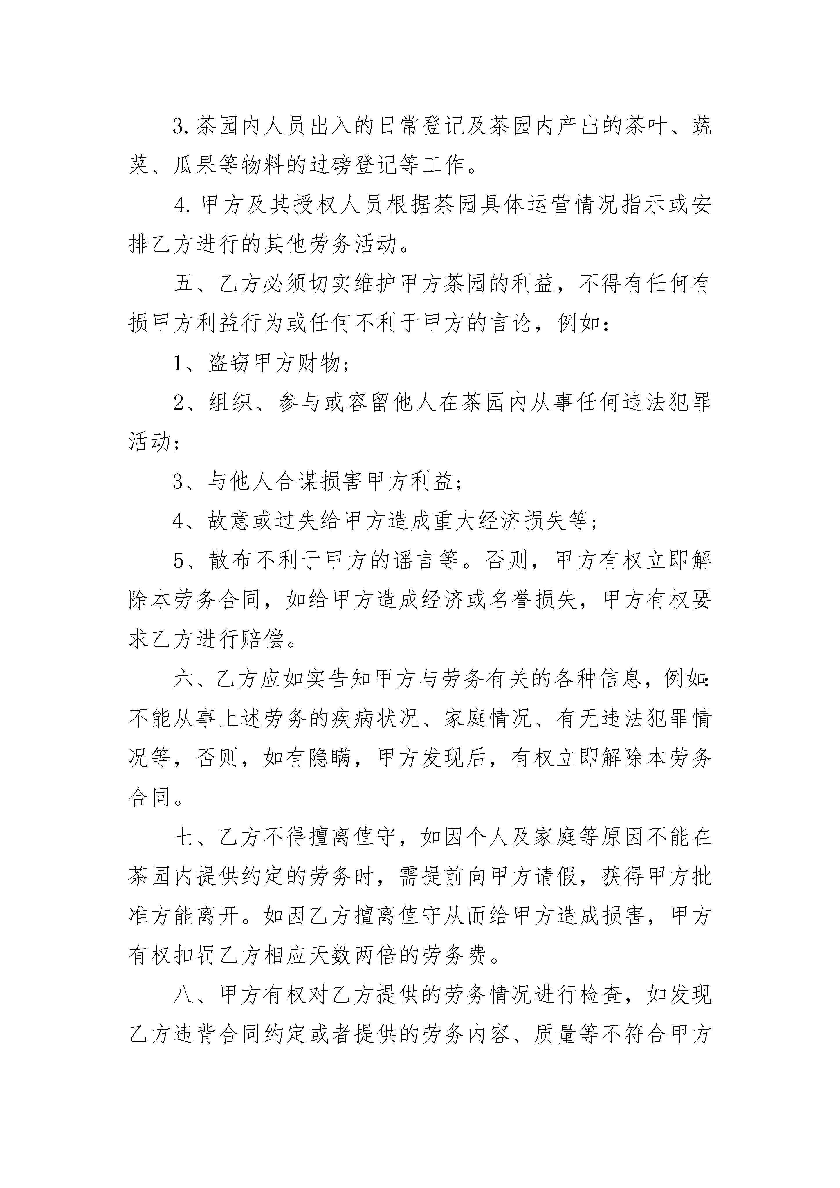 茶园劳务工聘用合同书茶园劳务工聘用合同书(精选3篇)茶园劳务工聘用合同书篇1甲方:____________乙方:____________身份证号码:__________________电话:________________________紧急联系人:__________________电话:________________________一、签订本合同时,乙方已年满62周岁,已超法定退休年龄或享受退休待遇。签订本合同后,双方形成劳务合同关系,双方需按照本劳务合同的约定及其补充约定执行。二、甲方雇佣乙方到甲方茶园提供劳务,甲方茶叶地址为:_____________________三、乙方的试用期全勤劳务报酬暂定为____________元/月,试用期为1-3个月。甲方有权根据乙方实际劳务表现情况和甲方的茶园的运营情况,决定是否继续留用乙方或对乙方的劳务报酬进行适当调整。四、乙方应在甲方茶园内提供如下劳务:1.负责照料茶园,包括茶园内的茶树、蔬菜或庄稼等作物的种植、除草、施肥、采摘等工作。2.做好茶园的卫生打扫及茶园内房舍、工具、设备或机械的日常维护保养等工作。3.茶园内人员出入的日常登记及茶园内产出的茶叶、蔬菜、瓜果等物料的过磅登记等工作。4.甲方及其授权人员根据茶园具体运营情况指示或安排乙方进行的其他劳务活动。五、乙方必须切实维护甲方茶园的利益,不得有任何有损甲方利益行为或任何不利于甲方的言论,例如:1、盗窃甲方财物;2、组织、参与或容留他人在茶园内从事任何违法犯罪活动;3、与他人合谋损害甲方利益;4、故意或过失给甲方造成重大经济损失等;5、散布不利于甲方的谣言等。否则,甲方有权立即解除本劳务合同,如给甲方造成经济或名誉损失,甲方有权要求乙方进行赔偿。六、乙方应如实告知甲方与劳务有关的各种信息,例如:不能从事上述劳务的疾病状况、家庭情况、有无违法犯罪情况等,否则,如有隐瞒,甲方发现后,有权立即解除本劳务合同。七、乙方不得擅离值守,如因个人及家庭等原因不能在茶园内提供约定的劳务时,需提前向甲方请假,获得甲方批准方能离开。如因乙方擅离值守从而给甲方造成损害,甲方有权扣罚乙方相应天数两倍的劳务费。八、甲方有权对乙方提供的劳务情况进行检查,如发现乙方违背合同约定或者提供的劳务内容、质量等不符合甲方要求,甲方有权解除合同。九、为保证甲方茶园日常运营的稳定,乙方签订本劳务合同后不得无故随意解除合同。乙方如因个人身体等原因不能继续提供劳务的,必须提前告知甲方,否则,甲方有权扣罚乙方壹月劳务费做对甲方的赔偿。十、特别约定:乙方毕竟年事已高,必须时刻关注自身健康状况,经常进行必要体检,确保自身身体状况能够胜任上述劳务。如因乙方或其家人故意隐瞒乙方病情或忽视乙方健康状况,发生意外或爆发疾病,一切后果均由乙方自行承担。十一、甲乙双方在履行本合同中发生的争议由双方协解决。如果协商不成,依法向有管辖权的人民法院起诉。十二、本协议一式______份,甲、乙双方各执壹份,具有同等法律效力。甲方__________________乙方____________身份号码:____________电话:____________电话:__________________茶园劳务工聘用合同书篇2甲方(劳务接受方):____________电话:________________________乙方(劳务提供方):____________身份证号码:__________________电话:________________________紧急联系人:__________________电话:________________________一、签订本合同时,乙方已年满62周岁,已超法定退休年龄或享受退休待遇。签订本合同后,双方形成劳务合同关系,双方需按照本劳务合同的约定及其补充约定执行。二、甲方雇佣乙方到甲方茶园提供劳务,甲方茶叶地址为:_____________________三、乙方的试用期全勤劳务报酬暂定为____________元/月,试用期为1-3个月。甲方有权根据乙方实际劳务表现情况(包括技能、态度、出勤等)和甲方的茶园的运营情况,决定是否继续留用乙方或对乙方的劳务报酬进行适当调整。四、乙方应在甲方茶园内提供如下劳务:1.负责照料茶园,包括茶园内的茶树、蔬菜或庄稼等作物的种植、除草、施肥、采摘等工作(需根据农时和甲方的指示进行)。2.做好茶园的卫生打扫及茶园内房舍、工具、设备或机械的日常维护保养等工作。3.茶园内人员出入的日常登记及茶园内产出的茶叶、蔬菜、瓜果等物料的过磅登记等工作。4.甲方及其授权人员根据茶园具体运营情况指示或安排乙方进行的其他劳务活动。五、乙方必须切实维护甲方茶园的利益,不得有任何有损甲方利益行为或任何不利于甲方的言论,例如:1、盗窃甲方