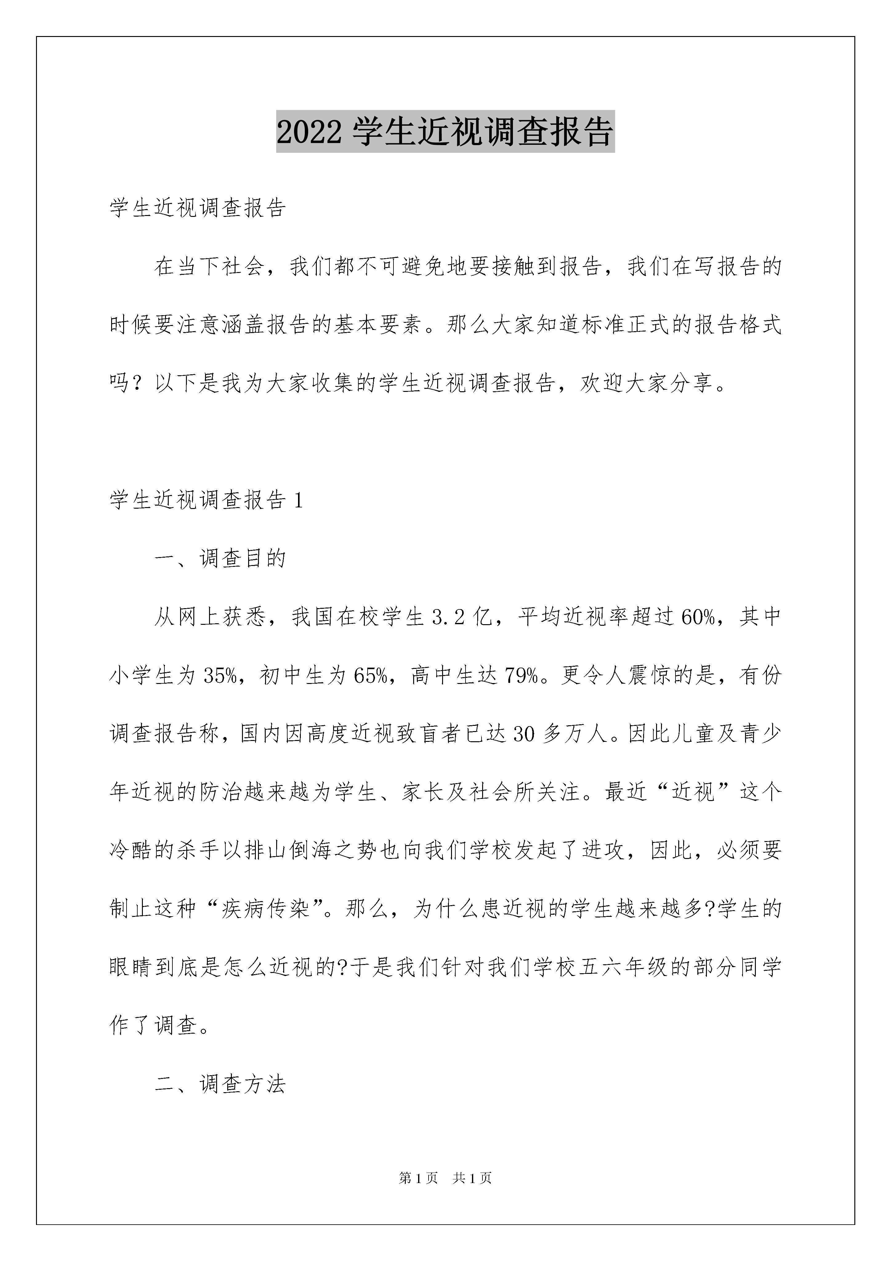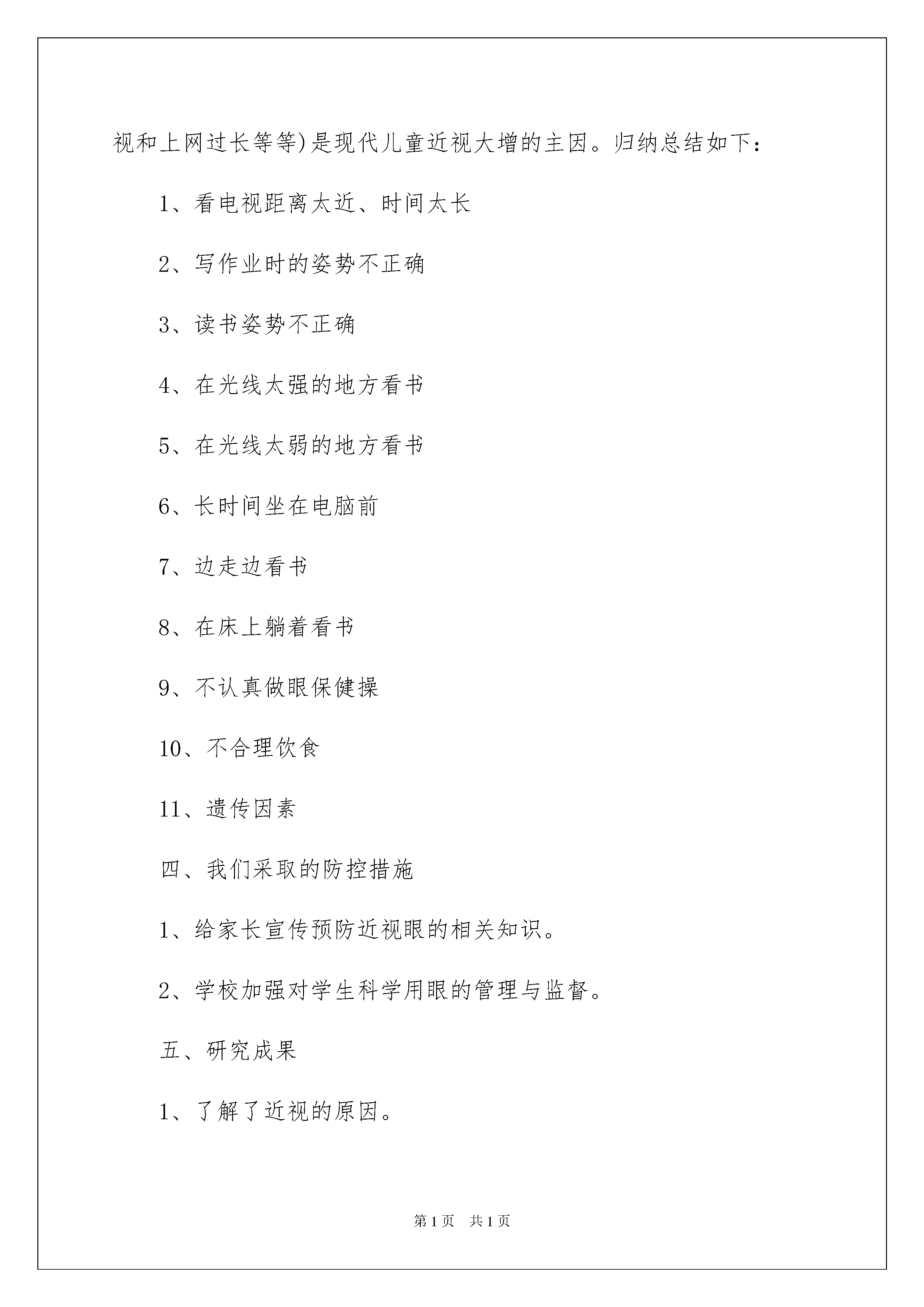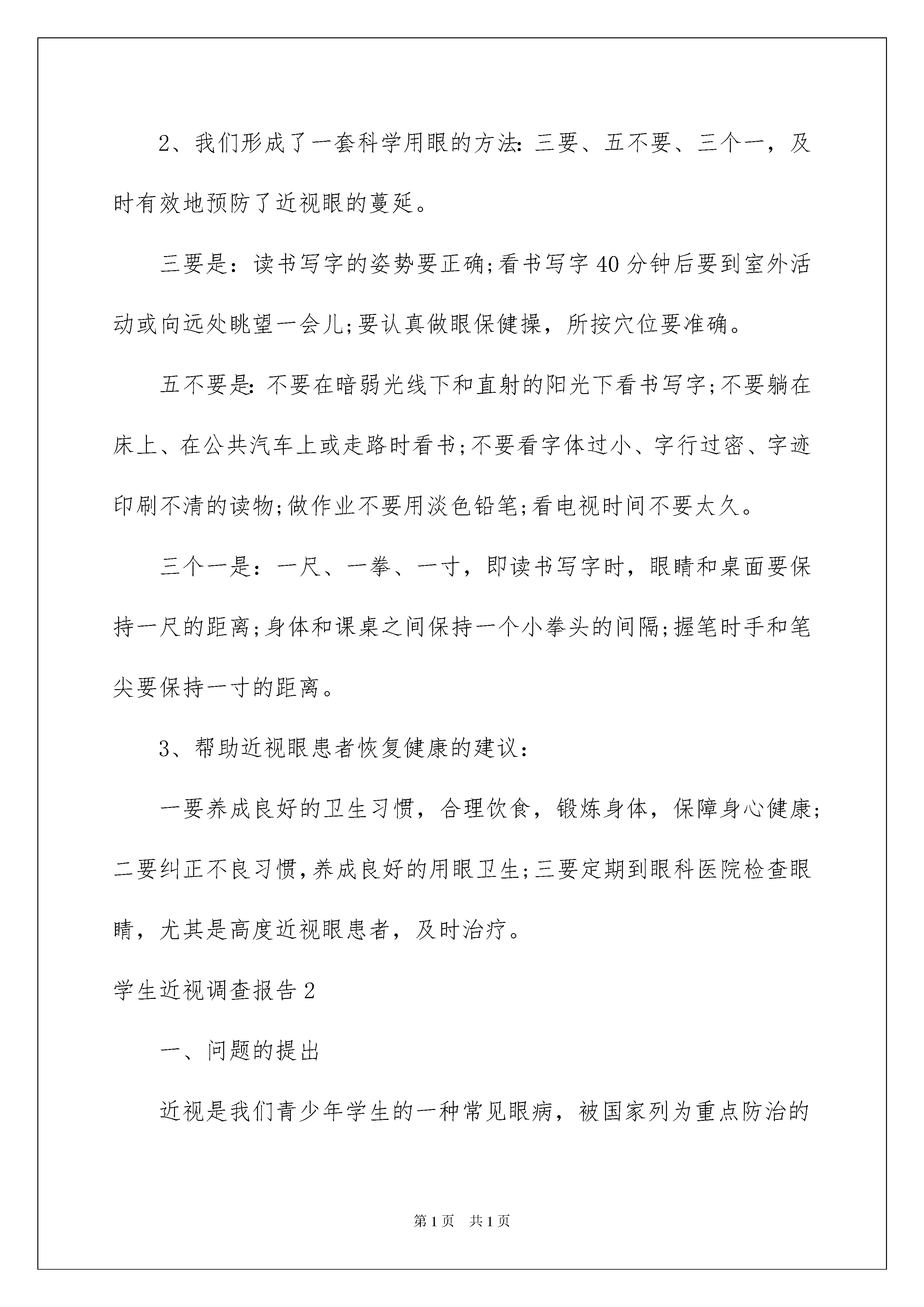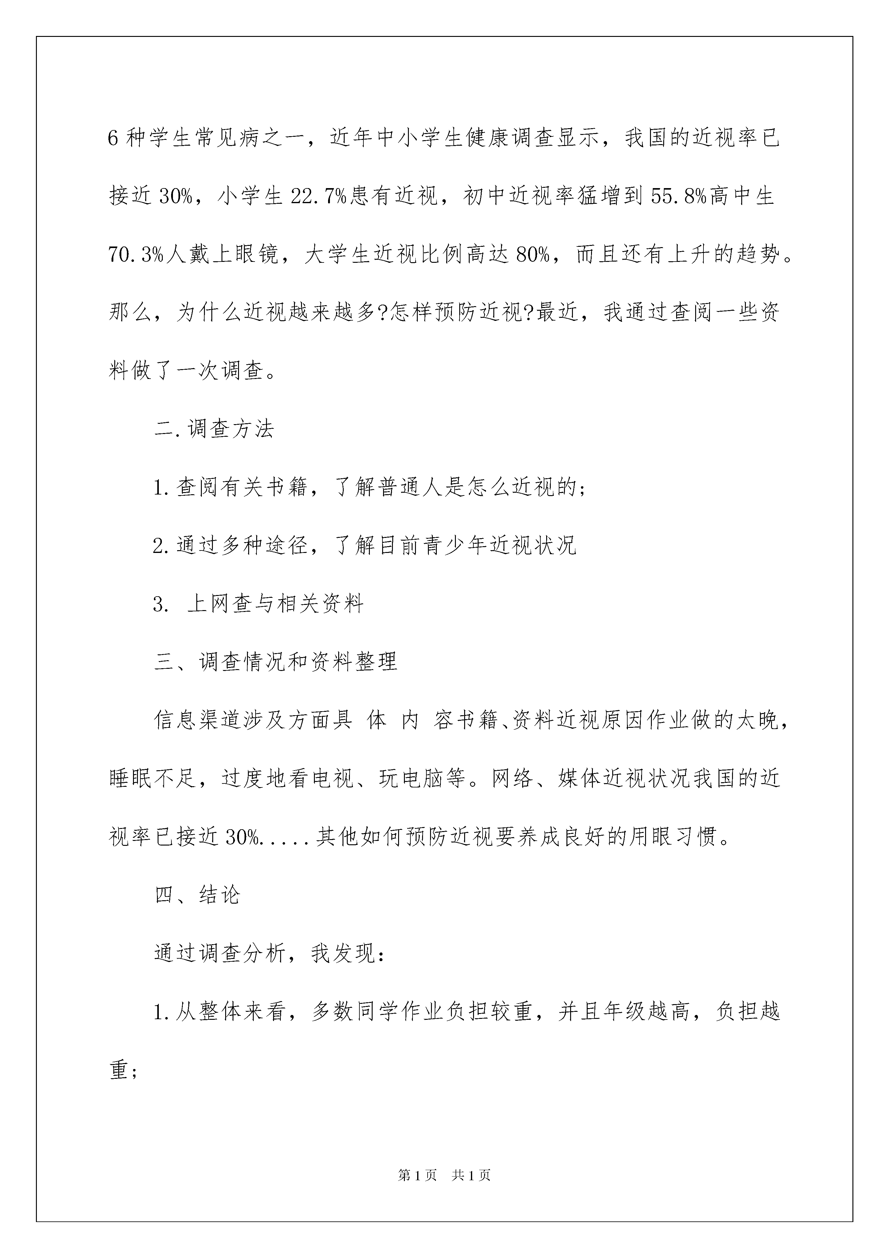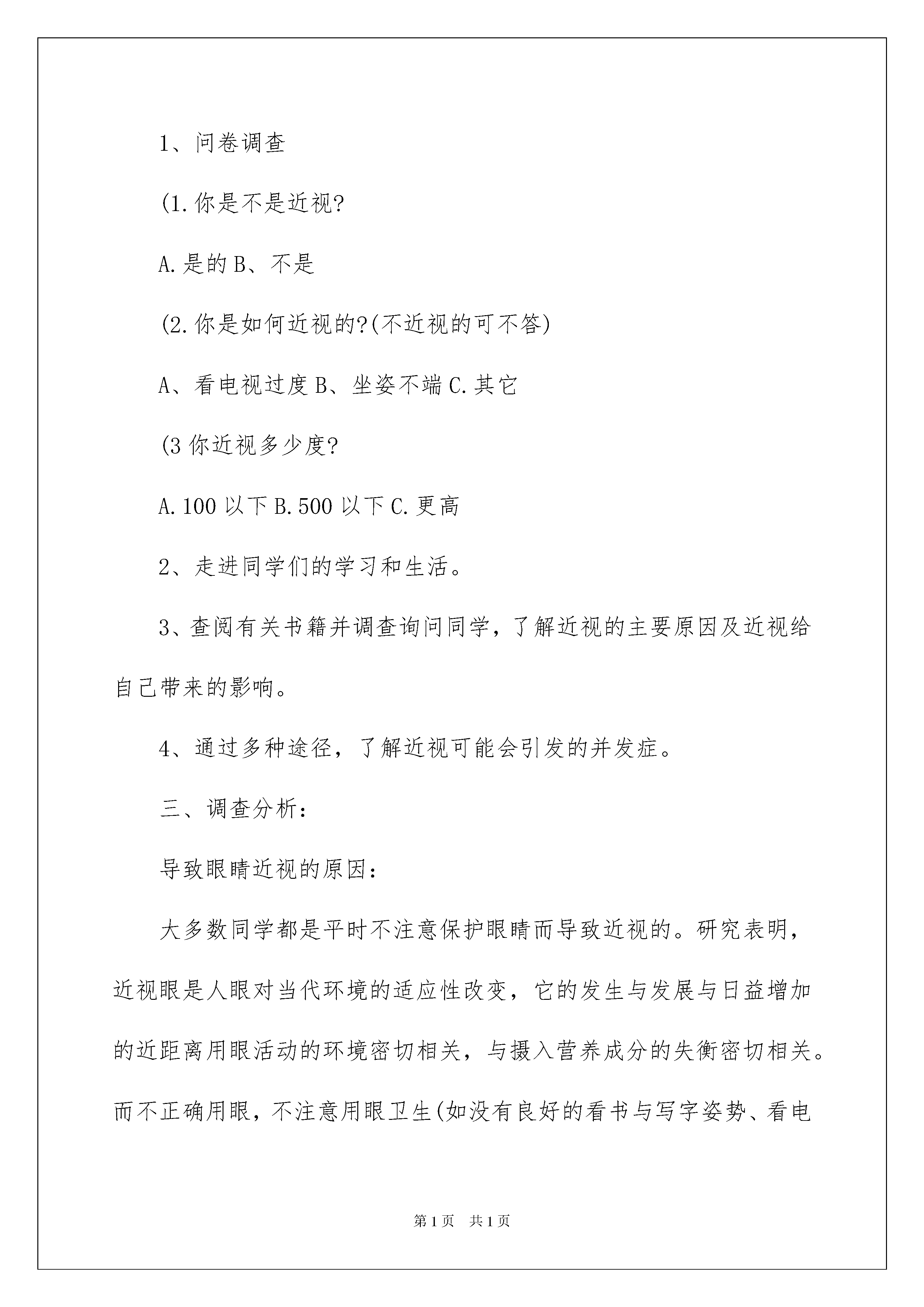 2022学生近视调查报告学生近视调查报告在当下社会,我们都不可避免地要接触到报告,我们在写报告的时候要注意涵盖报告的基本要素。那么大家知道标准正式的报告格式吗?以下是我为大家收集的学生近视调查报告,欢迎大家分享。学生近视调查报告1一、调查目的从网上获悉,我国在校学生3.2亿,平均近视率超过60%,其中小学生为35%,初中生为65%,高中生达79%。更令人震惊的是,有份调查报告称,国内因高度近视致盲者已达30多万人。因此儿童及青少年近视的防治越来越为学生、家长及社会所关注。最近“近视”这个冷酷的杀手以排山倒海之势也向我们学校发起了进攻,因此,必须要制止这种“疾病传染”。那么,为什么患近视的学生越来越多?学生的眼睛到底是怎么近视的?于是我们针对我们学校五六年级的部分同学作了调查。二、调查方法1、问卷调查(1.你是不是近视?A.是的B、不是(2.你是如何近视的?(不近视的可不答)A、看电视过度B、坐姿不端C.其它(3你近视多少度?A.100以下B.500以下C.更高2、走进同学们的学习和生活。3、查阅有关书籍并调查询问同学,了解近视的主要原因及近视给自己带来的影响。4、通过多种途径,了解近视可能会引发的并发症。三、调查分析:导致眼睛近视的原因:大多数同学都是平时不注意保护眼睛而导致近视的。研究表明,近视眼是人眼对当代环境的适应性改变,它的发生与发展与日益增加的近距离用眼活动的环境密切相关,与摄入营养成分的失衡密切相关。而不正确用眼,不注意用眼卫生(如没有良好的看书与写字姿势、看电视和上网过长等等)是现代儿童近视大增的主因。归纳总结如下:1、看电视距离太近、时间太长2、写作业时的姿势不正确3、读书姿势不正确4、在光线太强的地方看书5、在光线太弱的地方看书6、长时间坐在电脑前7、边走边看书8、在床上躺着看书9、不认真做眼保健操10、不合理饮食11、遗传因素四、我们采取的防控措施1、给家长宣传预防近视眼的相关知识。2、学校加强对学生科学用眼的管理与监督。五、研究成果1、了解了近视的原因。2、我们形成了一套科学用眼的方法:三要、五不要、三个一,及时有效地预防了近视眼的蔓延。三要是:读书写字的姿势要正确;看书写字40分钟后要到室外活动或向远处眺望一会儿;要认真做眼保健操,所按穴位要准确。五不要是:不要在暗弱光线下和直射的阳光下看书写字;不要躺在床上、在公共汽车上或走路时看书;不要看字体过小、字行过密、字迹印刷不清的读物;做作业不要用淡色铅笔;看电视时间不要太久。三个一是:一尺、一拳、一寸,即读书写字时,眼睛和桌面要保持一尺的距离;身体和课桌之间保持一个小拳头的间隔;握笔时手和笔尖要保持一寸的距离。3、帮助近视眼患者恢复健康的建议:一要养成良好的卫生习惯,合理饮食,锻炼身体,保障身心健康;二要纠正不良习惯,养成良好的用眼卫生;三要定期到眼科医院检查眼睛,尤其是高度近视眼患者,及时治疗。学生近视调查报告2一、问题的提出近视是我们青少年学生的一种常见眼病,被国家列为重点防治的6种学生常见病之一,近年中小学生健康调查显示,我国的近视率已接近30%,小学生22.7%患有近视,初中近视率猛增到55.8%高中生70.3%人戴上眼镜,大学生近视比例高达80%,而且还有上升的趋势。那么,为什么近视越来越多?怎样预防近视?最近,我通过查阅一些资料做了一次调查。二.调查方法1.查阅有关书籍,了解普通人是怎么近视的;2.通过多种途径,了解目前青少年近视状况3.上网查与相关资料三、调查情况和资料整理信息渠道涉及方面具体内容书籍、资料近视原因作业做的太晚,睡眠不足,过度地看电视、玩电脑等。网络、媒体近视状况我国的近视率已接近30%.....其他如何预防近视要养成良好的用眼习惯。四、结论通过调查分析,我发现:1.从整体来看,多数同学作业负担较重,并且年级越高,负担越重;2.多数同学在做作业时都没有好好的让眼睛得到休息;3.近视人数虽然远远高于非近视人数,但不佩戴眼镜的人却占有相当一部分比例。这表明同学们对近视的问题重视不够!五、建议1、每日坚持远眺、坚持眼保健操和课间操,并积极参加文体活动。2、学习时要有充足的光线,光线要从左侧方向来。不要在光线不足和耀眼的阳光和强灯光下看书写字。3、不要睡在床上或边走路边看书。更不要歪头偏身趴在桌上读书写字。4、不要长时间使用视力,每学习50分钟后,应当休息10分钟。5、看电视的次数不要过多,时间不要过长,要控制在1小时以内。距离不要太近。至少隔两米远。要记住眼科医生给大家的劝告:要养成良好的用眼习惯:看书、上网、看电视不要连续超过一小时,不要在太强太暗的光线下看书,一定要注意自己