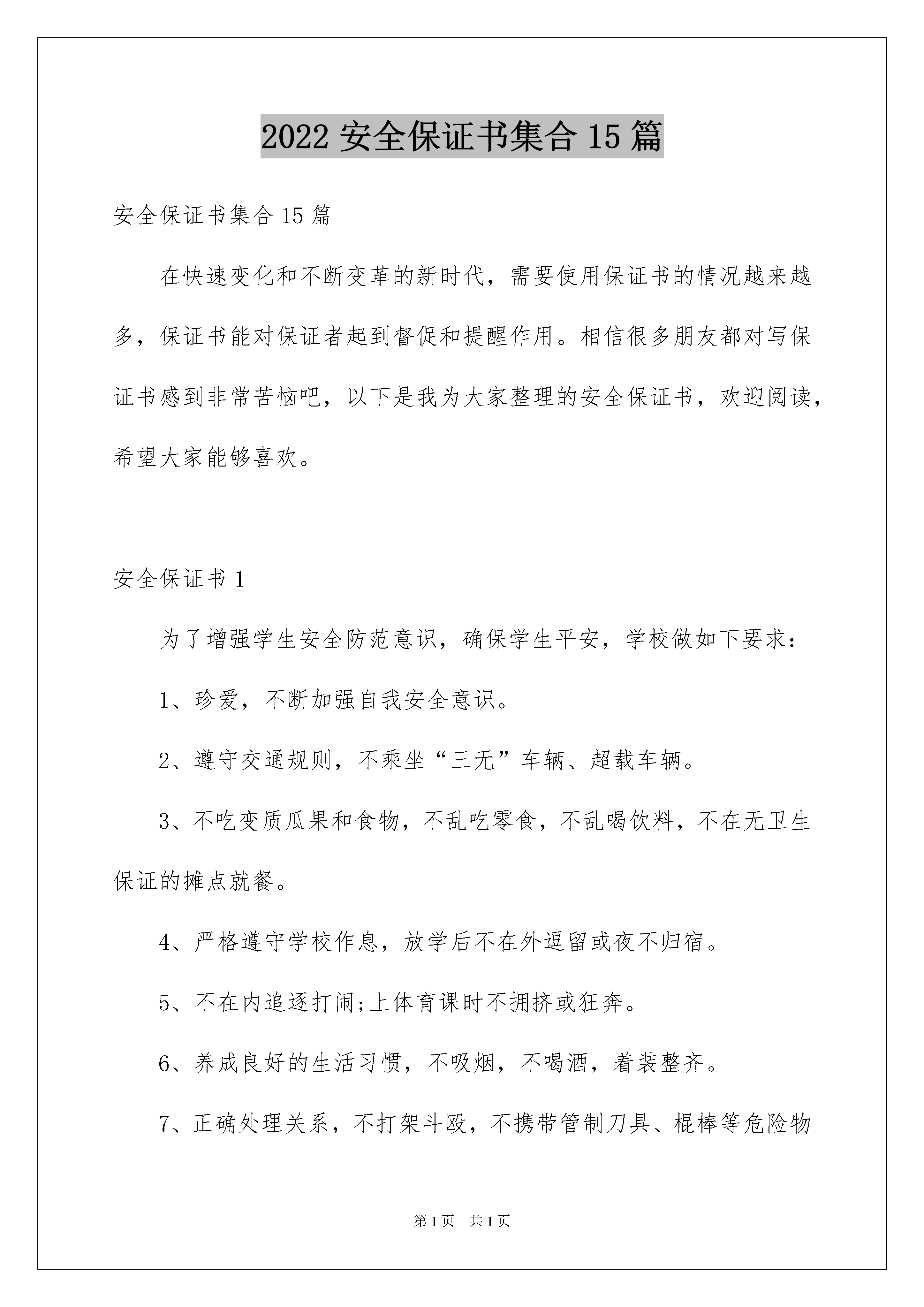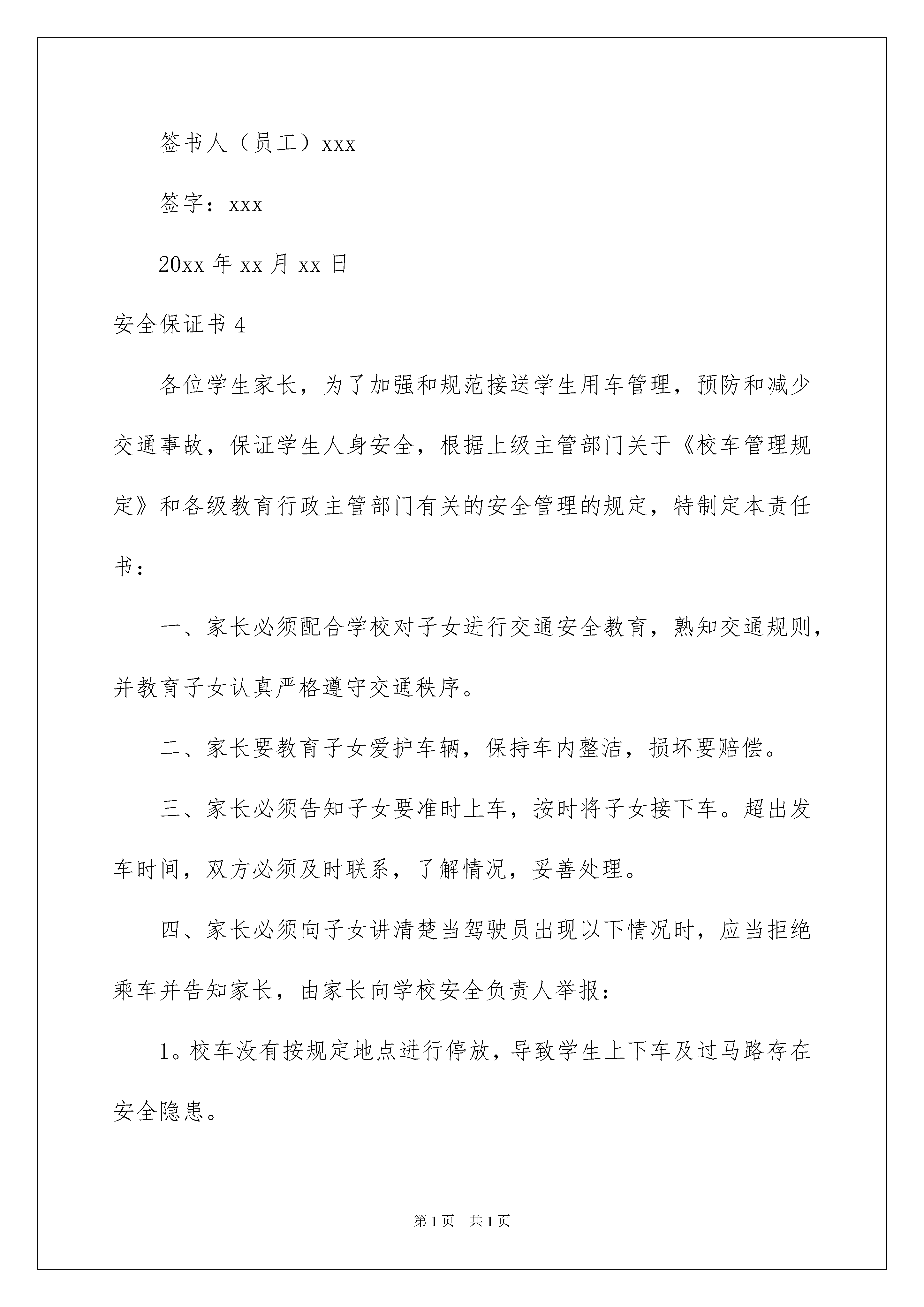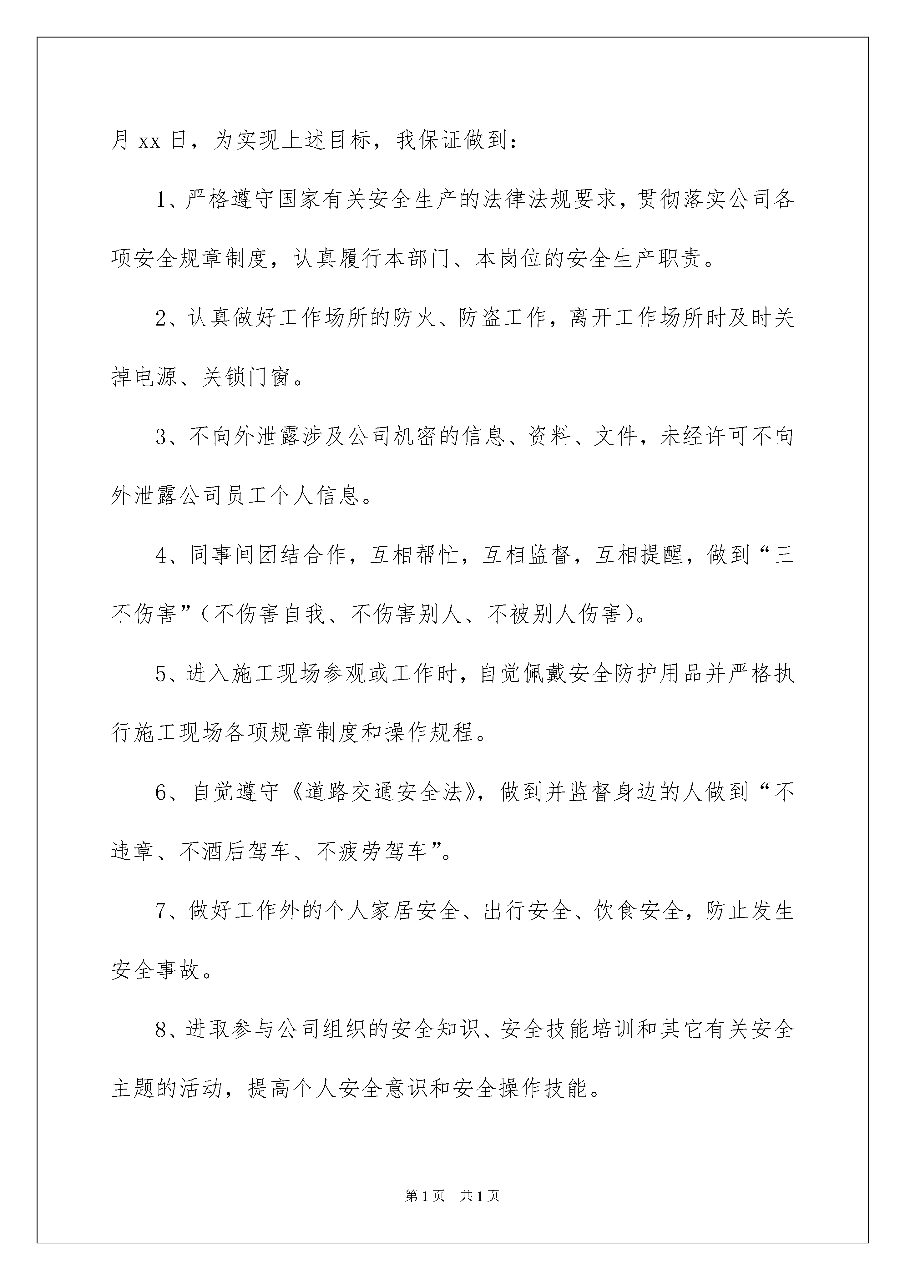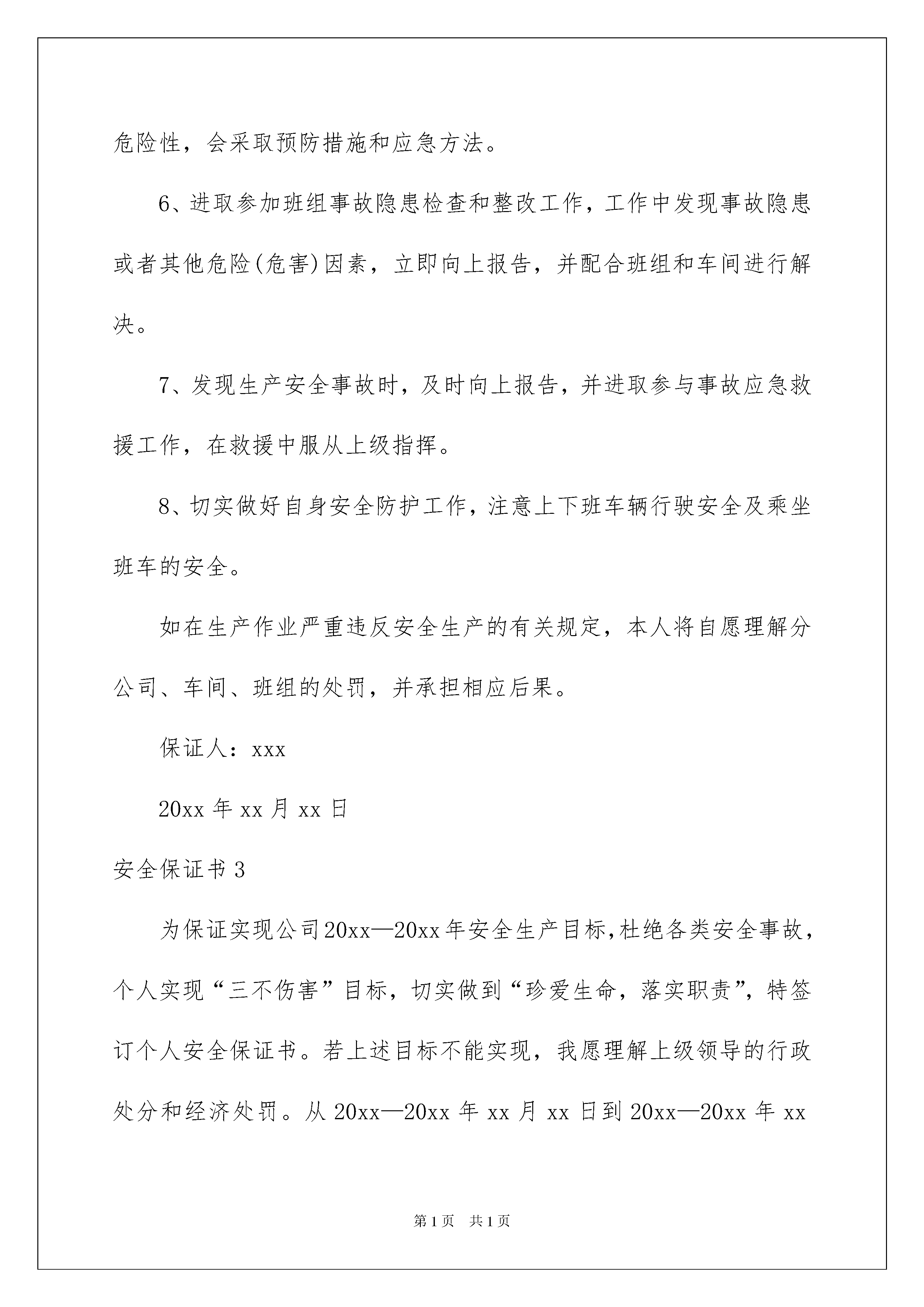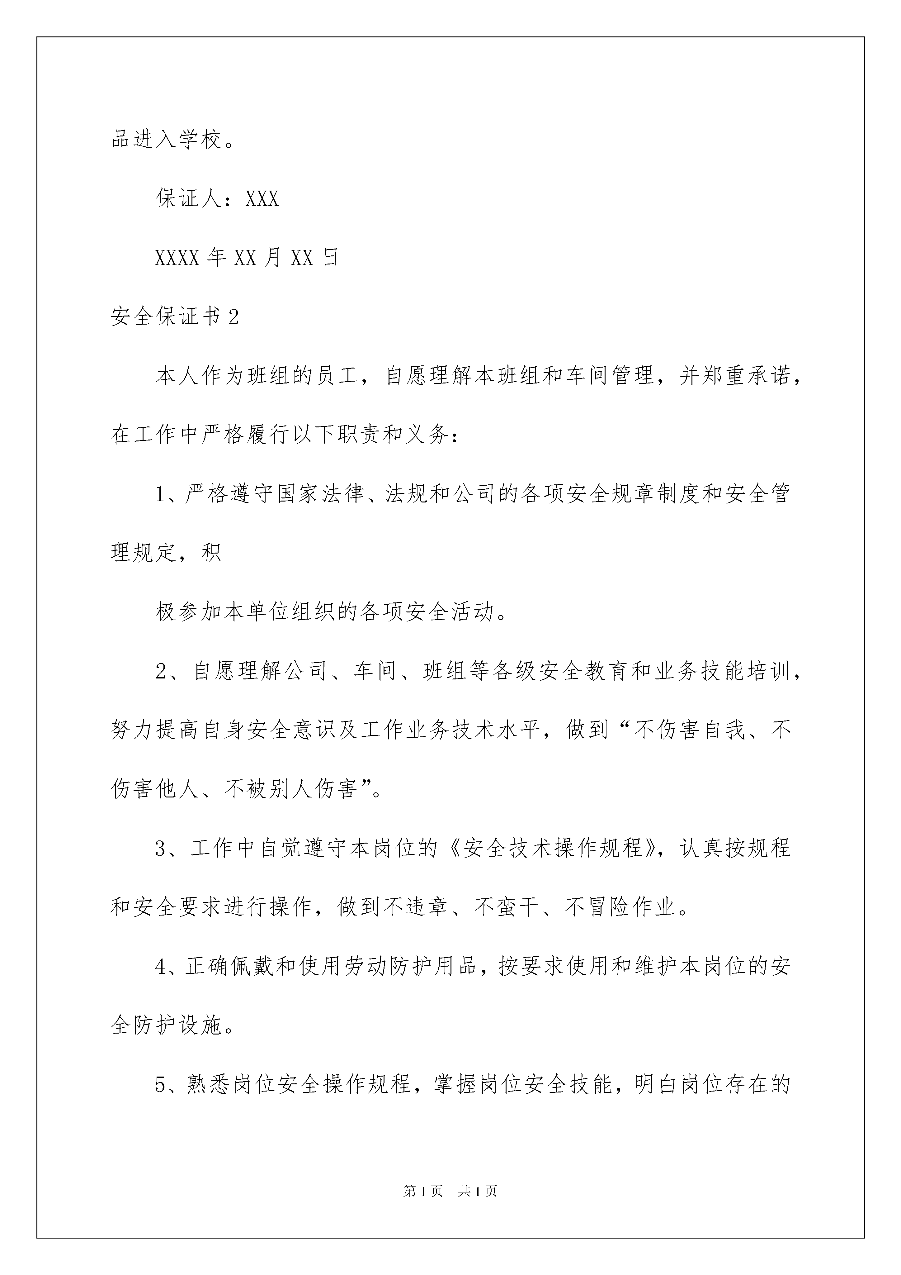 2022安全保证书集合15篇安全保证书集合15篇在快速变化和不断变革的新时代,需要使用保证书的情况越来越多,保证书能对保证者起到督促和提醒作用。相信很多朋友都对写保证书感到非常苦恼吧,以下是我为大家整理的安全保证书,欢迎阅读,希望大家能够喜欢。安全保证书1为了增强学生安全防范意识,确保学生平安,学校做如下要求:1、珍爱,不断加强自我安全意识。2、遵守交通规则,不乘坐“三无”车辆、超载车辆。3、不吃变质瓜果和食物,不乱吃零食,不乱喝饮料,不在无卫生保证的摊点就餐。4、严格遵守学校作息,放学后不在外逗留或夜不归宿。5、不在内追逐打闹;上体育课时不拥挤或狂奔。6、养成良好的生活习惯,不吸烟,不喝酒,着装整齐。7、正确处理关系,不打架斗殴,不携带管制刀具、棍棒等危险物品进入学校。保证人:XXXXXXX年XX月XX日安全保证书2本人作为班组的员工,自愿理解本班组和车间管理,并郑重承诺,在工作中严格履行以下职责和义务:1、严格遵守国家法律、法规和公司的各项安全规章制度和安全管理规定,积极参加本单位组织的各项安全活动。2、自愿理解公司、车间、班组等各级安全教育和业务技能培训,努力提高自身安全意识及工作业务技术水平,做到“不伤害自我、不伤害他人、不被别人伤害”。3、工作中自觉遵守本岗位的《安全技术操作规程》,认真按规程和安全要求进行操作,做到不违章、不蛮干、不冒险作业。4、正确佩戴和使用劳动防护用品,按要求使用和维护本岗位的安全防护设施。5、熟悉岗位安全操作规程,掌握岗位安全技能,明白岗位存在的危险性,会采取预防措施和应急方法。6、进取参加班组事故隐患检查和整改工作,工作中发现事故隐患或者其他危险(危害)因素,立即向上报告,并配合班组和车间进行解决。7、发现生产安全事故时,及时向上报告,并进取参与事故应急救援工作,在救援中服从上级指挥。8、切实做好自身安全防护工作,注意上下班车辆行驶安全及乘坐班车的安全。如在生产作业严重违反安全生产的有关规定,本人将自愿理解分公司、车间、班组的处罚,并承担相应后果。保证人:xxx20xx年xx月xx日安全保证书3为保证实现公司20xx—20xx年安全生产目标,杜绝各类安全事故,个人实现“三不伤害”目标,切实做到“珍爱生命,落实职责”,特签订个人安全保证书。若上述目标不能实现,我愿理解上级领导的行政处分和经济处罚。从20xx—20xx年xx月xx日到20xx—20xx年xx月xx日,为实现上述目标,我保证做到:1、严格遵守国家有关安全生产的法律法规要求,贯彻落实公司各项安全规章制度,认真履行本部门、本岗位的安全生产职责。2、认真做好工作场所的防火、防盗工作,离开工作场所时及时关掉电源、关锁门窗。3、不向外泄露涉及公司机密的信息、资料、文件,未经许可不向外泄露公司员工个人信息。4、同事间团结合作,互相帮忙,互相监督,互相提醒,做到“三不伤害”(不伤害自我、不伤害别人、不被别人伤害)。5、进入施工现场参观或工作时,自觉佩戴安全防护用品并严格执行施工现场各项规章制度和操作规程。6、自觉遵守《道路交通安全法》,做到并监督身边的人做到“不违章、不酒后驾车、不疲劳驾车”。7、做好工作外的个人家居安全、出行安全、饮食安全,防止发生安全事故。8、进取参与公司组织的安全知识、安全技能培训和其它有关安全主题的活动,提高个人安全意识和安全操作技能。签书人(员工)xxx签字:xxx20xx年xx月xx日安全保证书4各位学生家长,为了加强和规范接送学生用车管理,预防和减少交通事故,保证学生人身安全,根据上级主管部门关于《校车管理规定》和各级教育行政主管部门有关的安全管理的规定,特制定本责任书:一、家长必须配合学校对子女进行交通安全教育,熟知交通规则,并教育子女认真严格遵守交通秩序。二、家长要教育子女爱护车辆,保持车内整洁,损坏要赔偿。三、家长必须告知子女要准时上车,按时将子女接下车。超出发车时间,双方必须及时联系,了解情况,妥善处理。四、家长必须向子女讲清楚当驾驶员出现以下情况时,应当拒绝乘车并告知家长,由家长向学校安全负责人举报:1。校车没有按规定地点进行停放,导致学生上下车及过马路存在安全隐患。2。校车驾驶员未严格按照核定载客人数载客、超员、超载。3。校车驾驶员存在身体心理健康的现象。4。校车驾驶员酒后驾驶的车辆。5。校车驾驶员出现超速行驶等交通违法行为的。6。校车证件不齐全,牌照不完备,无运营手续。五、家长有责任了解校车的基本情况(驾驶人员的工作作风、身体状况、驾驶经验以及车况是否符合要求等),发现异常应当向学校举报。六、家长要负责好子女上车之前,下车后的安全监管,车主负责好